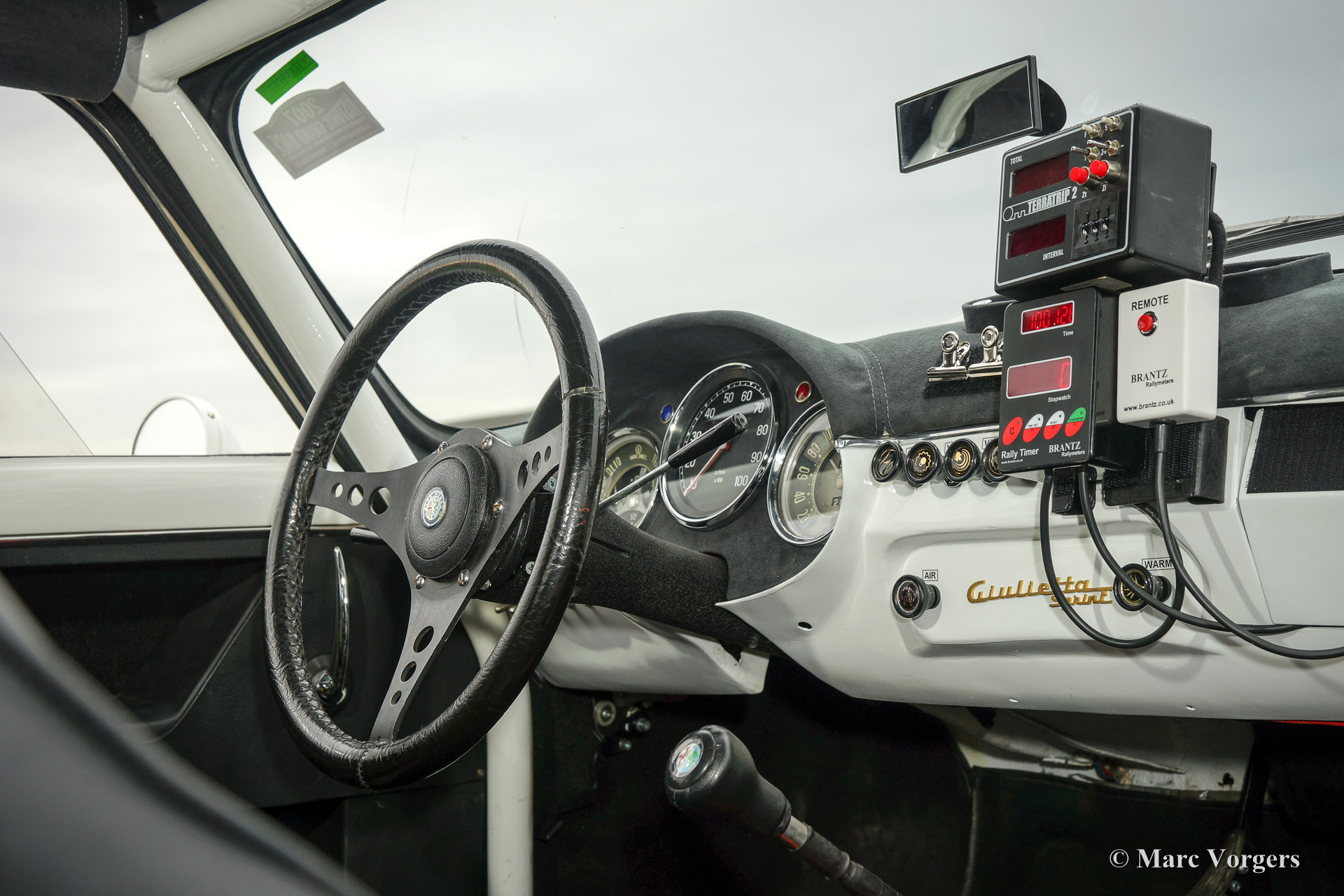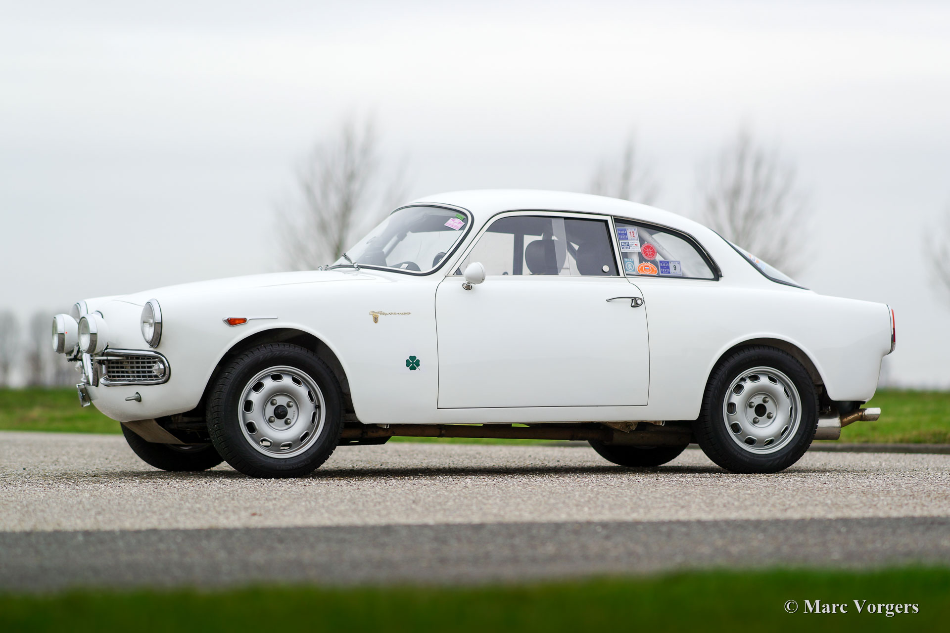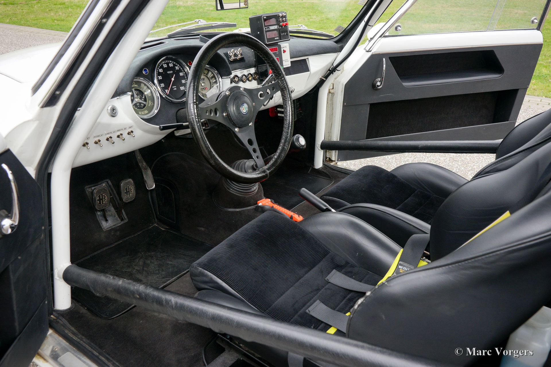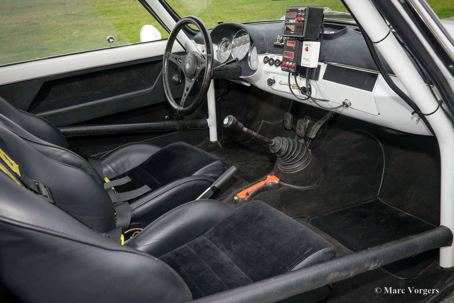 Alfa Romeo Giulietta Sprint Veloce, year 1959. Chassis number AR1493E096XX. Colour white (Sardenia White) with a black half leather interior with an alcantara clad dashboard. This magnificent Alfa Romeo Giulietta Sprint Veloce was built on 30 July 1959. On August 1, the car was delivered to the first owner in Brescia, Italy. This Alfa Romeo Giulietta rally car was prepared extensively for historic (long distance) rally participation. The car features a full roll-cage, oil pan and petrol tank protector plates, an aluminium radiator, a special Stainless-Steel exhaust, an oil-cooler, extra petrol pump limited slip differential, tow hook at the front and the rear, special rally seats, four-point safety harnesses, Tripmaster, additional interior lamps and additional driving/ fog lamps at the front. This is a mighty impressive historic rally car!