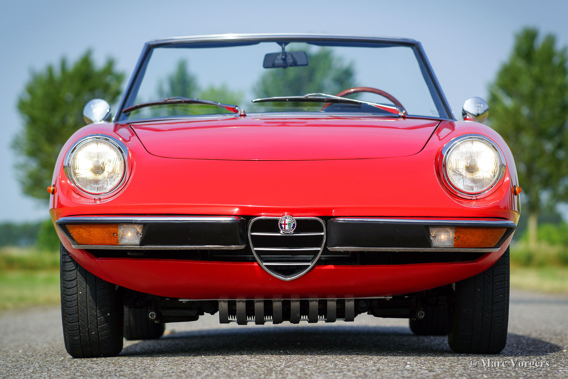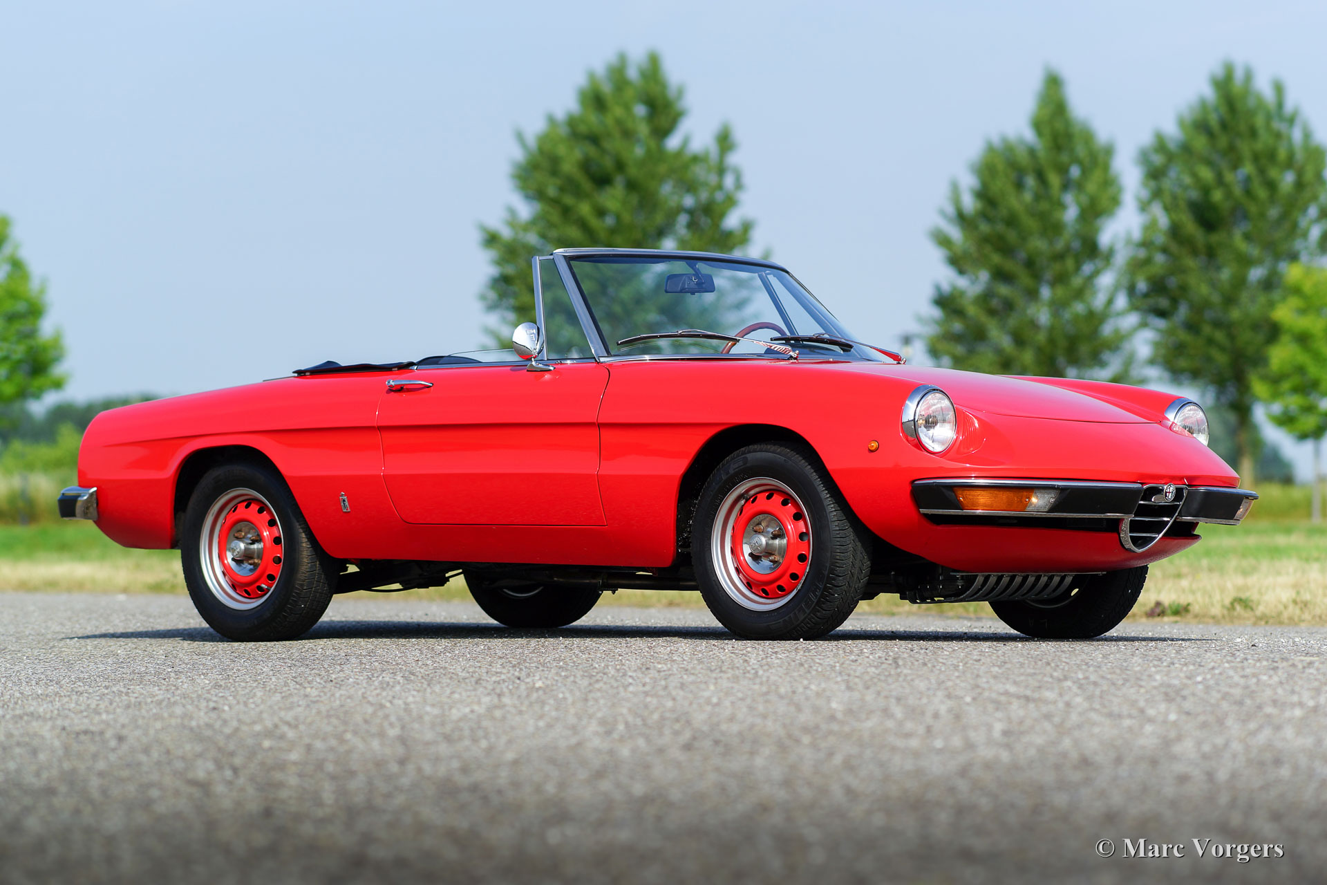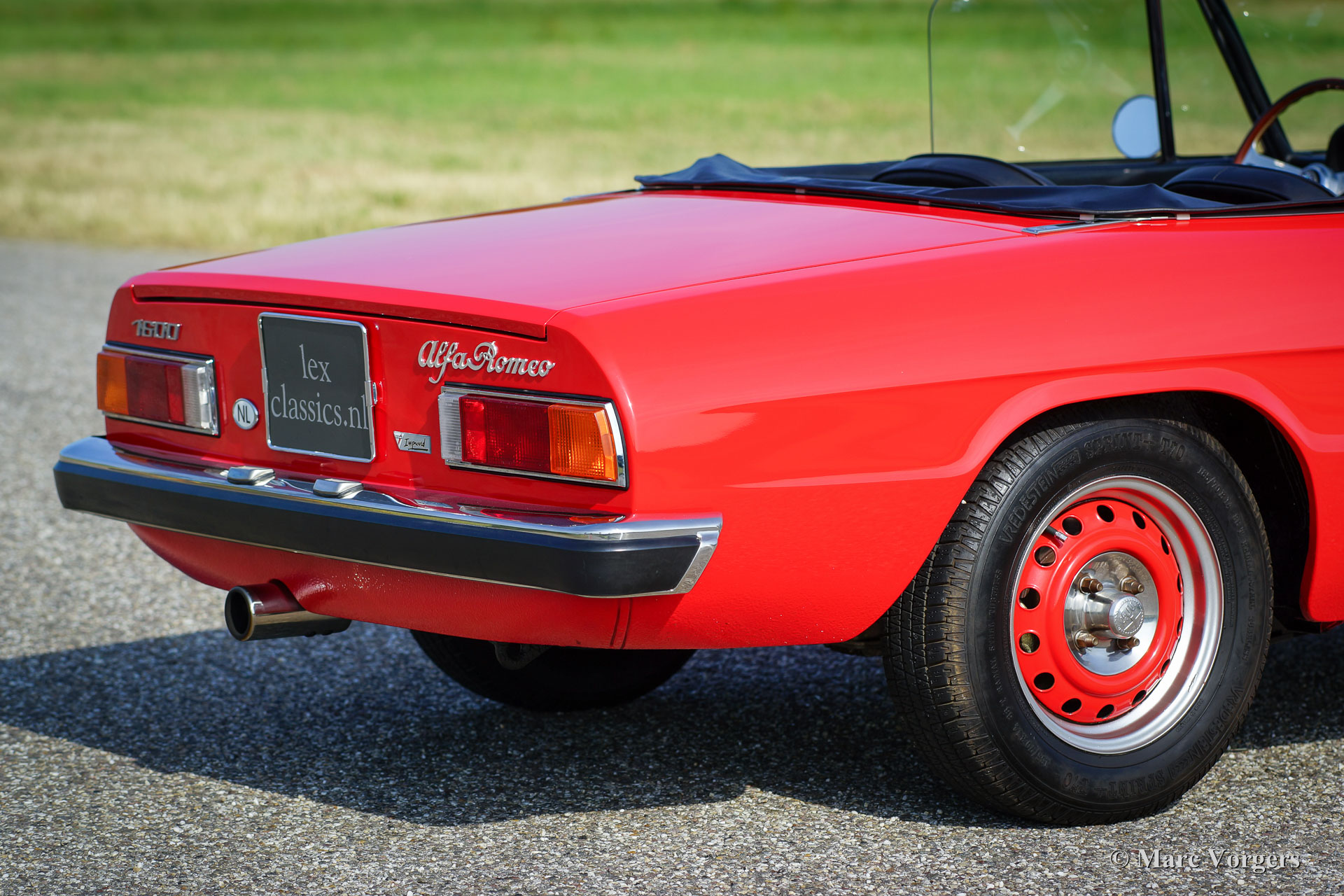 Alfa Romeo 1600 Spider ‘Coda Tronca’, year 1975. Colour red (Alfa Rosso 514) with a black leatherette interior and black rubber carpet. Black mohair hood and hood-cover. This gorgeous Alfa Romeo Spider was sold new in the Netherlands. The automobile was beautifully restored over the last years and the car is in superb condition! A comprehensive restoration file with invoices is present. The Spider ‘Coda Tronca’ (which means ‘cut-off rear’ in Italian) is the successor of the Spider ‘Duetto’. The latter possessed a rather small boot so this was corrected with the introduction of the ‘Coda Tronca’ model. The Alfa Romeo Spider combines beautiful Italian design with excellent sporty road holding and a comfortable ride. On this moment, the original steel wheels are painted red, these can be easily reverted to the original silver colour. This is a very fine and well restored example!