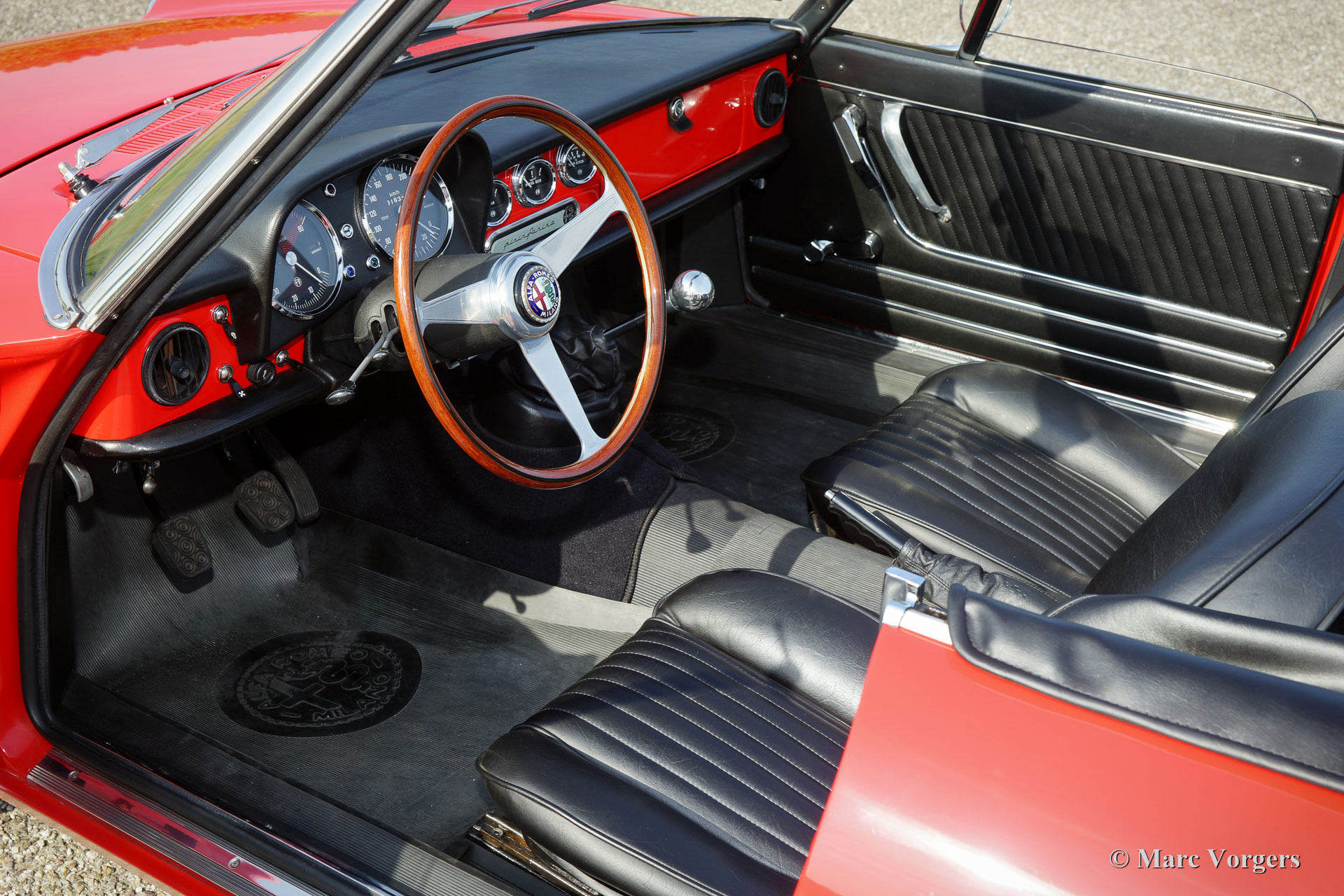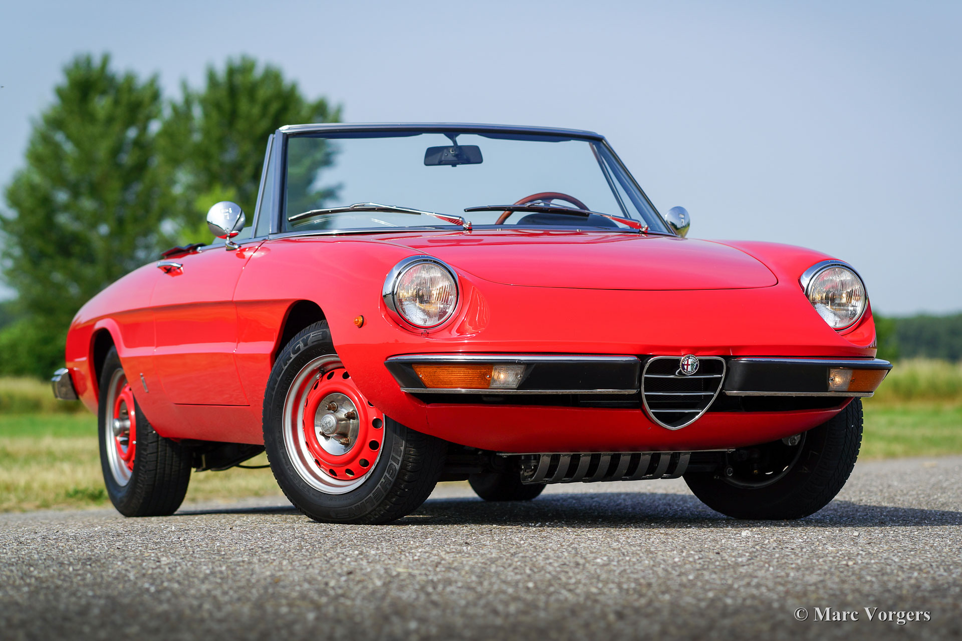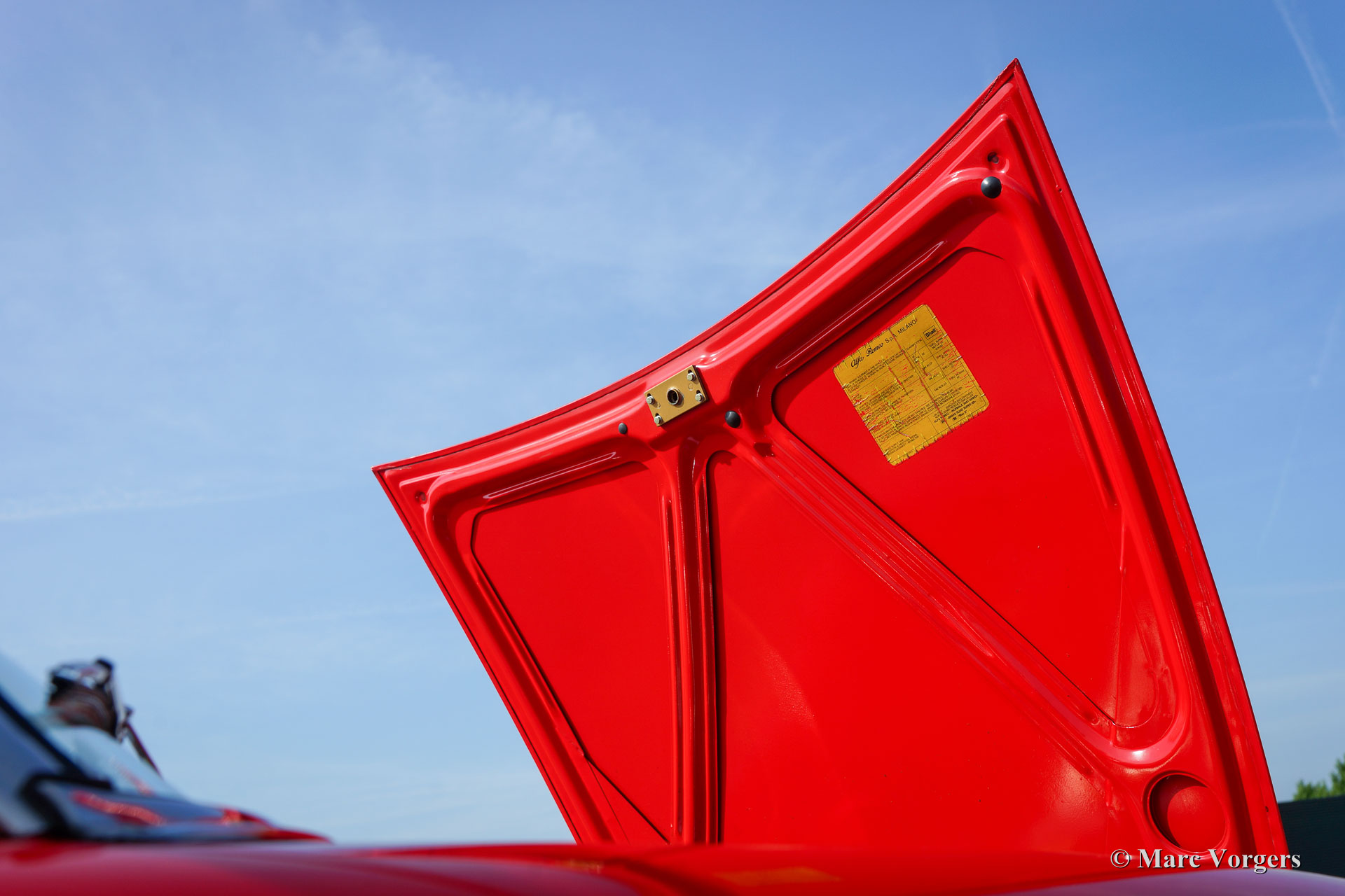 Alfa Romeo 1600 Spider ‘Coda Tronca’, year 1975. Colour red (Alfa Rosso 514) with a black leatherette interior and black rubber carpet. Black mohair hood and hood-cover. This gorgeous Alfa Romeo Spider was sold new in the Netherlands. The automobile was beautifully restored over the last years and the car is in superb condition! A comprehensive restoration file with invoices is present. The Spider ‘Coda Tronca’ (which means ‘cut-off rear’ in Italian) is the successor of the Spider ‘Duetto’. The latter possessed a rather small boot so this was corrected with the introduction of the ‘Coda Tronca’ model. The Alfa Romeo Spider combines beautiful Italian design with excellent sporty road holding and a comfortable ride. On this moment, the original steel wheels are painted red, these can be easily reverted to the original silver colour. This is a very fine and well restored example!