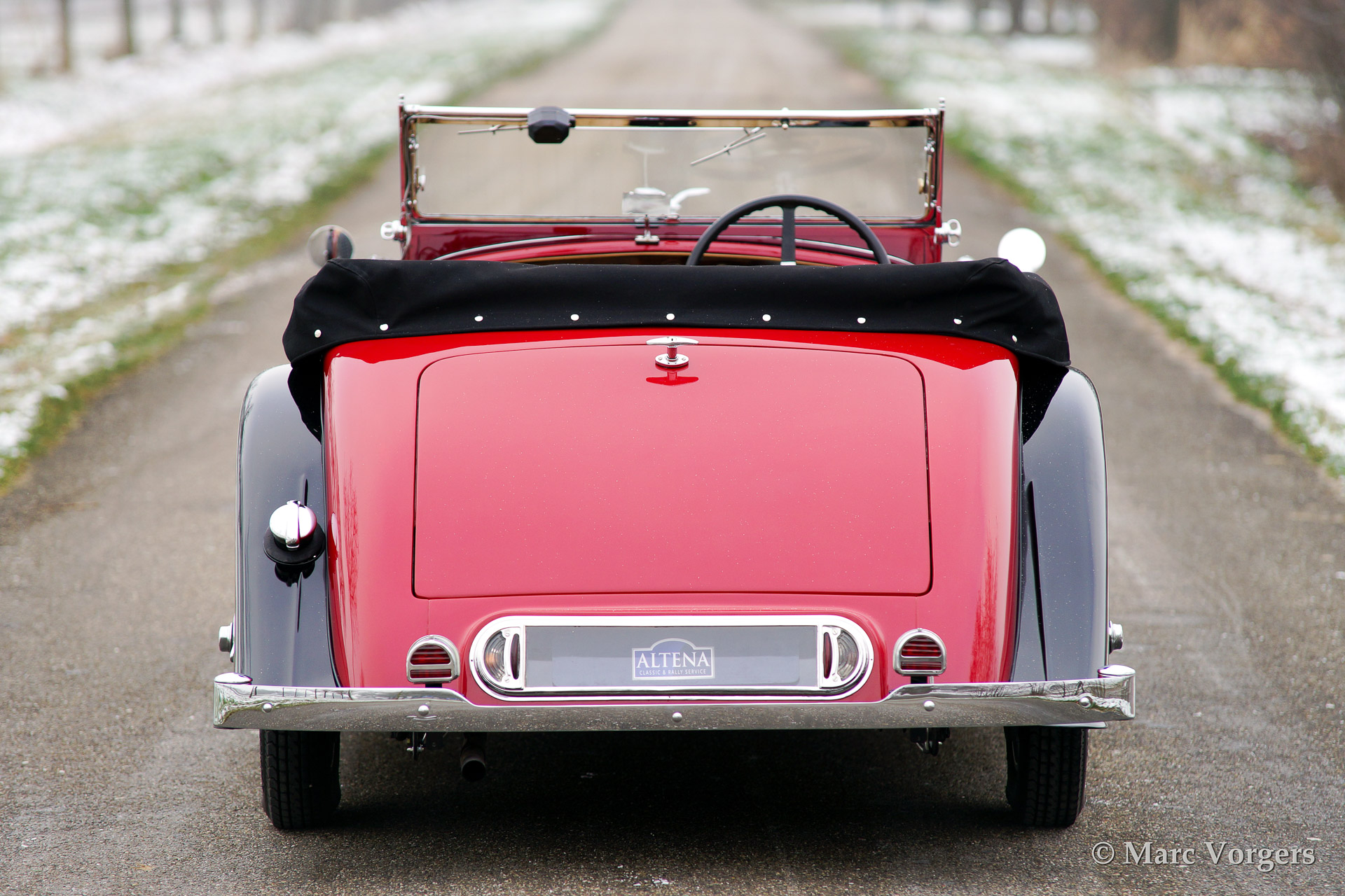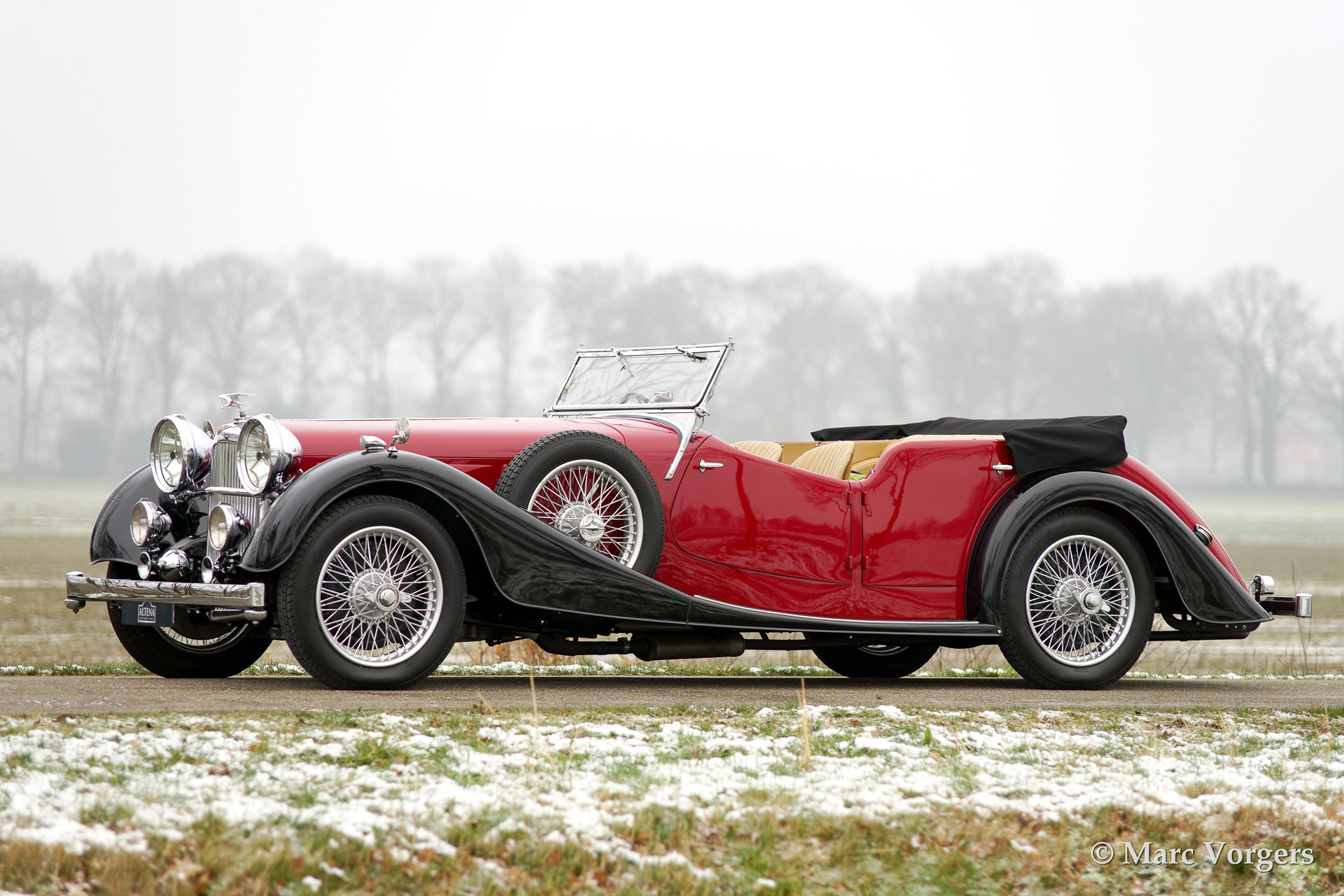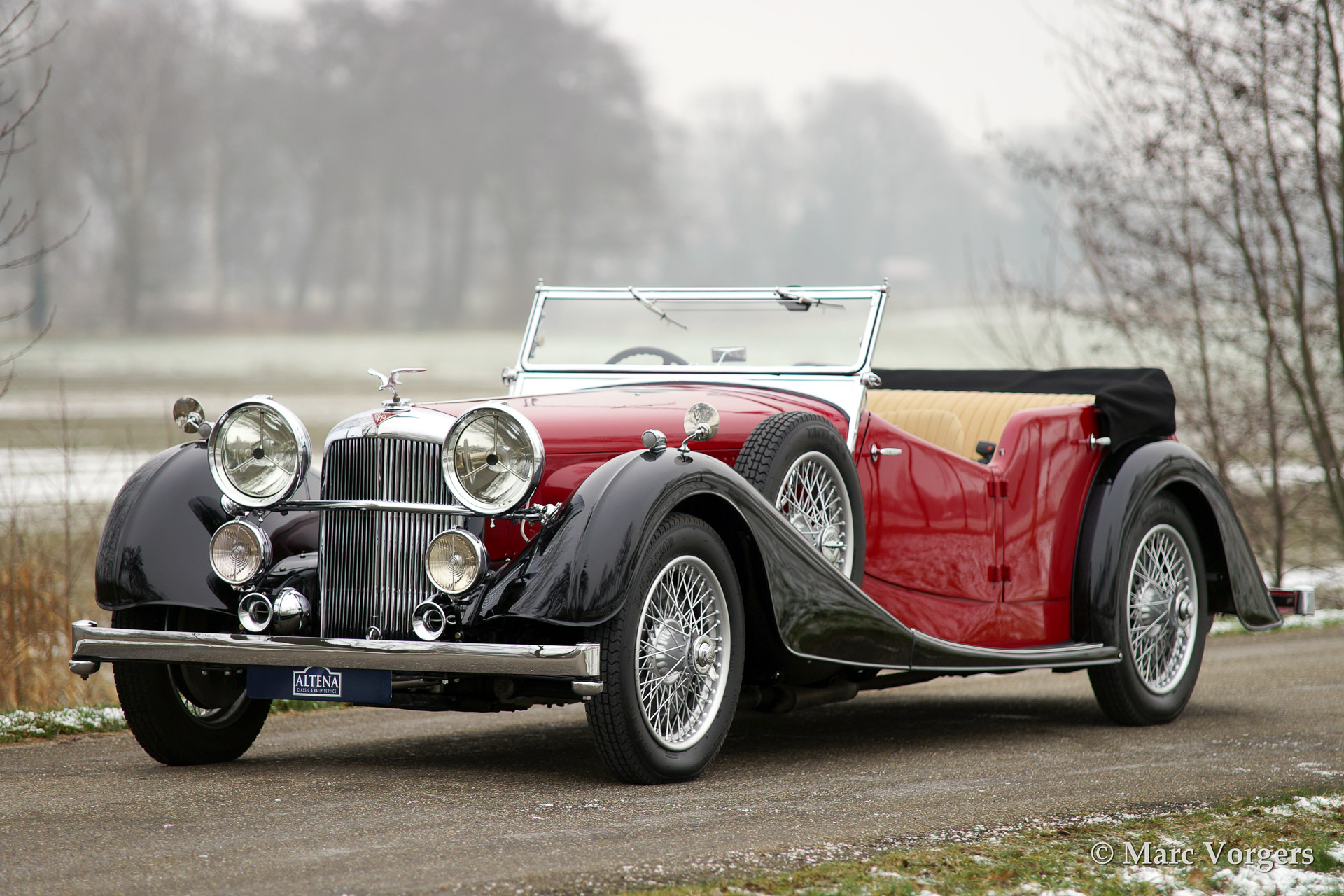 Alvis Speed 25 SB Cross & Ellis tourer, year 1938. Colour two-tone red over black with a beige (tan) leather interior. This fine automobile was extensively restored retaining all original details. In total only 391 Speed 25 chassis were built of which 220 survive today (source: Kenneth Day's 'The story of the Red Traingle', fourth edition). It is said that 39 Speed 25 chassis were clad with this Cross & Ellis tourer bodywork of which only 19 cars with original bodywork are still known to exist.
