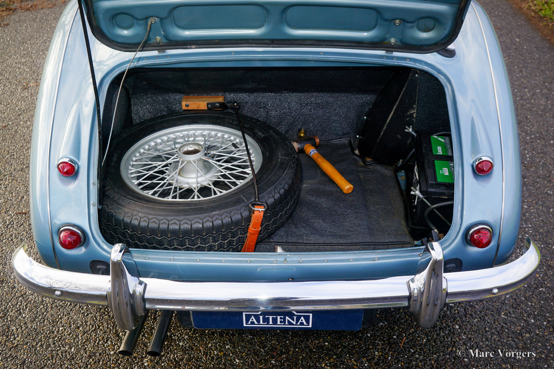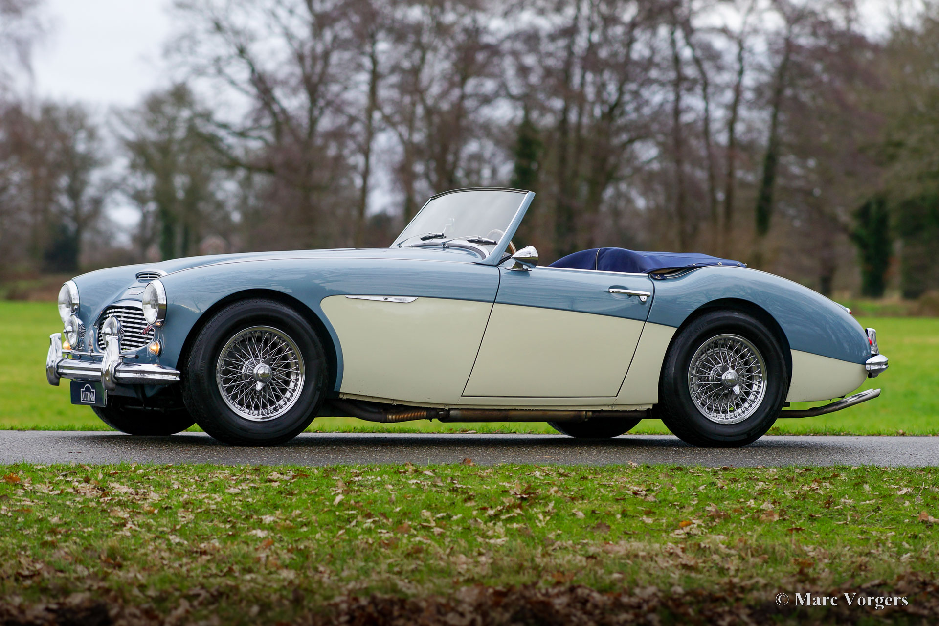 Austin healey 100/6 BN4, year 1957. This wonderful Austin Healey was sold new in Missouri USA, the original title is still present. Colour Ice Blue metallic over crème white combined with a dark blue leather interior and dark blue carpet. Dark blue mohair soft-top and tonneau cover. This gorgeous Austin Healey 100-SIX was imported from the US to the Netherlands in 1996. After arrival in the Netherlands the car was extensively restored and overhauled. A photo report of the restoration is present. Now, over twenty year later, the automobile is still in a very good to excellent condition, showing only slight signs of use. One can see that the restoration was executed to high standards! The car was wonderfully serviced and maintained, one look under the bonnet confirms this. The car comes well documented, and the previous owners are known. This ‘big Healey is fitted with the following options: Overdrive, chrome wire wheels, disc brakes at the front wheels, a MotoLita steering wheel with wood rim, two chrome ‘bullet style’ door mounted rear view mirrors, a chrome badge bar, Lucas SLR576 ‘spot’ driving lamps, and a tiny clock in the foot of the rear view mirror. This Austin Healey 100-SIX is a magnificent ‘old school’ British sports car in wonderful condition! The car will bring a lot of driving fun and new adventures for the proud new owner!