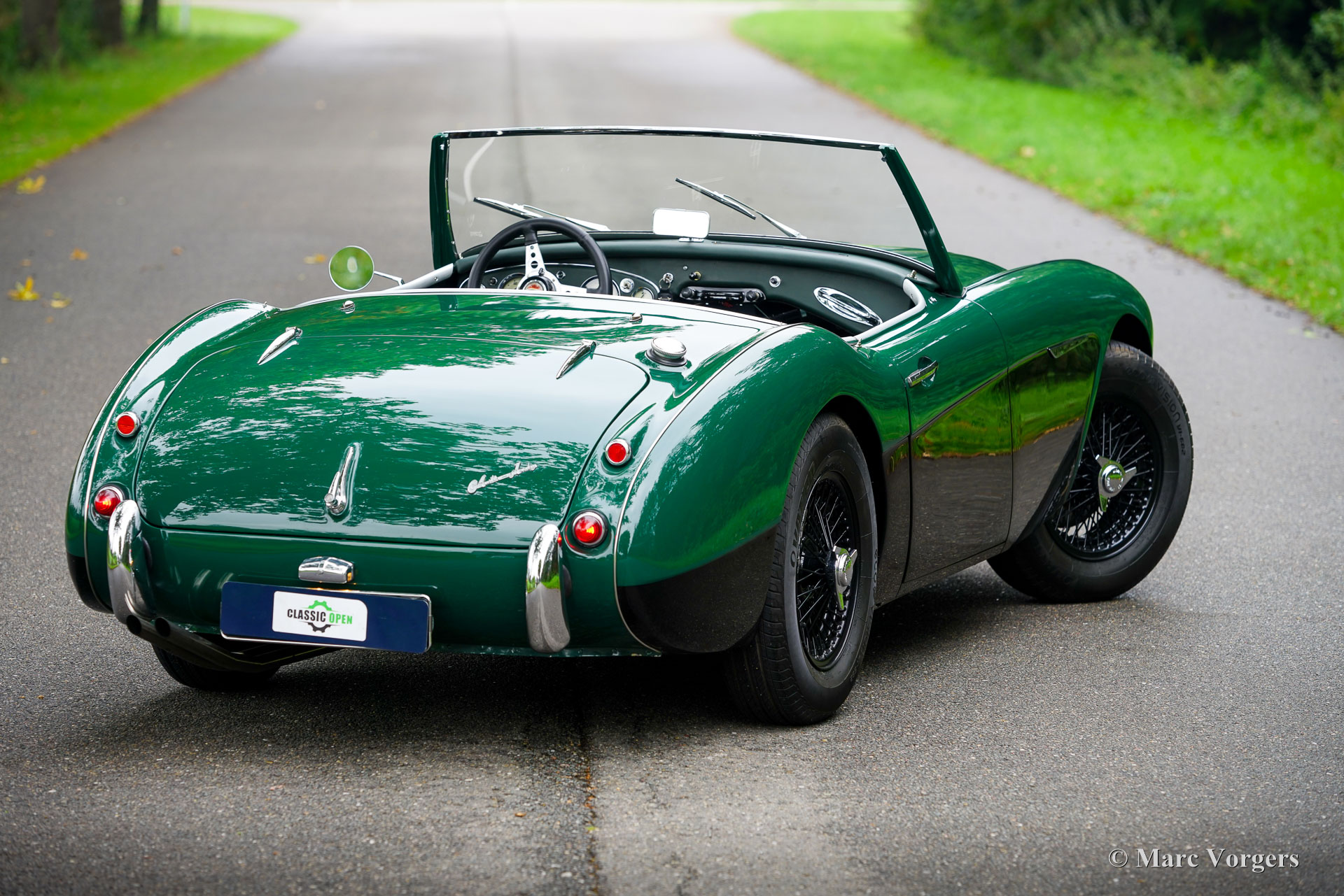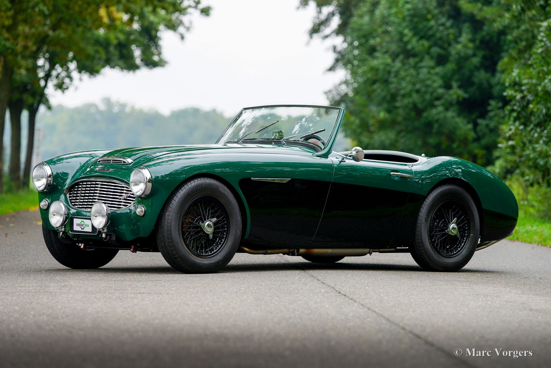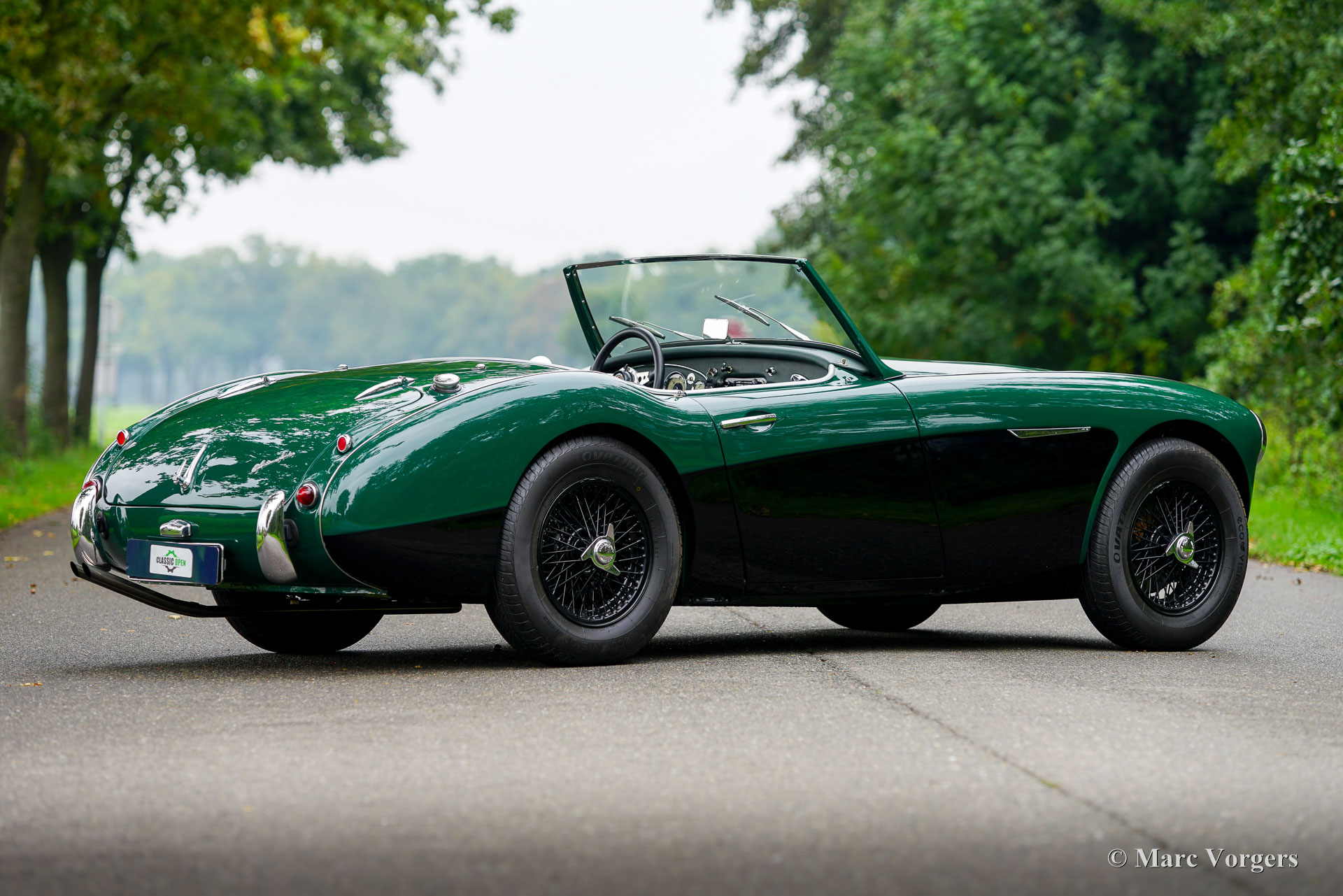 Austin Healey 100/6 (BN6) ‘two-seater’, year 1958. Body colour British Racing Green over black combined with a dark green leather interior trimmed with black piping and pale (suede) green carpet. Black vinyl soft-top and a black canvas tonneau cover. This fabulous ‘Big Healey’ was extensively restored and overhauled in the period 2020-2022. After completion of the restoration the car was driven sparsely. This fine Austin Healey 100 ‘SIX’ is in an excellent top condition and it drives perfectly! No matching numbers car (the engine was exchanged in the past) but a ‘big Healey’ which ticks all the boxes of desirability! It is a two-seater fitted with the engine of a 3000 Mk III, fitted with the big SU carburettors and a ‘centre-shift’ gearbox with overdrive. The car is also fitted with disc brakes at the front wheels, an alternator and electronic ignition. The 150 bhp engine adds greatly to the driving experience with its massive torque. The exterior looks purposeful in its British Racing green with black. The black wire wheels and the big Lucas SFT700 lamps add to the sporty appearance as does the deletion of the standard bumpers. Now, chrome bumperettes are fitted at the rear. The Austin Healey is one of the… No, possibly the best-looking British roadster ever made! This example will be a great treasure to own and look at in your garage, and a fantastic car driver car to enjoy to the fullest!