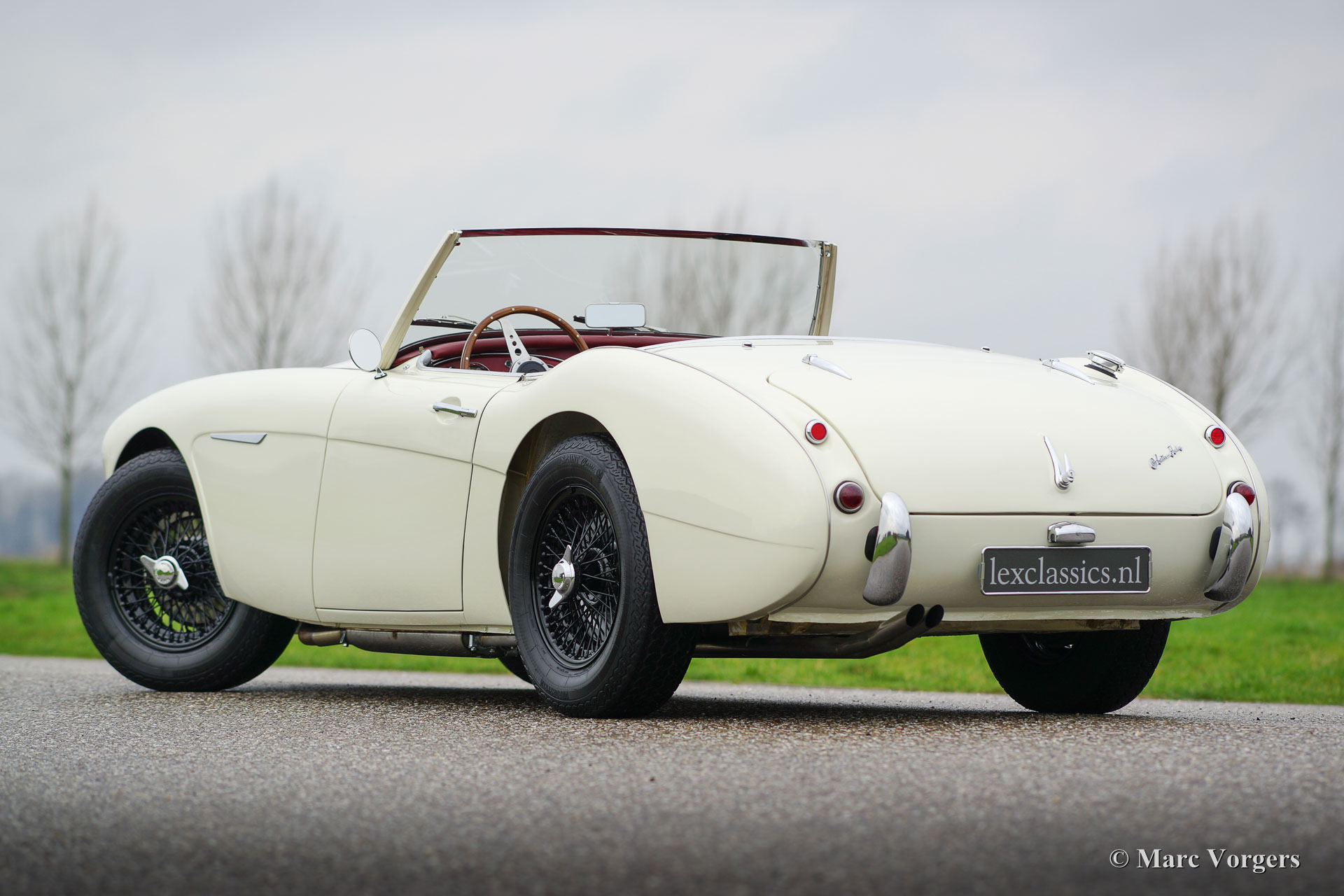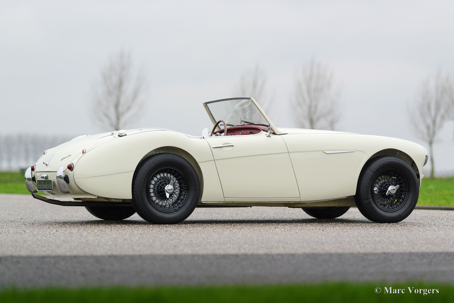 Austin Healey 100/6 BN6 ‘two-seater’, year 1959. Colour ‘Old English White’ with a red leather interior trimmed with white piping. Red carpet and black rubber protective mats. The relatively rare Austin Healey 100/6 ‘two-seater’ was built in the years 1958 and 1959. This Healey 100/6 was imported from the USA to the Netherlands in the year 1990. Then the automobile was extensively restored and the engine was overhauled. In the year 2015 the car was stripped and given beautiful new paint. This fantastic Healey 100/6 BN6 is in excellent condition and the car drives perfectly. The car comes in special ‘rally look’ with the bumpers deleted. The original bumpers are included and these can be easily fitted if desired. This ‘Big Healey’ features black enamelled wire wheels, chrome eared ‘knock off’ wheel nuts, fog-lams at the front, a Kenlow cooling fan, overdrive and a red vinyl soft-top.