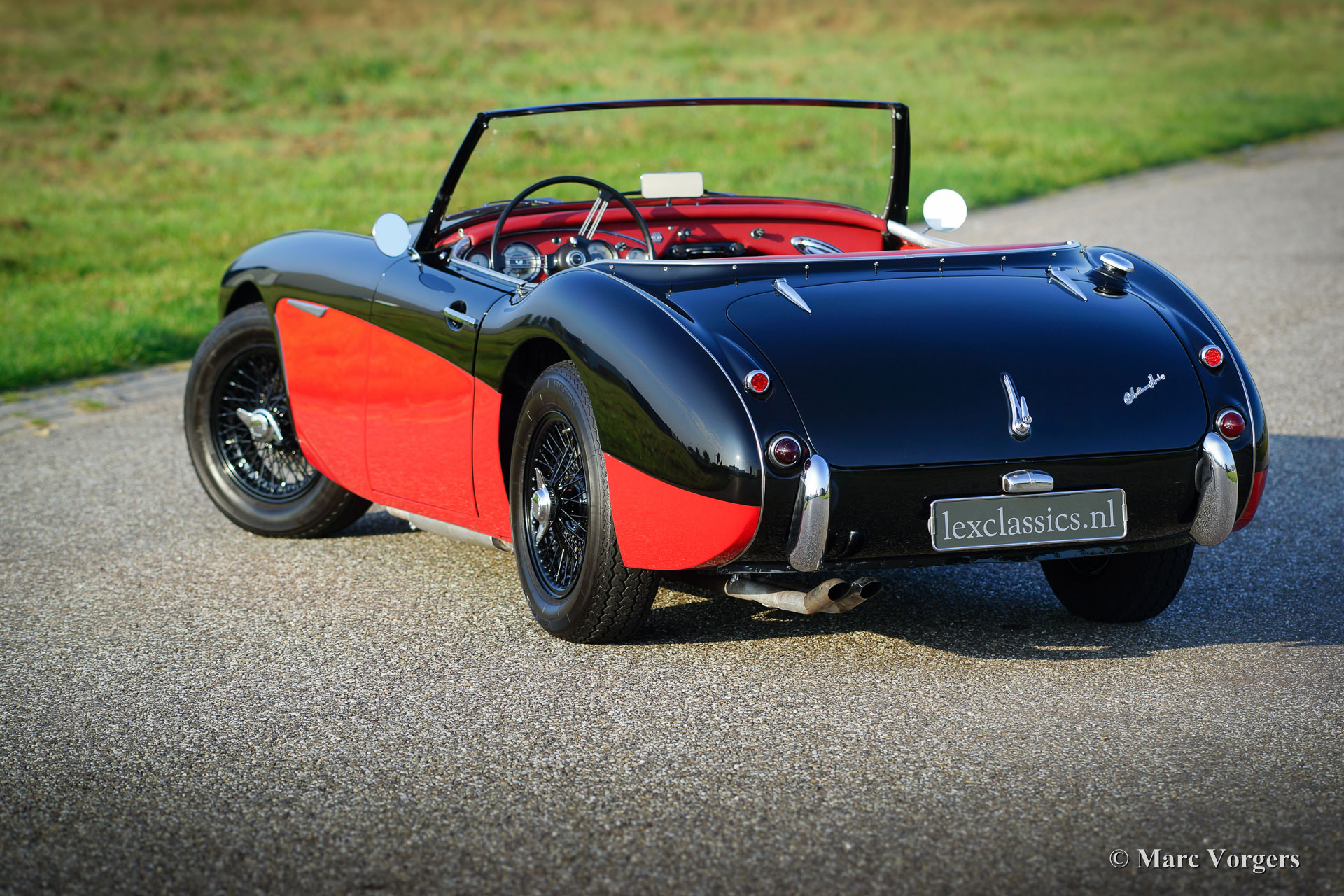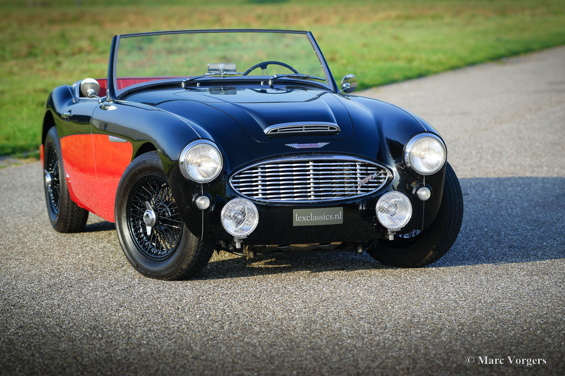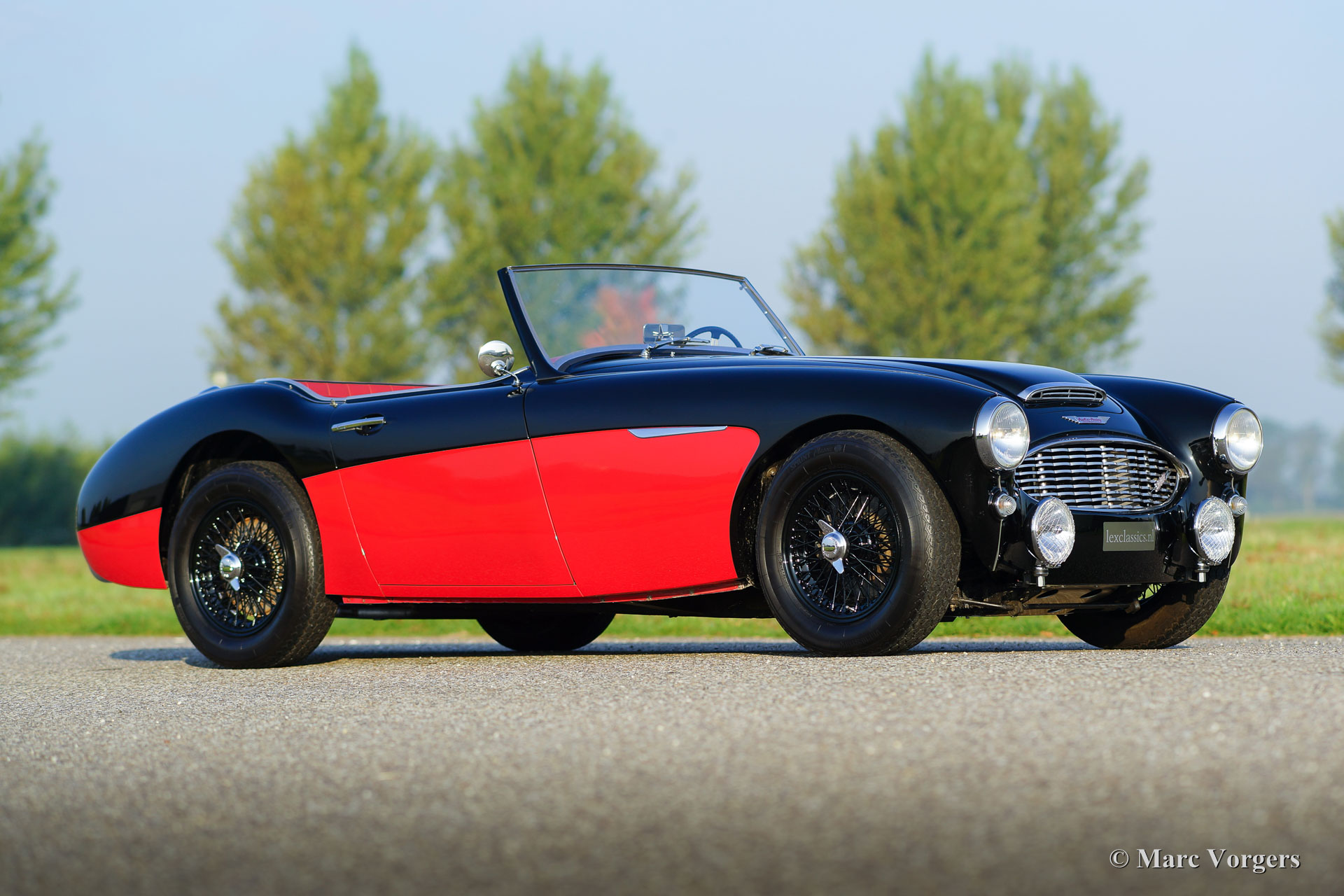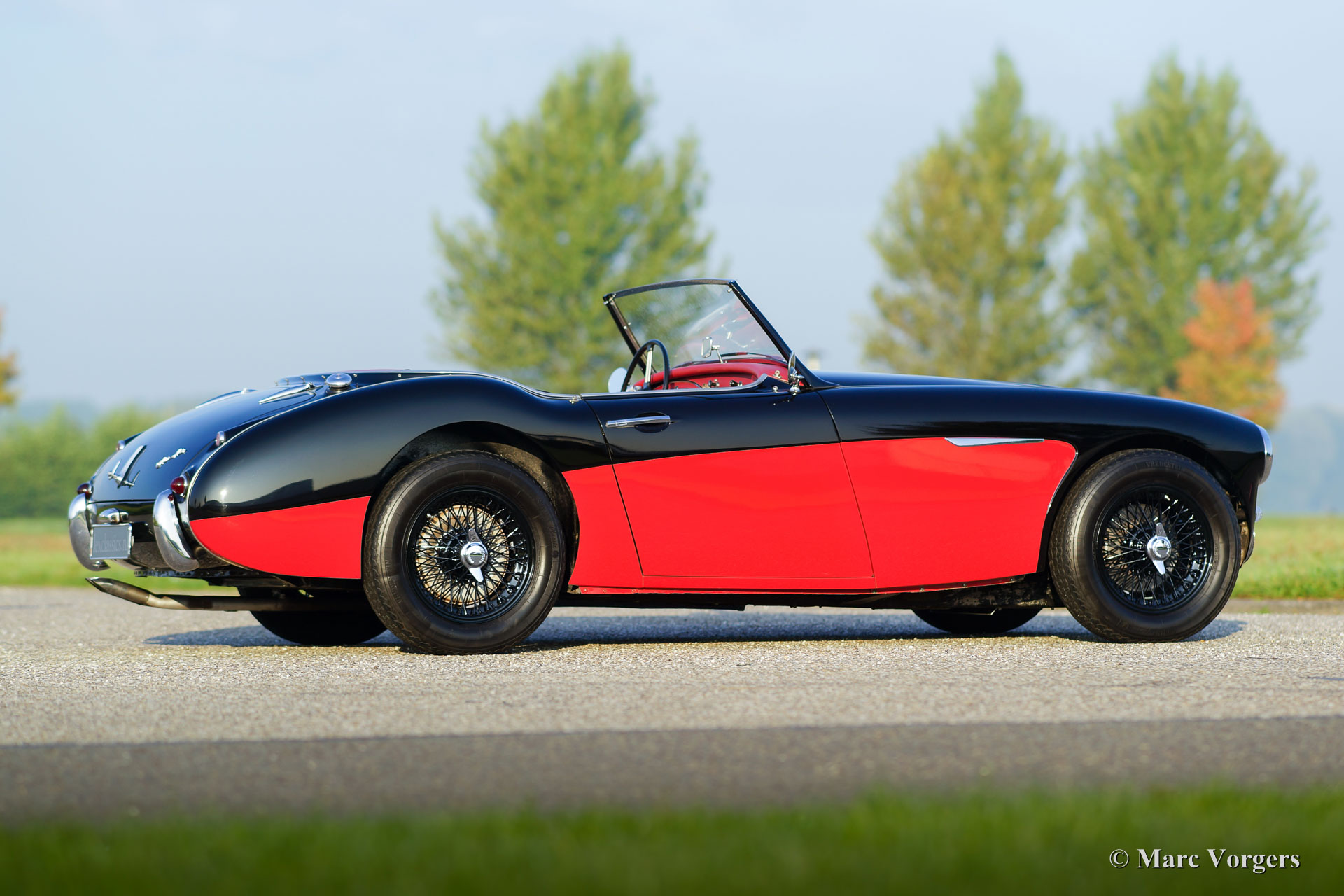 Austin Healey 3000 Mk I, year 1960. Colour black over red with a red leather interior trimmed with black piping and red carpet. This magnificent ‘Big Healey’ was extensively and ‘body-off’ restored in the Netherlands a few years ago. A photo reportage and invoices of the restoration are present. This Austin Healey is in excellent to superb condition and the car drives perfectly! For a more sporty and masculine appearance we have adapted the car to ‘rally look’ by taking of the bumpers and by adding black painted wire wheels. At the front additional driving lamps have been fitted and at the rear chrome over-riders were mounted. The original bumpers are, of course, still with the car. Furthermore, the car features overdrive, chrome ‘knock-off’ wheel nuts, Mohair soft-top and side-curtains, Mohair tonneau-cover, 123 electronic ignition, aluminium petrol tank, two chrome rear-view mirrors, petrol cap with lock and an electric Pierburg petrol pump. A tremendous ‘big Healey’ in excellent condition!