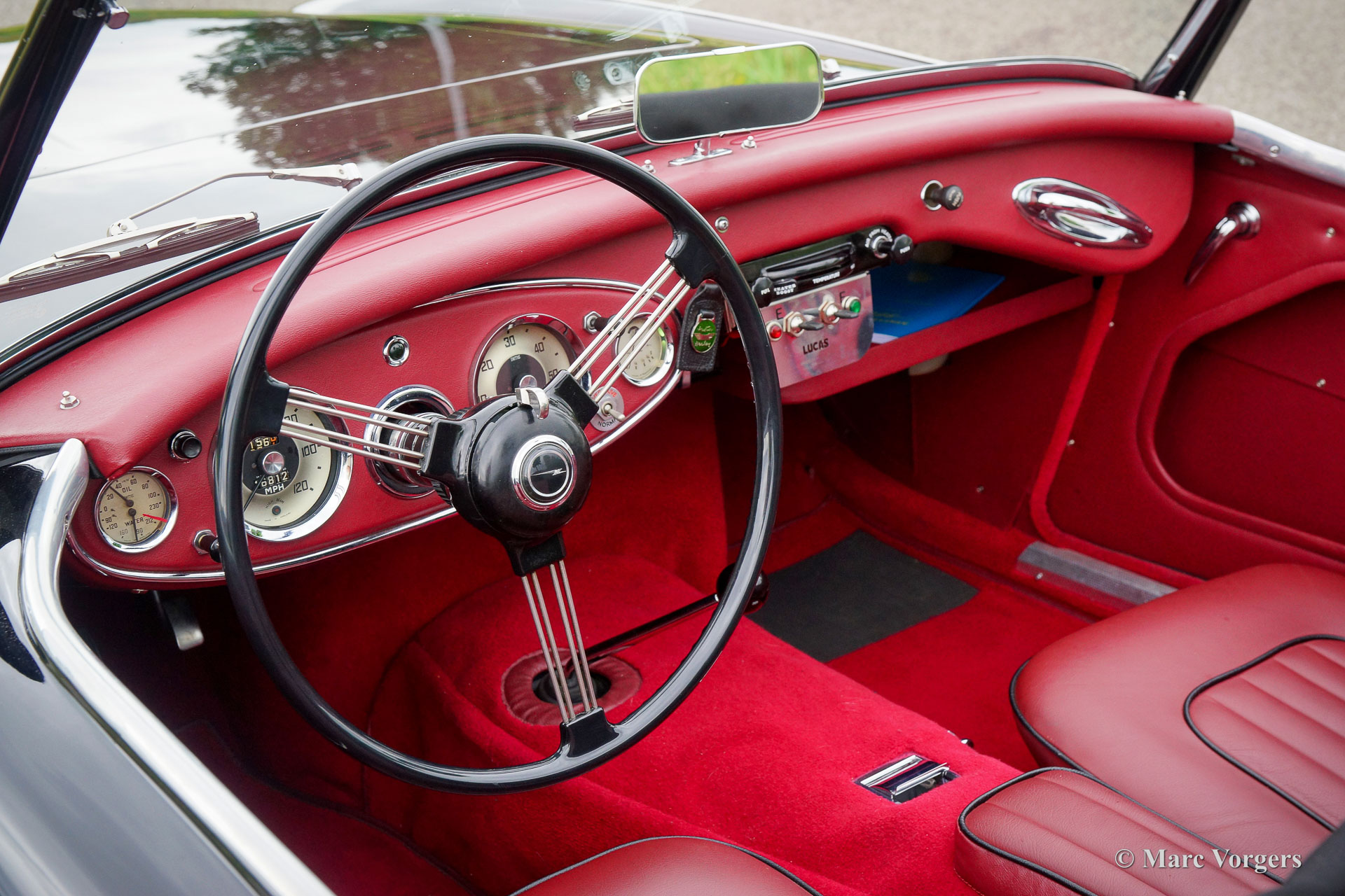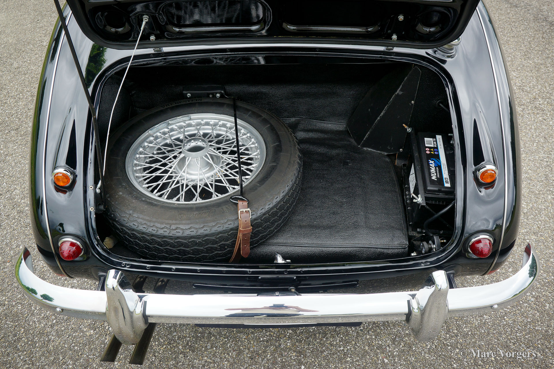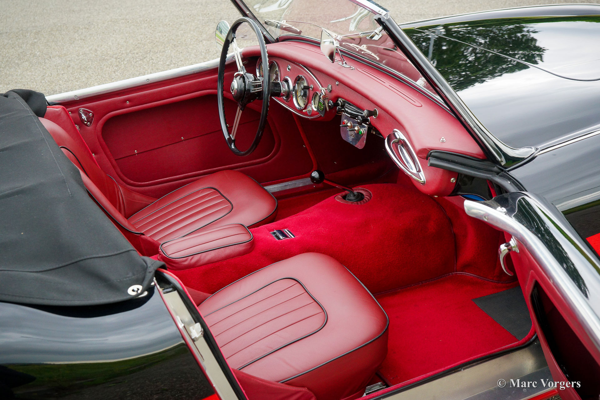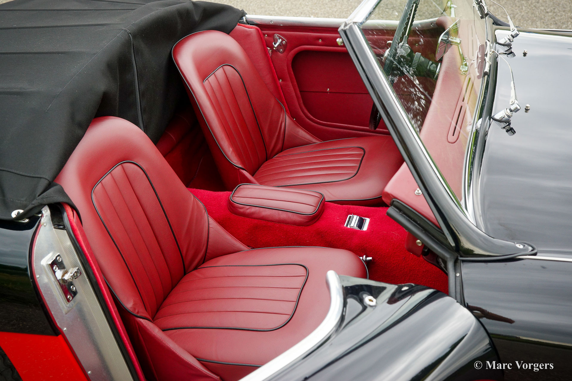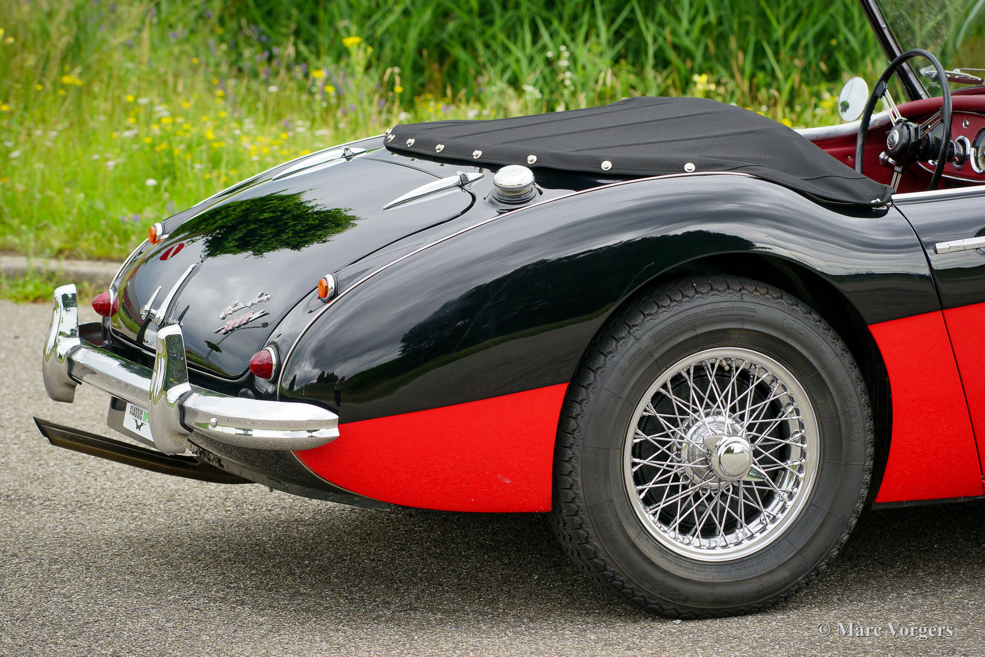 Austin Healey 3000 Mk I (BT7), year 1960. Colour black with red sides combined with a red leather interior trimmed with black piping and red carpet. Black vinyl soft top, a black mohair tonneau cover. And aluminium side screens. This gorgeous ‘Big Healey’ was extensively restored in the past, the automobile is in an excellent condition and the car drives perfectly! A photo report of the restoration is present as is a Heritage Certificate. This magnificent Austin Healey features overdrive, chrome wire wheels, Michelin 185-15 tyres, a badge bar, Lucas SLR576 spot lamps, an aluminium rocker cover, an aluminium oil-sump, a Stainless-Steel exhaust, improved cooling, and an electric cooling fan. This is a highly desirable top quality Austin Healey MK I for the enthusiast!