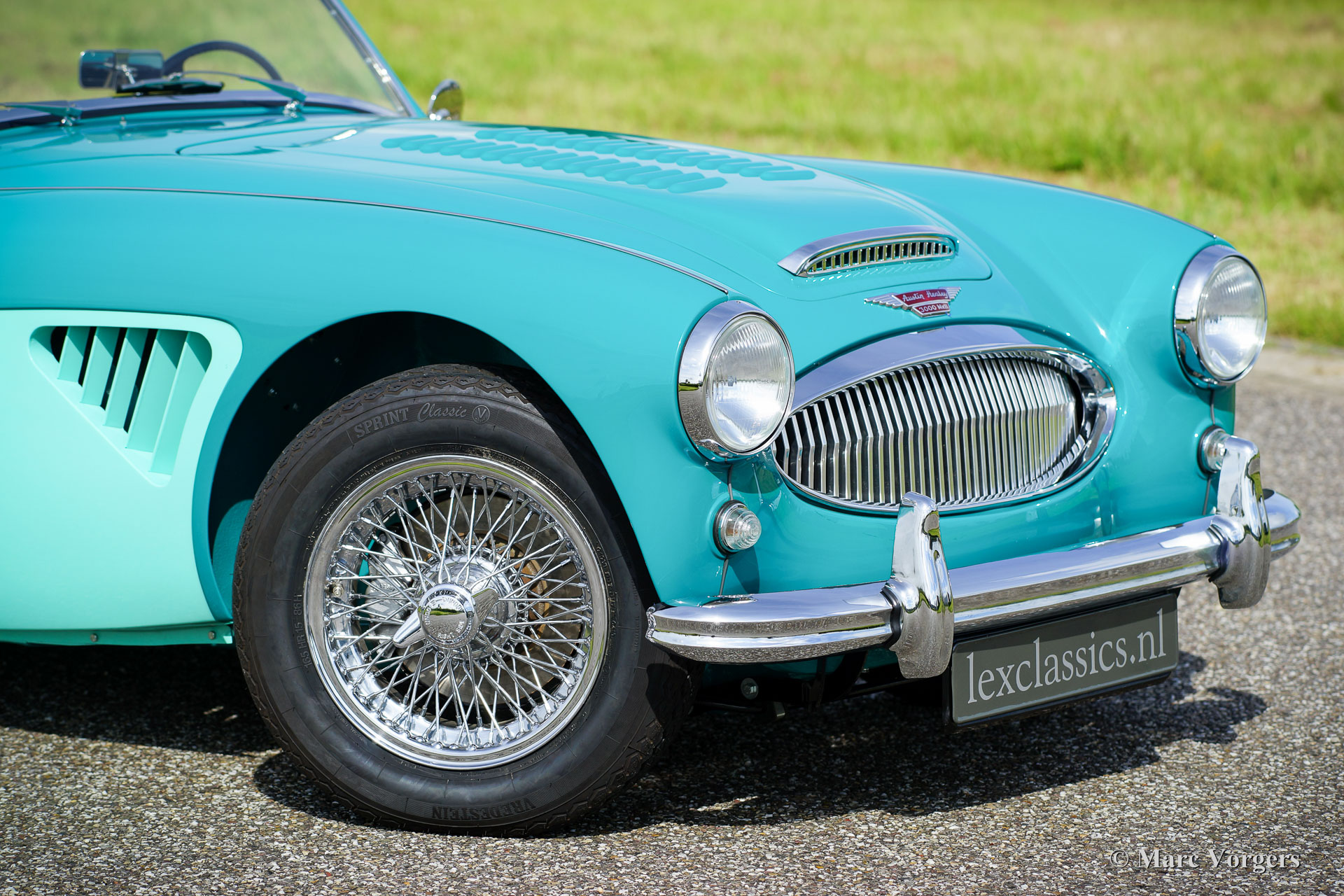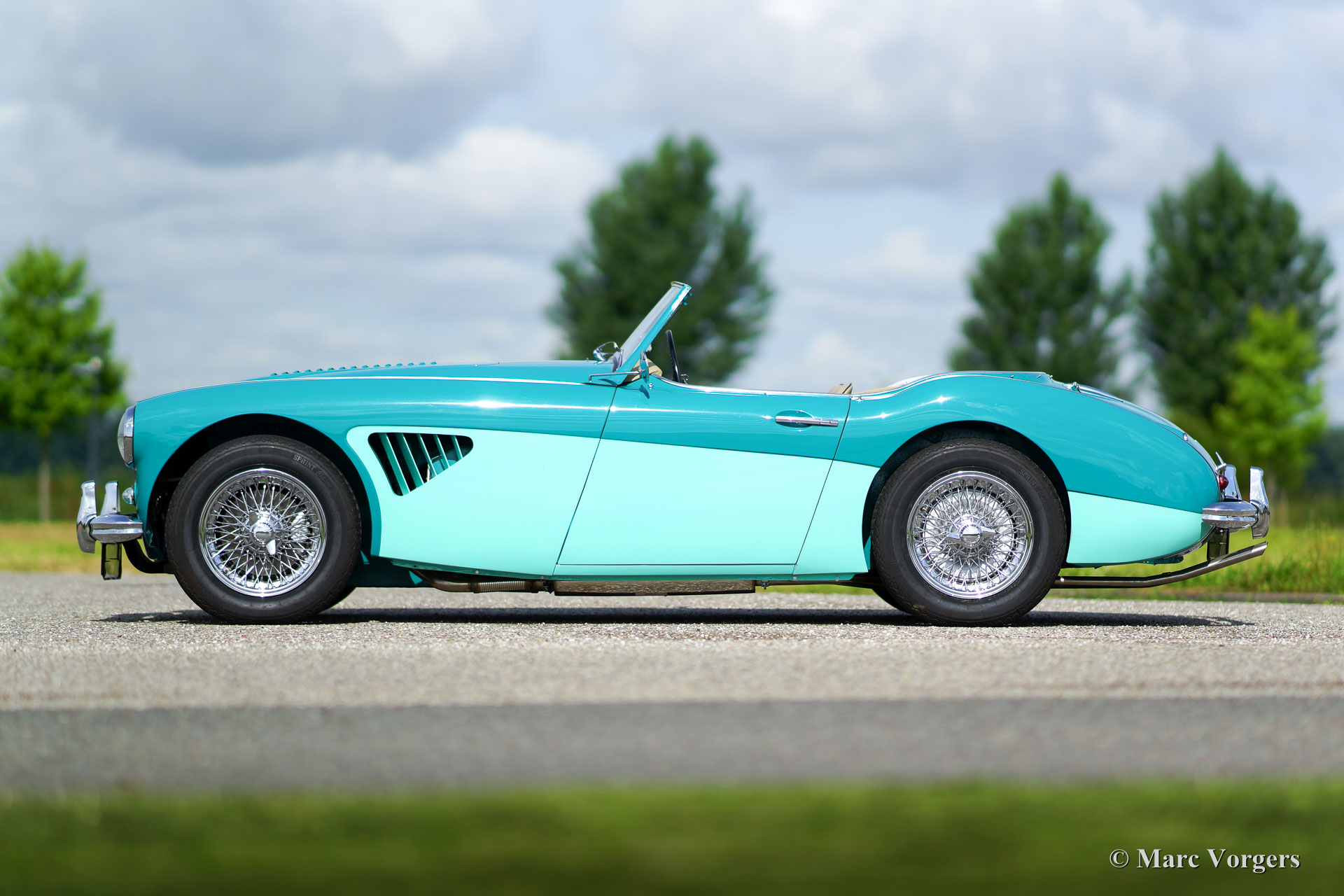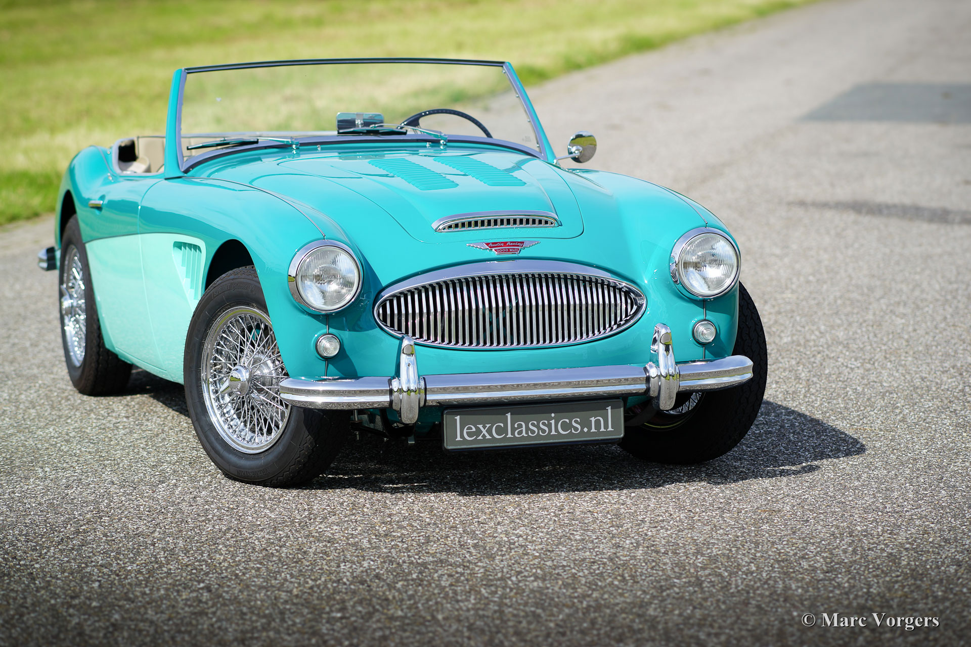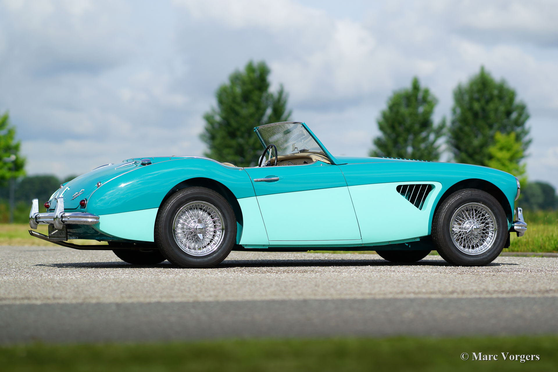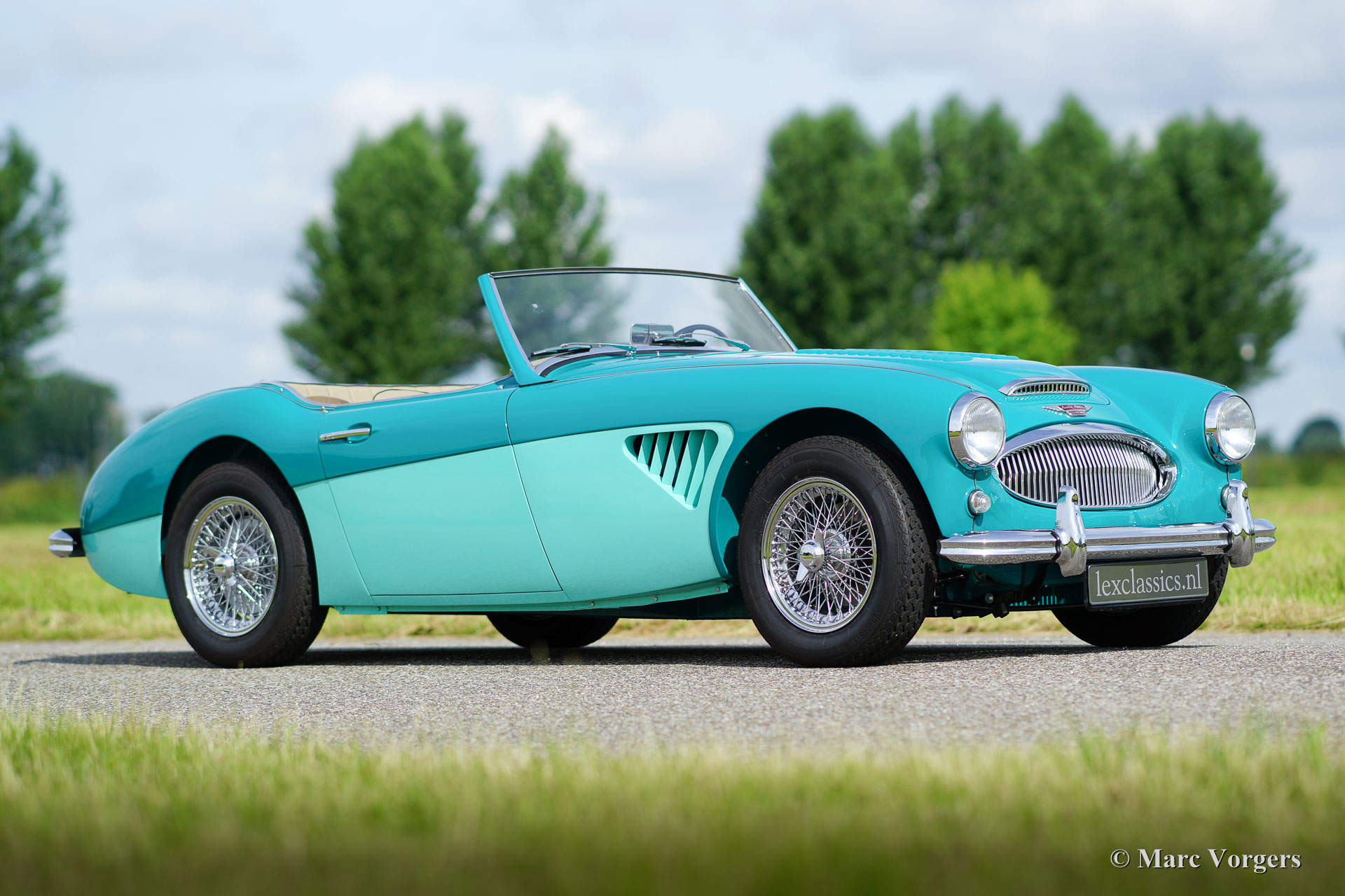 Austin Healey 3000 Mk II, year 1961. Colour ‘two-tone’ Pacific Blue over Florida Green with a beige leather interior trimmed with dark green piping. Beige soft-top and side-screens. This magnificent Austin Healey was extensively and ‘body-off’ restored by a Dutch specialist. In the process the engine and the gearbox were overhauled. A photo reportage of the restoration is present. The automobile is in superb TOP condition! The automobile features overdrive, chrome wire wheels, chrome ‘knock-off’ wheel nuts, additional cooling louvres in the front wings and three SU carburettors. This magnificent ‘Big Healey’ drives perfectly!
