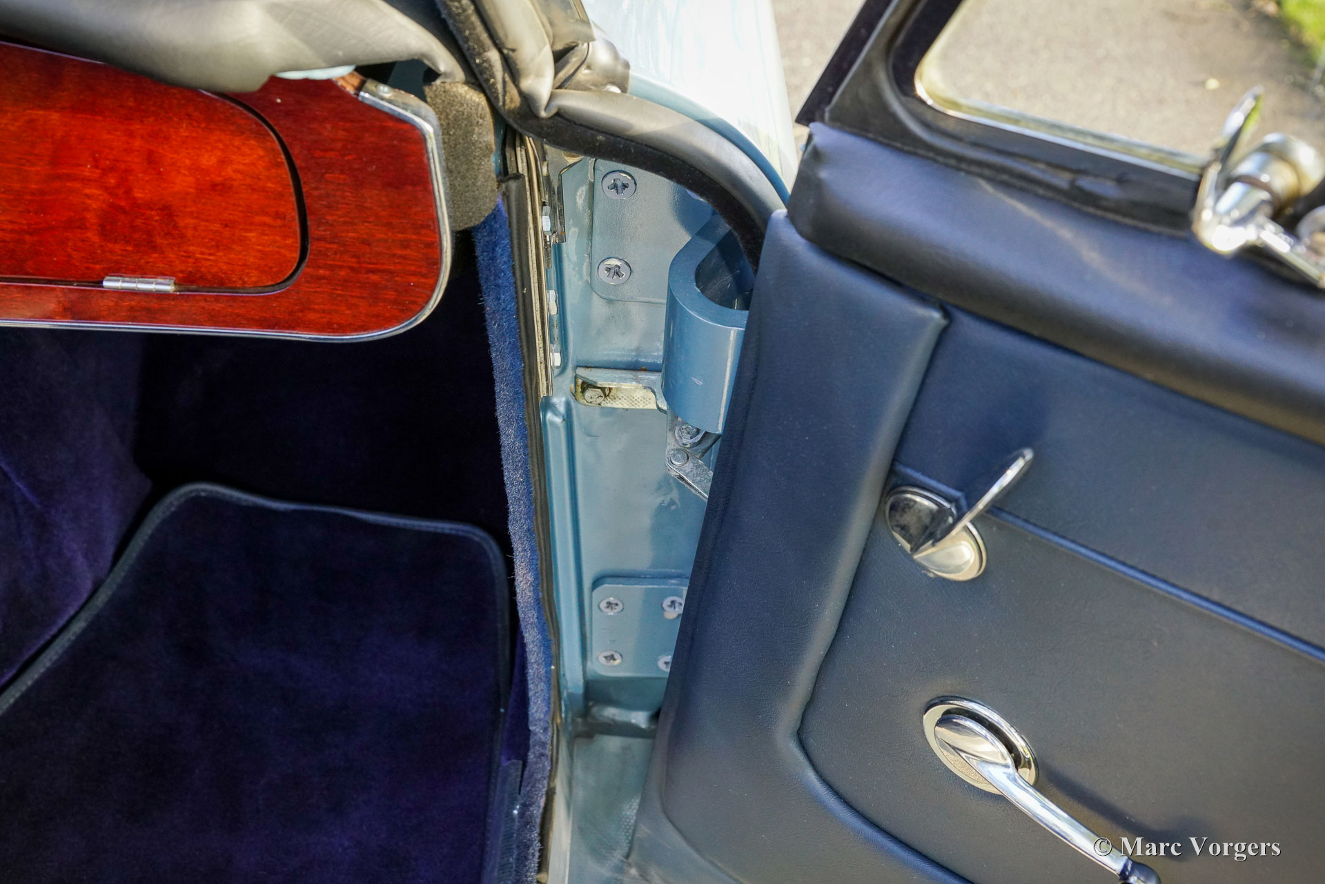 Austin Healey 3000 MK III phase 2 (BJ8), year 1967. Colour Ice blue metallic over creme white combined with a dark blue leather interior and dark blue carpet. Dark blue mohair soft top and hood cover. This gorgeous Austin Healey 3000 Mk III of the last phase 2 series was extensively restored in recent years. Since the restoration was completed, the car has driven 4000 kilometres in the hands of one careful owner. The automobile is in a superb top condition and the car drives perfectly. The 3000 Mk III models can be clearly distinguished from its predecessors by the dashboard clad with walnut wood panels and instruments with black back grounds. This fantastic ‘Big Healey’ shows all the original details! The car is fitted with chrome wire wheels, and it comes with a blue vinyl tonneau cover. The big 150 bhp straight-six engine sounds wonderfully, and it delivers masses of torque. This is one of the nicest extensively restored Austin Healey 3000 MK III models you will find for sale. The car is ready to be enjoyed by a new proud owner!