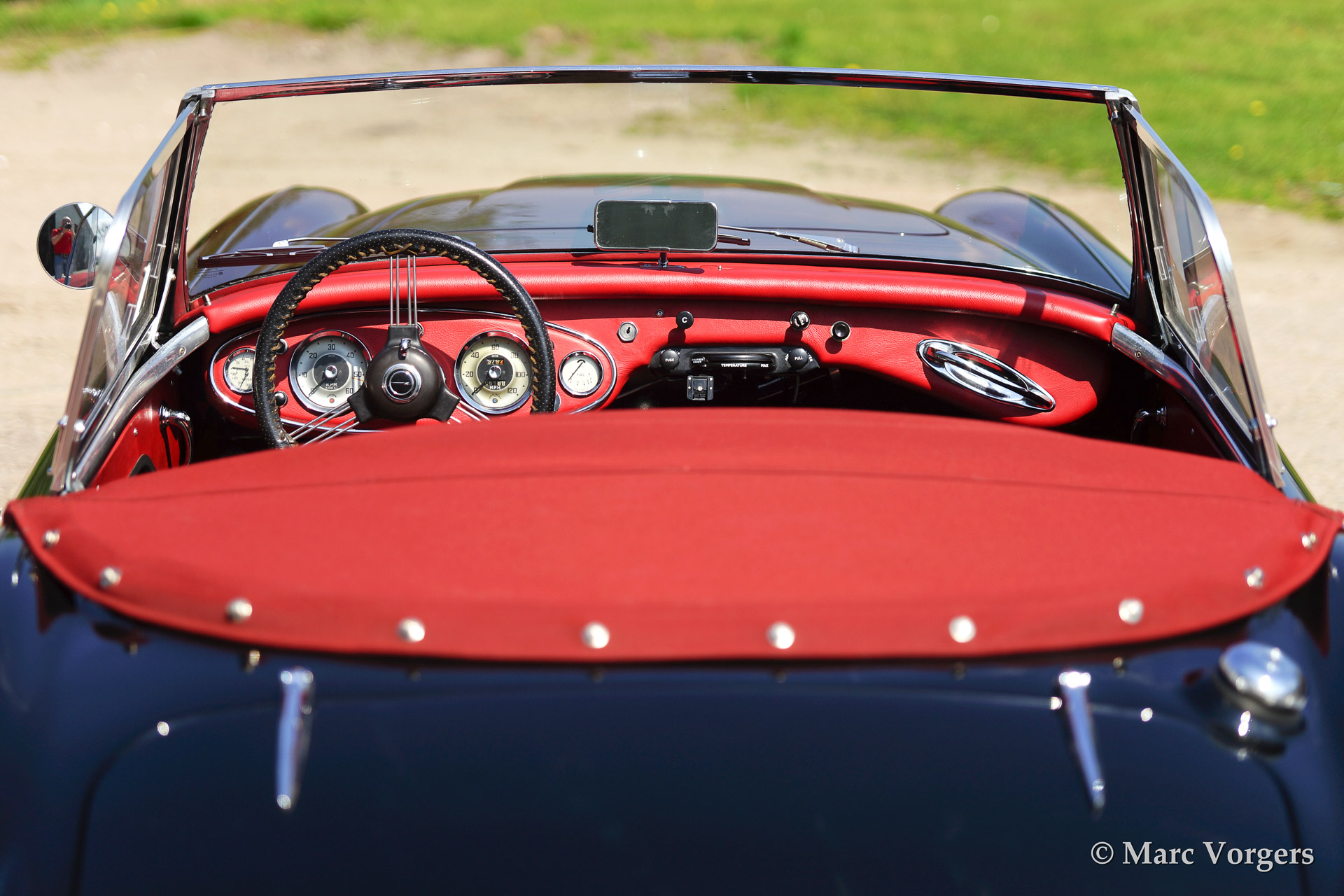 Austin Healey 3000 Mk I, year 1959. Colour black over red with black enameled wire wheels. Red leather interior and red mohair weather equipment. This fantastic 'Big Healey' was extensively restored.