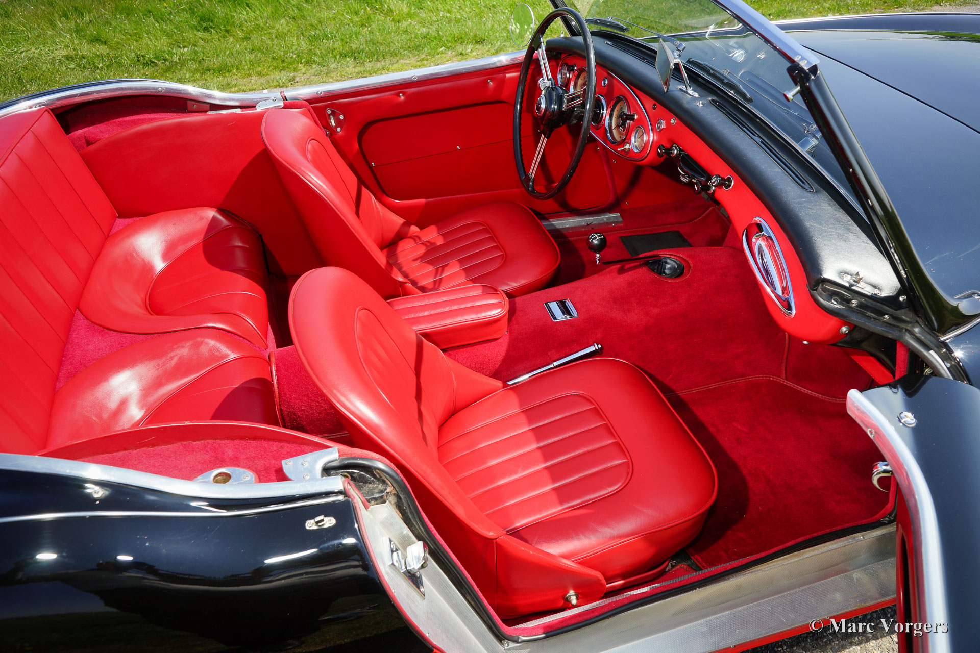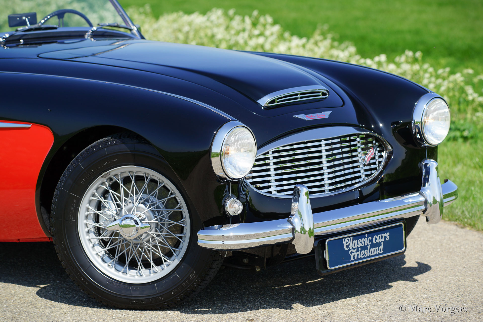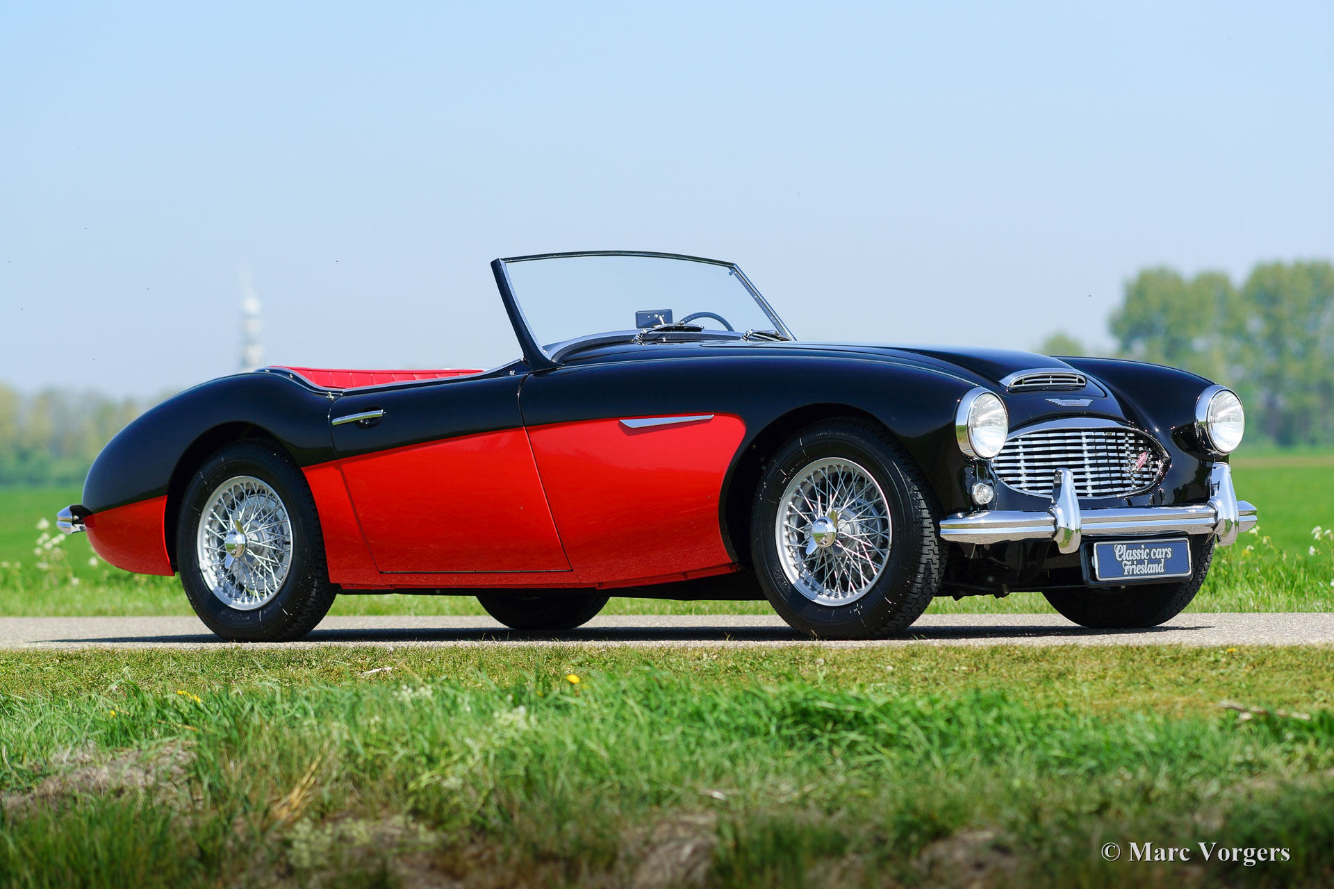 Austin Healey 3000 Mk I, year 1959. Colour black over Colorado red. Red leather interior and red carpet. Black soft top. This magnificent 'Big Healey' is in superb top condition; concours!