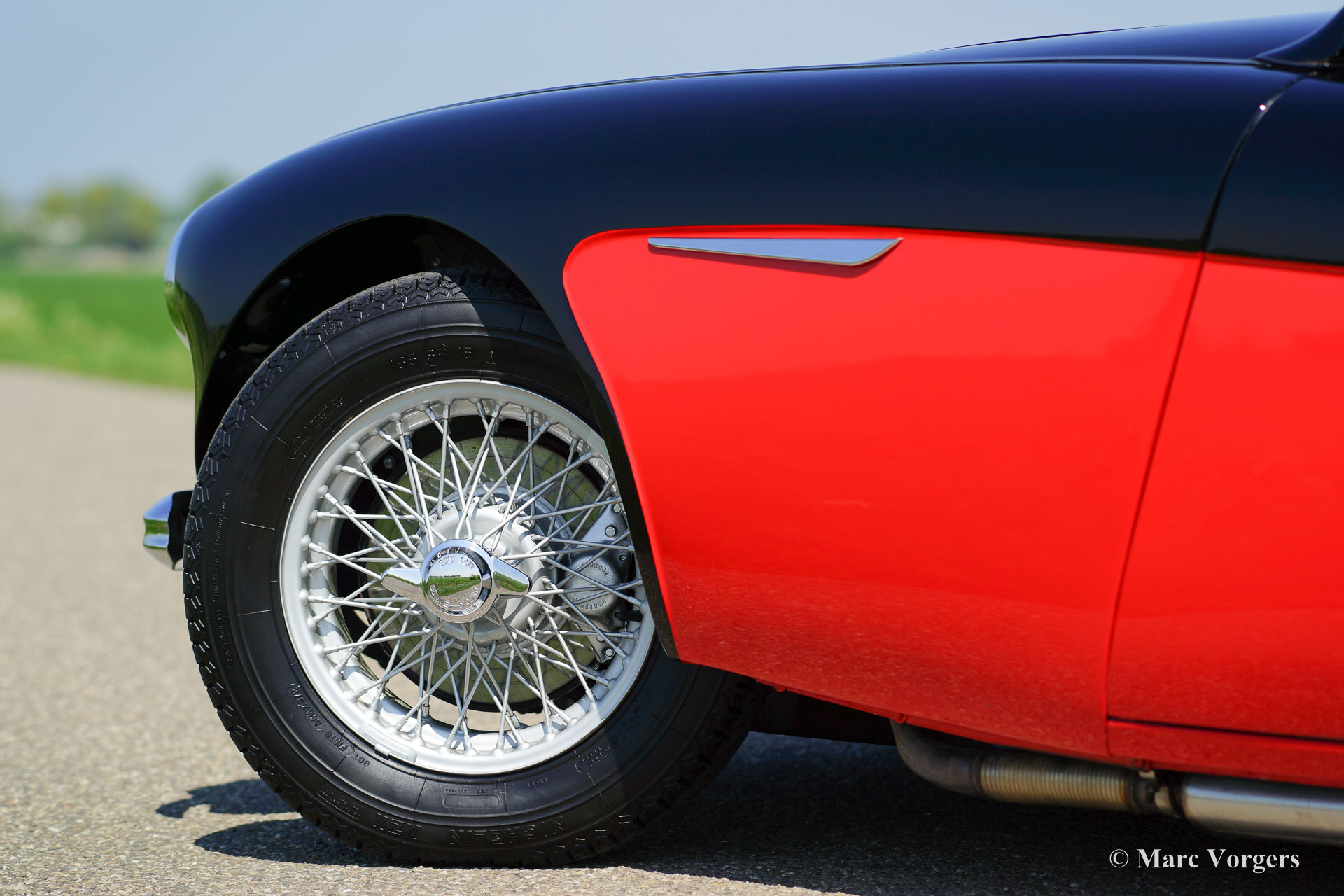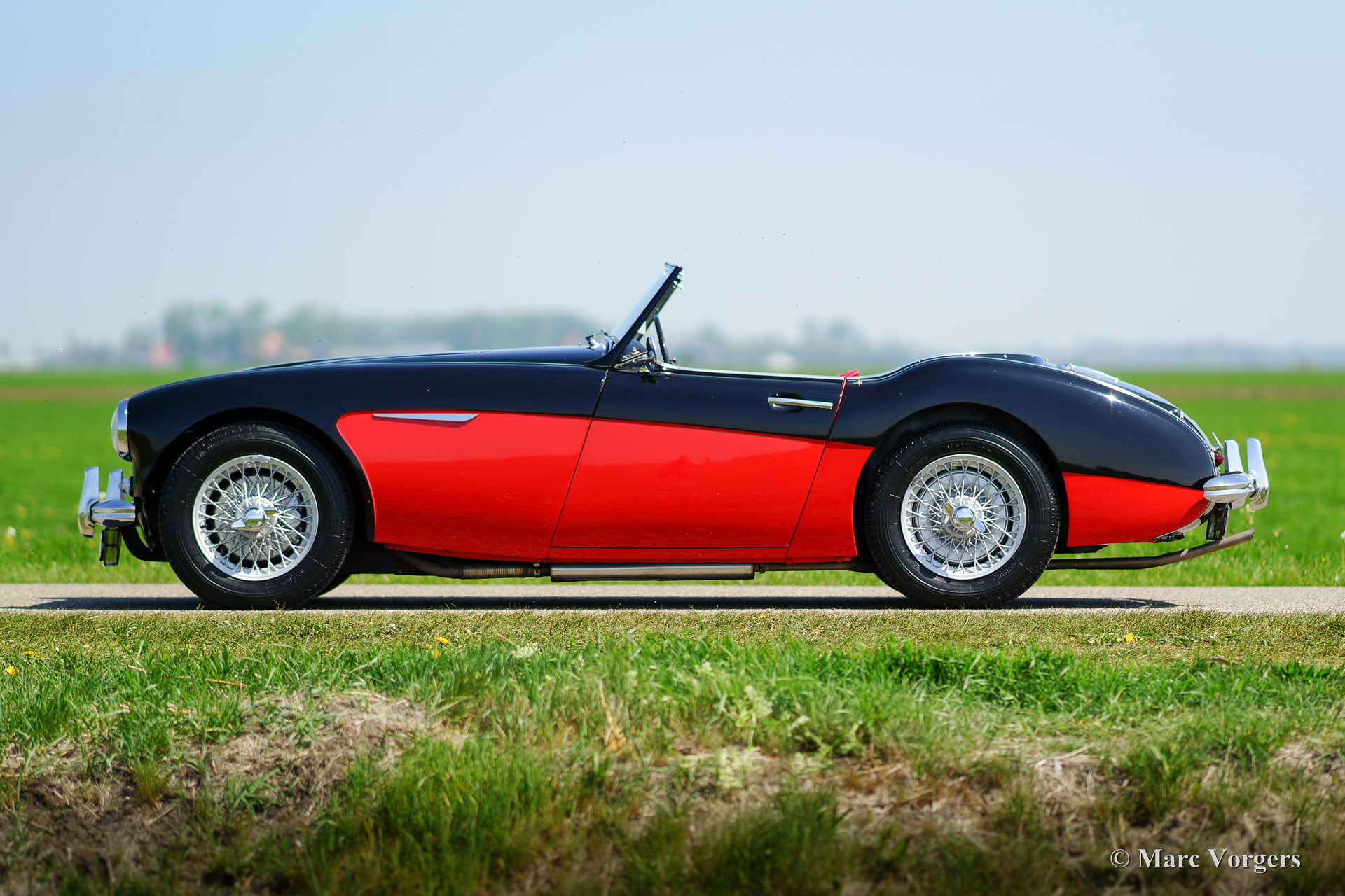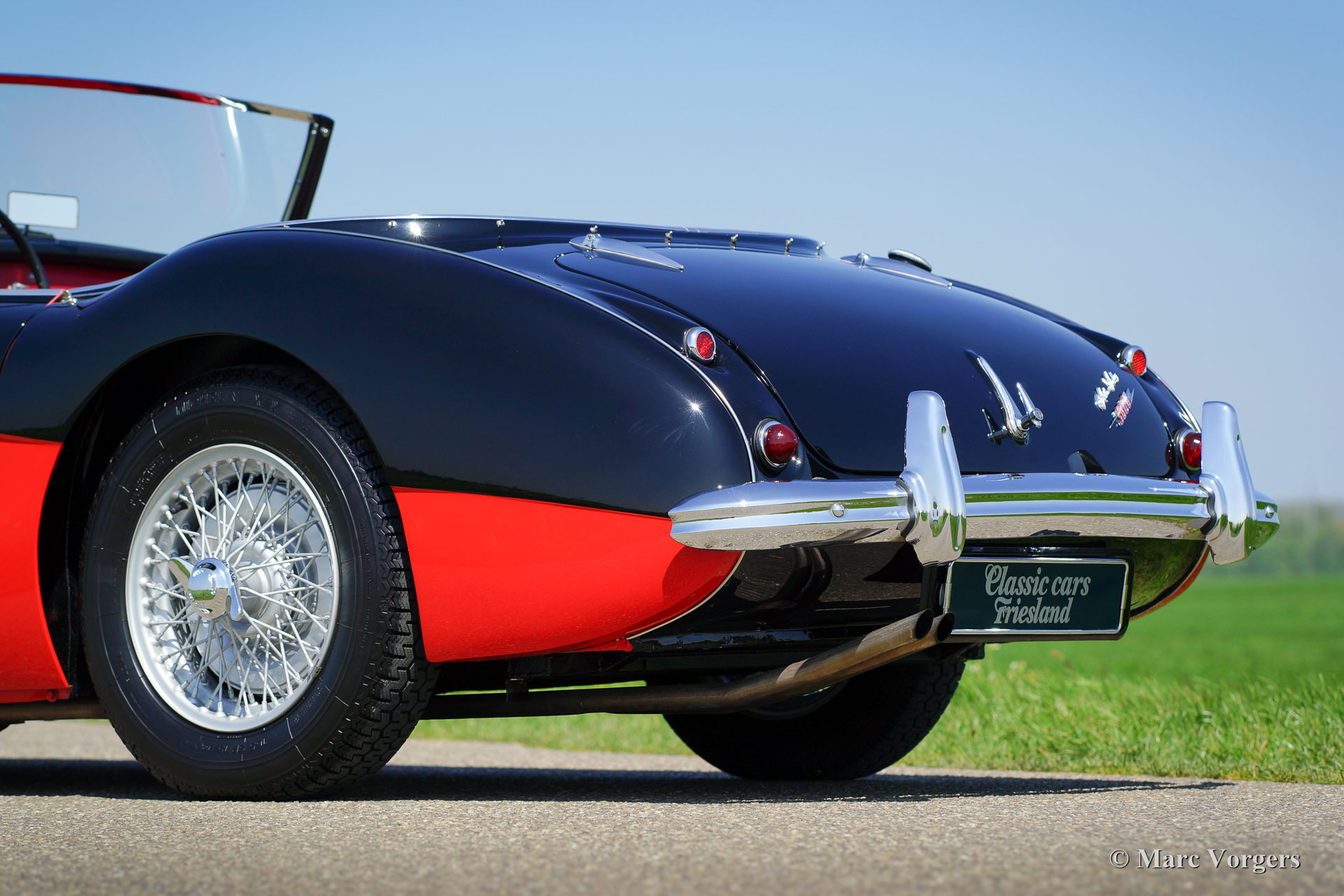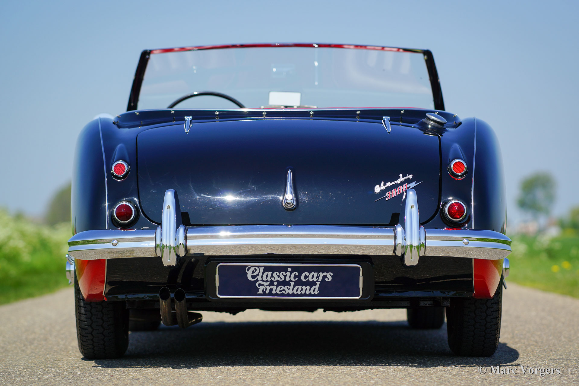 Austin Healey 3000 Mk I, year 1959. Colour black over Colorado red. Red leather interior and red carpet. Black soft top. This magnificent 'Big Healey' is in superb top condition; concours!