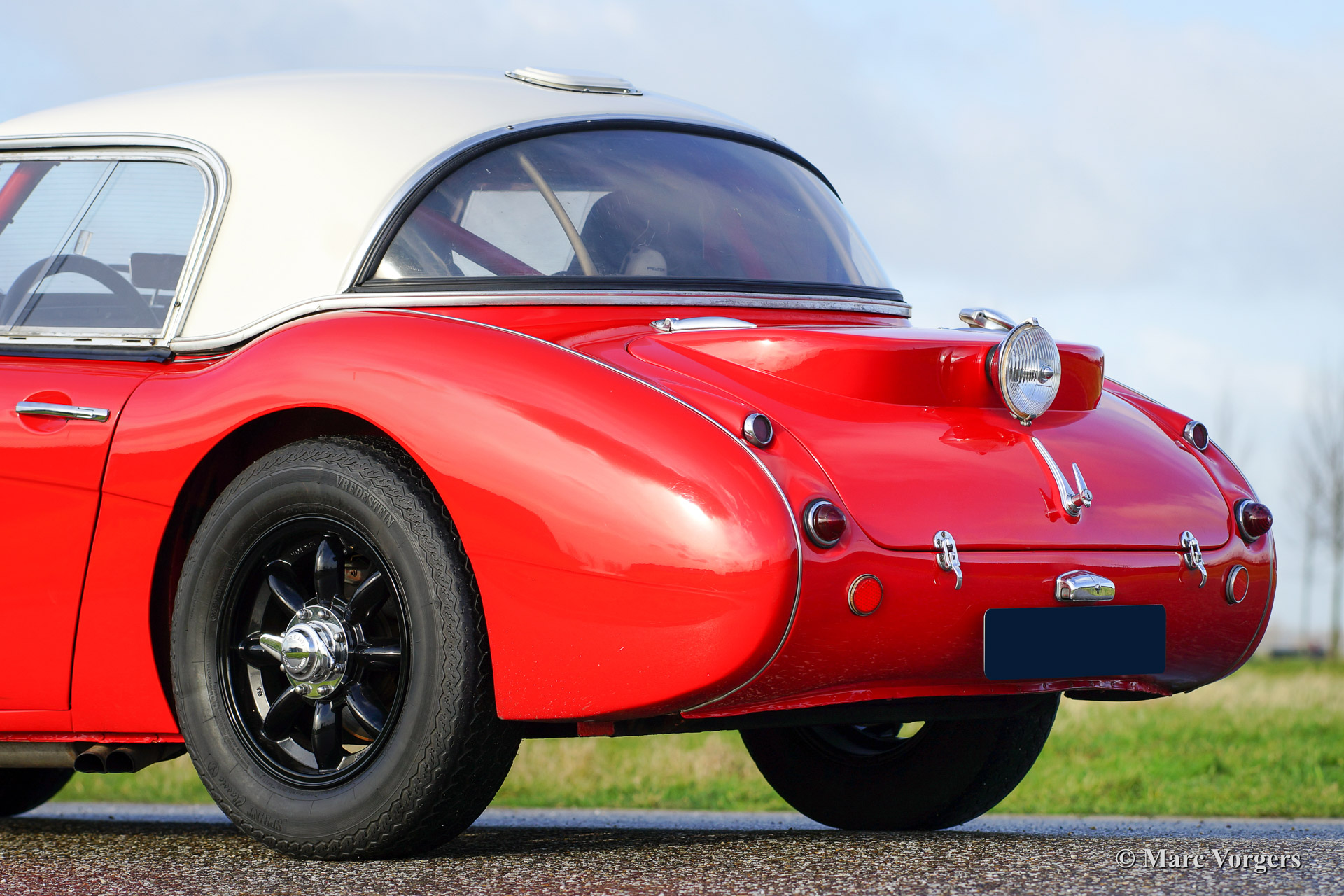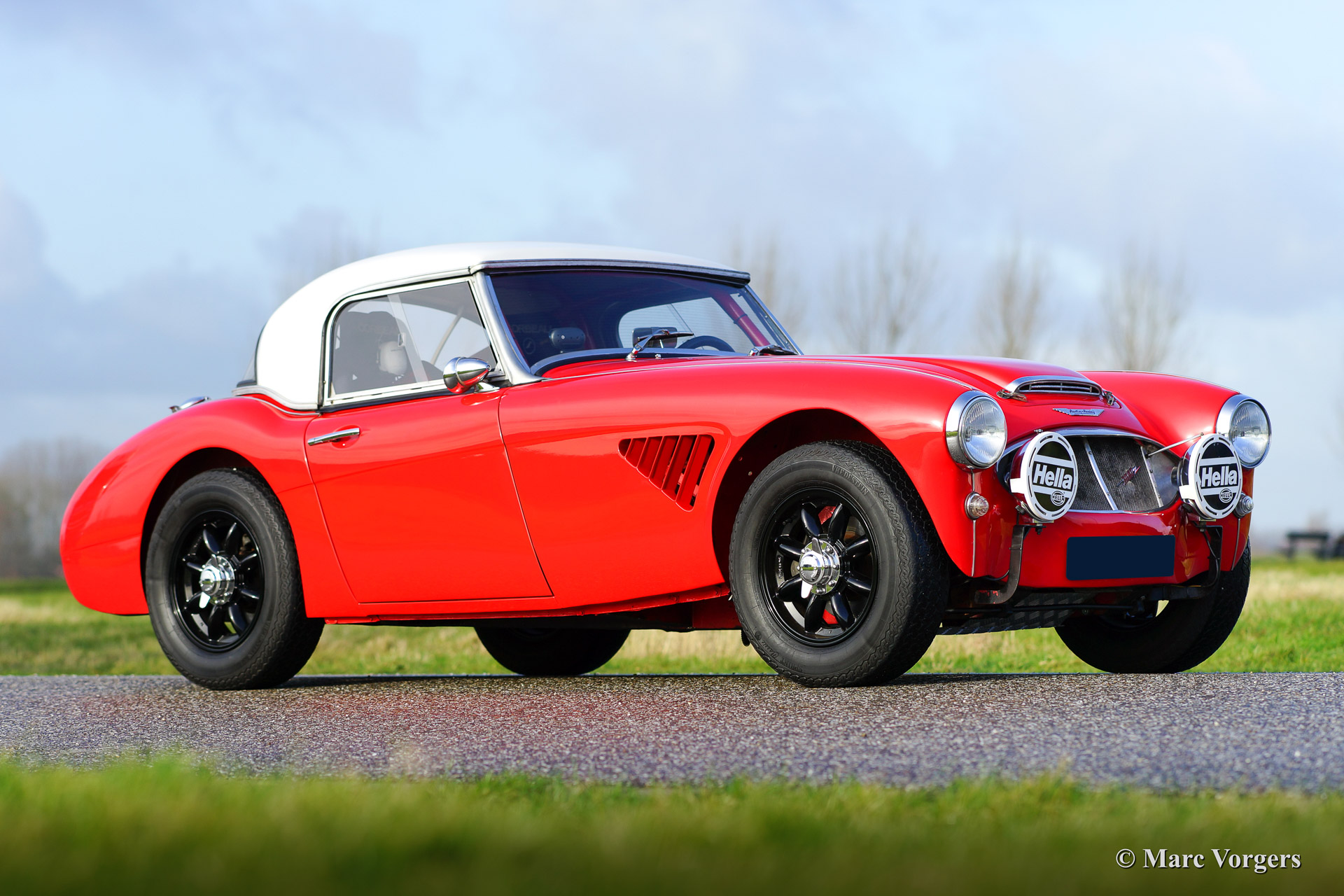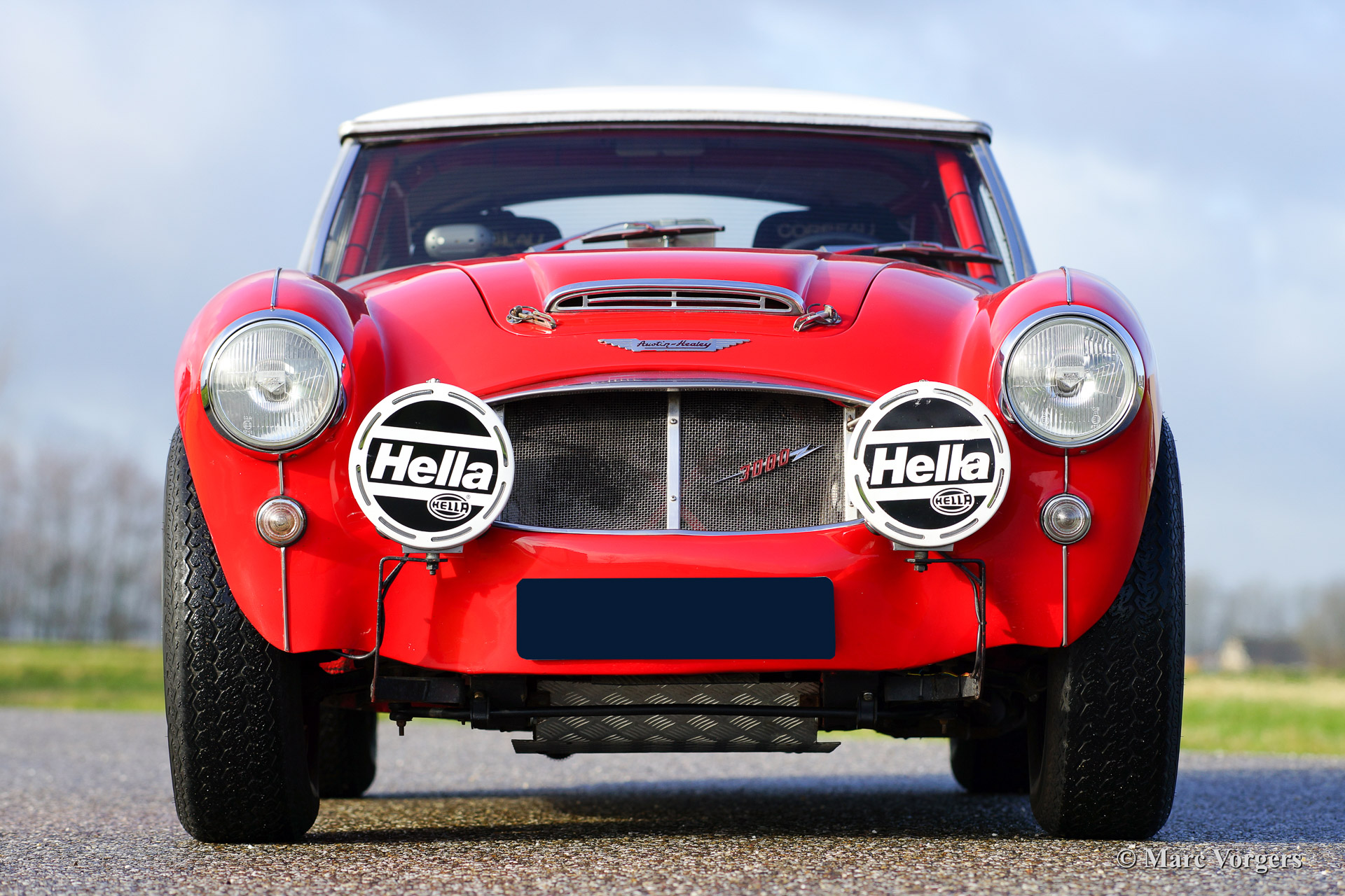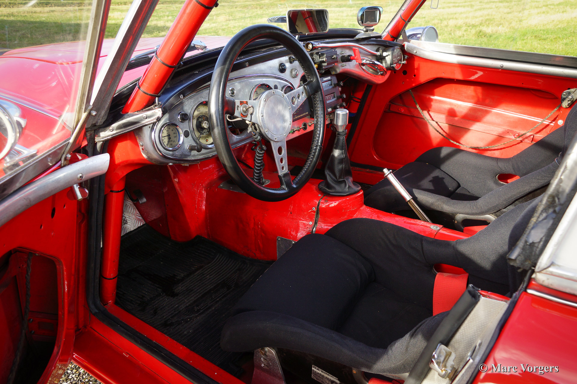 Austin Healey 3000 Mk I rally car, year 1960. Chassis number HBT7L33XX. Colour red with a black interior and a crème white hard top. This rugged Austin Healey rally car comes from the year in which the Mk I model started making history in the international (long distance) rally competitions. The car is extensively prepared and tuned and the car is in very good condition! This Big Healey features 3 twin choke Weber carburettors, oil cooler, AC generator, sports exhaust manifold with side exhaust pipe, 'works' mesh grille, Mallory electronic ignition, 80 litre capacity petrol tank with twin fuel pumps, shock damper modification (telescopic), aluminium oil sump with skid/protection plate, spin off oil filter modification, full roll cage, pedal box with twin brake master cylinders, heated windscreen, +/- 185 bhp. tuned engine, 'lambda' mixture meter, Tullip gearbox, map reading lamp, Peltor communication head sets, Halda Twin Master, digital compass, black enameled 'Minilite' wheels, two spot lamps at front, overdrive, electric cooling fan, disc brakes at front, aluminium rocker cover, sports steering wheel with leather trimmed rim, Corbeau rally seats, OMP four point safety harnesses and an original hard top.