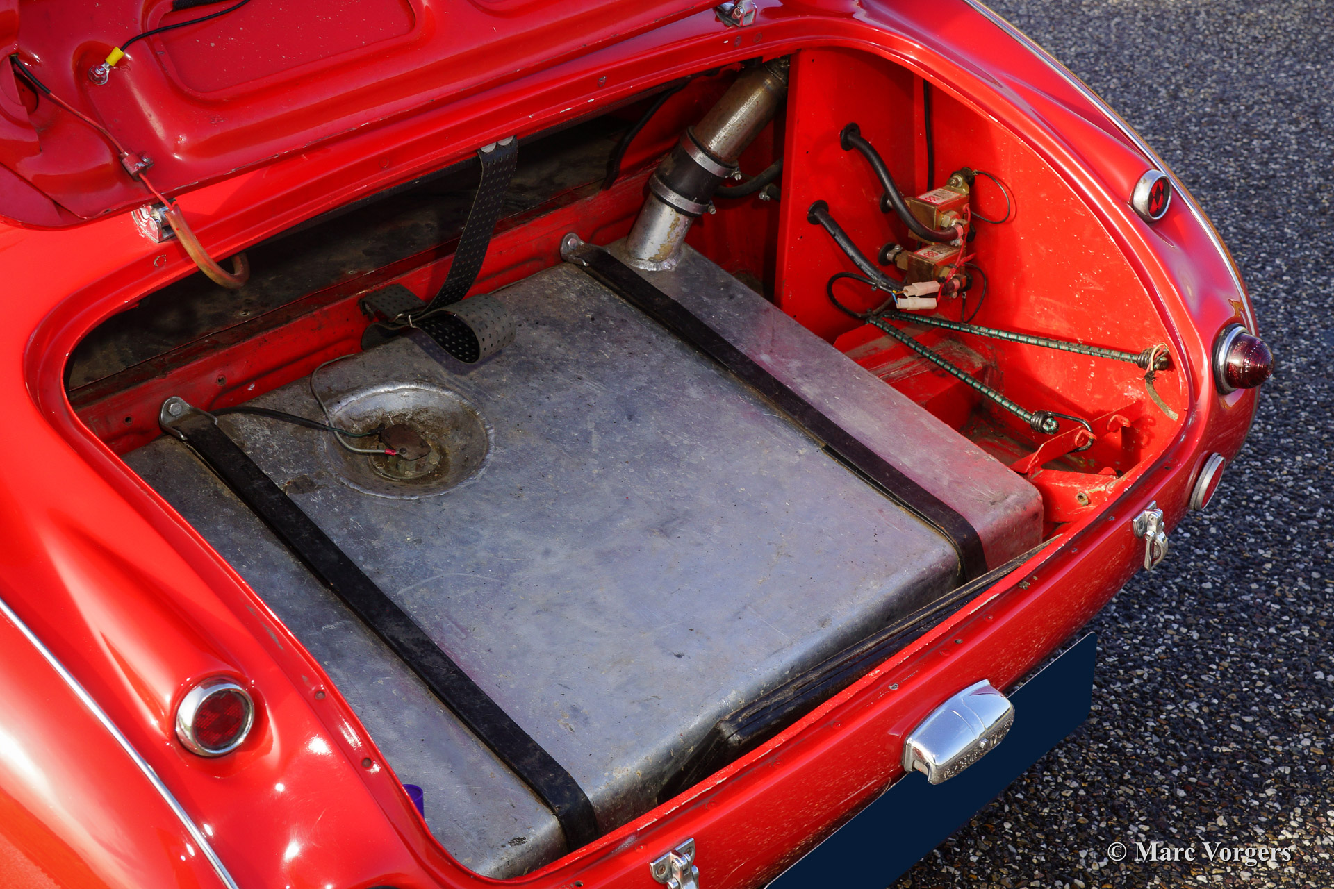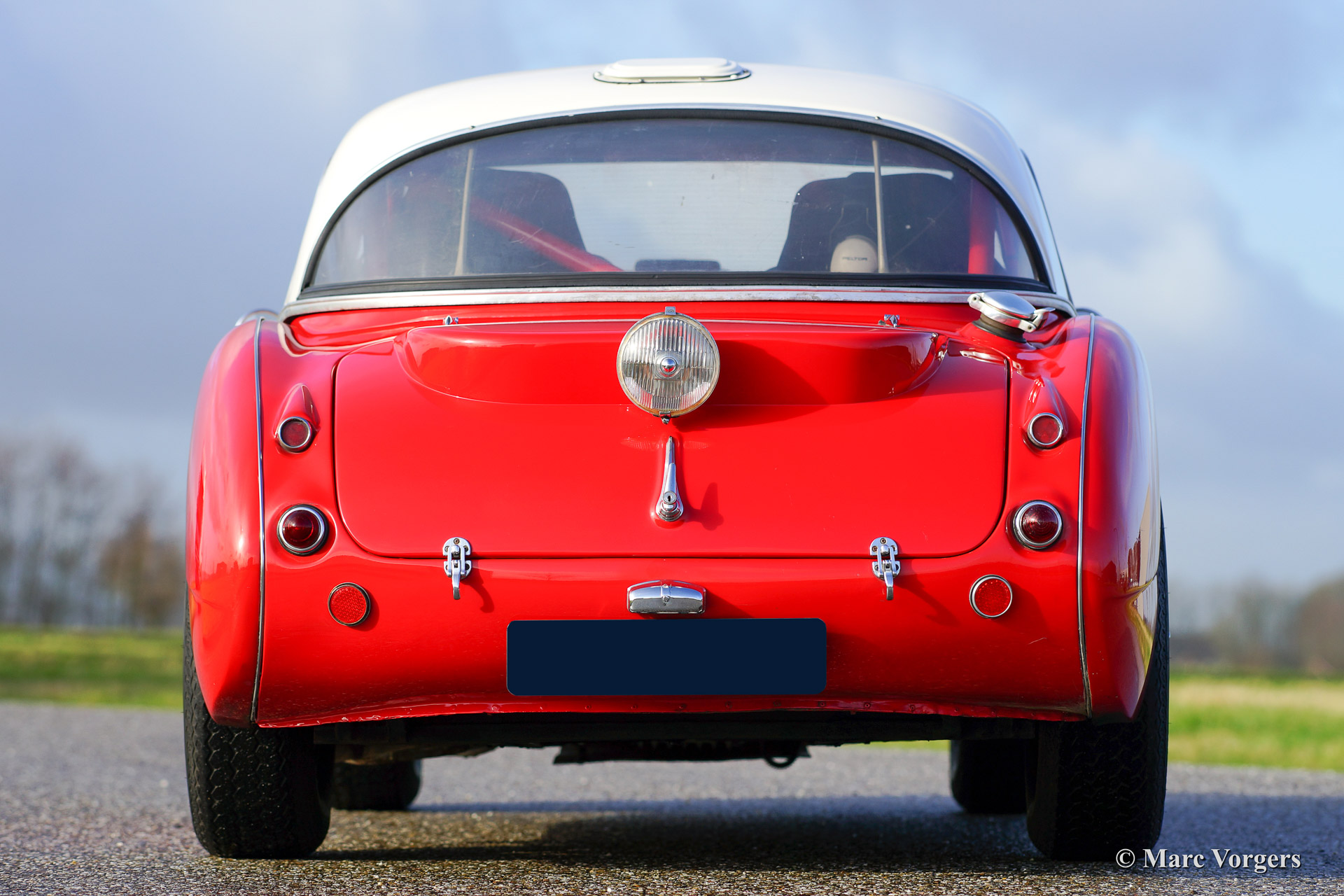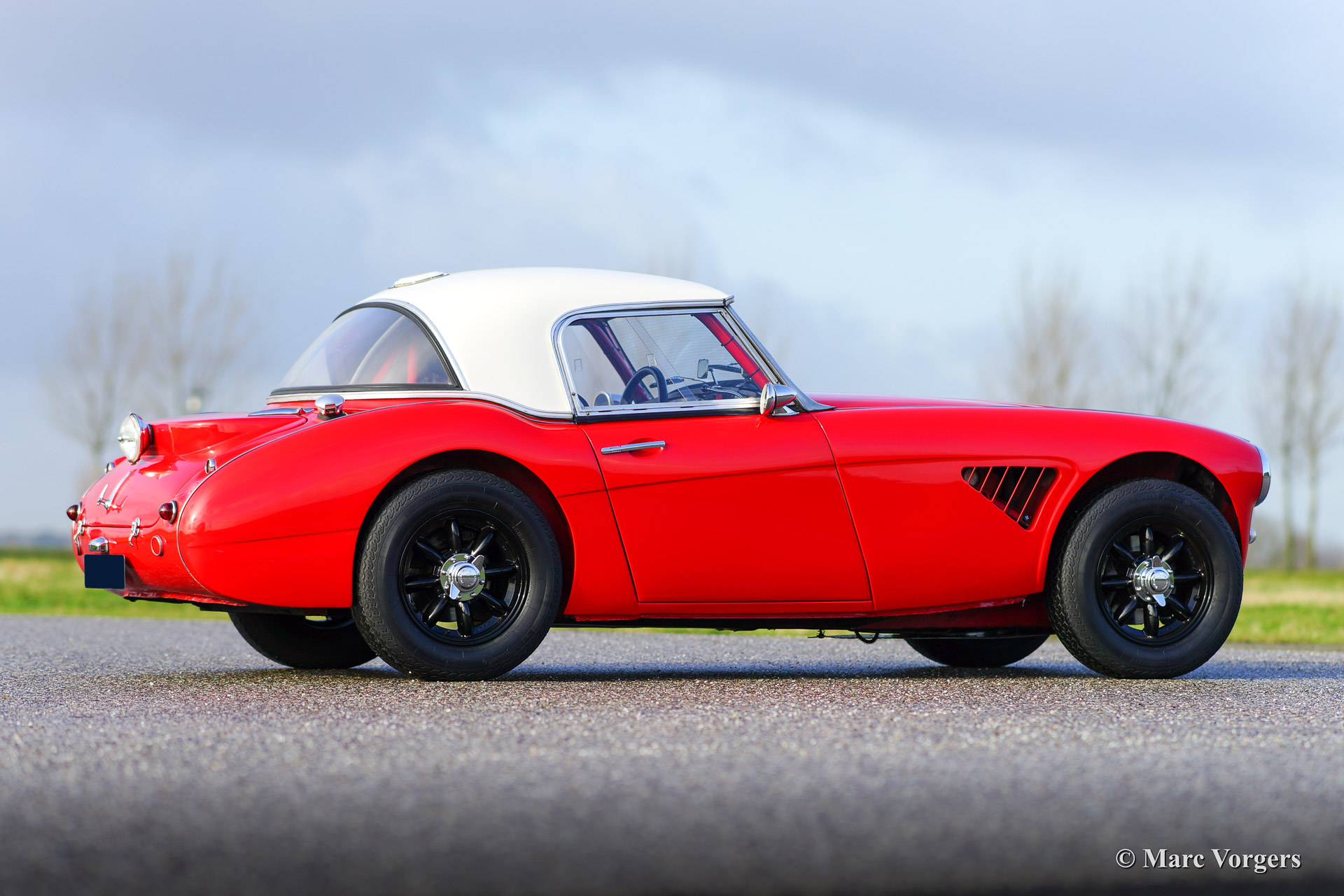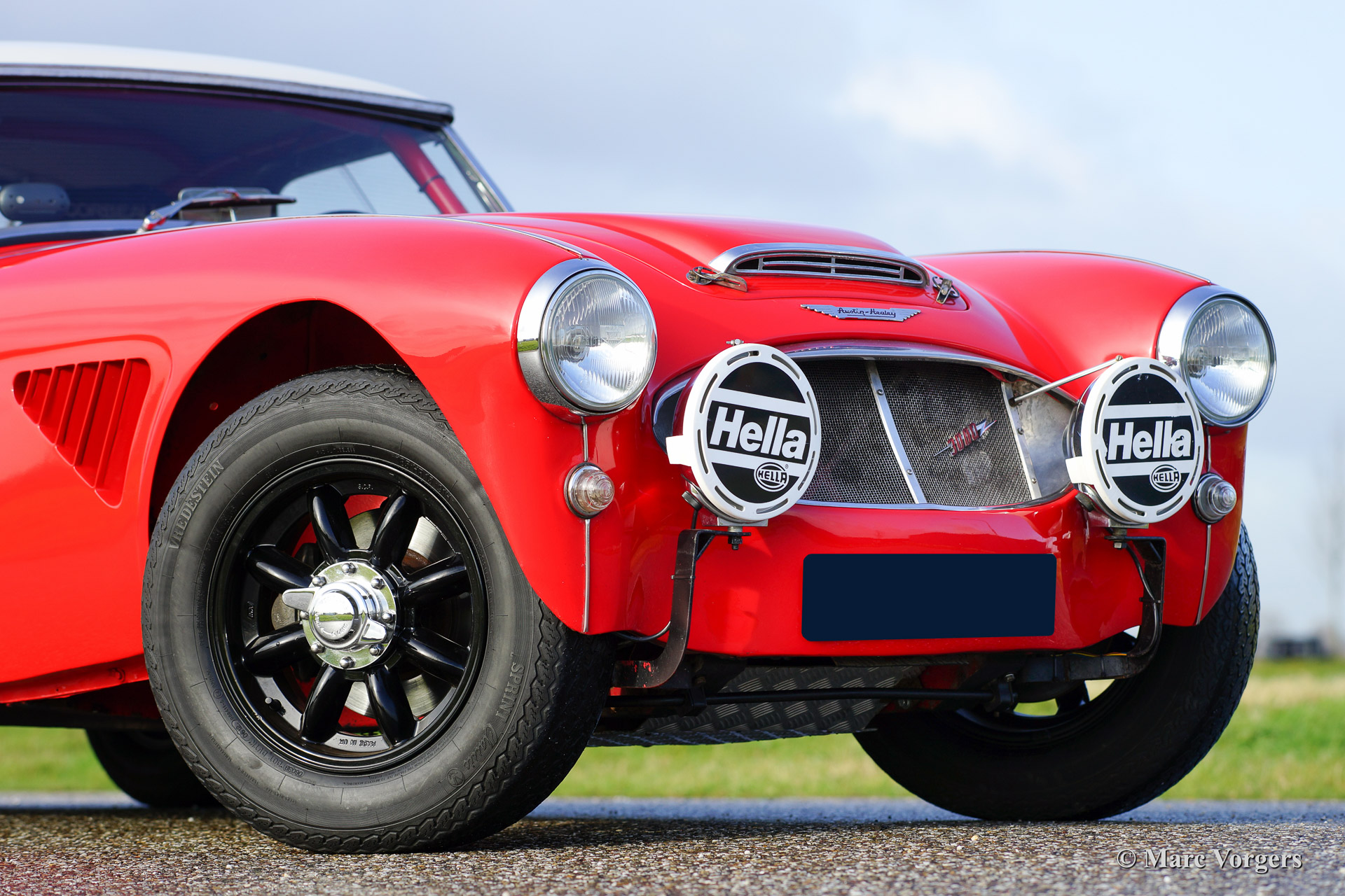 Austin Healey 3000 Mk I rally car, year 1960. Chassis number HBT7L33XX. Colour red with a black interior and a crème white hard top. This rugged Austin Healey rally car comes from the year in which the Mk I model started making history in the international (long distance) rally competitions. The car is extensively prepared and tuned and the car is in very good condition! This Big Healey features 3 twin choke Weber carburettors, oil cooler, AC generator, sports exhaust manifold with side exhaust pipe, 'works' mesh grille, Mallory electronic ignition, 80 litre capacity petrol tank with twin fuel pumps, shock damper modification (telescopic), aluminium oil sump with skid/protection plate, spin off oil filter modification, full roll cage, pedal box with twin brake master cylinders, heated windscreen, +/- 185 bhp. tuned engine, 'lambda' mixture meter, Tullip gearbox, map reading lamp, Peltor communication head sets, Halda Twin Master, digital compass, black enameled 'Minilite' wheels, two spot lamps at front, overdrive, electric cooling fan, disc brakes at front, aluminium rocker cover, sports steering wheel with leather trimmed rim, Corbeau rally seats, OMP four point safety harnesses and an original hard top.