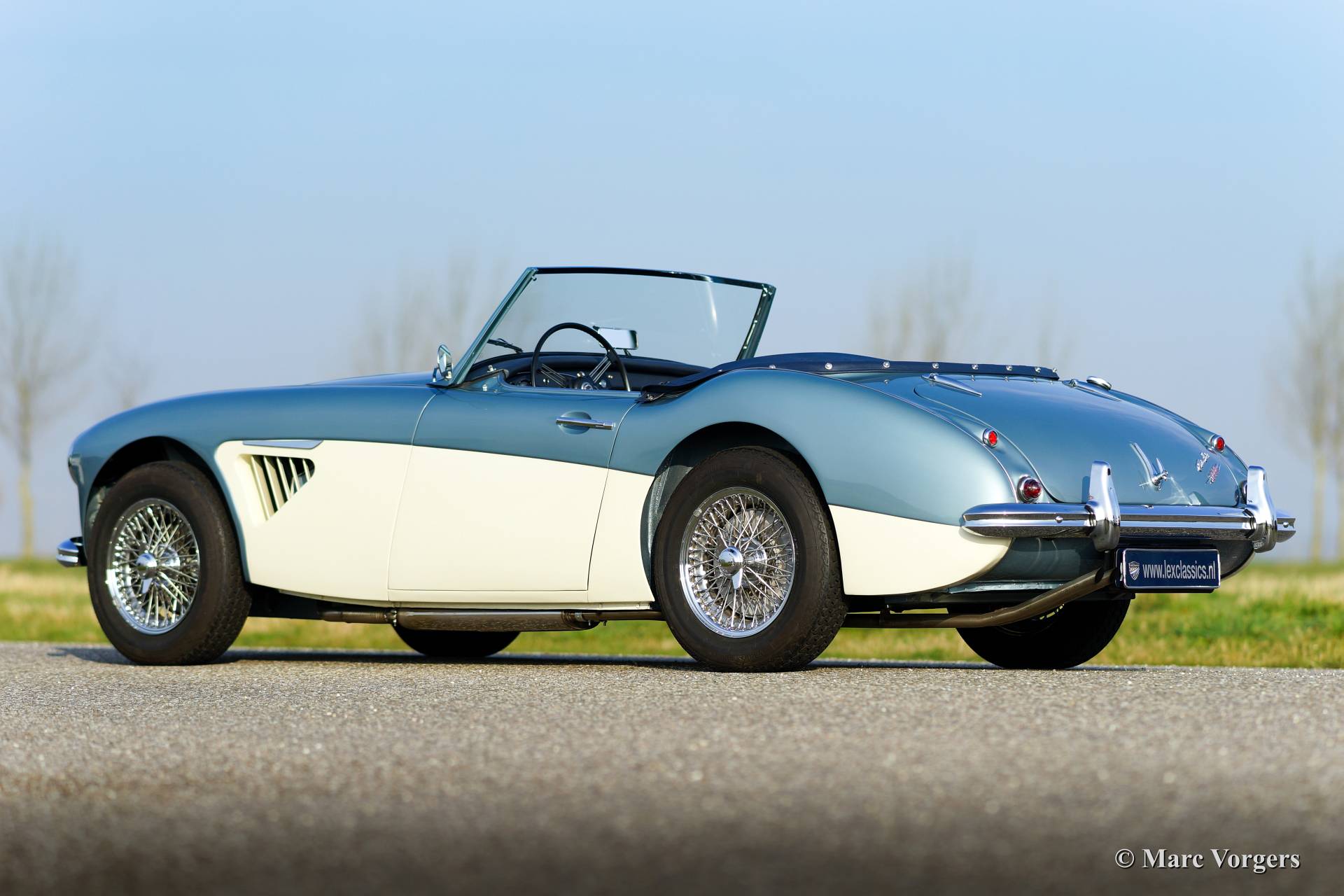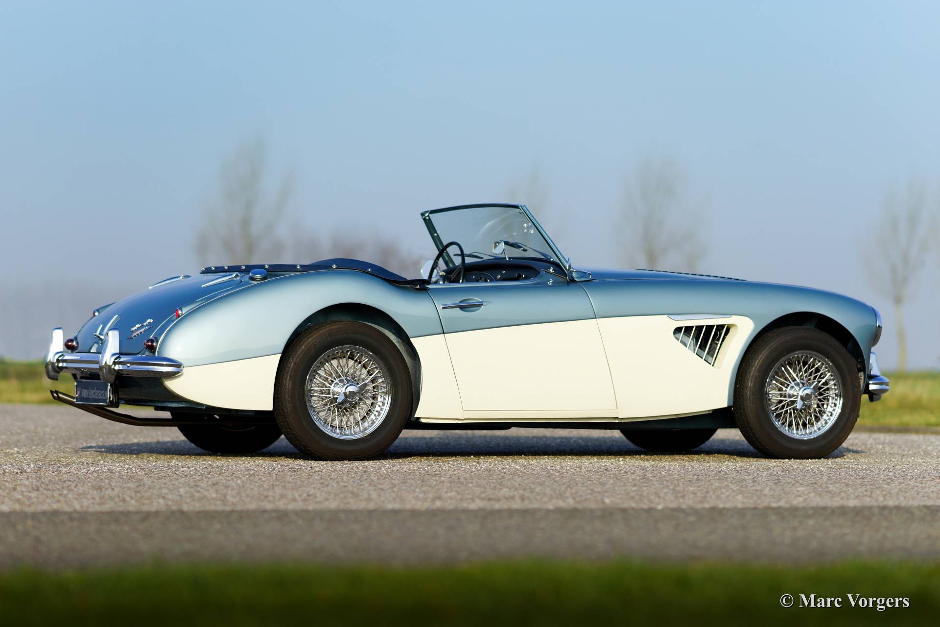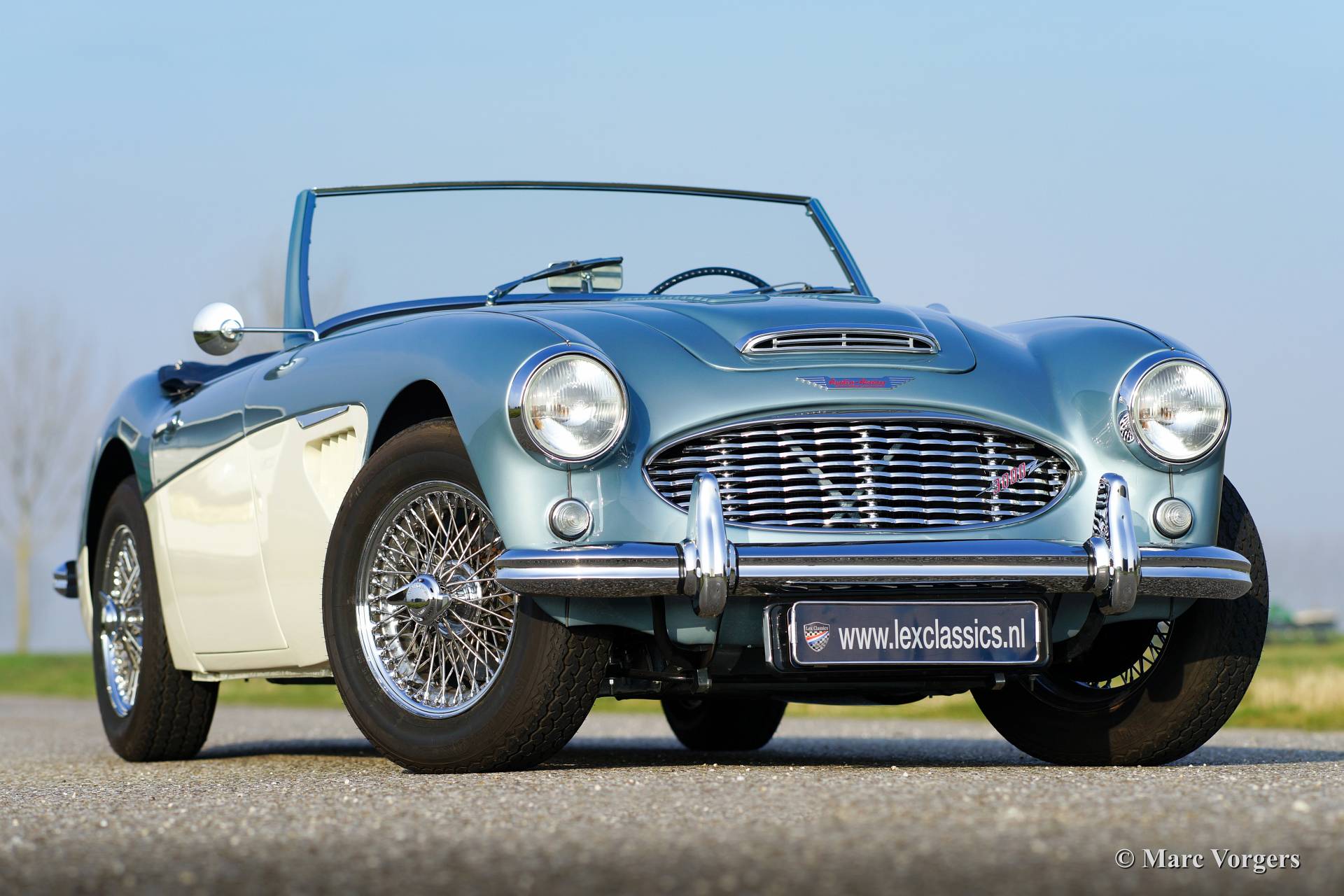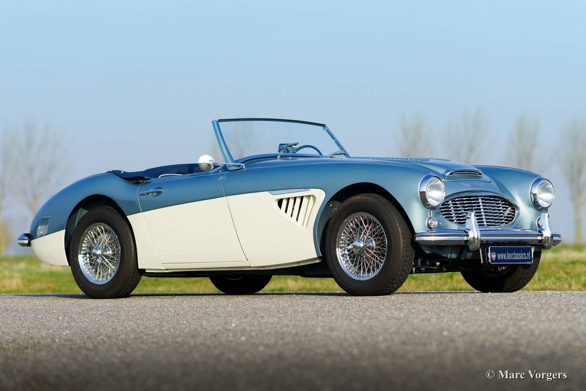 Austin Healey 3000 Mk I, year 1960. Chassis number HBT7l/11995, engine number 29D-RU-H/21424. Colour Ice Blue metallic over crème white. Blue leather interior trimmed with white piping. This fantastic Healey was imported from the USA to the Netherlands in the year 2011. Then an extensive ‘body off’ restoration started. A photo reportage of the restoration is present. The automobile features chrome wire wheels, overdrive, louvers in the hood/bonnet and a vinyl tonneau cover.