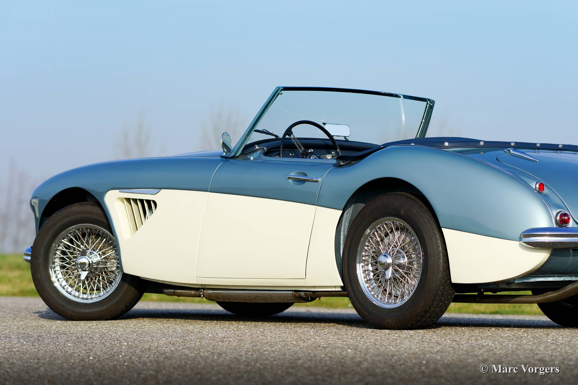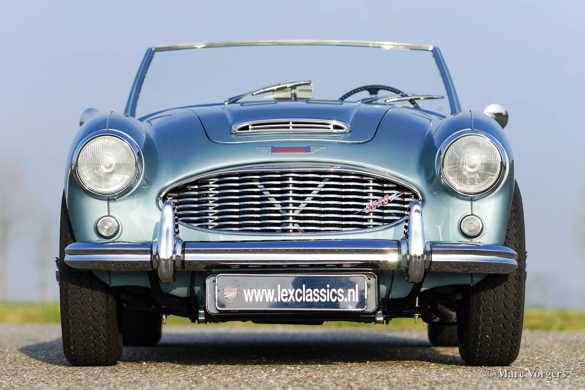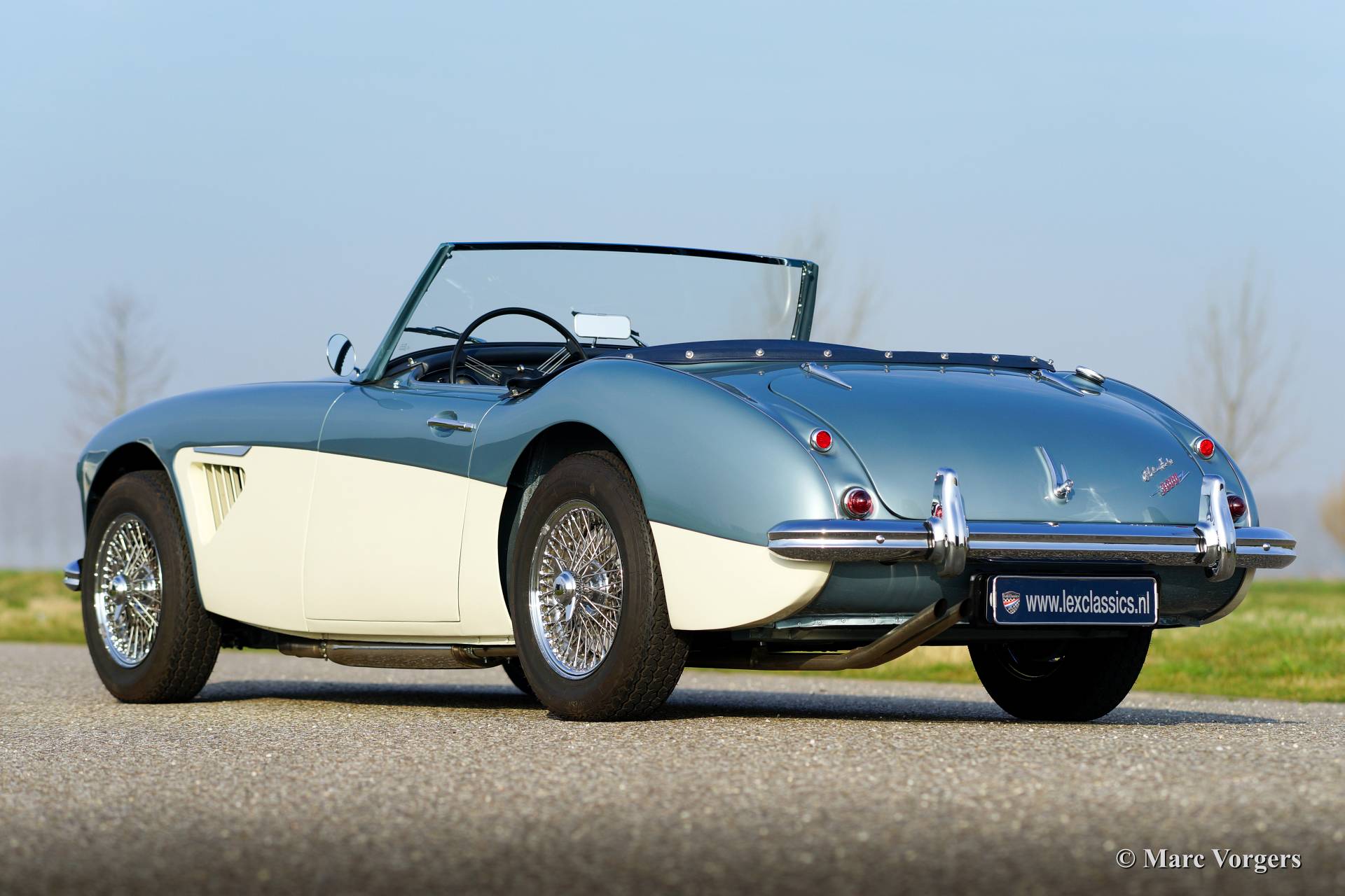 Austin Healey 3000 Mk I, year 1960. Chassis number HBT7l/11995, engine number 29D-RU-H/21424. Colour Ice Blue metallic over crème white. Blue leather interior trimmed with white piping. This fantastic Healey was imported from the USA to the Netherlands in the year 2011. Then an extensive ‘body off’ restoration started. A photo reportage of the restoration is present. The automobile features chrome wire wheels, overdrive, louvers in the hood/bonnet and a vinyl tonneau cover.