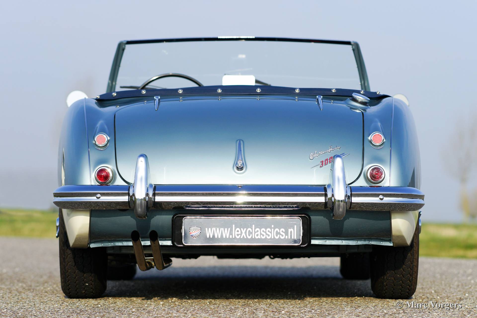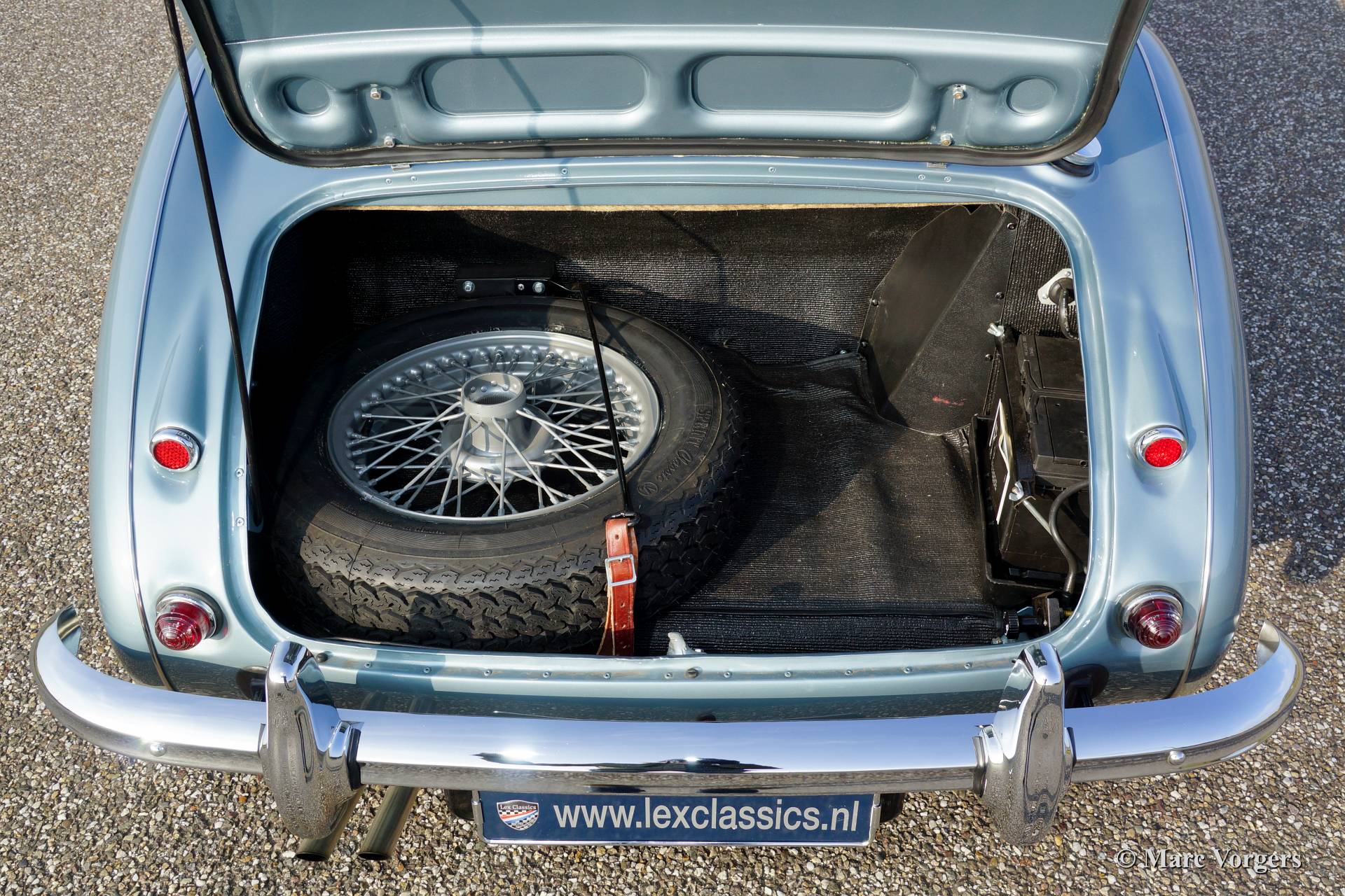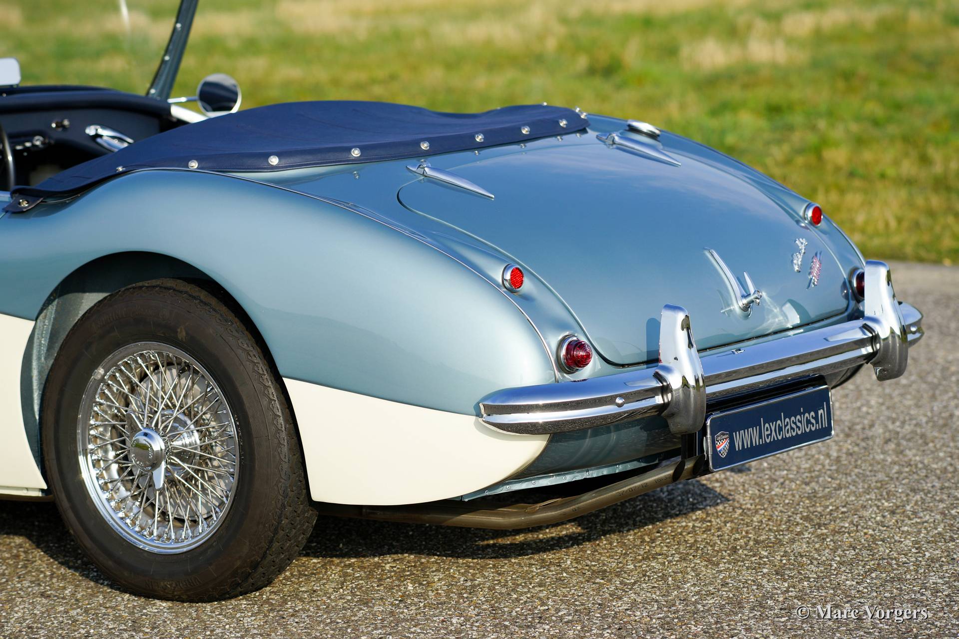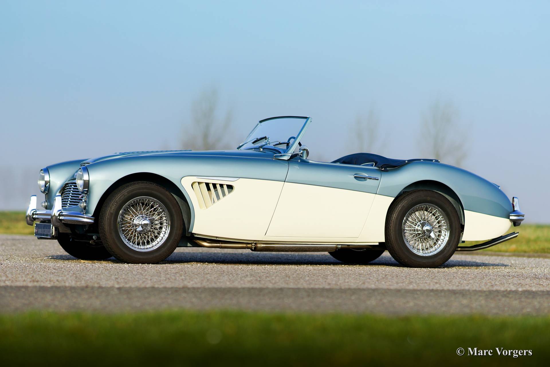 Austin Healey 3000 Mk I, year 1960. Chassis number HBT7l/11995, engine number 29D-RU-H/21424. Colour Ice Blue metallic over crème white. Blue leather interior trimmed with white piping. This fantastic Healey was imported from the USA to the Netherlands in the year 2011. Then an extensive ‘body off’ restoration started. A photo reportage of the restoration is present. The automobile features chrome wire wheels, overdrive, louvers in the hood/bonnet and a vinyl tonneau cover.