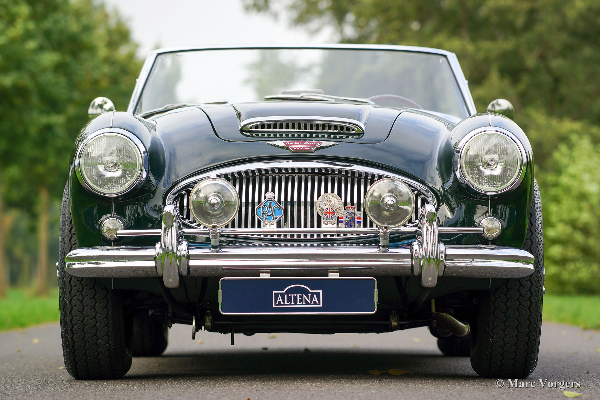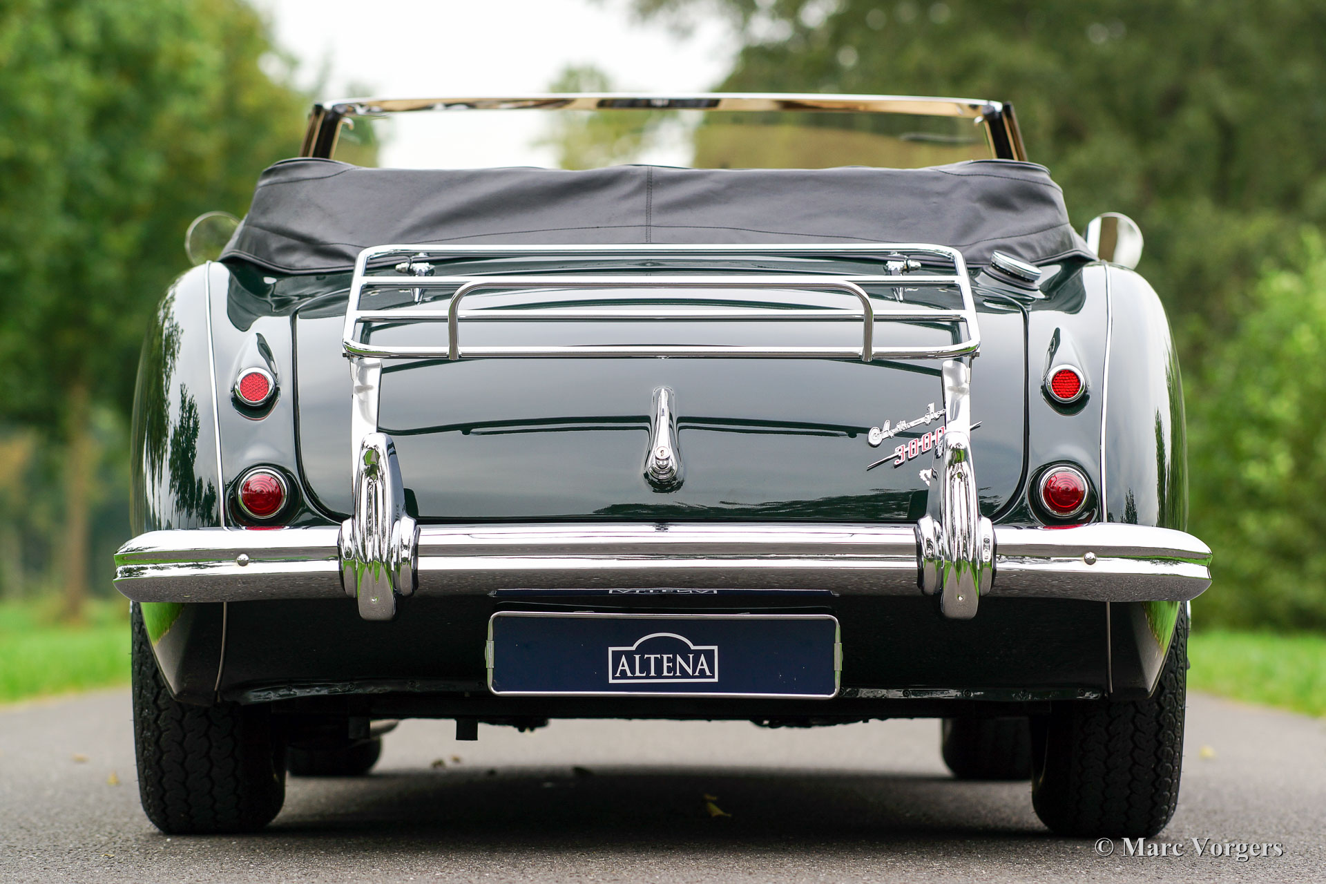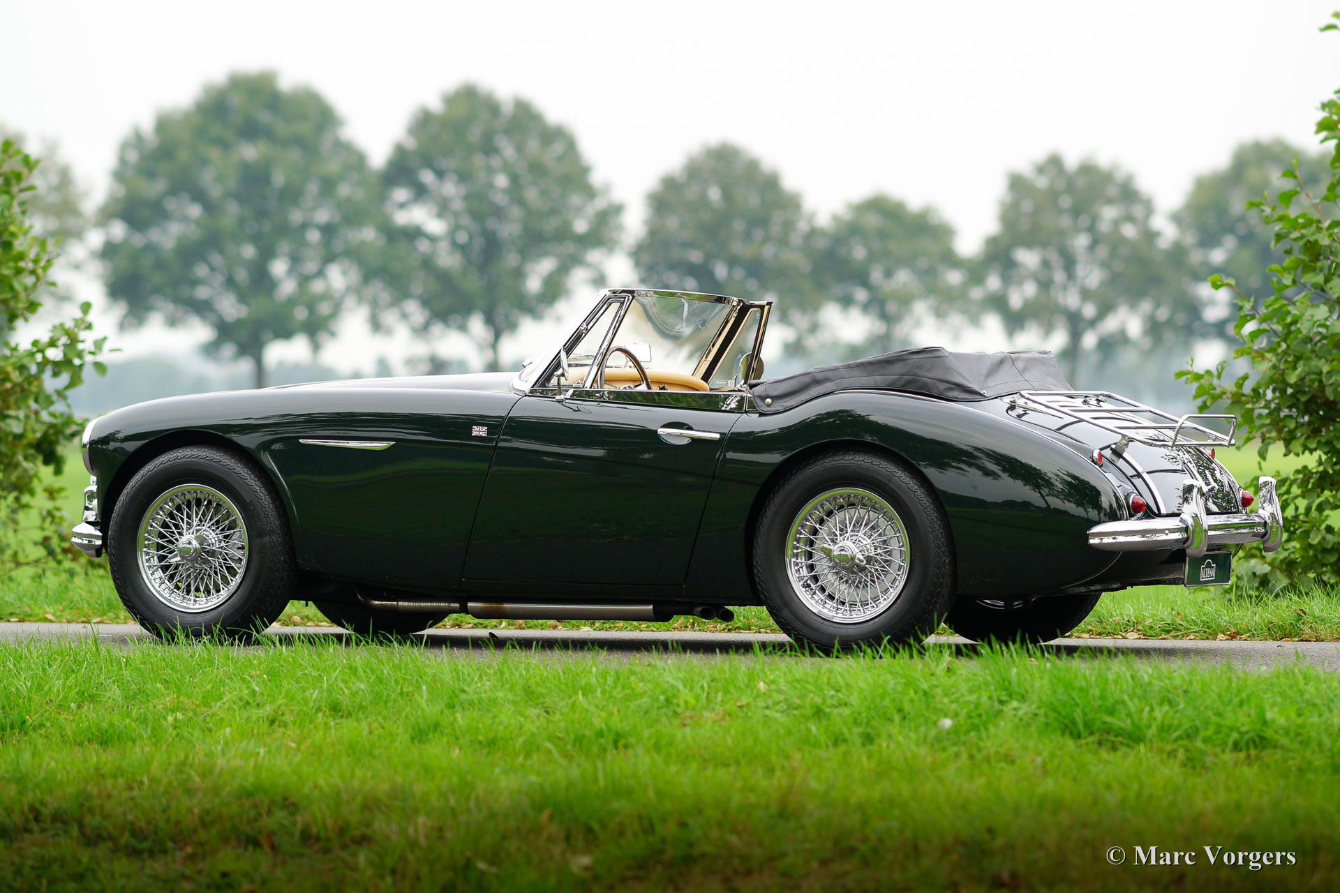 Austin Healey 3000 Mk IIa, year 1962. Colour dark British Racing Green with a beige leather interior and beige carpet. Black additional floor mats. Green mohair hood and tonneau cover, black vinyl hood cover. This ‘Big Healey’ is in excellent condition and the car drives perfectly. The Mk II ‘convertible’ is one of the most sought after Healey models. It features roll-up windows and an easy to operate convertible top like the later Mk III models. This combined with the beautiful classic dashboard of the earlier models. This fine Austin Healey features chrome wire wheels, sports air-filtres, a wood rimmed MotoLita steering wheel, chrome badge bar, additional spot lamps at front and a chrome luggage rack.