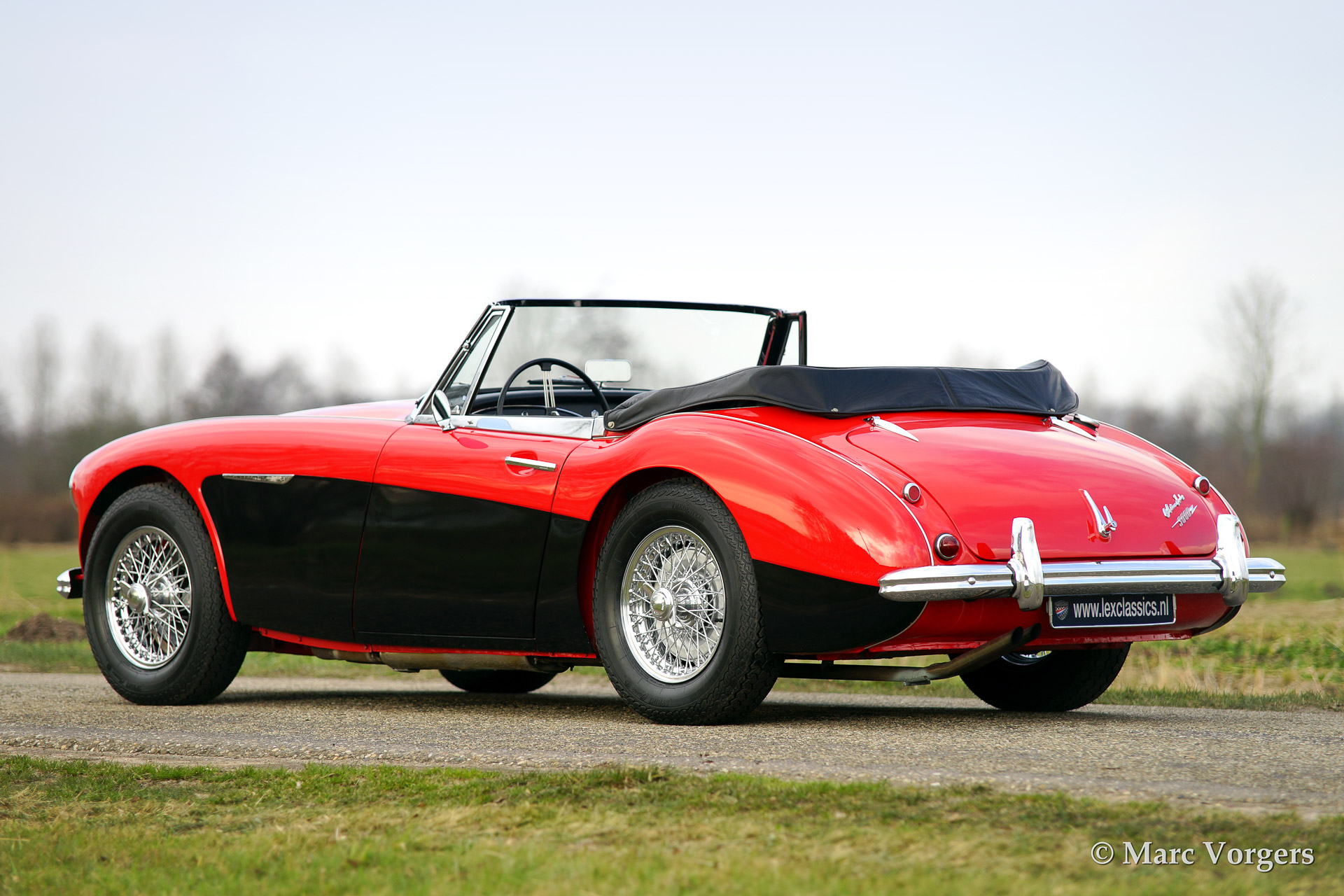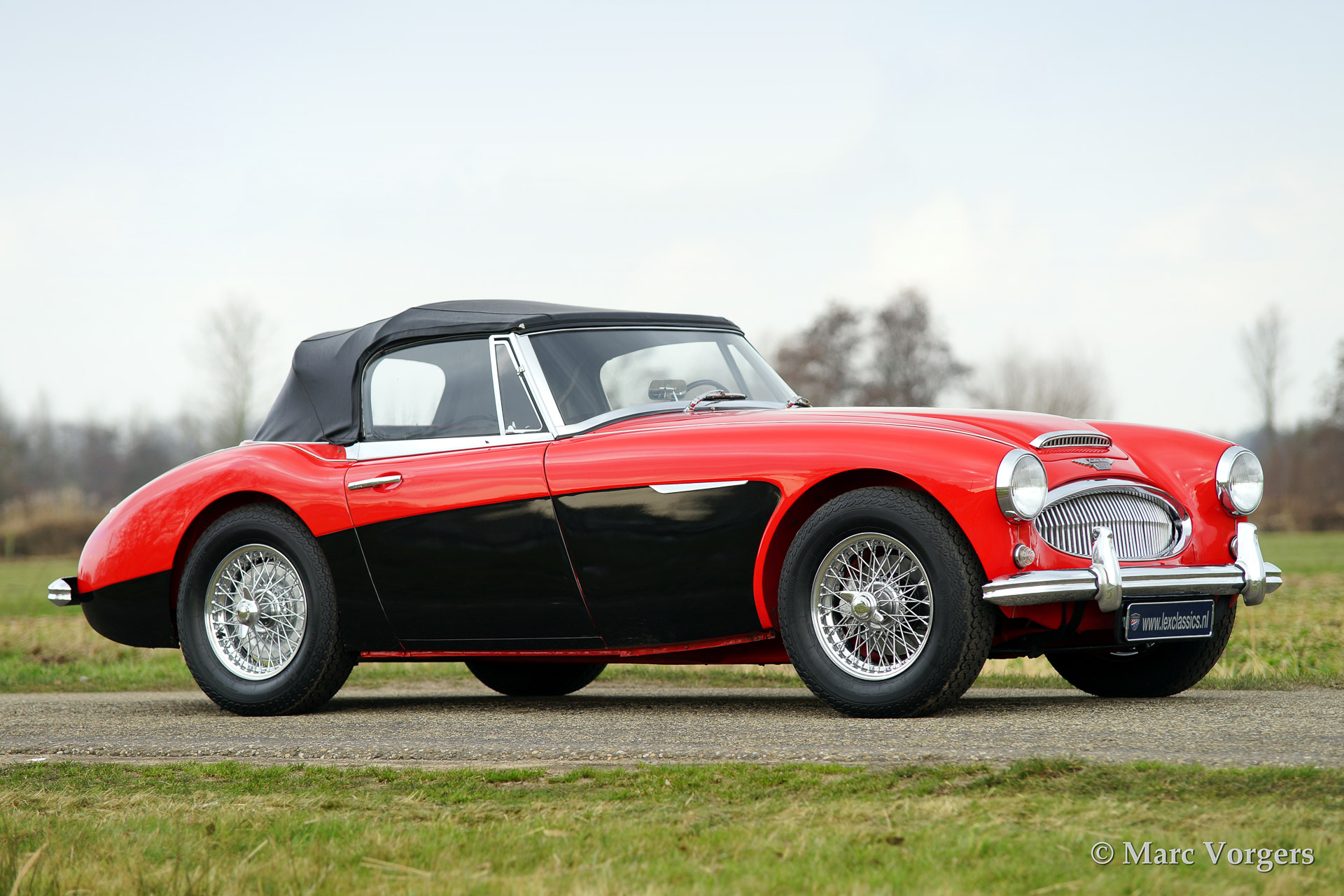 Austin Healey 3000 Mk IIa, year 1964. Colour red over black. Black leather interior trimmed with red piping. Black soft top and hood cover. This 'Big Healey' sports options like a Stainless Steel exhaust, overdrive and chrome wire wheels.