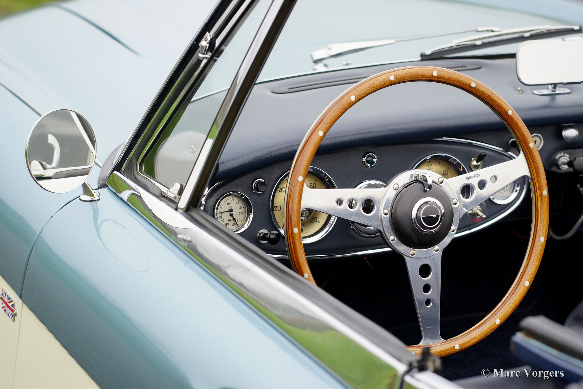 Austin Healey 3000 Mk IIa, year 1964. Colour Ice blue metallic over crème white. Blue leather interior trimmed with white piping and blue carpet. Blue mohair soft-top and hood cover. This magnificent Austin Healey was extensively restored in the past; the automobile is in very good to excellent condition! The bodywork shows crisp lines and perfect panel fit. This is a car from the highly sought after Mk II ‘a’ series which is officially named ‘convertible’. It is the first Healey 3000 with the convenient retractable convertible top and the roll-up windows in the doors. This model also retains the beautiful dashboard of its predecessors. This ‘Big Healey’ features overdrive, chrome wire wheels, Michelin tyres, a Stainless-Steel exhaust and a chrome luggage rack.