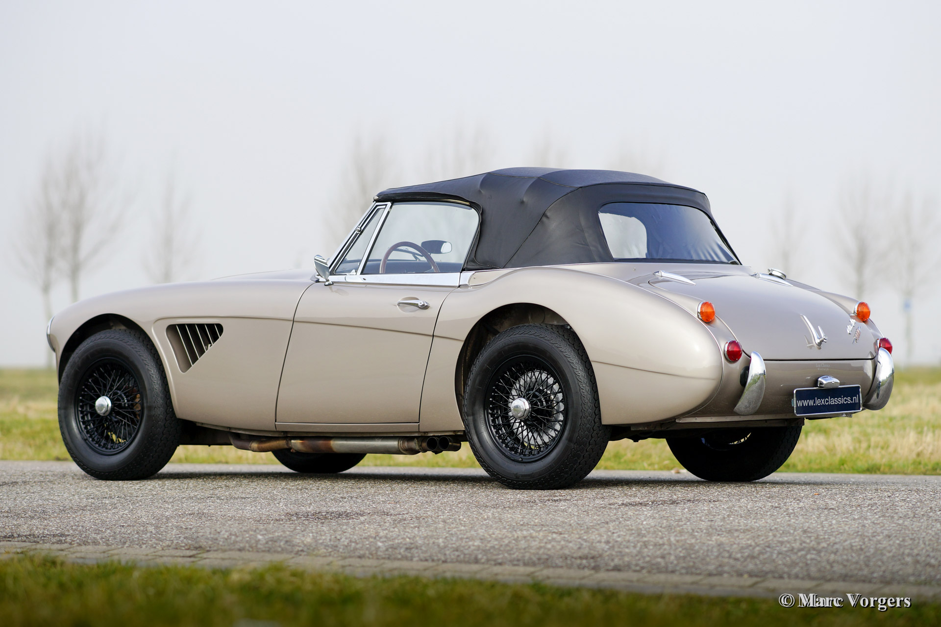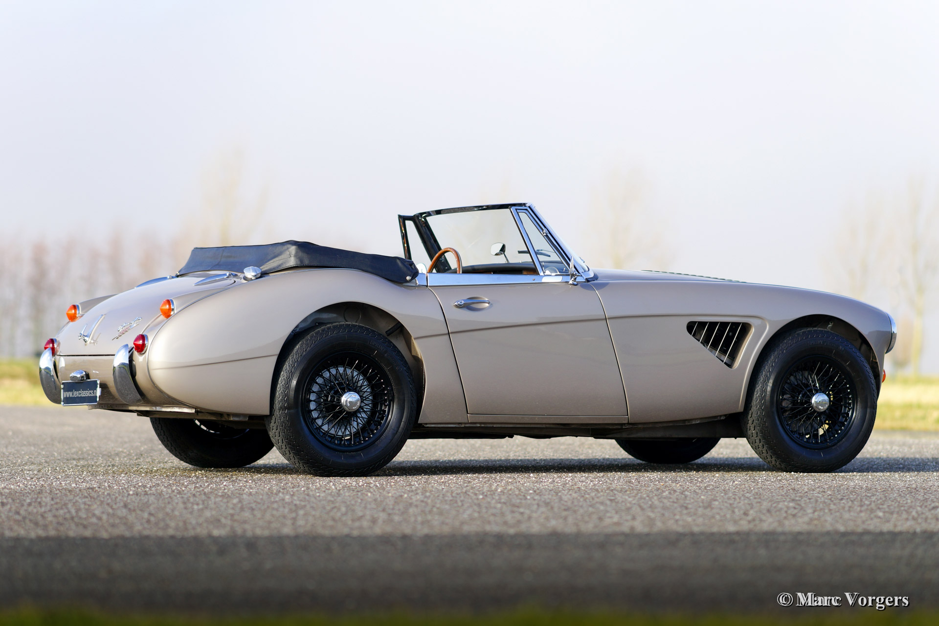 Austin Healey 3000 Mk III phase 2, year 1968. Colour 'Golden Beige' metallic with a black leather interior. Black soft top, hood cover and black enameled wire wheels. This fantastic Healey was extensively 'body off' restored, the automobile is in superb (excellent+) condition! This car comes from the last batch of 553 Austin Healeys ever built. These cars were all painted 'Golden Beige' metallic.