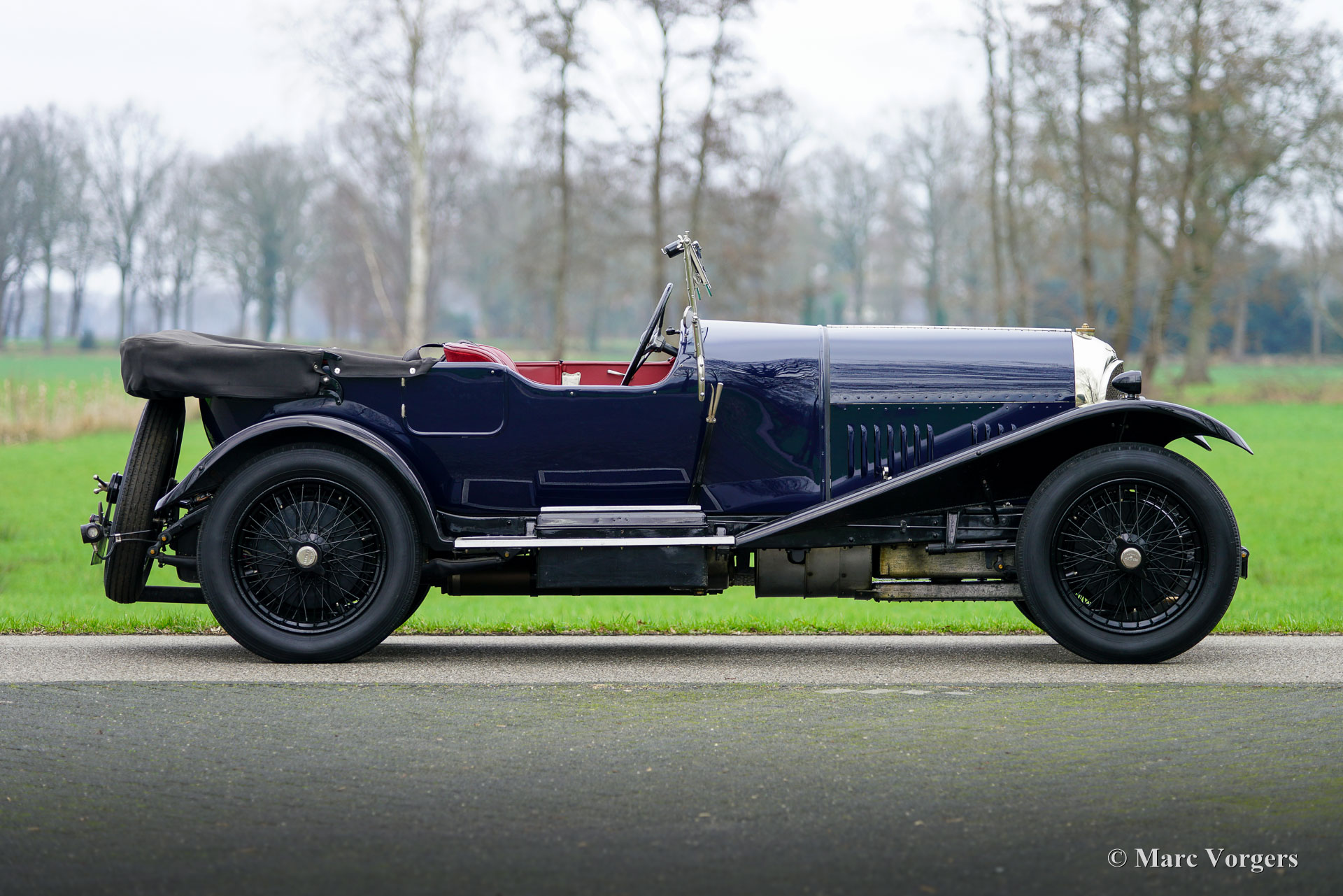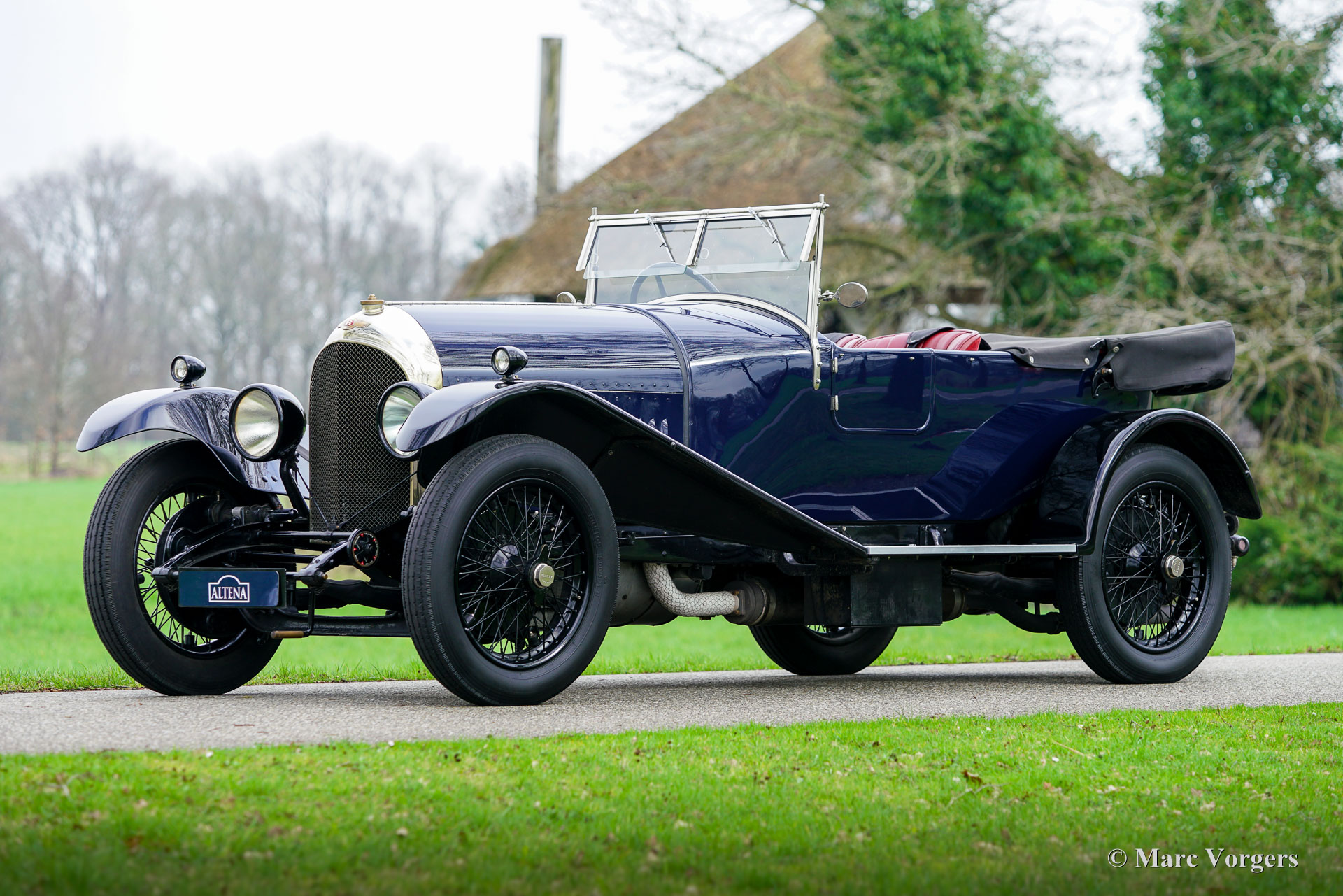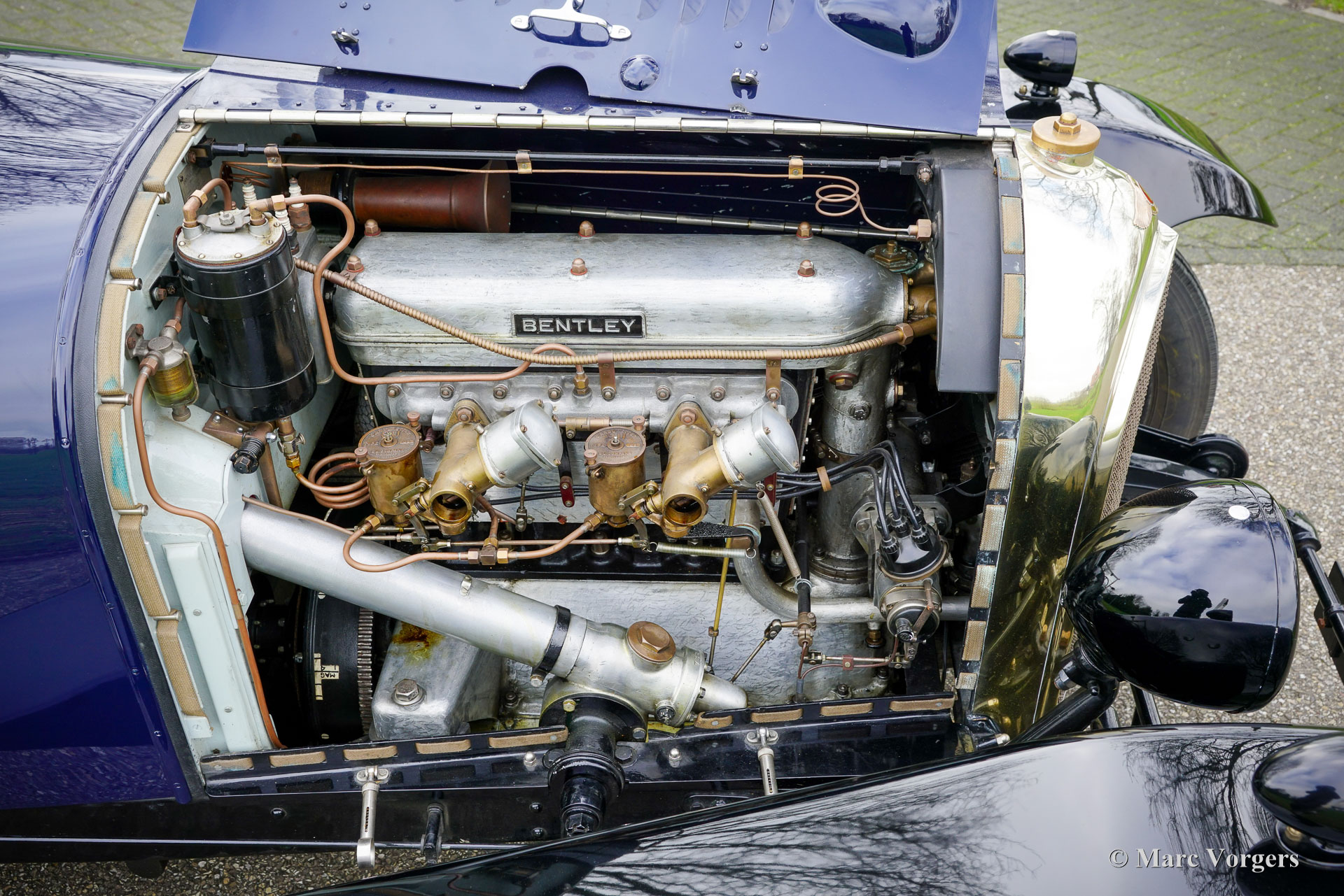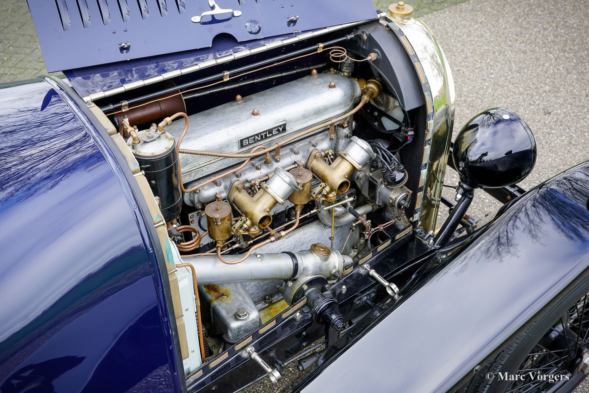 Bentley 3-Litre Speed model, year 1924. Colour dark blue with black wire wheels combined with a red leather interior trimmed with red wool carpet. Black hood, hood cover and tonneau cover. This original Bentley 3-Litre ‘red badge’ short chassis Speed model was sold new in the United Kingdom fitted with a ‘Park Ward’ body. In later years the car was given the current 4-seater open tourer bodywork. The automobile was extensively restored and overhauled by a Bentley specialist with eye for originality. The engine, and all the mechanical parts were completely overhauled. All the important chassis and mechanical parts are factory original, the numbers on the chassis, engine, gearbox, steering gear, and rear axle are correct for this car as it left the factory in 1924! The car shows many wonderful original details like the remarkable Sloper carburettors and the Bentley marked dashboard instruments. The full history is known and documented, and a photo report of the extensive restoration is present. This Bentley 3-Litre Speed model is mentioned in the book ‘Bentley The Vintage Years’, a standard work on Bentley by Clare Hay. This glorious Bentley 3-Litre is in a wonderful and very good condition. The automobile breathes the quality W.O. Bentley had envisaged when he created his ‘3-Litre’; ‘A fast car, a good car, the best in its class’. The 3-Litre featured one of the first production car engines with 4 valves per cylinder, dry-sump lubrication, and an overhead camshaft. The first 3-Litre chassis was shown at the 1919 London (Olympia) Motor Show, with the first customer delivery in 1921. Between the show and 1921 much work was needed to improve refinement. As W.O. later wrote, “I hate noise for the sake of noise. 70mph in silence is far more creditable than a noisy 80mph.” The 3-Litre was very well received by the motoring press. Sammy Davis of the Autocar wrote: “For the man who wants a true sporting type of light-bodied car for use on a Continental tour – where speed limits are not meant to be observed – the 3 Litre Bentley is undoubtedly the car par excellence.” From the beginning the rugged and powerful 3-Litre was entered in competitions and races. The 3-Litre won countless races, amongst others the legendary 24 Hours of Le mans in 1924 and 1927. A private owner (John Duff) also set 21 world records in 24 hours in 1925 at the wheel of a Bentley 3-Litre. A total of 1622 Bentley 3-Litre models were produced between 1921 and 1929. This Bentley 3-Litre model is a splendid product of this adventurous early Bentley Motors period. A wonderful collector’s item and a dream machine for vintage Bentley drivers and Bentley enthusiasts.