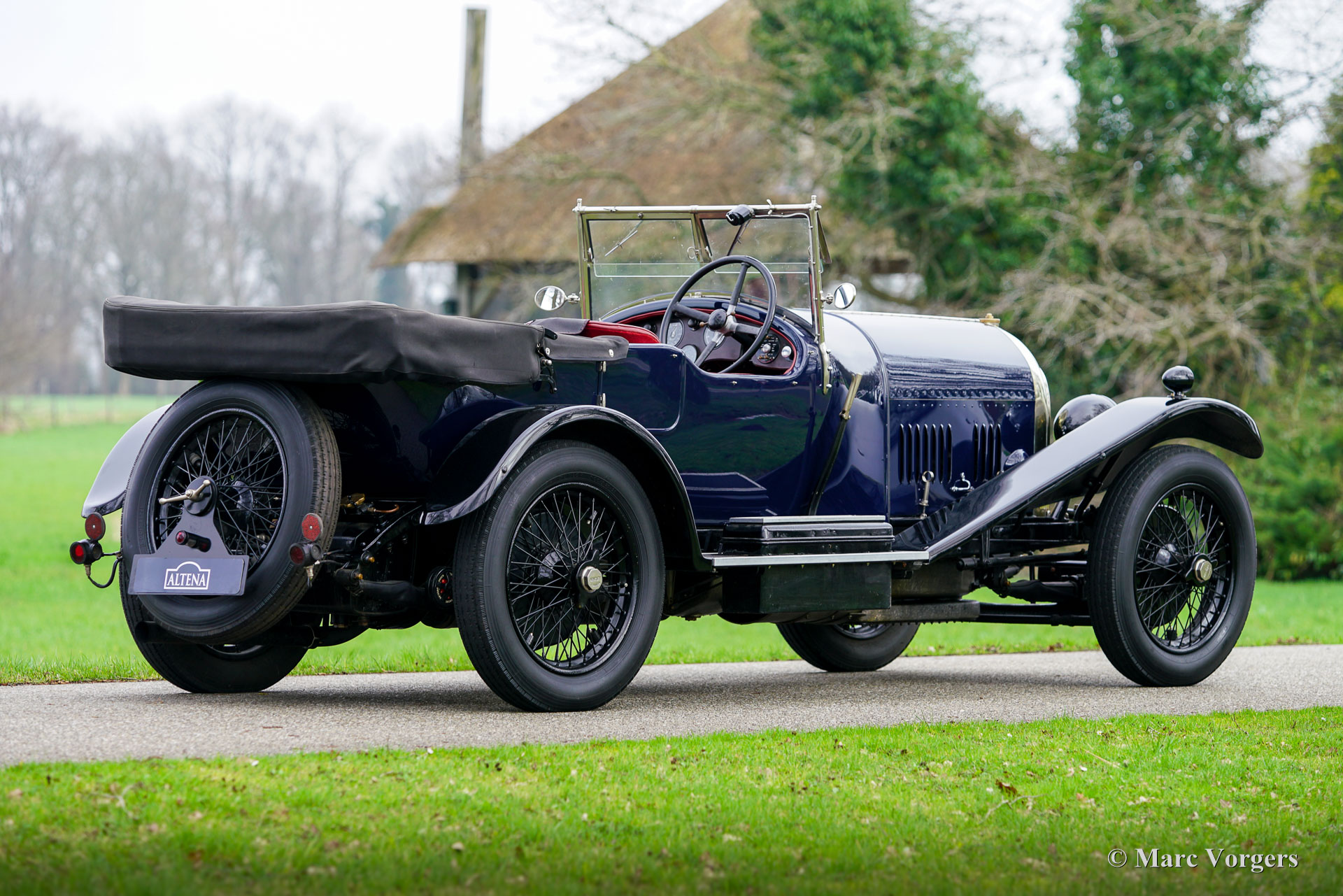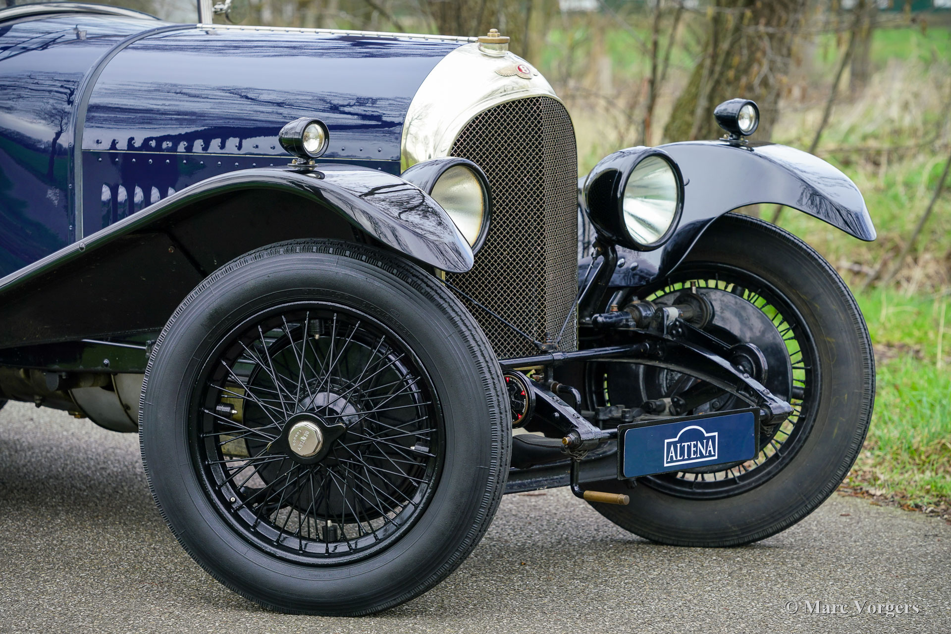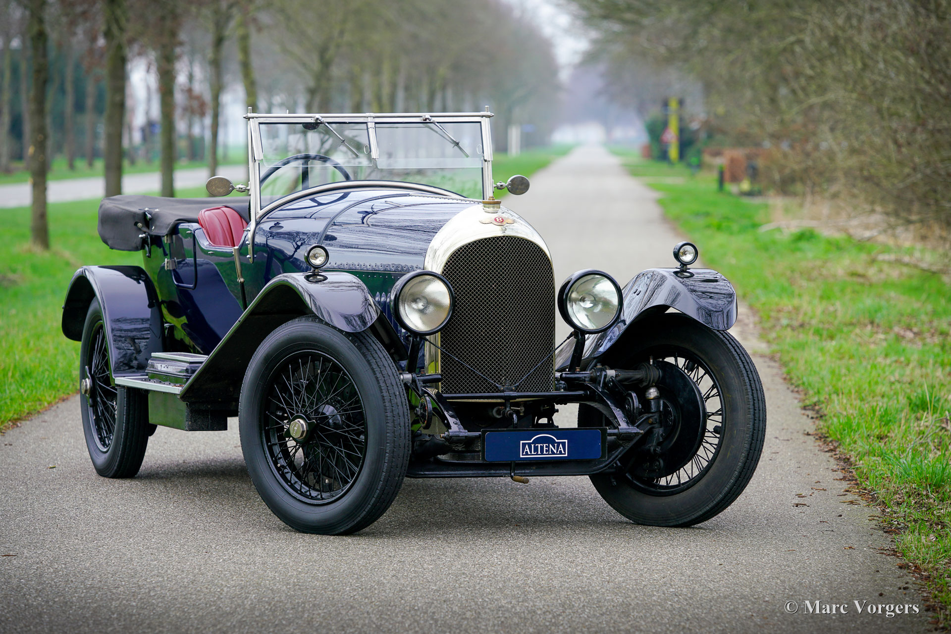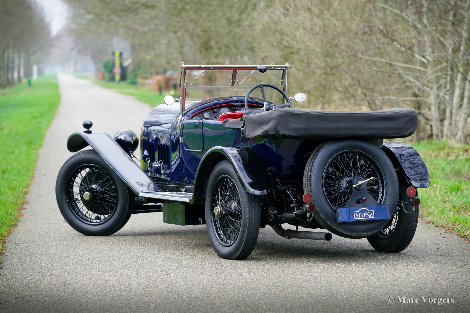 Bentley 3-Litre Speed model, year 1924. Colour dark blue with black wire wheels combined with a red leather interior trimmed with red wool carpet. Black hood, hood cover and tonneau cover. This original Bentley 3-Litre ‘red badge’ short chassis Speed model was sold new in the United Kingdom fitted with a ‘Park Ward’ body. In later years the car was given the current 4-seater open tourer bodywork. The automobile was extensively restored and overhauled by a Bentley specialist with eye for originality. The engine, and all the mechanical parts were completely overhauled. All the important chassis and mechanical parts are factory original, the numbers on the chassis, engine, gearbox, steering gear, and rear axle are correct for this car as it left the factory in 1924! The car shows many wonderful original details like the remarkable Sloper carburettors and the Bentley marked dashboard instruments. The full history is known and documented, and a photo report of the extensive restoration is present. This Bentley 3-Litre Speed model is mentioned in the book ‘Bentley The Vintage Years’, a standard work on Bentley by Clare Hay. This glorious Bentley 3-Litre is in a wonderful and very good condition. The automobile breathes the quality W.O. Bentley had envisaged when he created his ‘3-Litre’; ‘A fast car, a good car, the best in its class’. The 3-Litre featured one of the first production car engines with 4 valves per cylinder, dry-sump lubrication, and an overhead camshaft. The first 3-Litre chassis was shown at the 1919 London (Olympia) Motor Show, with the first customer delivery in 1921. Between the show and 1921 much work was needed to improve refinement. As W.O. later wrote, “I hate noise for the sake of noise. 70mph in silence is far more creditable than a noisy 80mph.” The 3-Litre was very well received by the motoring press. Sammy Davis of the Autocar wrote: “For the man who wants a true sporting type of light-bodied car for use on a Continental tour – where speed limits are not meant to be observed – the 3 Litre Bentley is undoubtedly the car par excellence.” From the beginning the rugged and powerful 3-Litre was entered in competitions and races. The 3-Litre won countless races, amongst others the legendary 24 Hours of Le mans in 1924 and 1927. A private owner (John Duff) also set 21 world records in 24 hours in 1925 at the wheel of a Bentley 3-Litre. A total of 1622 Bentley 3-Litre models were produced between 1921 and 1929. This Bentley 3-Litre model is a splendid product of this adventurous early Bentley Motors period. A wonderful collector’s item and a dream machine for vintage Bentley drivers and Bentley enthusiasts.