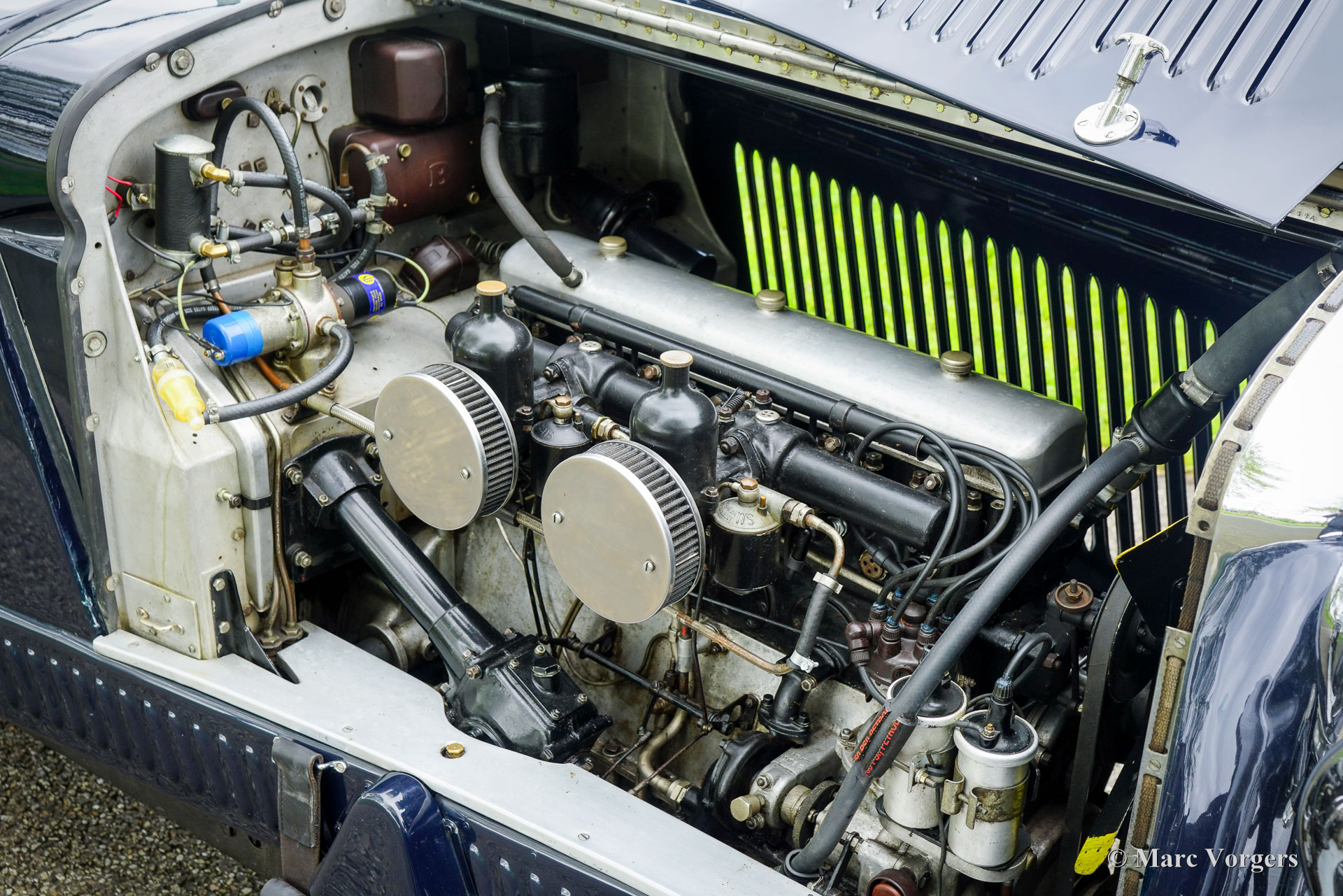 The Bentley 3 Litre was W.O. Bentley’s first design. The car was presented in 1919 but the first cars were sold in 1921. The four cylinder cars of rugged construction where in a class of their own for they combined the size and comfort of the big tourers and saloons with the road holding, and speed of the smaller sports- and racing cars. The Bentley was a true owner-driver car for the sporting motorist and connoisseur. The Bentley car could be had in three different types which were designated with three different radiator badges*. Red badge: short chassis speed model, Blue badge: the early short and then long chassis type for bespoke bodywork, Green badge: very rare and used for about eighteen 100 mph. These Green badge car won at Le Mans in 1924 and 1927 (Old Number Seven.) The 3-Litre was built from 1919 until 1929.
