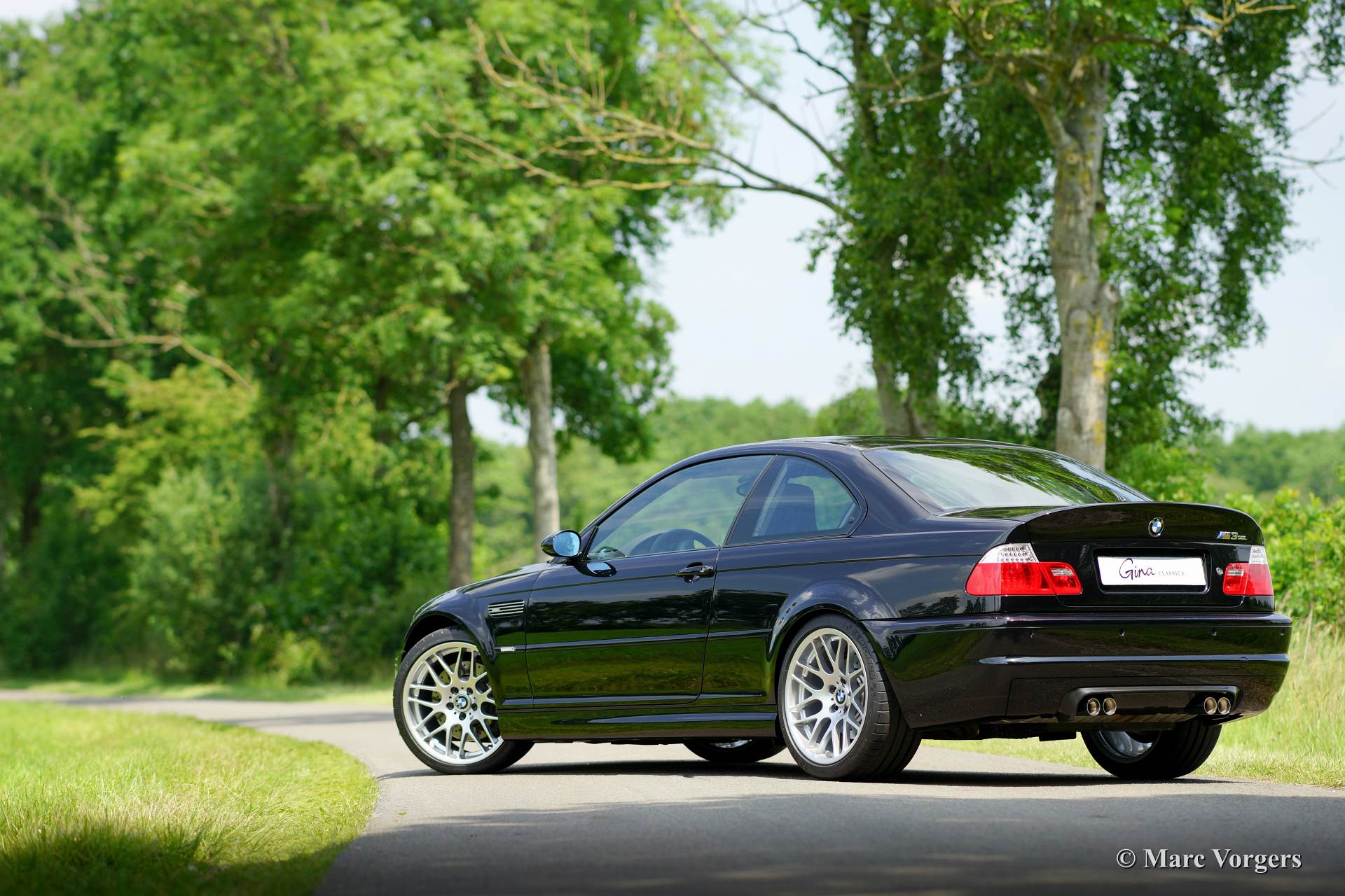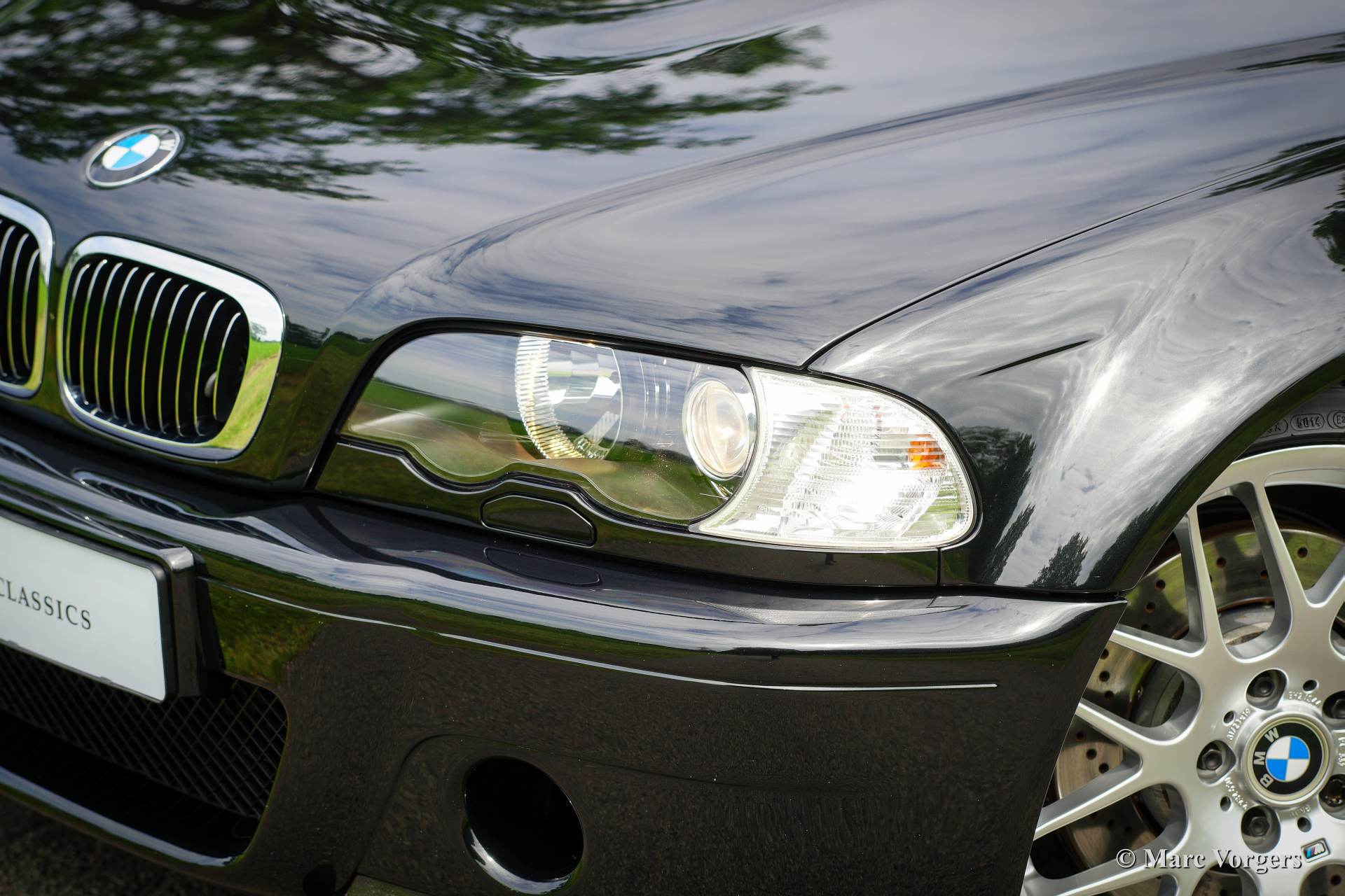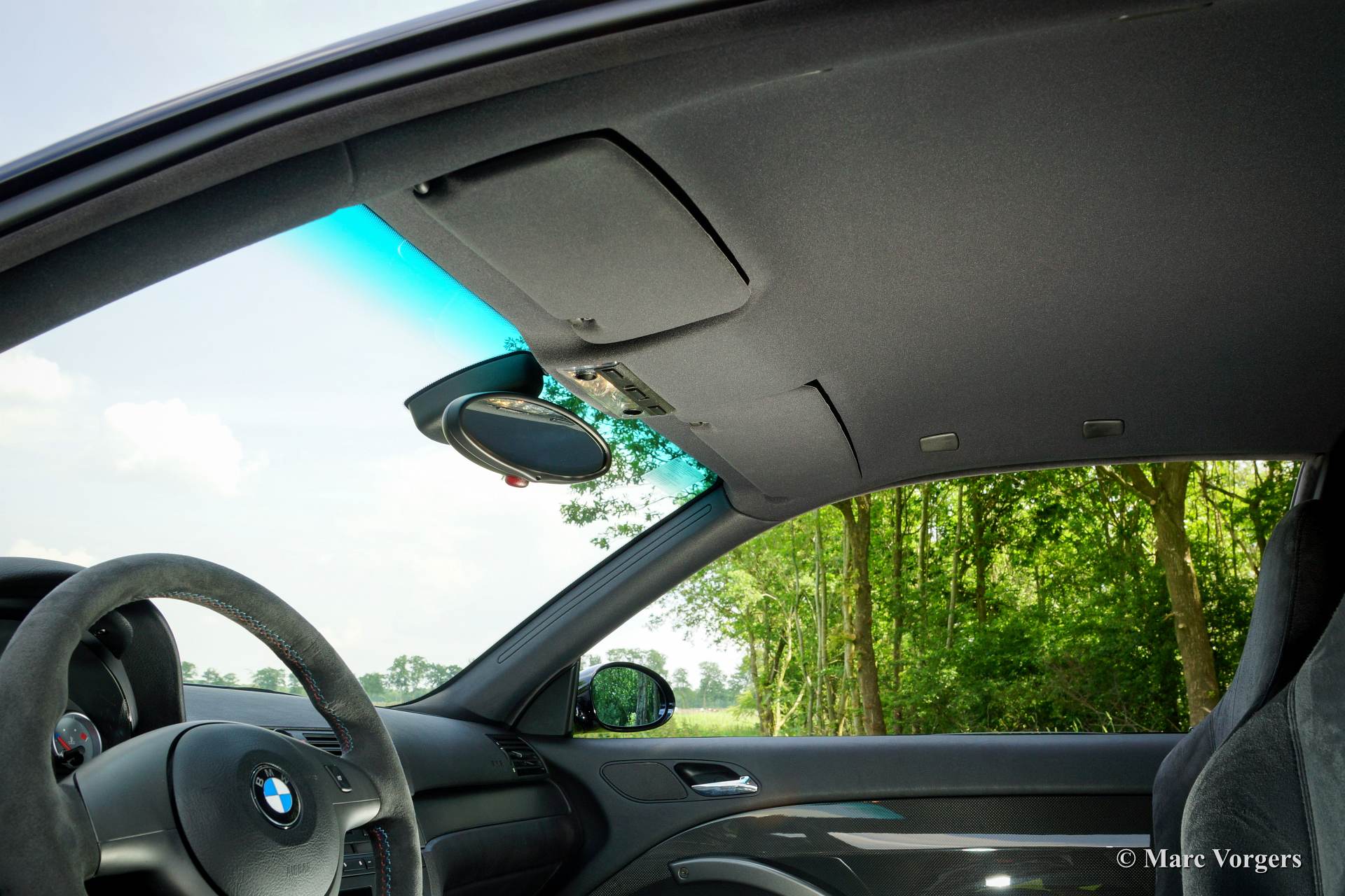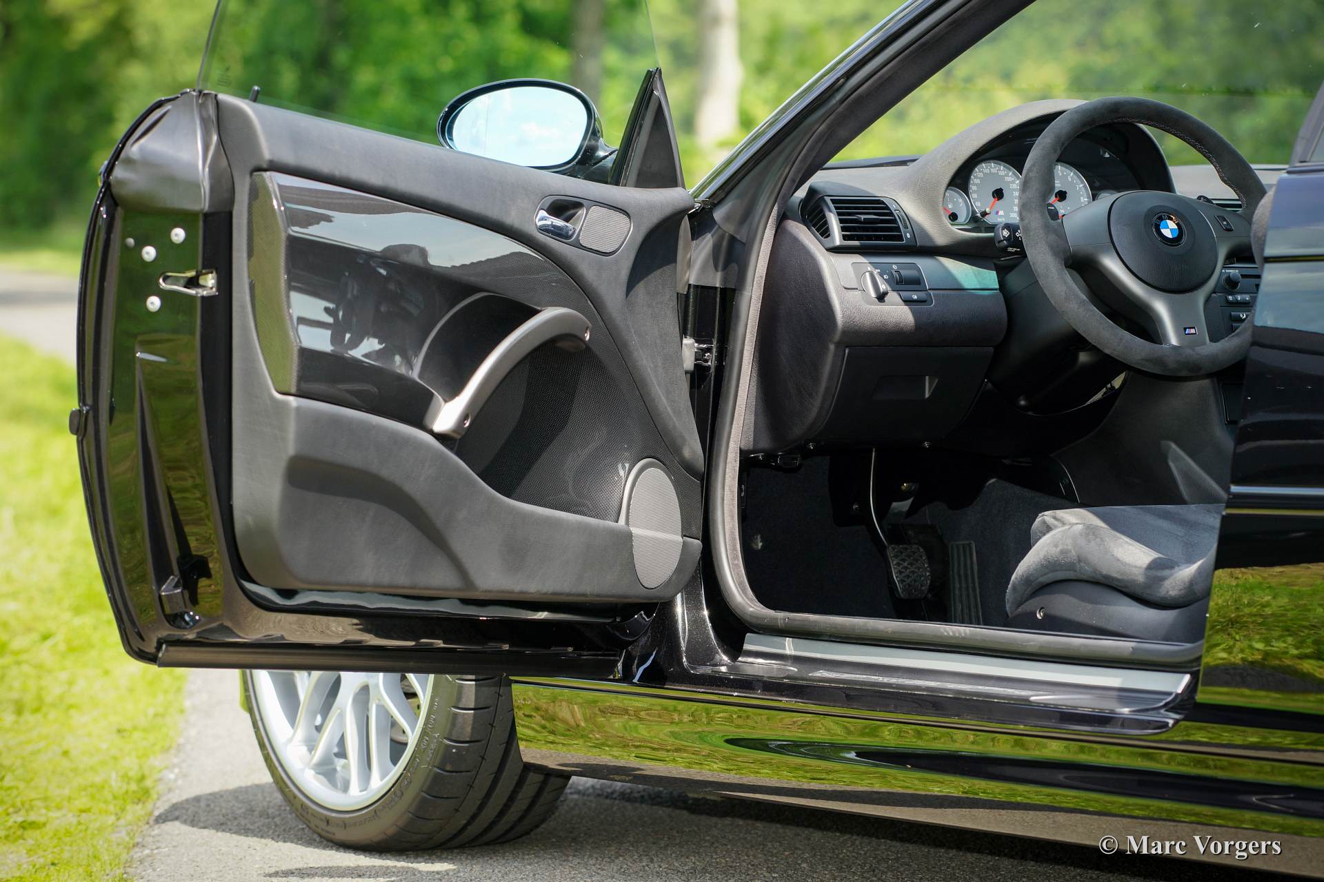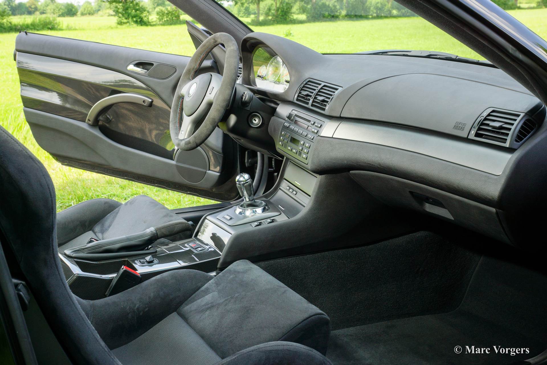 BMW M3 CSL, year July 2003. Colour Saphir black (code 475) with an anthracite/grey ‘Amaretta Reflex’ interior. This fabulous BMW M3 CSL (model E46) was sold new in Germany. The BMW M3 CSL is like all BMW M models ‘Born on the circuit and at home on every road’. The M3 CSL (Coupe Sport Leichtbau) is a special and rare M3 model which was produced in a limited edition series from June until December 2003. The CSL is build using ultra-light carbon fibre panels for the roof and the boot lid. Furthermore the steering was given a touch of additional sharpness and the engine was up rated to 360 bhp. A lusty 17 bhp more than the ‘standard’ E46 M3. The car features an automatic 6 speed SMG gearbox with shift ‘paddles’ on the steering wheel.