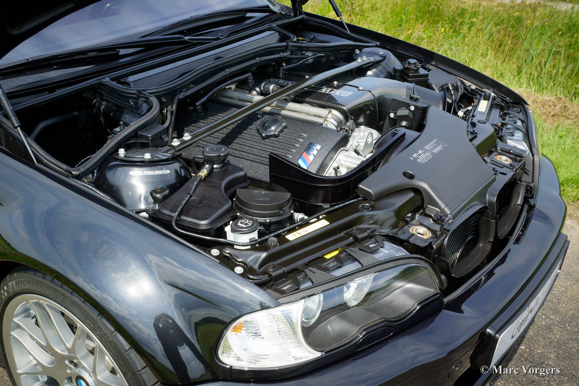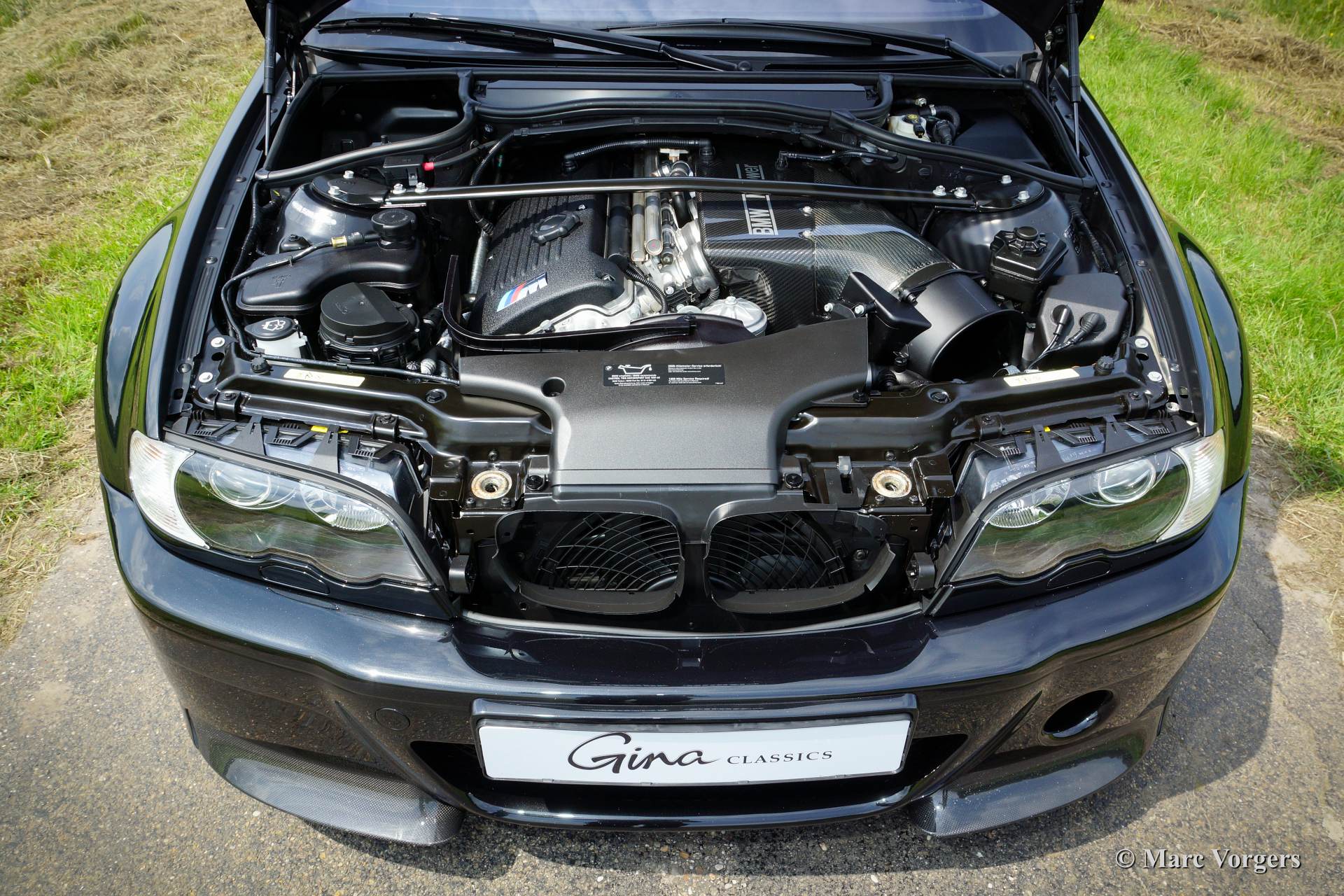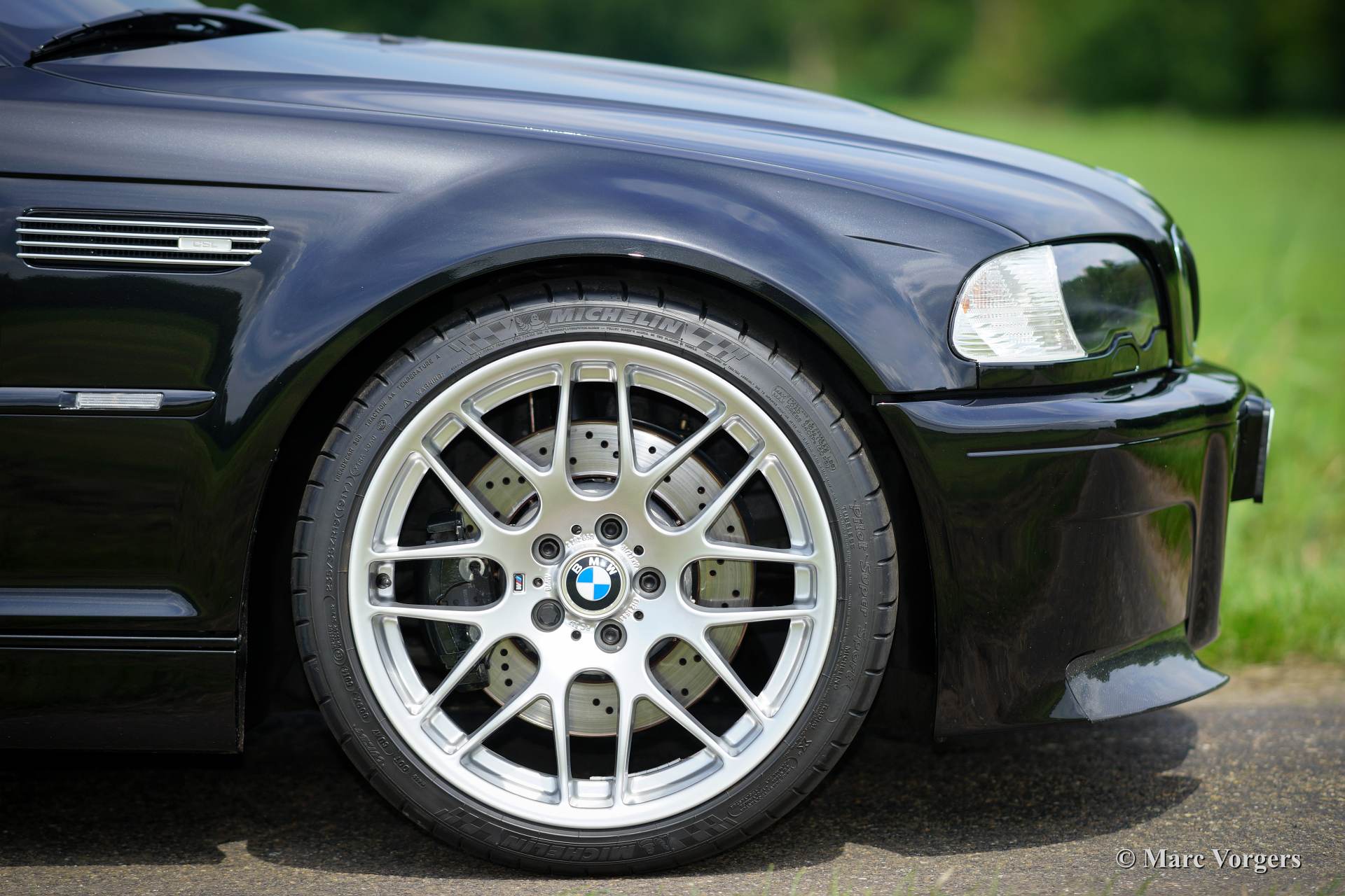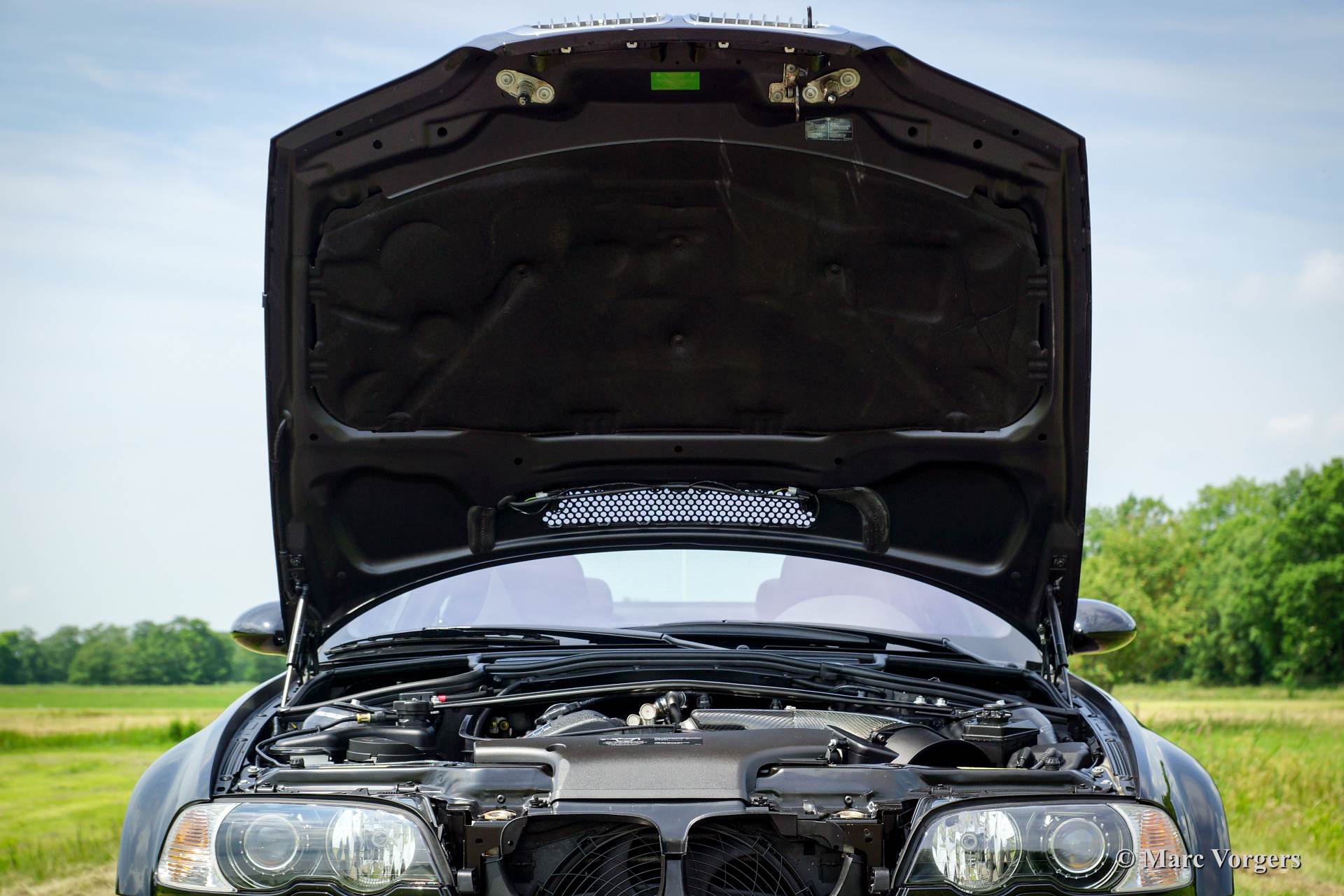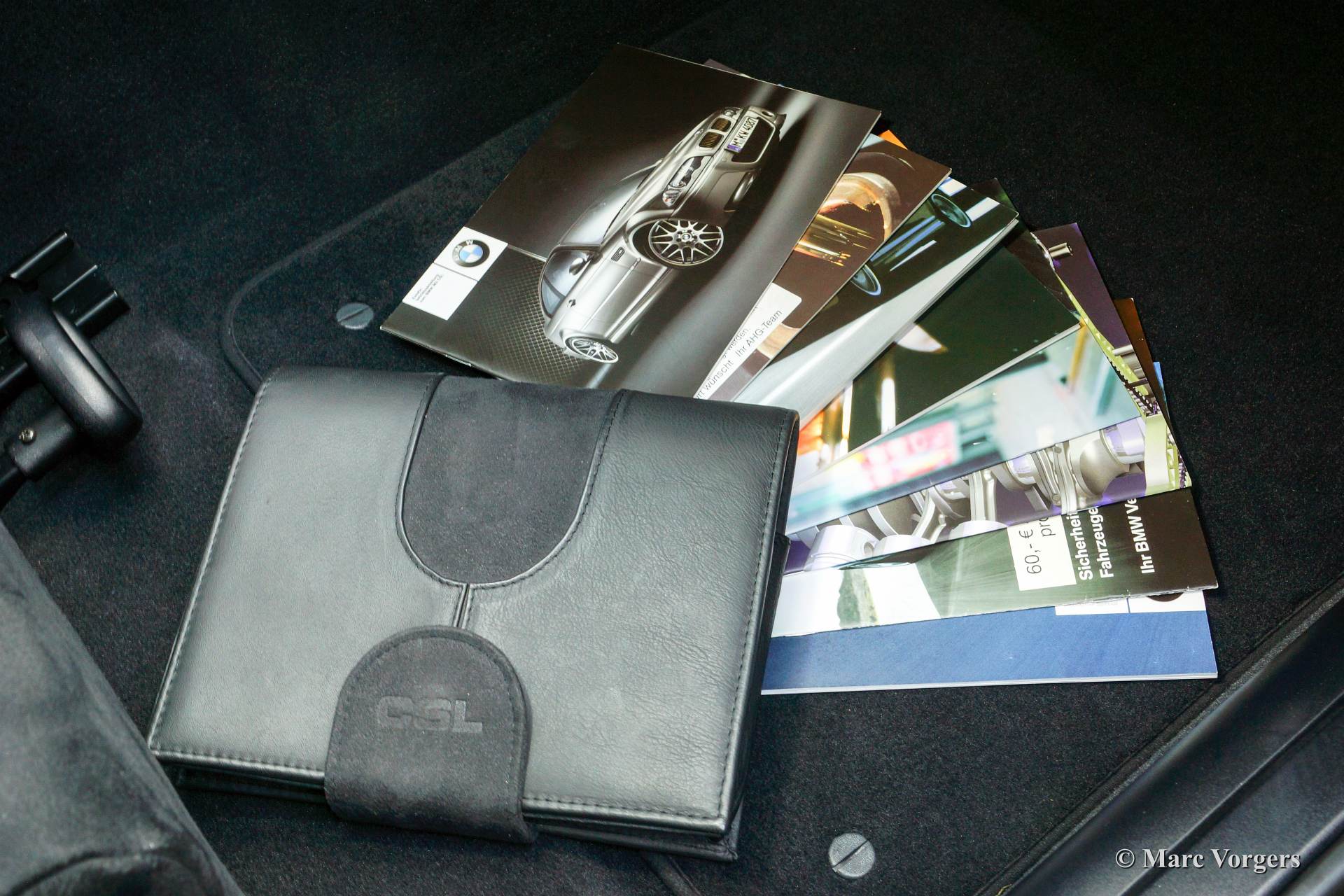 BMW M3 CSL, year July 2003. Colour Saphir black (code 475) with an anthracite/grey ‘Amaretta Reflex’ interior. This fabulous BMW M3 CSL (model E46) was sold new in Germany. The BMW M3 CSL is like all BMW M models ‘Born on the circuit and at home on every road’. The M3 CSL (Coupe Sport Leichtbau) is a special and rare M3 model which was produced in a limited edition series from June until December 2003. The CSL is build using ultra-light carbon fibre panels for the roof and the boot lid. Furthermore the steering was given a touch of additional sharpness and the engine was up rated to 360 bhp. A lusty 17 bhp more than the ‘standard’ E46 M3. The car features an automatic 6 speed SMG gearbox with shift ‘paddles’ on the steering wheel.