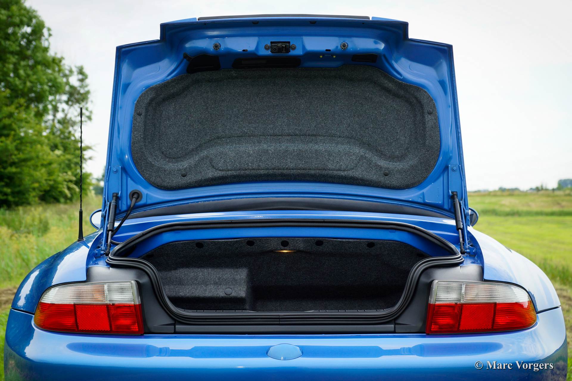 BMW Z3 Roadster, year 1998. Colour Estoril blue metallic with a black/grey Nappa leather interior. Dark blue soft top.