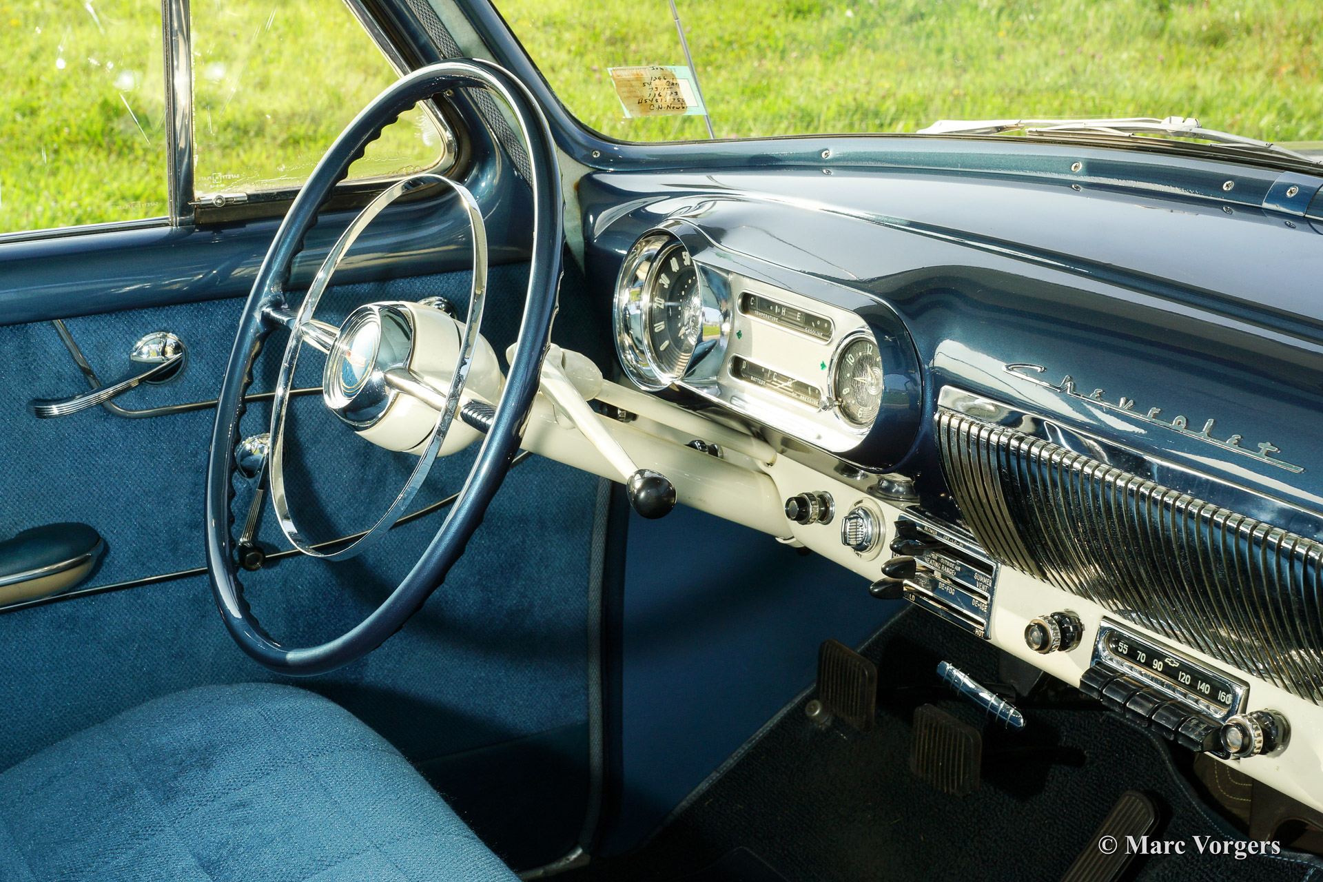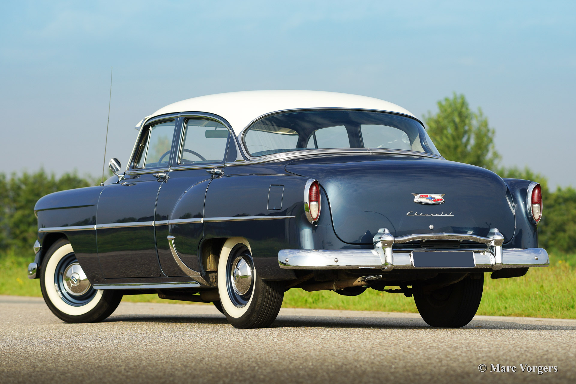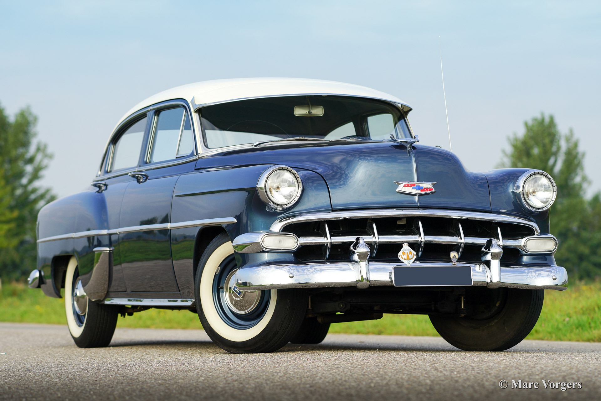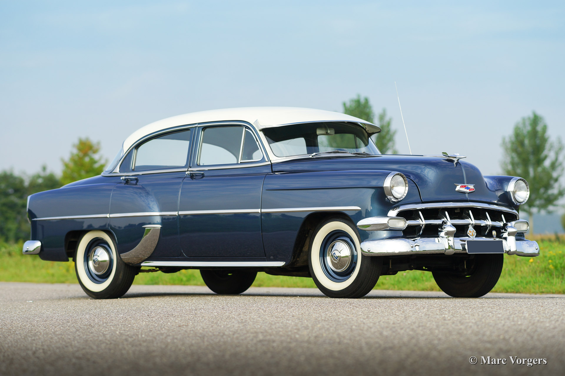 Chevrolet 210 sedan, year 1954. Chassis number 0795467FXXX. Colour blue metallic with a white roof top. blue cloth interior. This beautiful Chevrolet was extensively restored in the Netherlands. The automobile is in superb (excellent+) condition! This Chevrolet drives very comfortably, the car sports a smooth six cylinder engine and a manual 3-speed gearbox with steering column shift. This Chevrolet is fitted with a special sun shade above the windscreen, a period radio and tires with white side walls. A photo reportage of the restoration is present.
