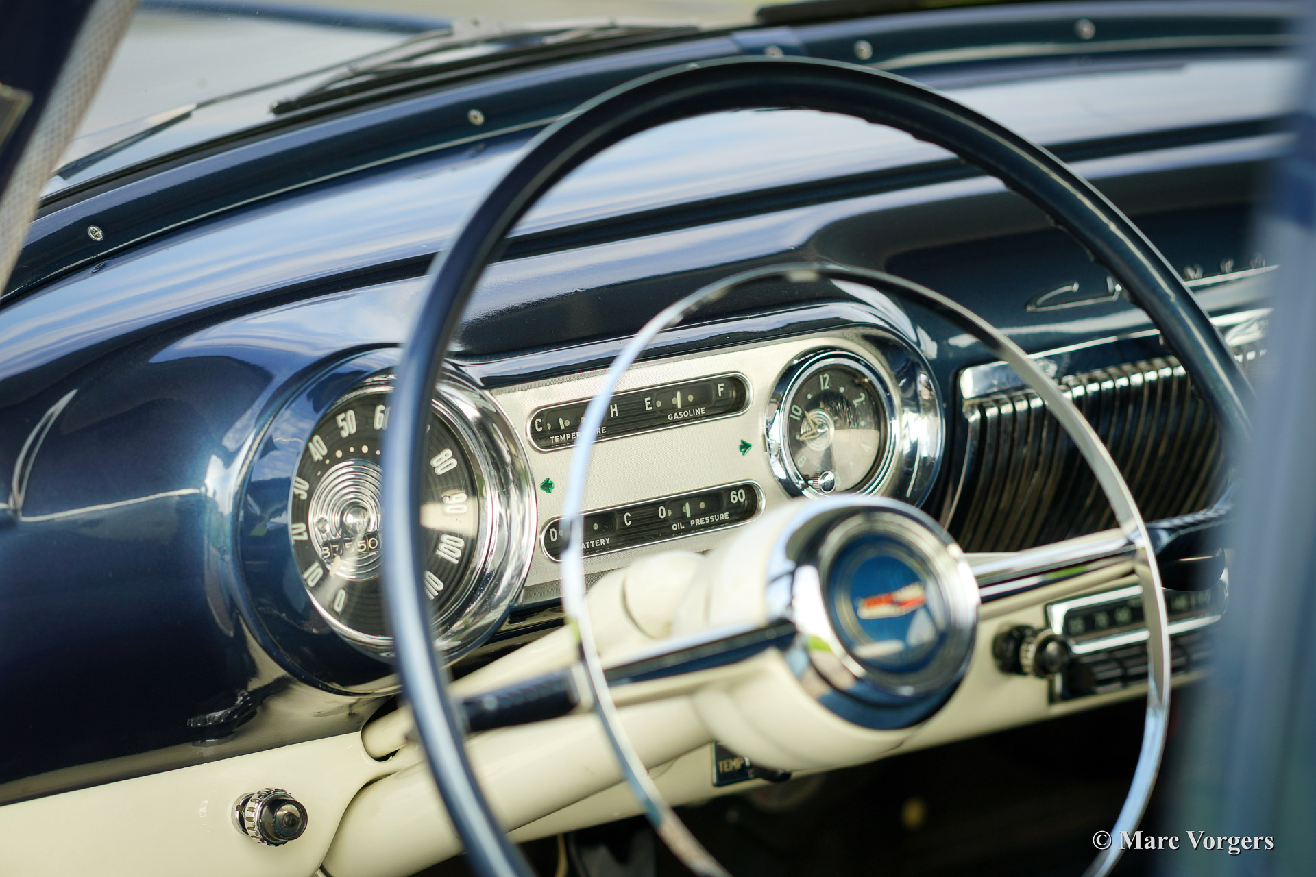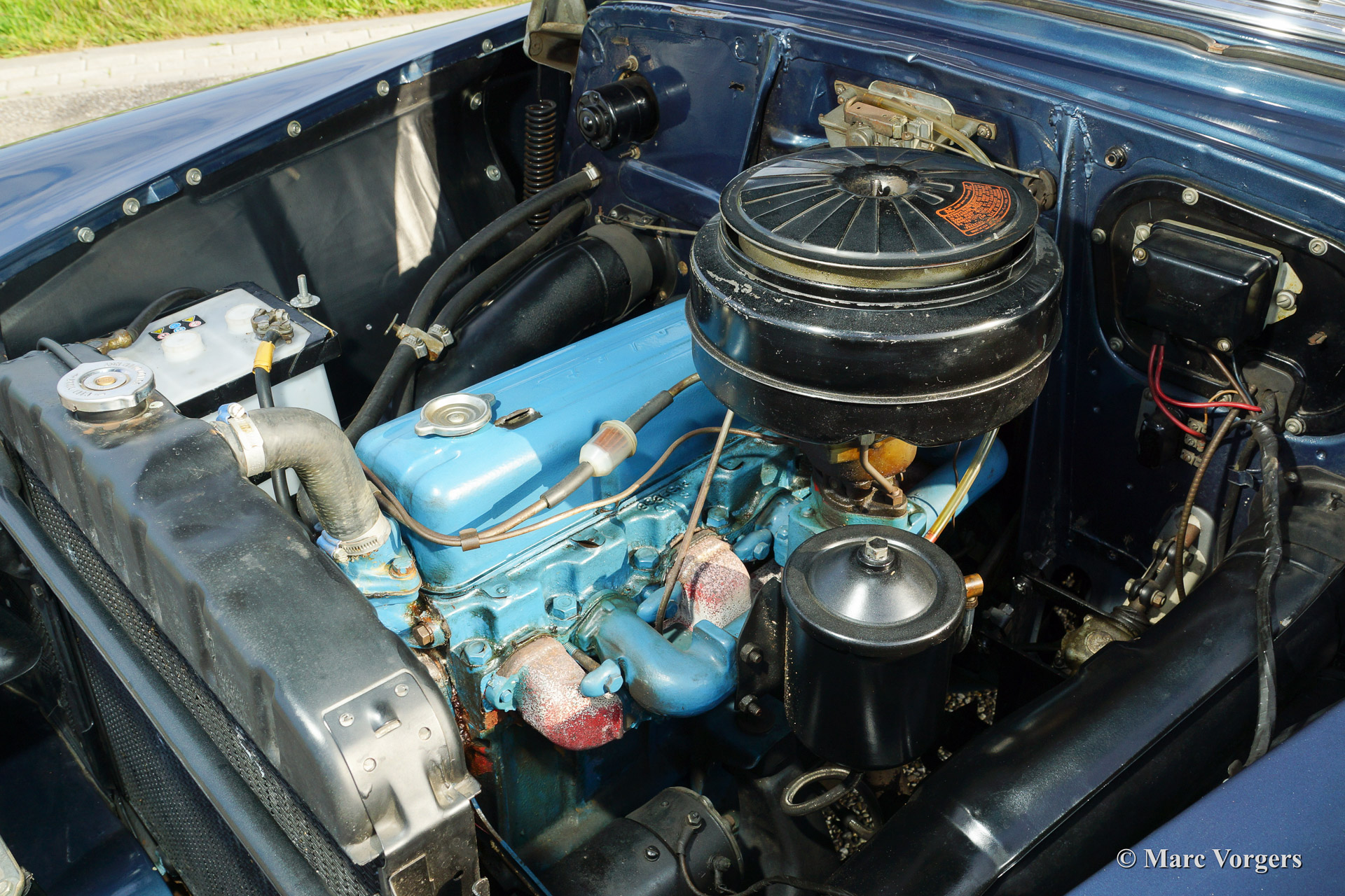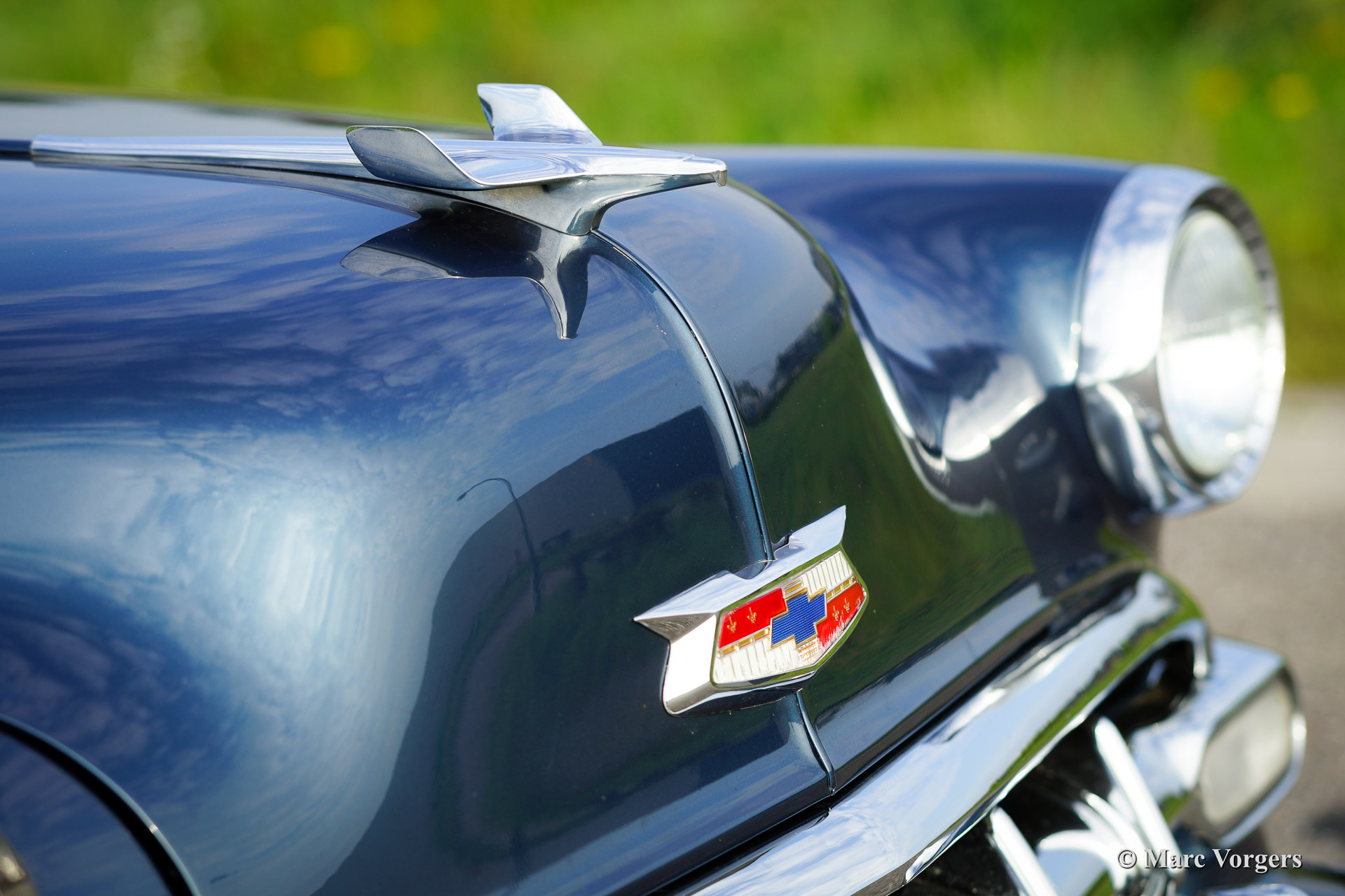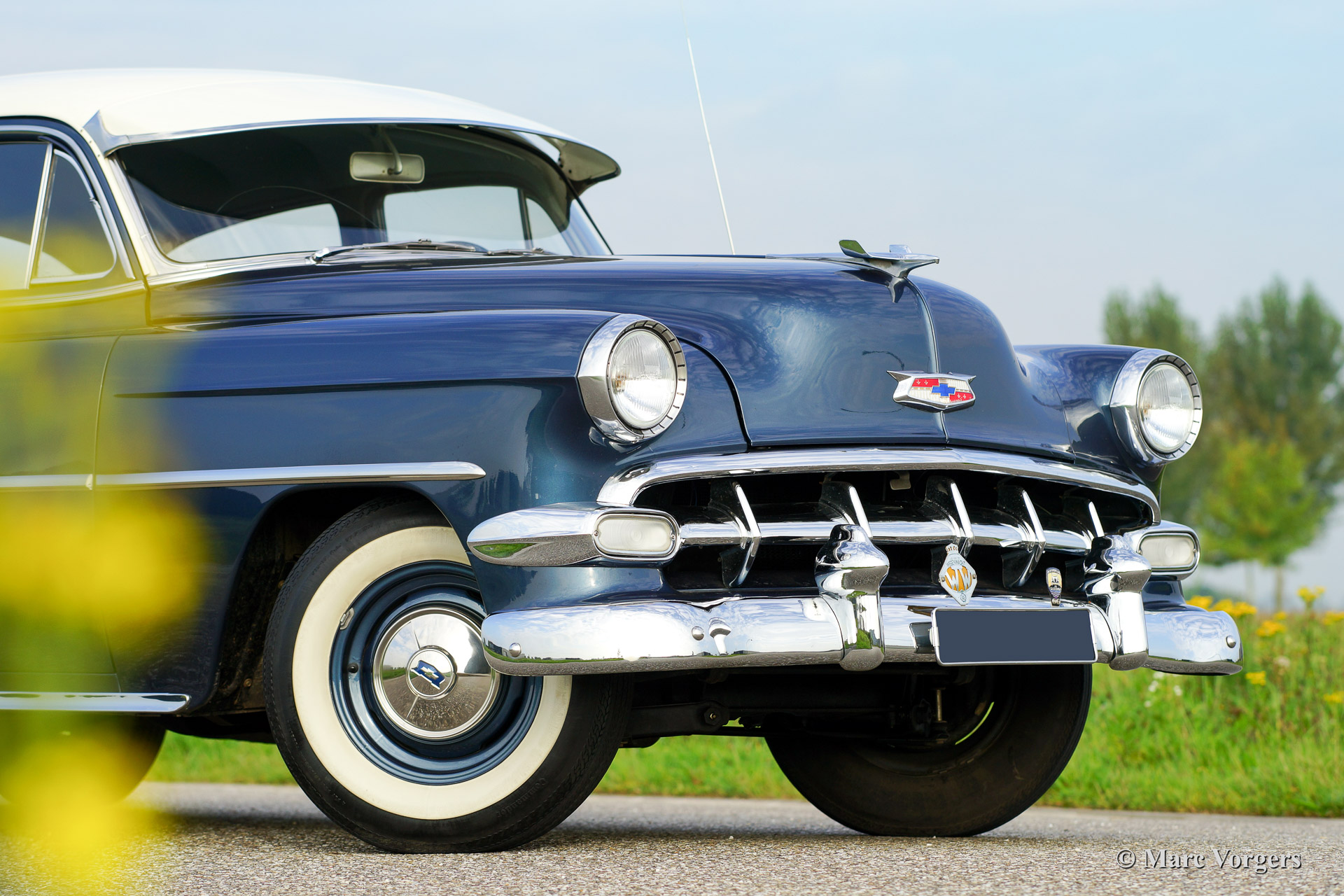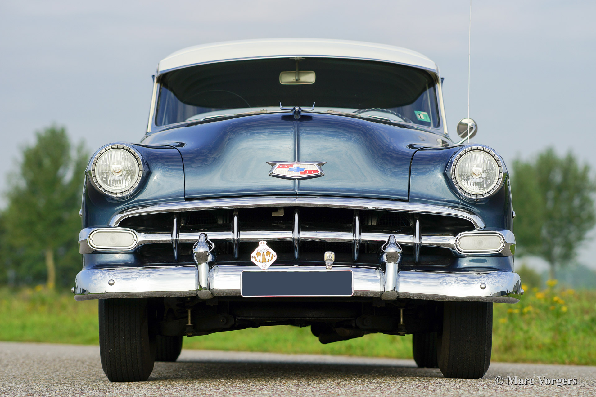 Chevrolet 210 sedan, year 1954. Chassis number 0795467FXXX. Colour blue metallic with a white roof top. blue cloth interior. This beautiful Chevrolet was extensively restored in the Netherlands. The automobile is in superb (excellent+) condition! This Chevrolet drives very comfortably, the car sports a smooth six cylinder engine and a manual 3-speed gearbox with steering column shift. This Chevrolet is fitted with a special sun shade above the windscreen, a period radio and tires with white side walls. A photo reportage of the restoration is present.