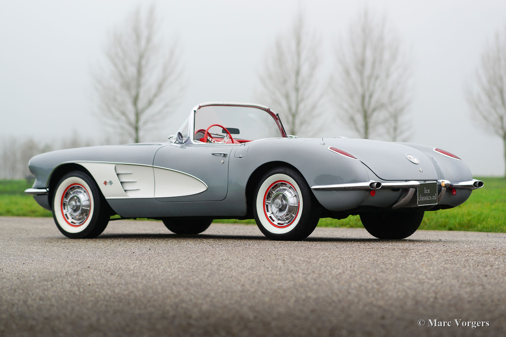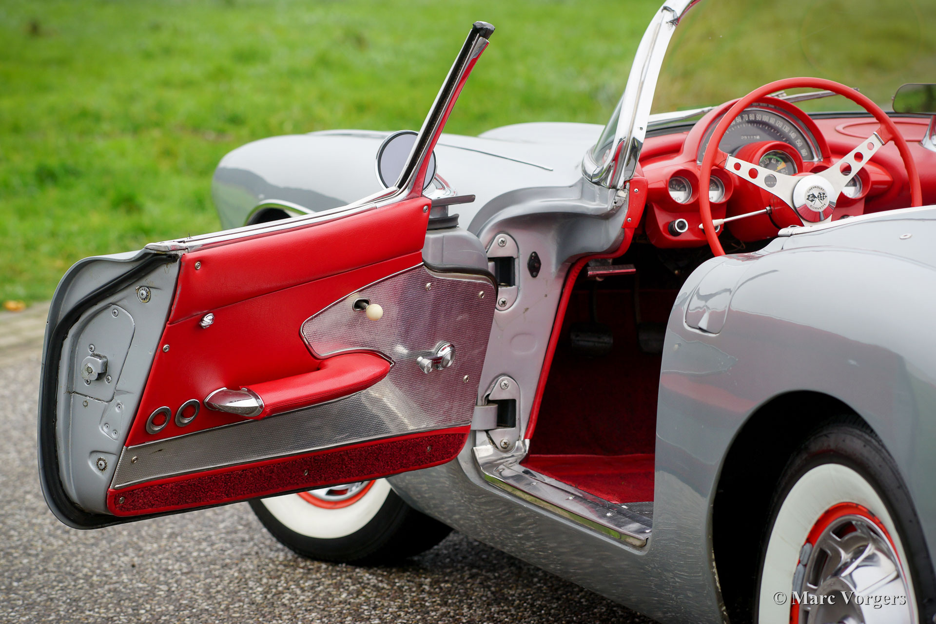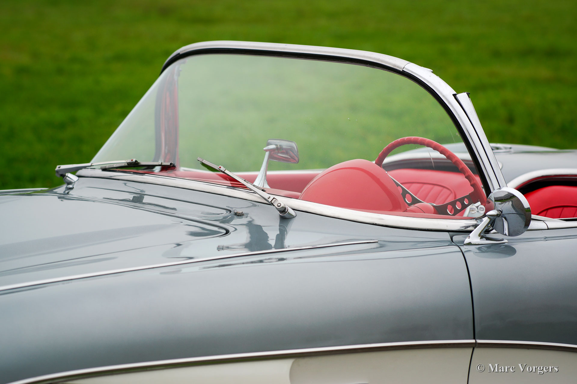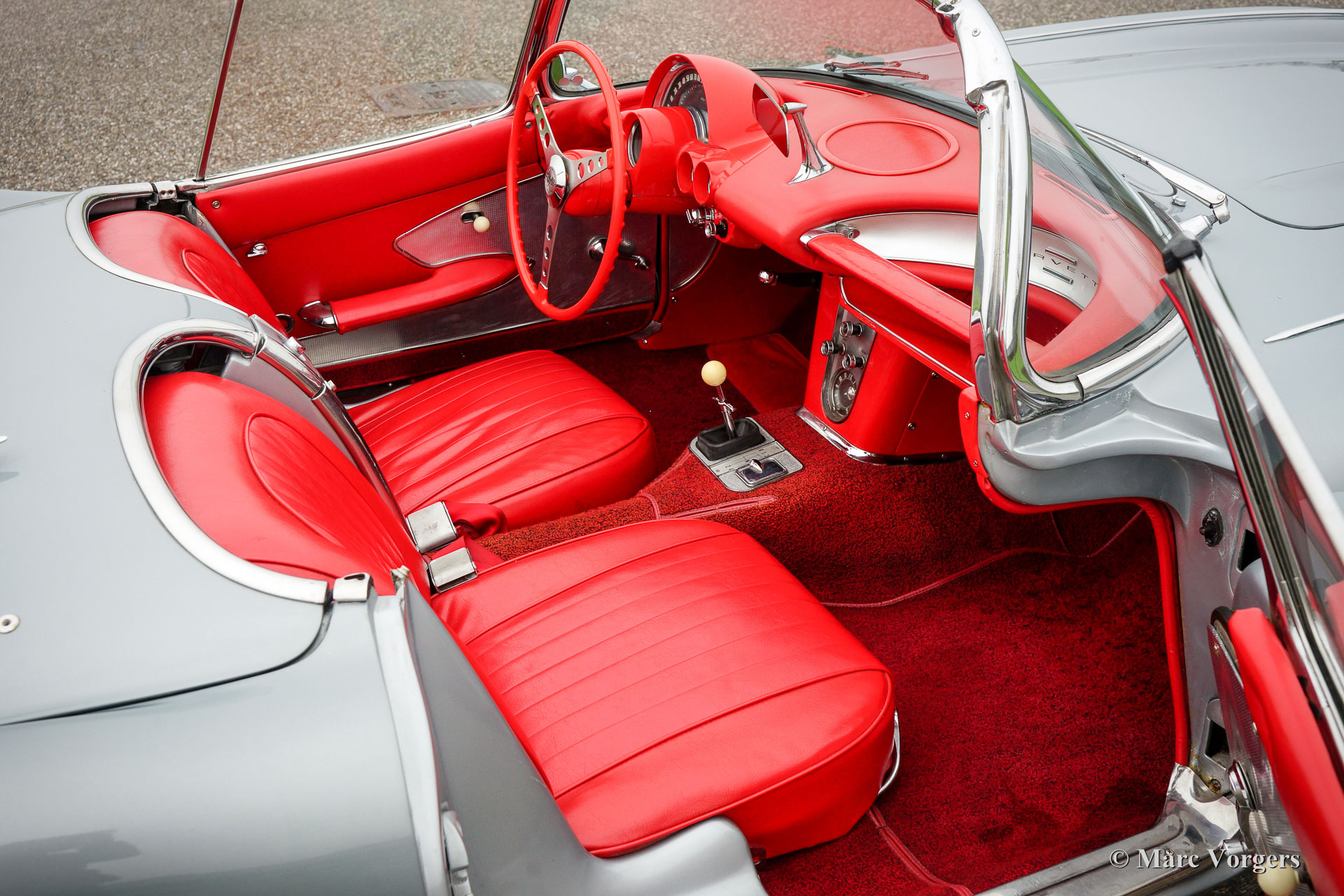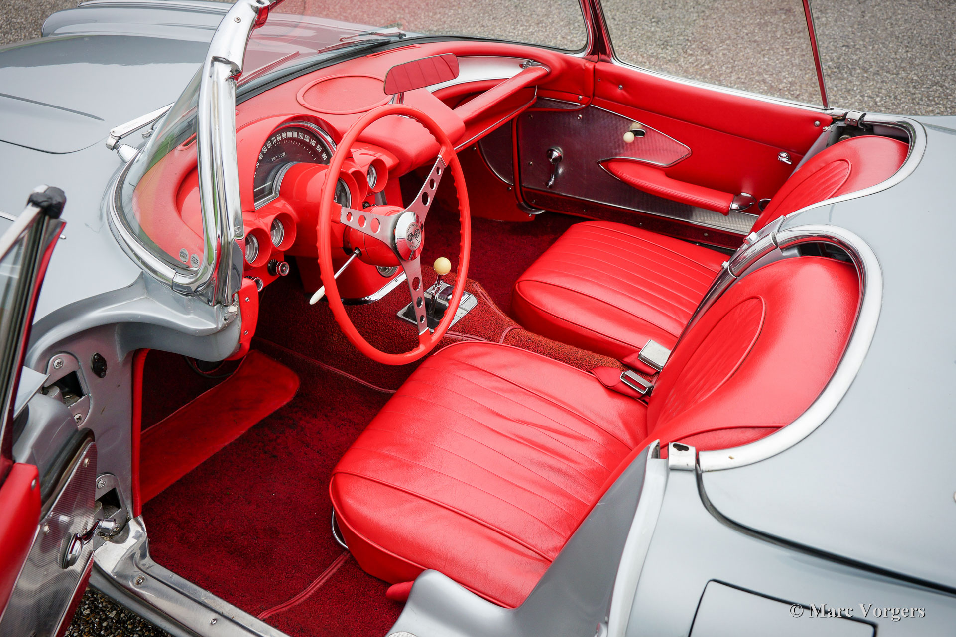 Chevrolet Corvette C1, year 1960. Colour grey (Sateen Grey) with crème white ‘coves’. This combined with a red leatherette interior and red carpet. Black soft-top. This fantastic Chevrolet Corvette from the first series (1953 – 1962) is in very good condition and the car drives and sounds perfectly! The Chevrolet Corvette features a steel chassis and a glass-fibre reinforced bodywork, quite a production novelty in the early 1950’ies and a smart way to produce a car in limited numbers. This is a wonderful Corvette C1 factory fitted with a manually operated gearbox! The big V8 engine and the robust mechanics are true American hallmarks. The car shows all the original details, you will never stop admiring all the beautiful styling details and the stunning dashboard! This is a magnificent example of the first series, a true cult-car from the rock & Roll era!