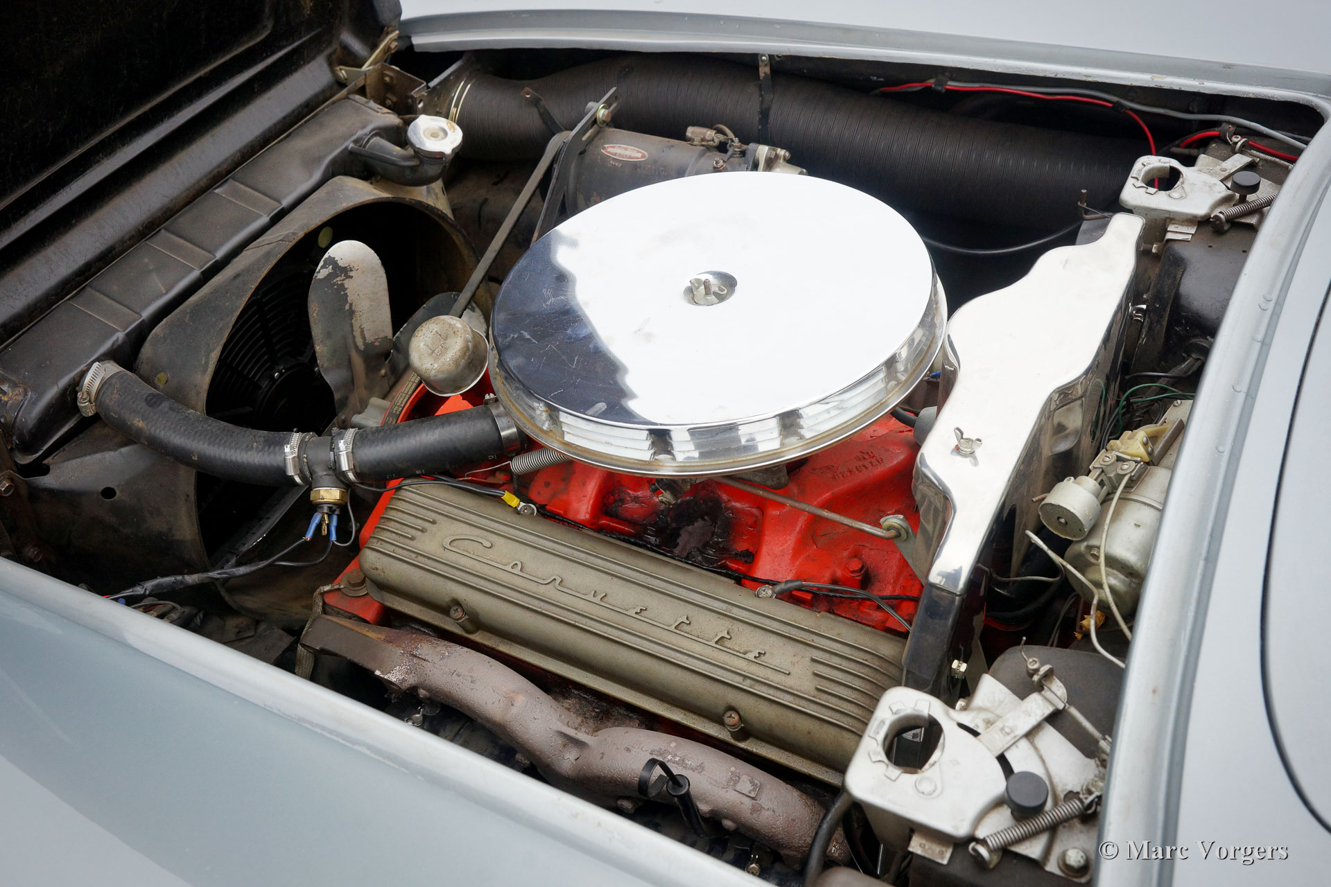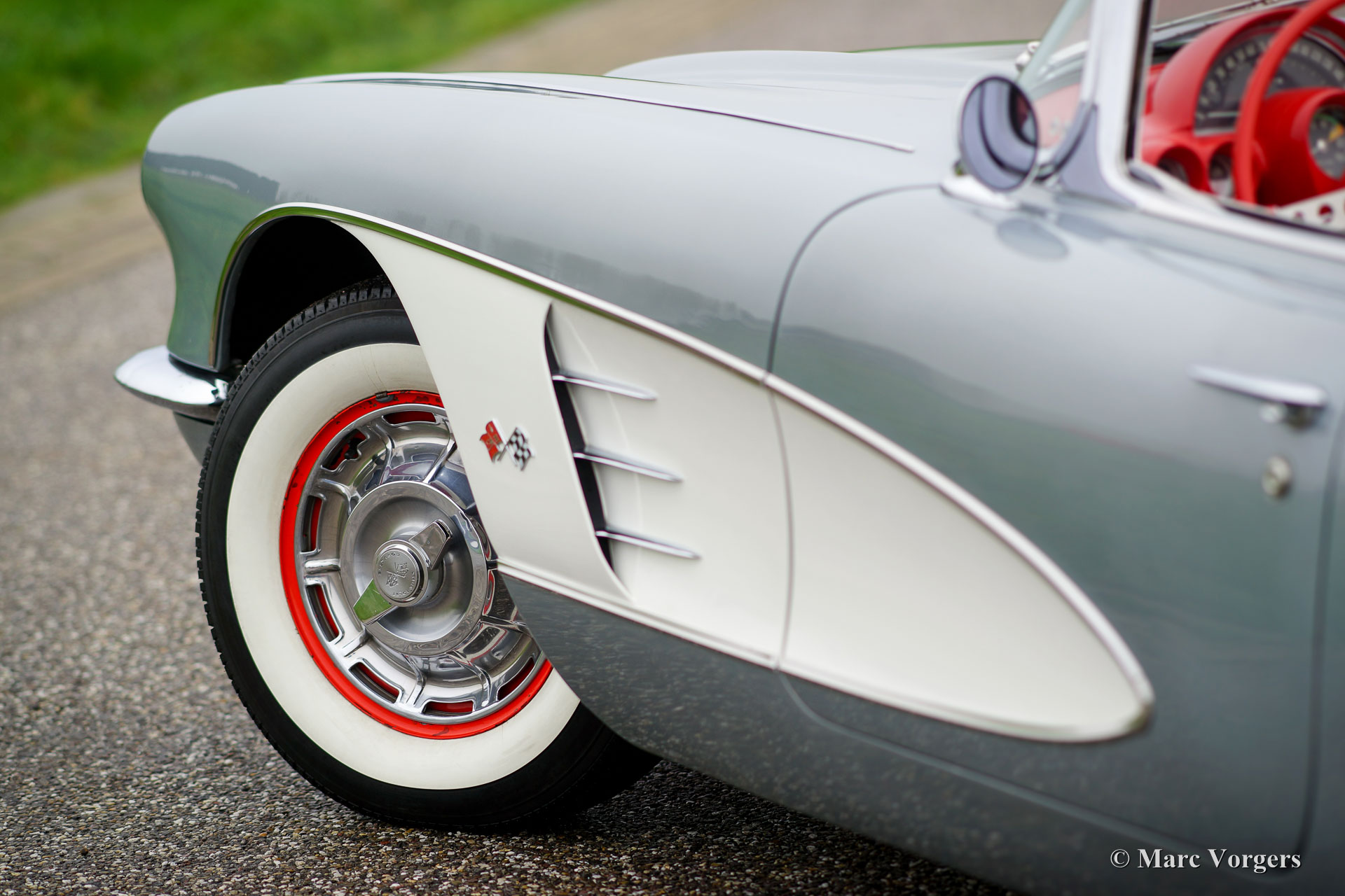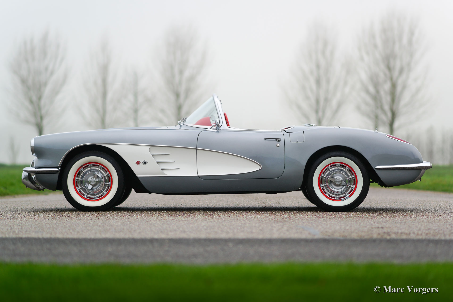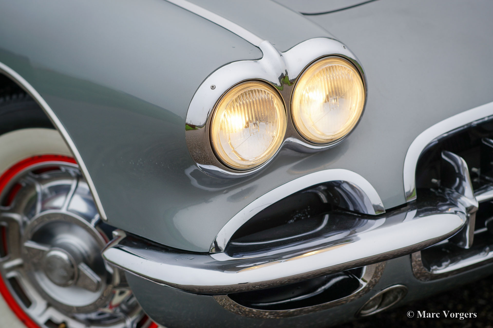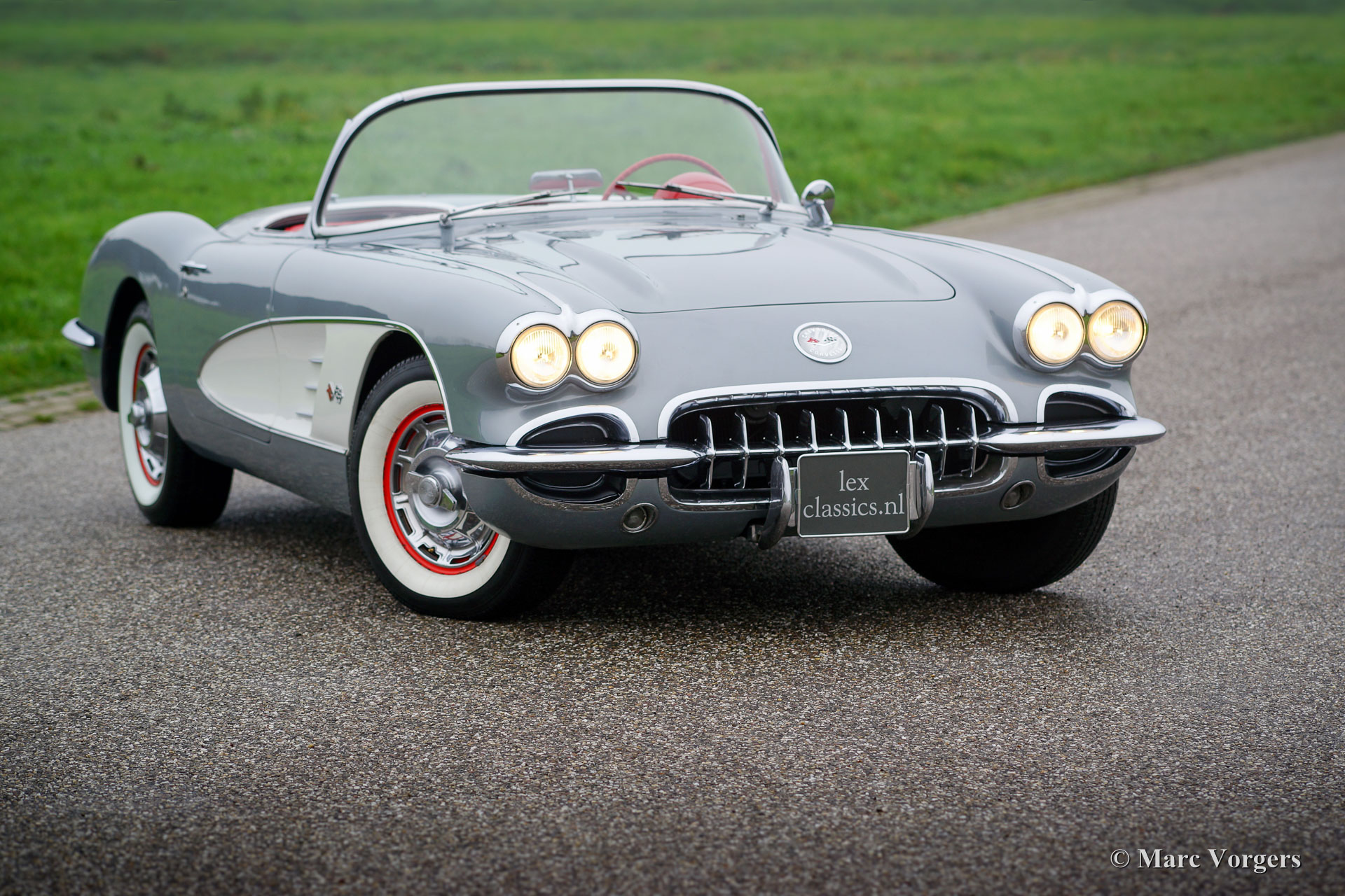 Chevrolet Corvette C1, year 1960. Colour grey (Sateen Grey) with crème white ‘coves’. This combined with a red leatherette interior and red carpet. Black soft-top. This fantastic Chevrolet Corvette from the first series (1953 – 1962) is in very good condition and the car drives and sounds perfectly! The Chevrolet Corvette features a steel chassis and a glass-fibre reinforced bodywork, quite a production novelty in the early 1950’ies and a smart way to produce a car in limited numbers. This is a wonderful Corvette C1 factory fitted with a manually operated gearbox! The big V8 engine and the robust mechanics are true American hallmarks. The car shows all the original details, you will never stop admiring all the beautiful styling details and the stunning dashboard! This is a magnificent example of the first series, a true cult-car from the rock & Roll era!