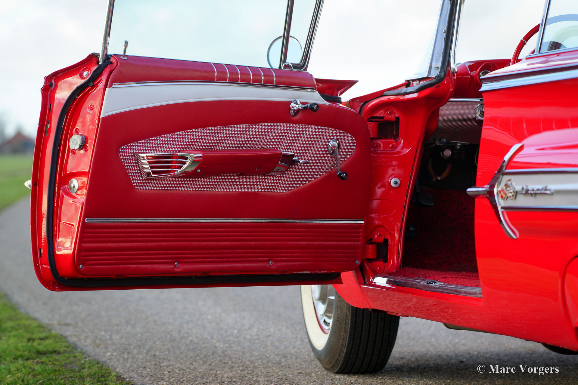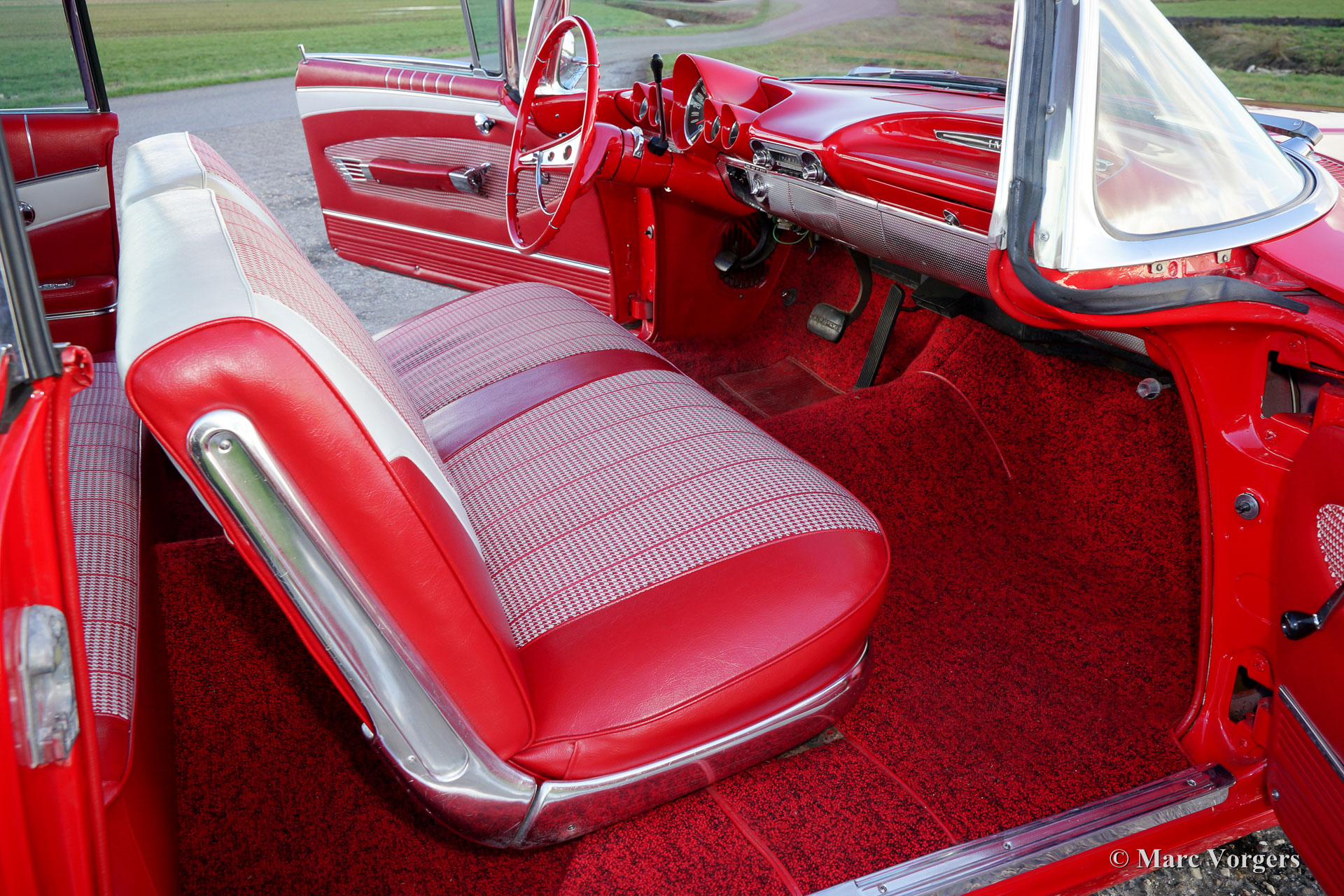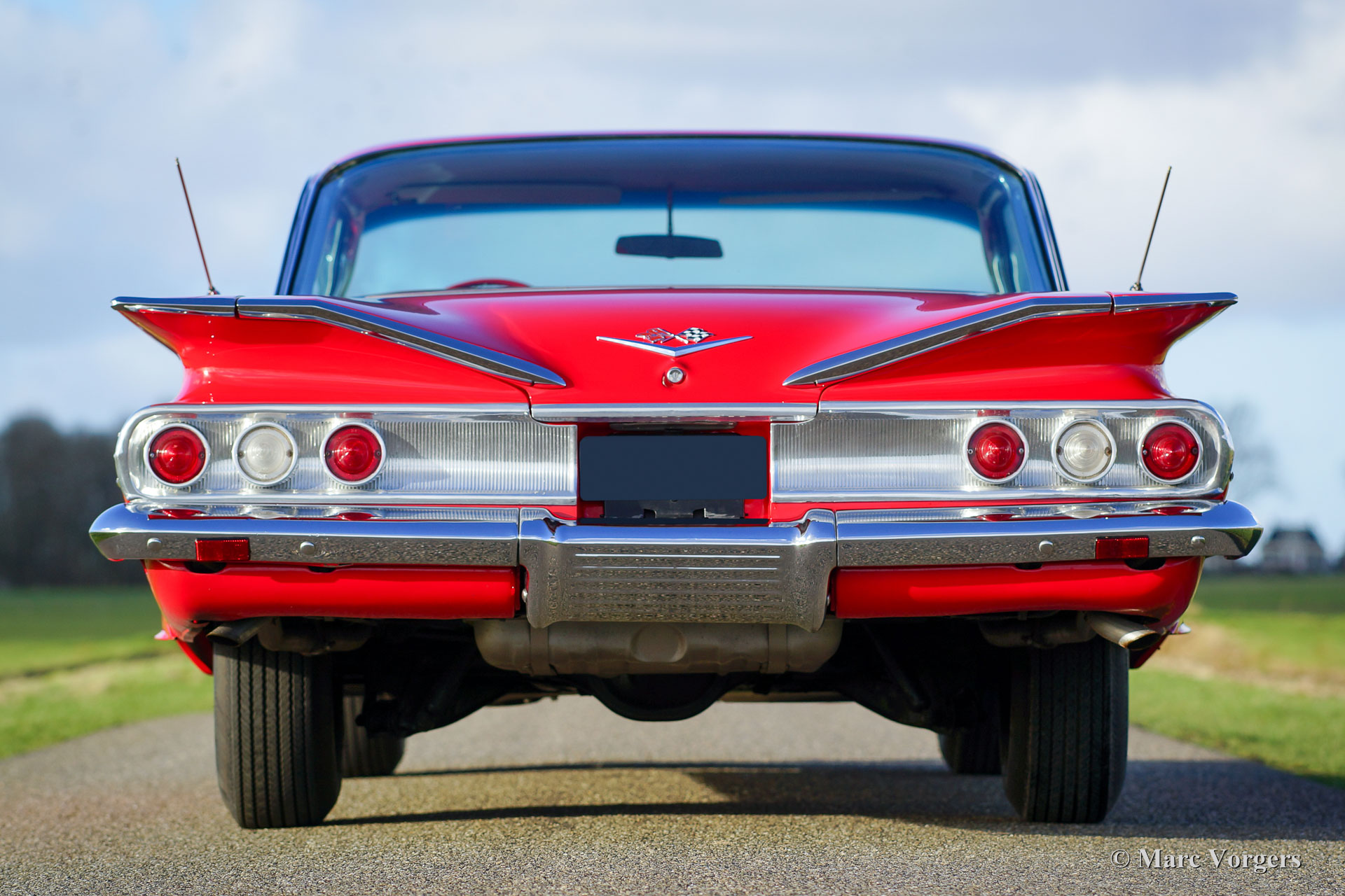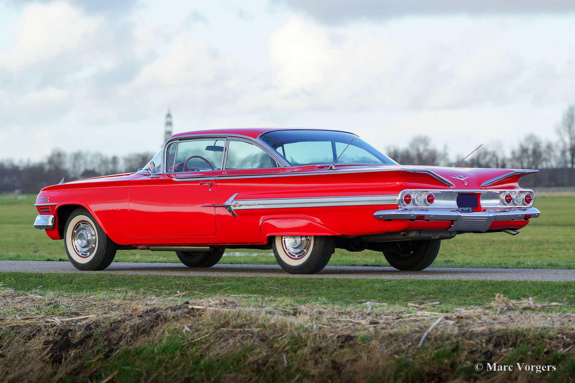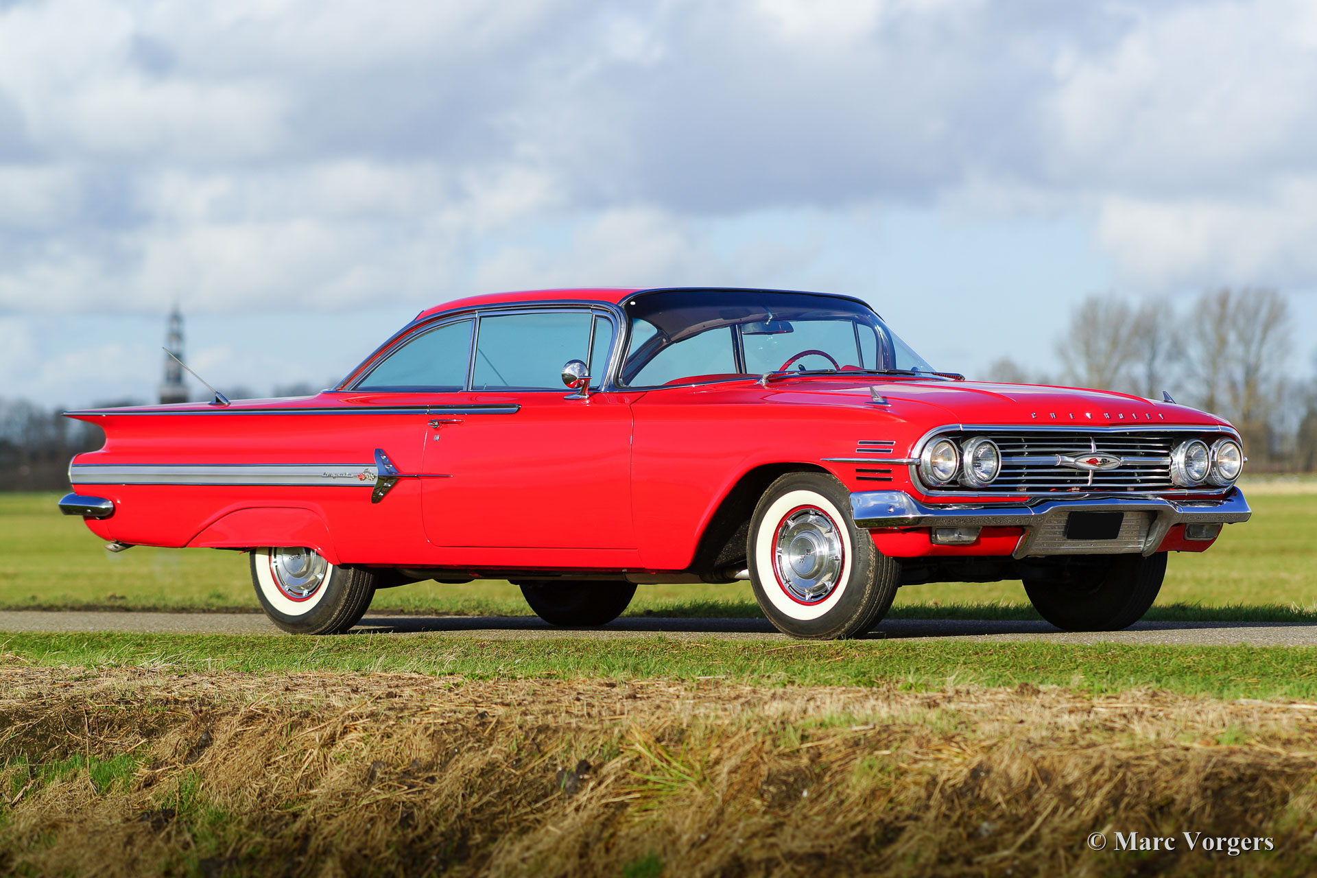Chevrolet Impala Coupe, year 1960. Colour red with a red/white leatherette interior. This magnificent American classic from the ‘Rock & Roll’ period was sold new in the USA. In the years 1990 the automobile was imported to the Netherlands. Here the car was given new paint and the car was mechanically and technically brought up-to-date. This wonderful Chevrolet Impala shows all the original details; the car is in super original and very good condition! American car lovers cannot stop looking at all the details. The car drives like all the large US cars of this period; comfortable with a BIG C, a true cruiser with a mighty V8 sound-track. Route 66 here we come!