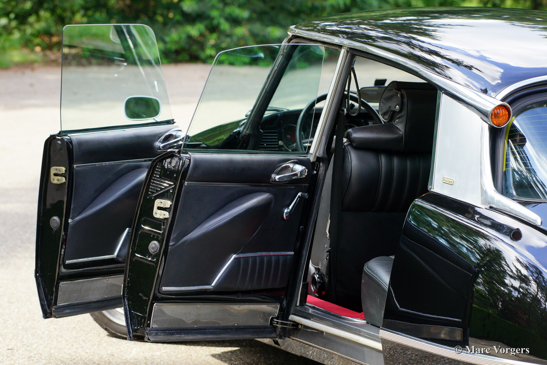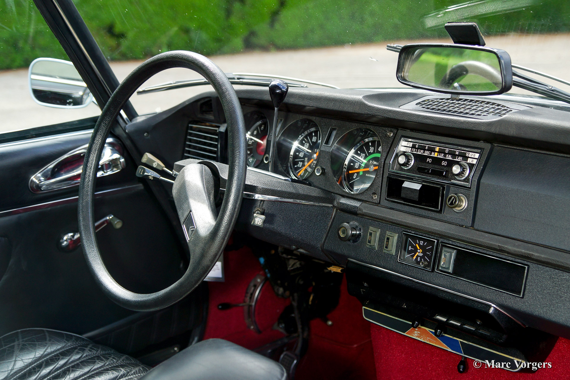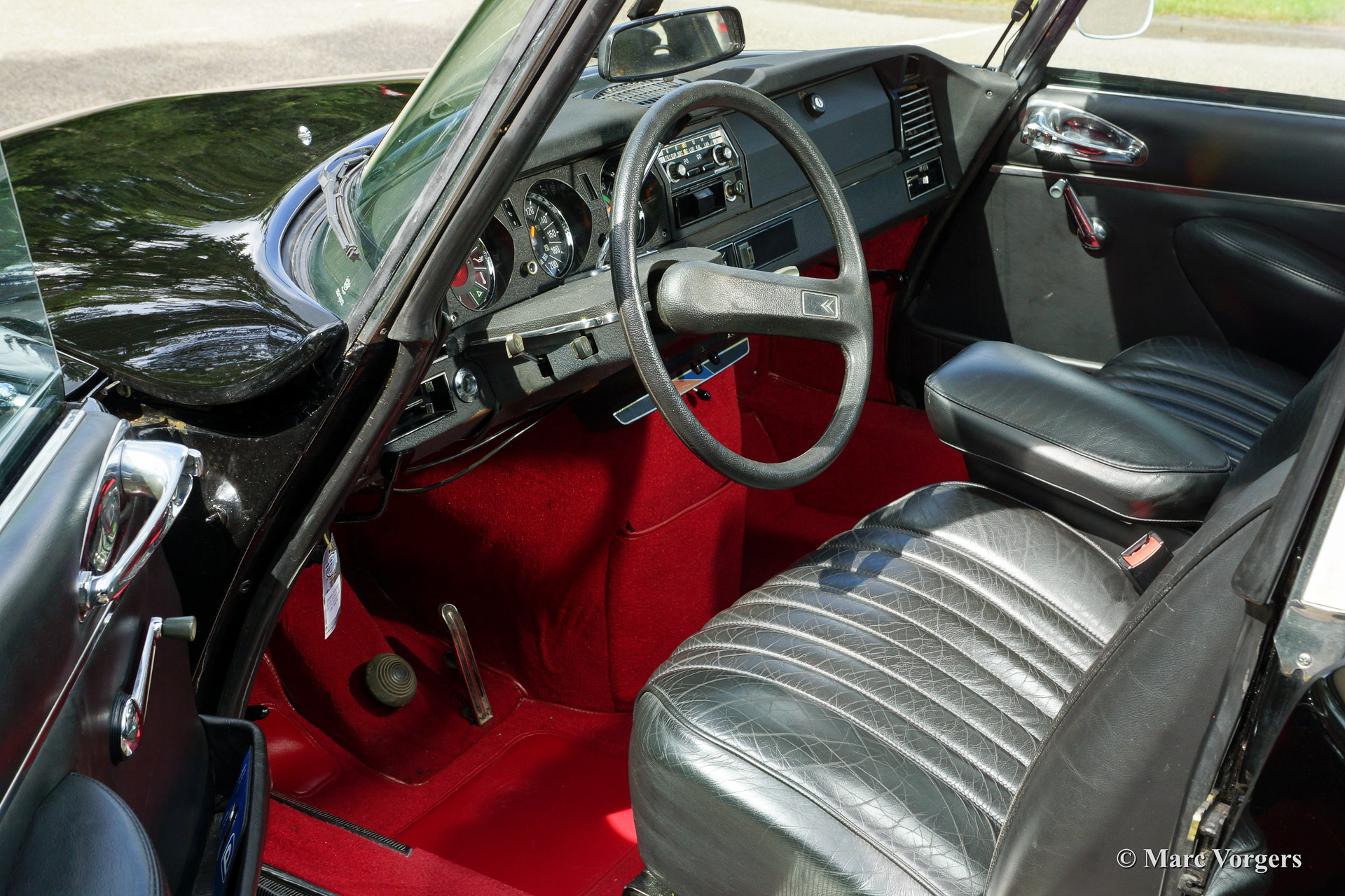 Citroen DS 23 Pallas, year 1973. Colour black with a black leather interior and red carpet. This fabulous Citroen DS 23 is a genuine Pallas featuring the magnificent round gauges and a 4-speed semi-automatic gearbox. The automobile was imported from France to the Netherlands in the year 1997. In the year 2008 this fine DS 23 Pallas was restored by a Dutch Citroën specialist. In the works also several body panels were restored / renewed like the doors and the wings. Photo's of the restoration are present. The 4-speed semi-automatic gearbox is a sheer delight complementing the ultra comfortable driving experience. The car is fitted with new classic Michelin tyres.
