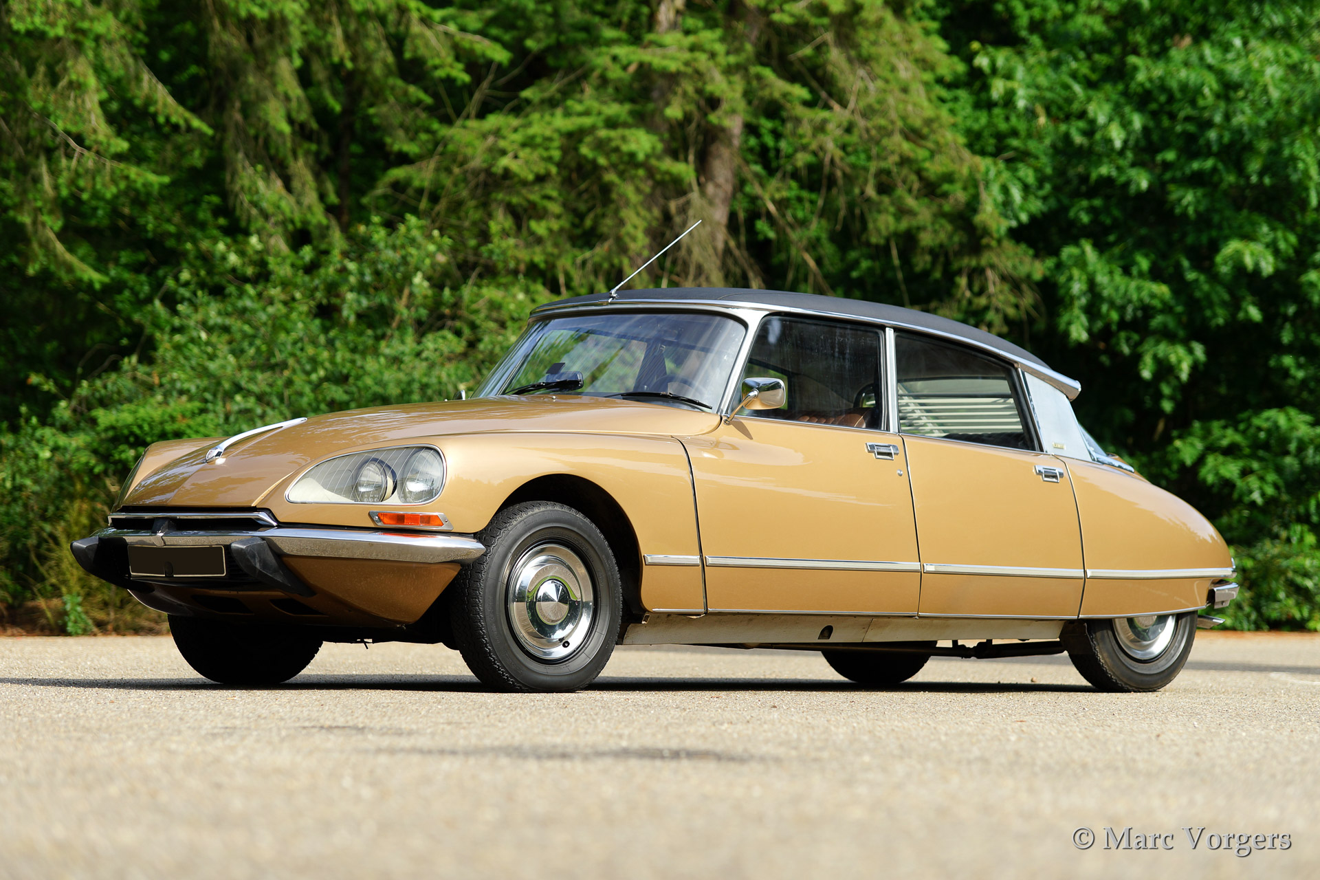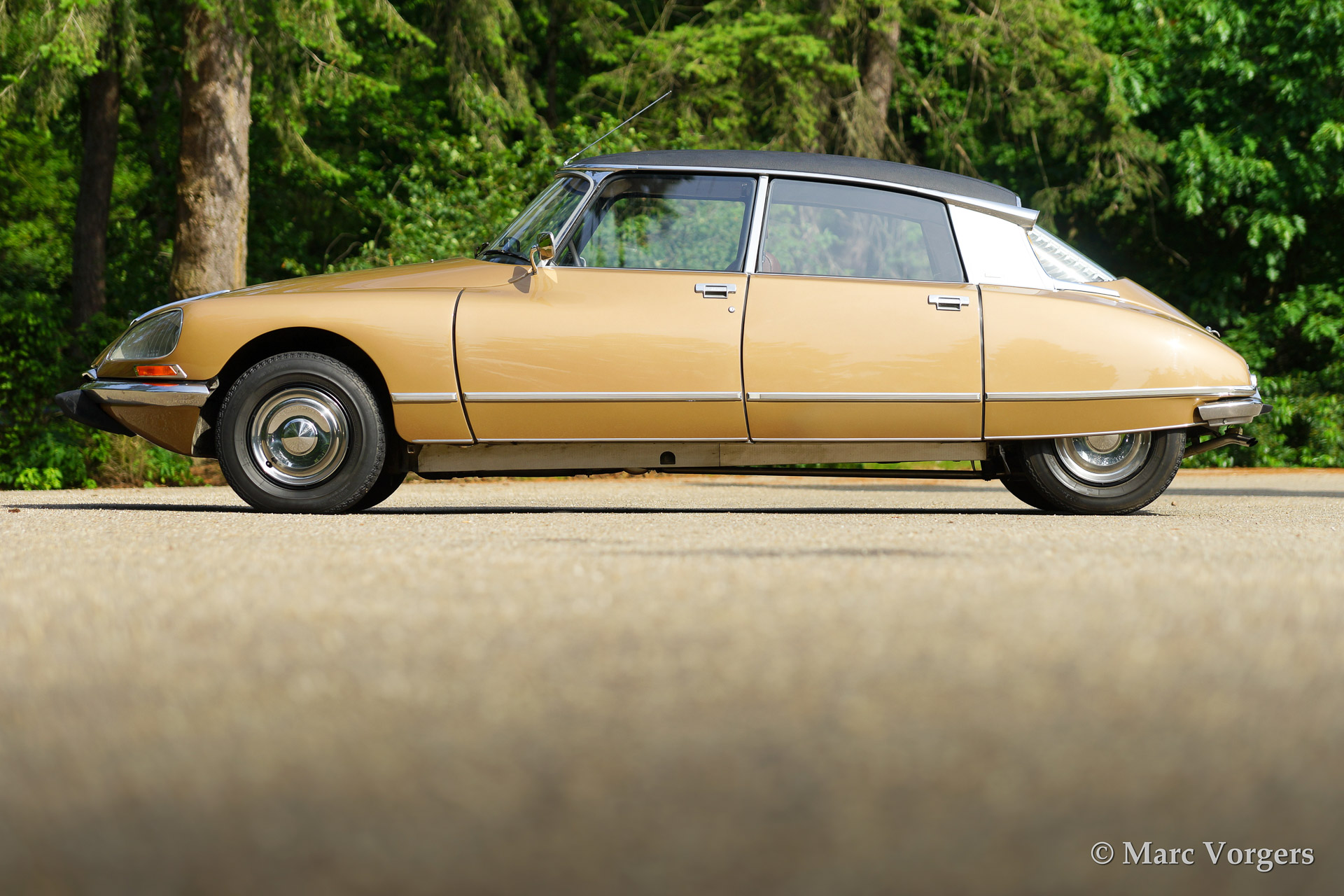 Citroen DS 23 Pallas, year 1974. Colour bronze metallic with a black vinyl roof top. Brown full leather interior and brown carpet. This fabulous Citroen DS 23 is a genuine Pallas featuring the magnificent round gauges and a semi-automatic gearbox. This DS shows all original details.