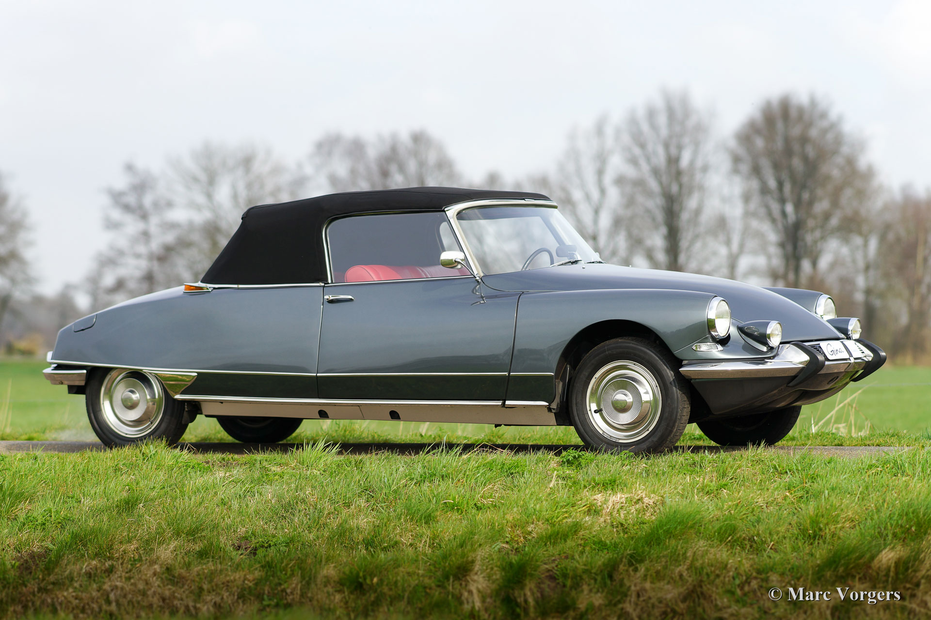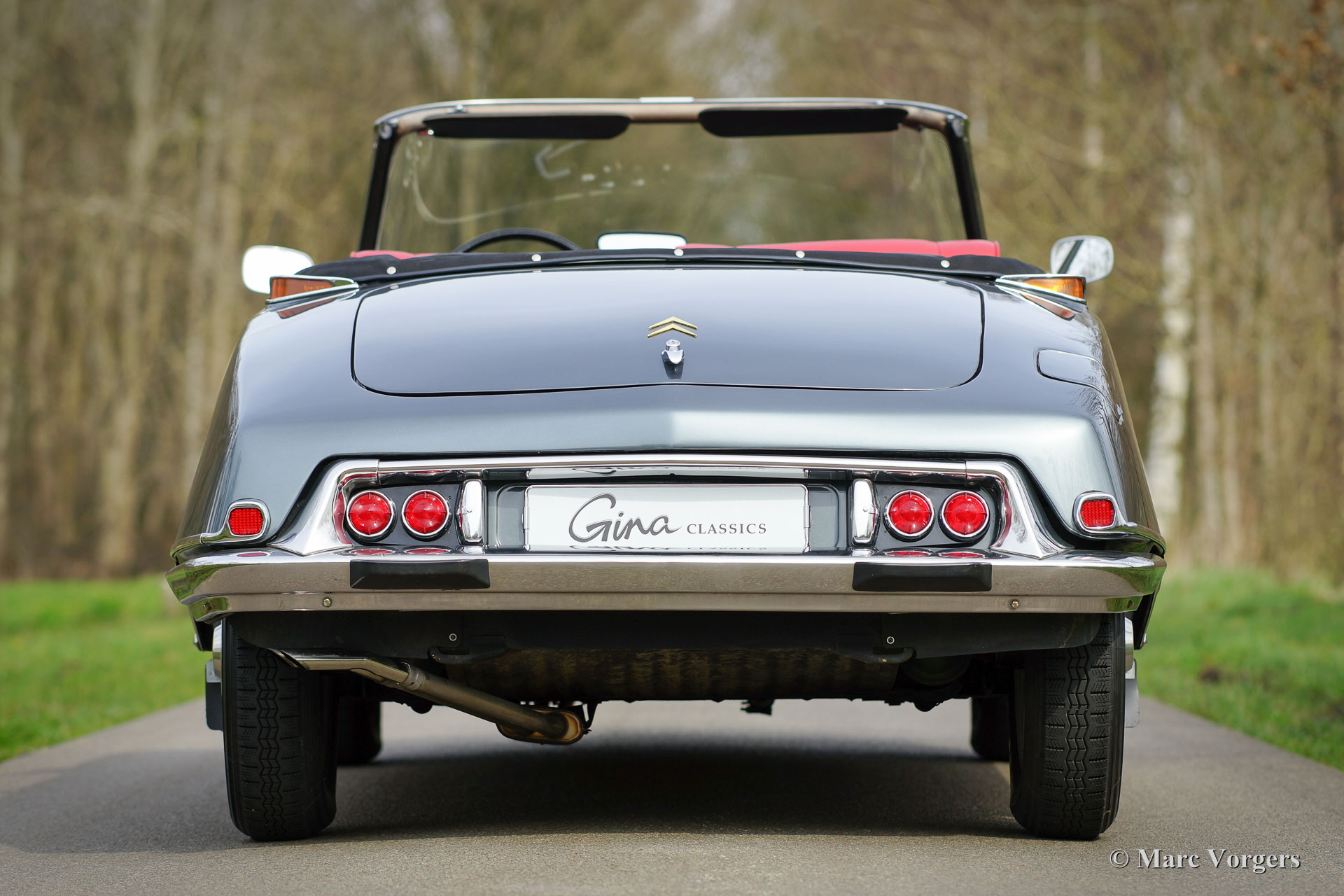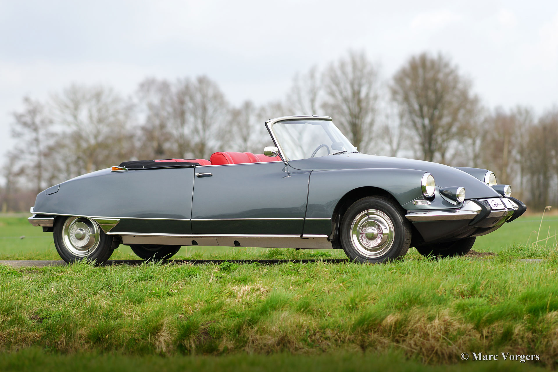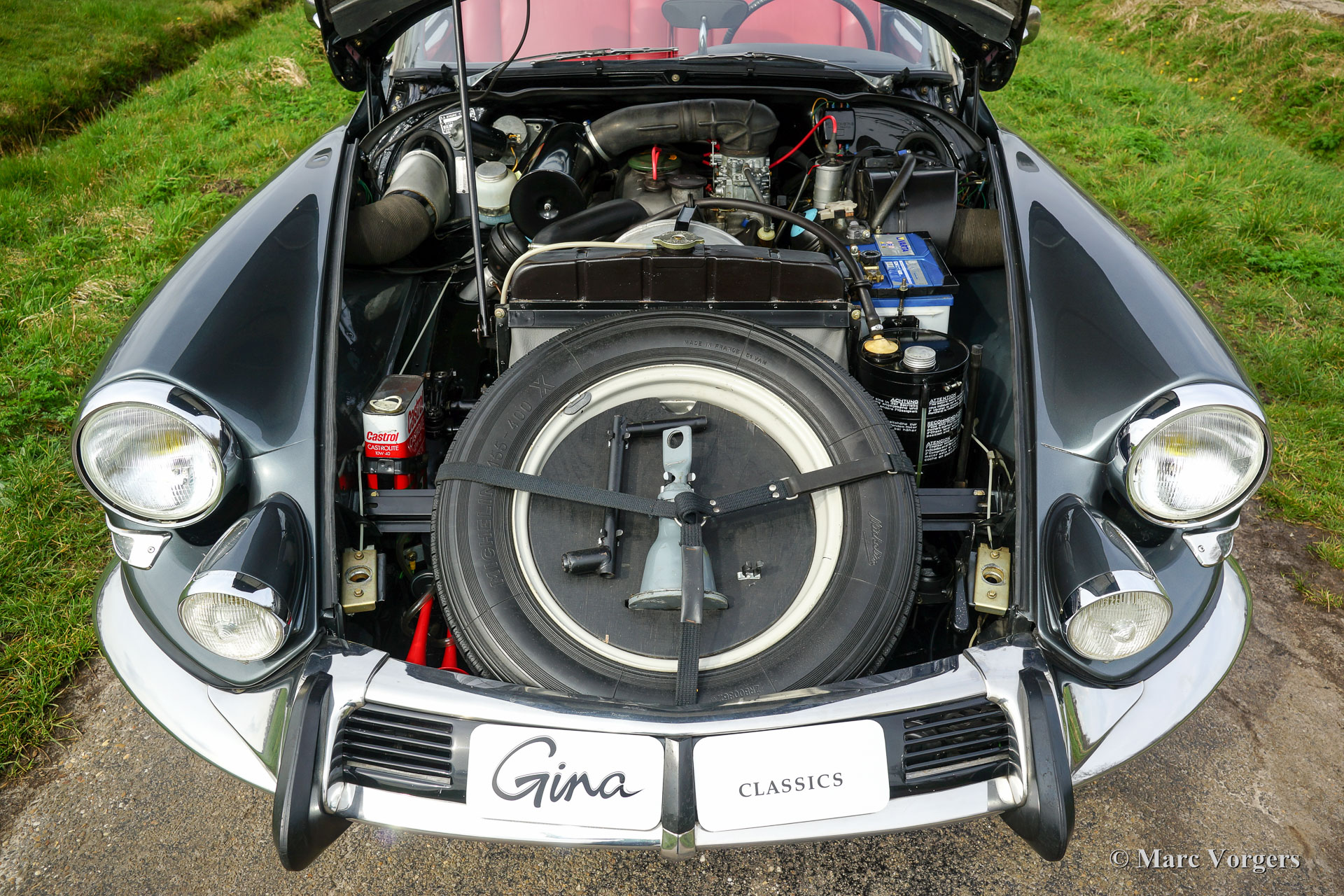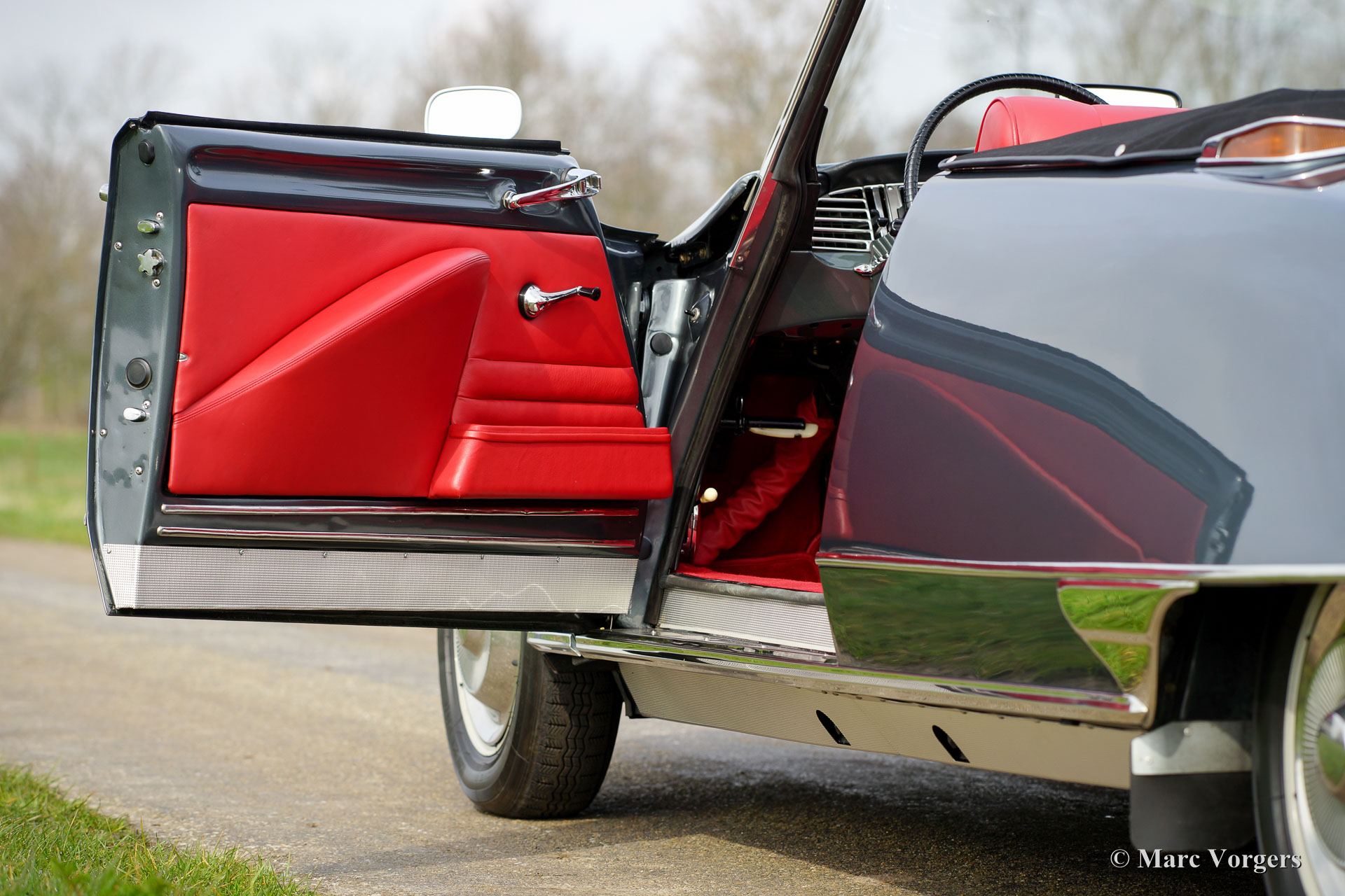 Citroën DS19 cabriolet, year 1963. Colour dark grey metallic with a red leather interior and red carpet to match. Black convertible top and hood cover. This fine Citroën is a beautiful and perfect replica of a Citroën DS19 cabriolet ‘Usine’; almost undistinguishable from factory original.