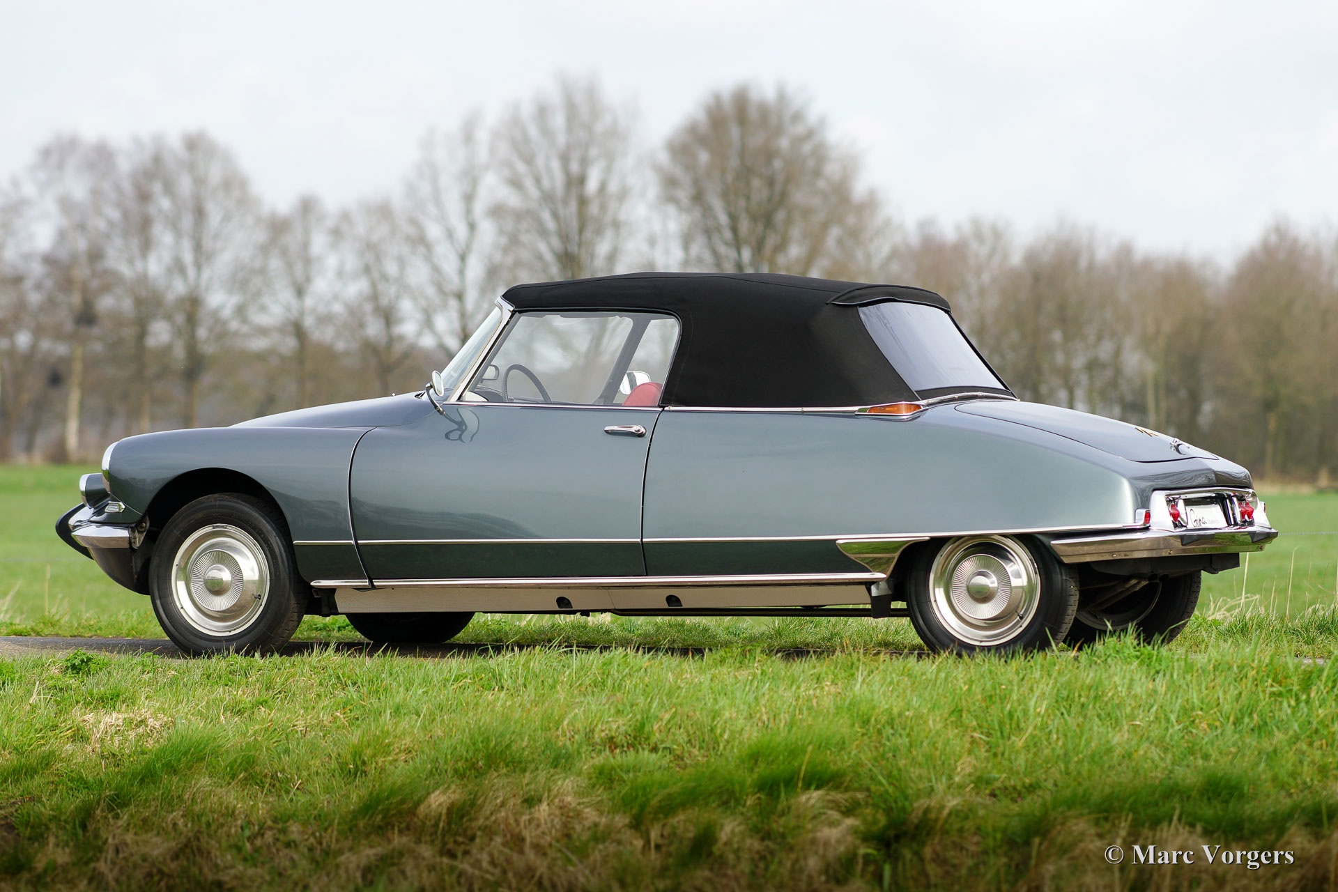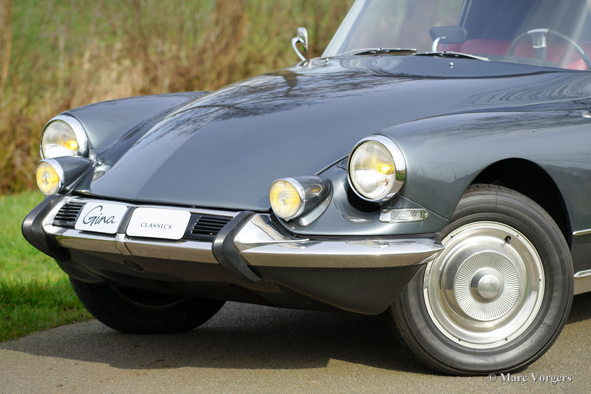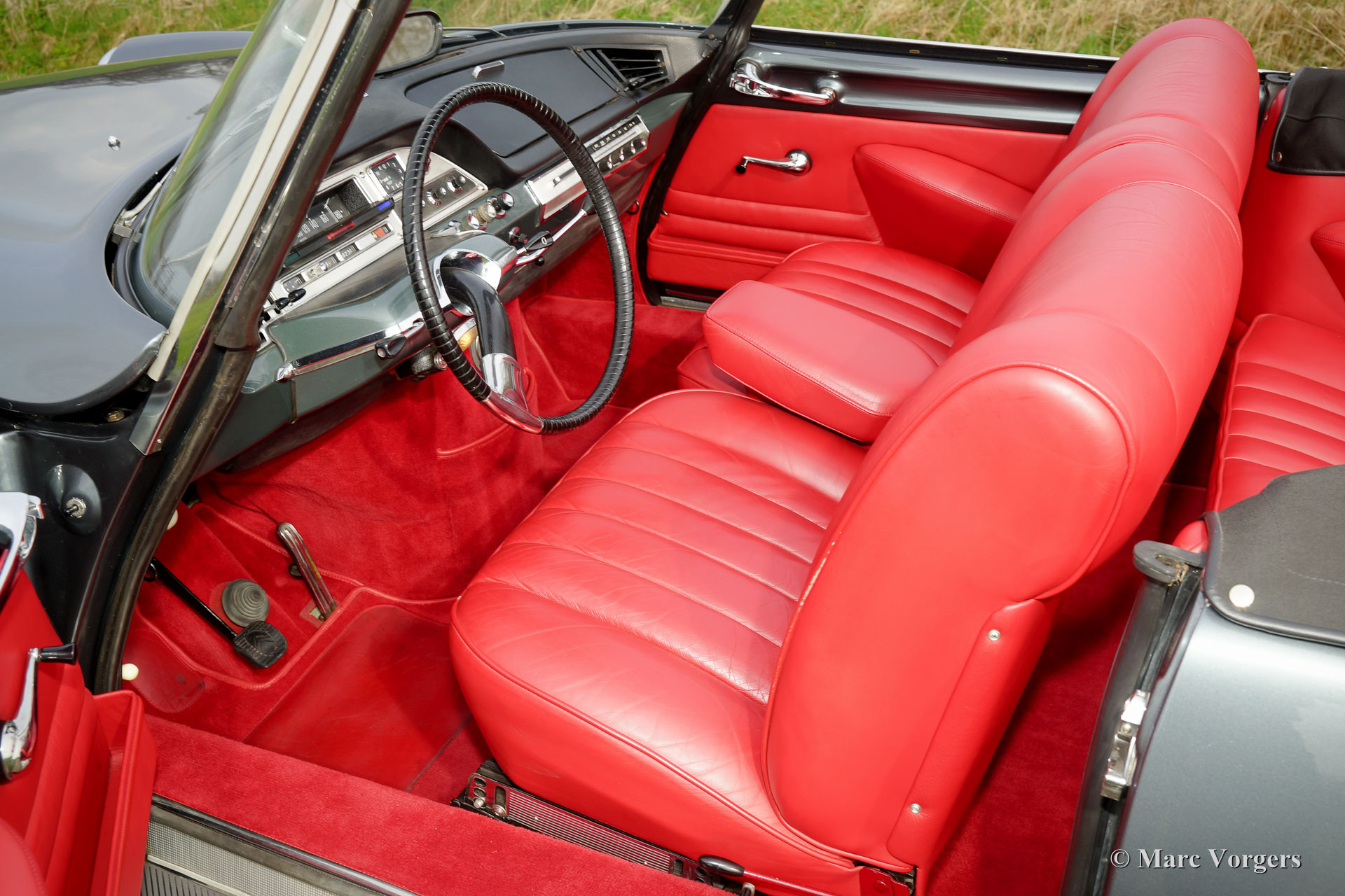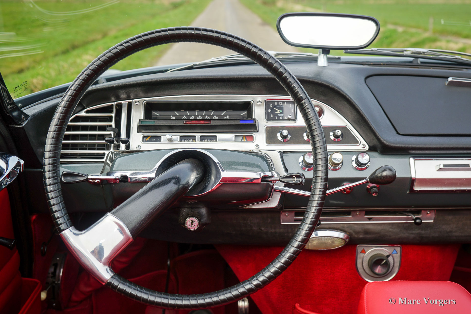 Citroën DS19 cabriolet, year 1963. Colour dark grey metallic with a red leather interior and red carpet to match. Black convertible top and hood cover. This fine Citroën is a beautiful and perfect replica of a Citroën DS19 cabriolet ‘Usine’; almost undistinguishable from factory original.
