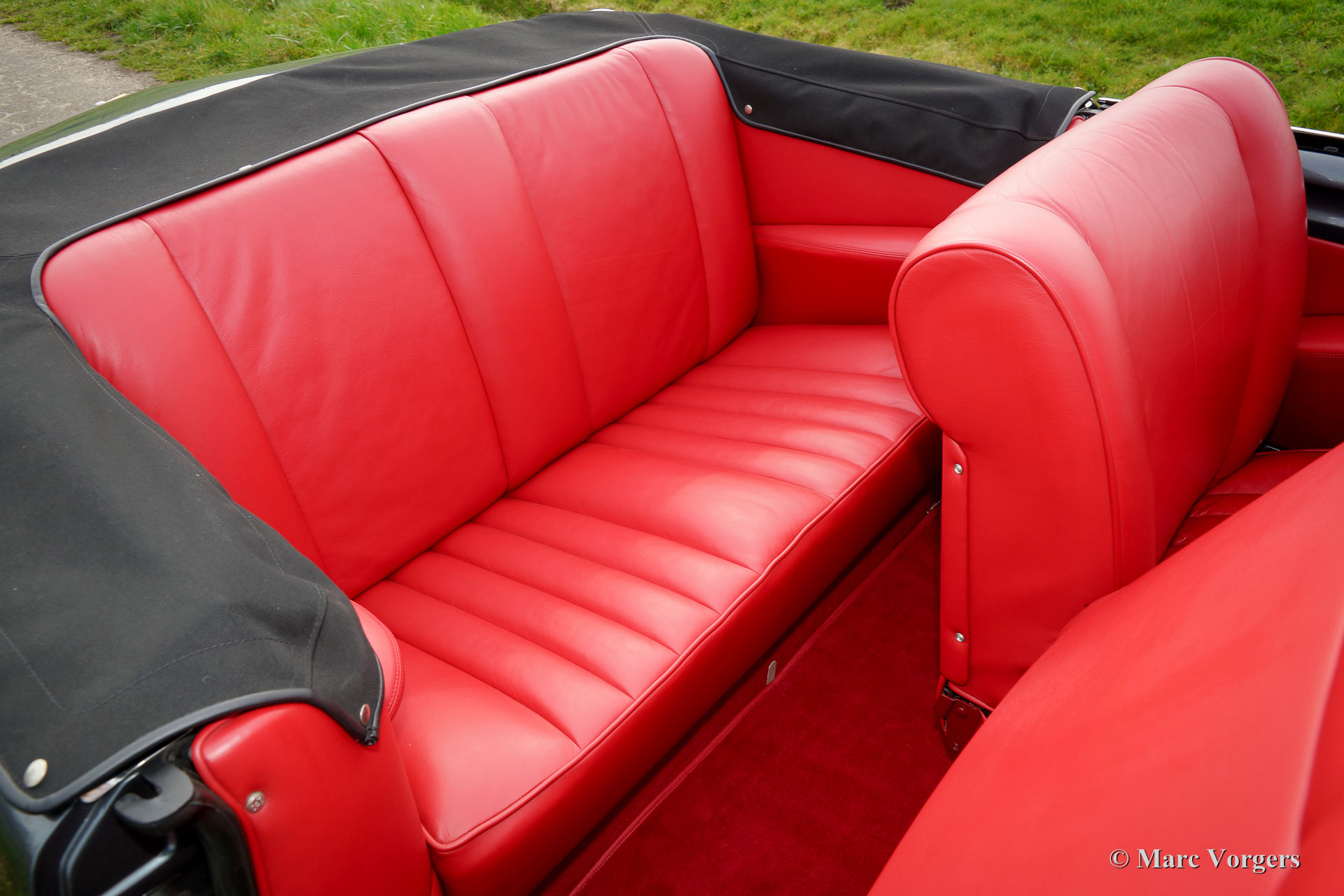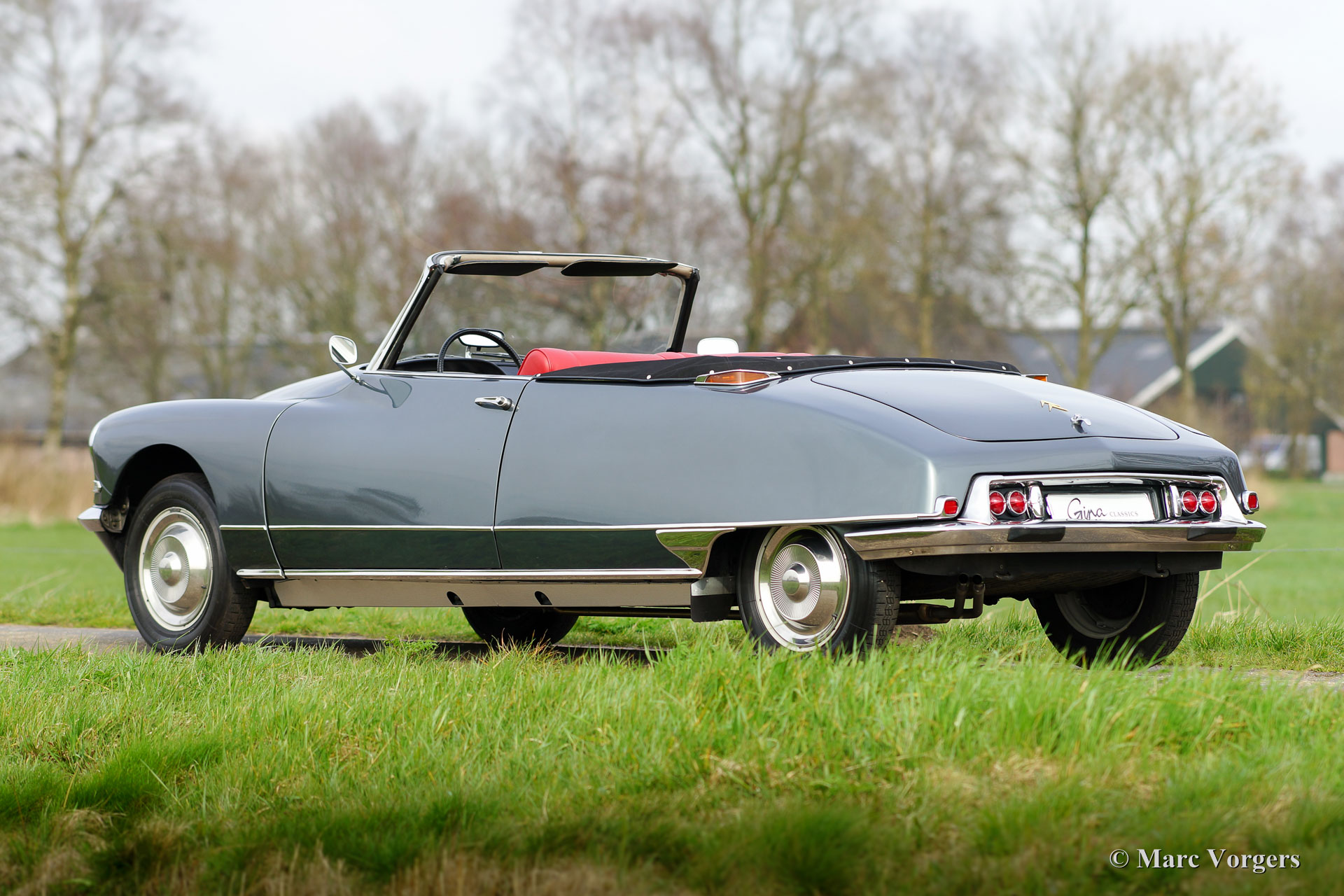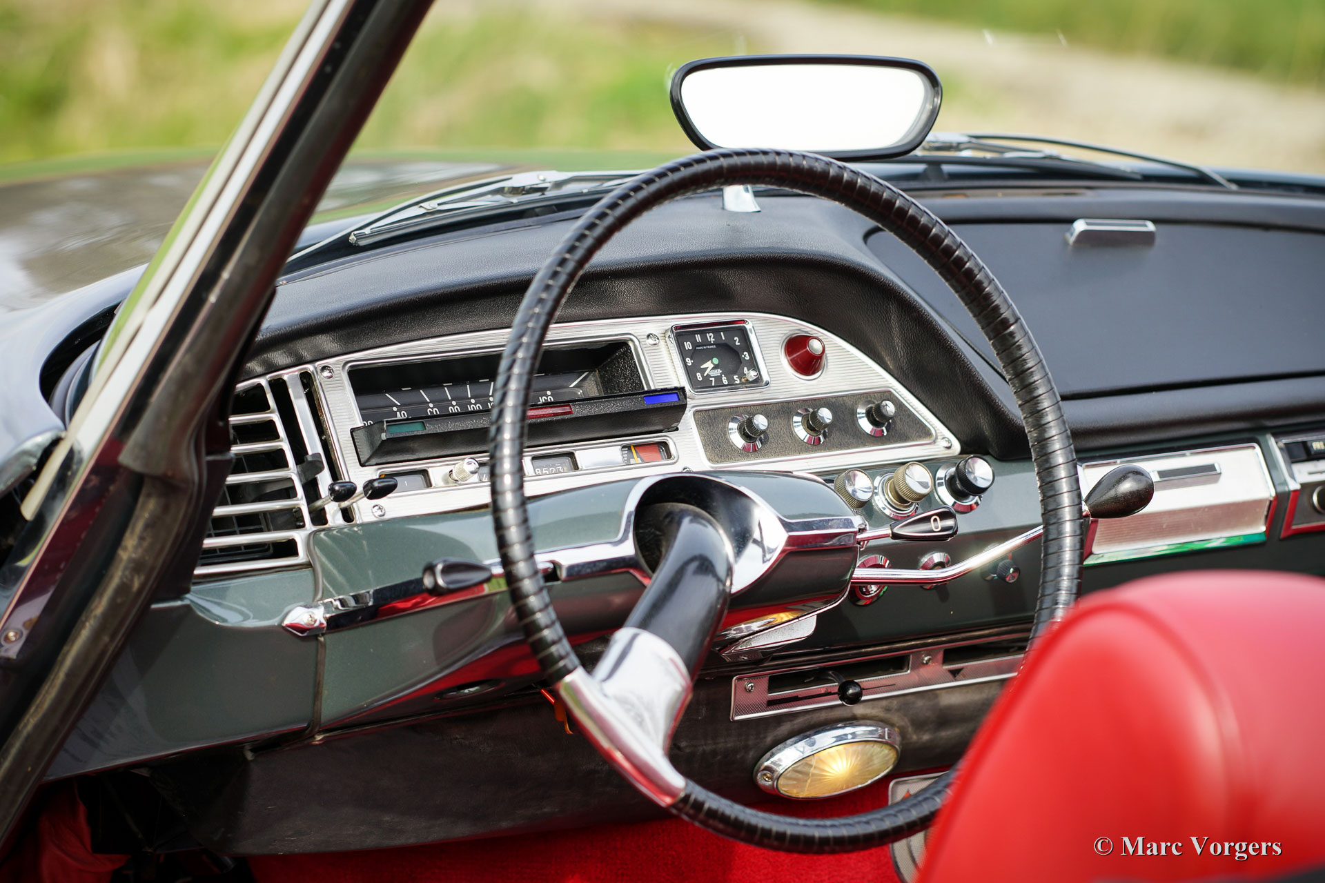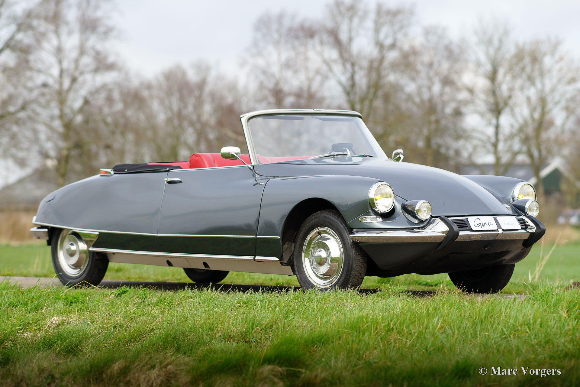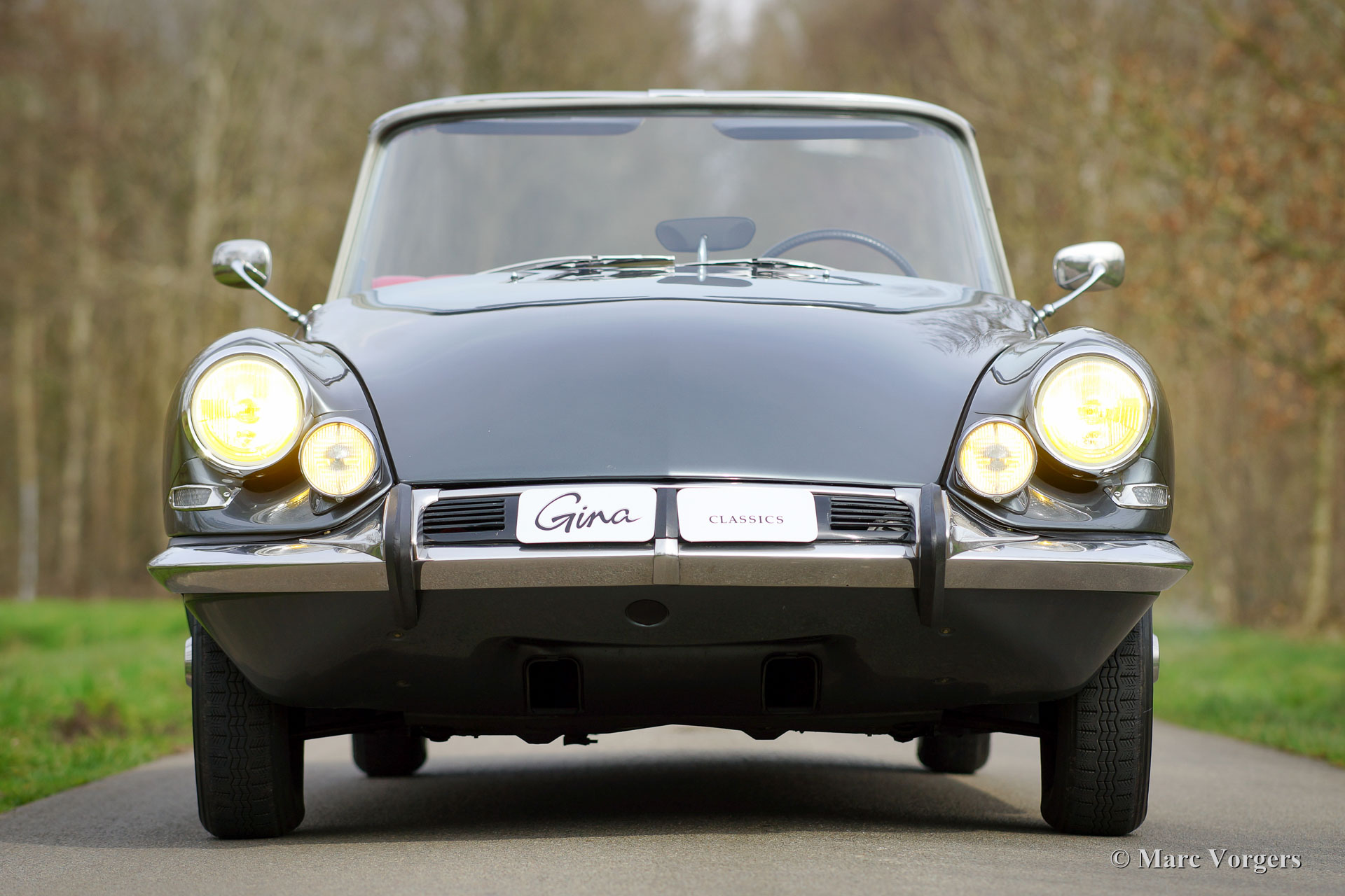 Citroën DS19 cabriolet, year 1963. Colour dark grey metallic with a red leather interior and red carpet to match. Black convertible top and hood cover. This fine Citroën is a beautiful and perfect replica of a Citroën DS19 cabriolet ‘Usine’; almost undistinguishable from factory original.