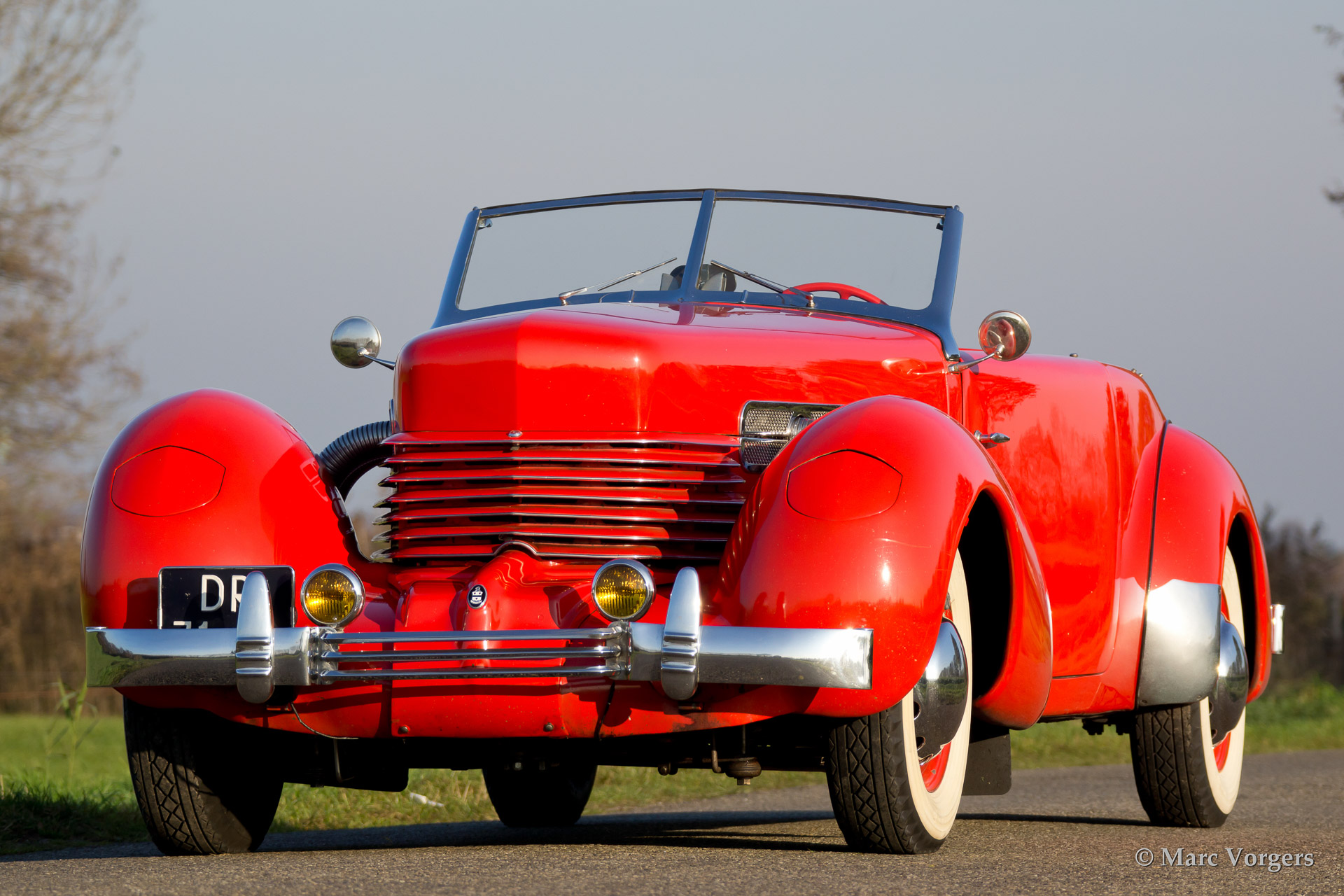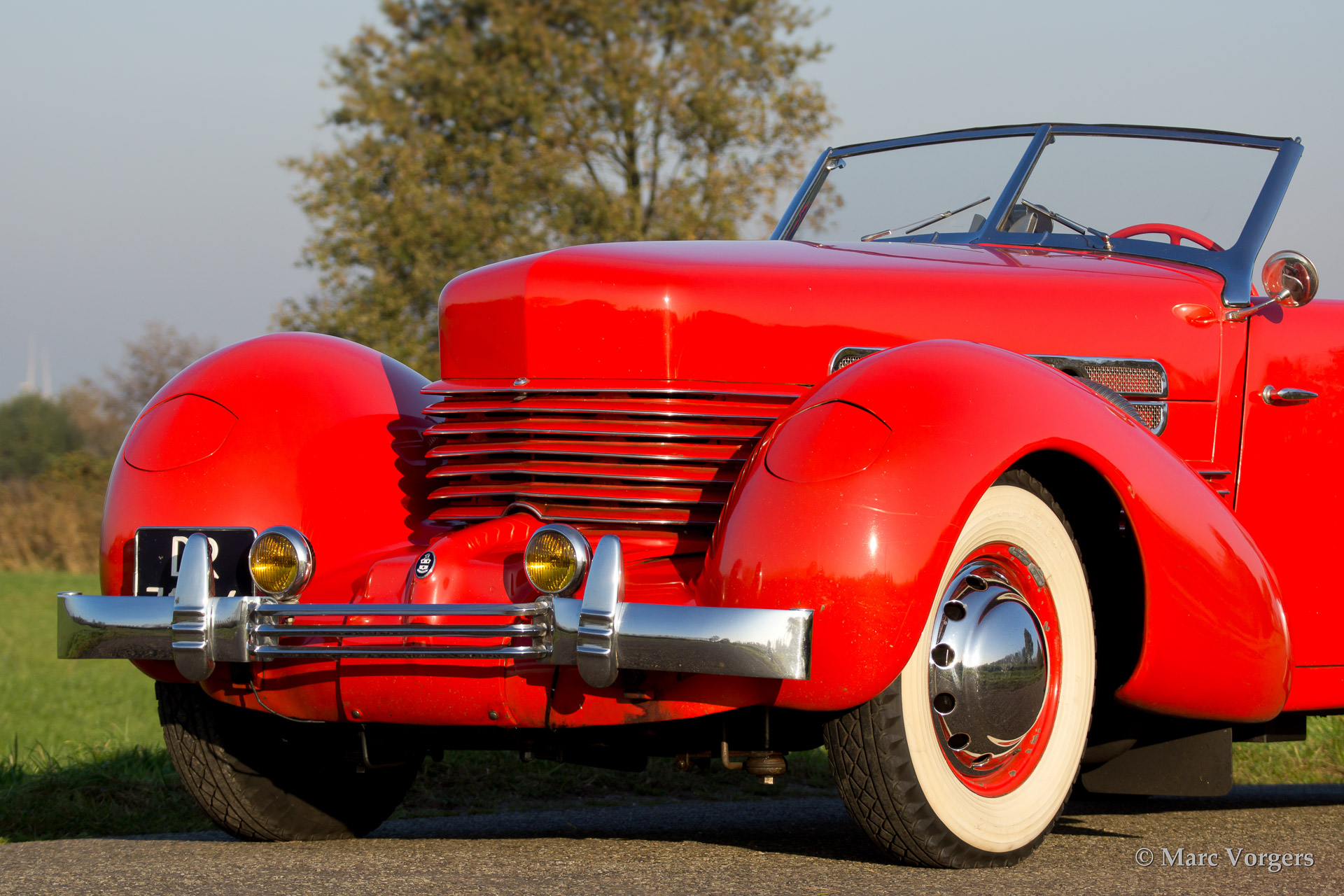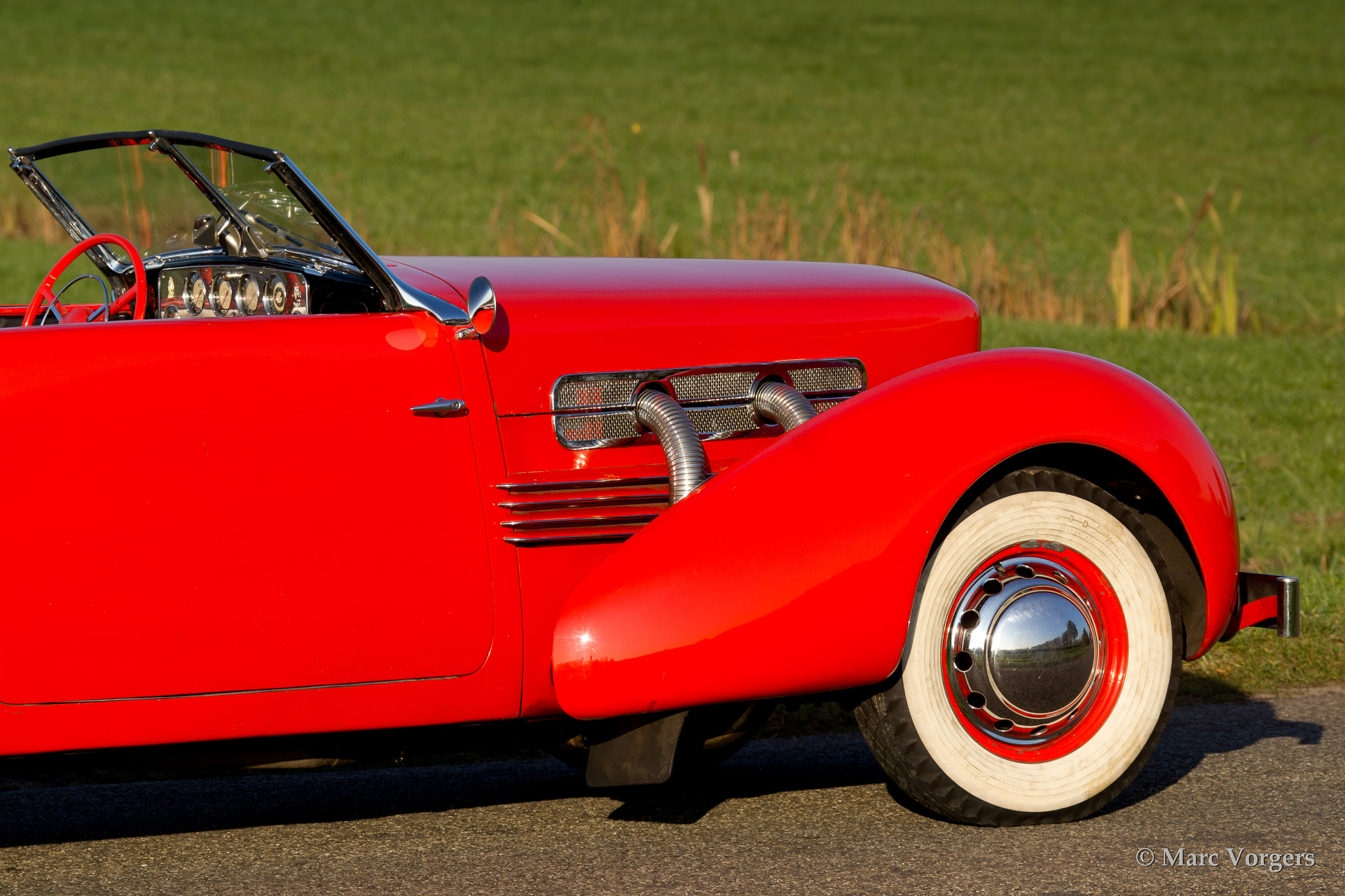 Cord 812 SC Phaeton, 1937. Colour red with a black leather interior and a black hood. This extremely beautiful and very scarce Cord 812 is one of the 99 super charged Phaetons which were ever built. This stunning Gordon Buehrig design features the unique 'coffin nose' with alligator bonnet and wrap around grille. Manually retractable head lights and minimalist details compliment the purity of the fluent designed Phaeton bodywork. The interior features a wonderful Aircraft style dashboard. The automobile was sold new in the USA and was imported to the Netherlands in the year 1997.