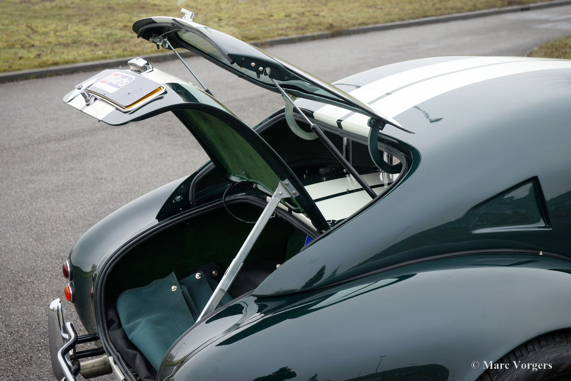 Dax Cobra Tojeiro, year 1991. Colour dark green metallic with a green leather interior. Black soft-top, dark green tonneau cover and a hard-top in body colour. The Dax Cobra is inspired on the legendary AC Cobra 427 from the 1960ies. This Dax Cobra was built in the Netherlands using Jaguar suspension parts and rear-axle and a Chevrolet 5 litre V8 engine. Fitted is an automatic gearbox with B&M shifter. This Dax Cobra Tojeiro is an impressive motorcar with its dark green paint, white striping and the chrome wire wheels. To ‘beef up’ the picture even more the car comes with a hard-top which looks magnificent! The car is fitted with a ‘Le Mans’ style quick filler petrol cap, 4-point safety harnesses, a sports steering wheel with wood rim, a roll-bar, two chrome wing mirrors, Perspex wind-deflectors (wind wings) and sun visors. The car comes documented with service invoices. This is an impressive Cobra with a lusty V8 sound track!