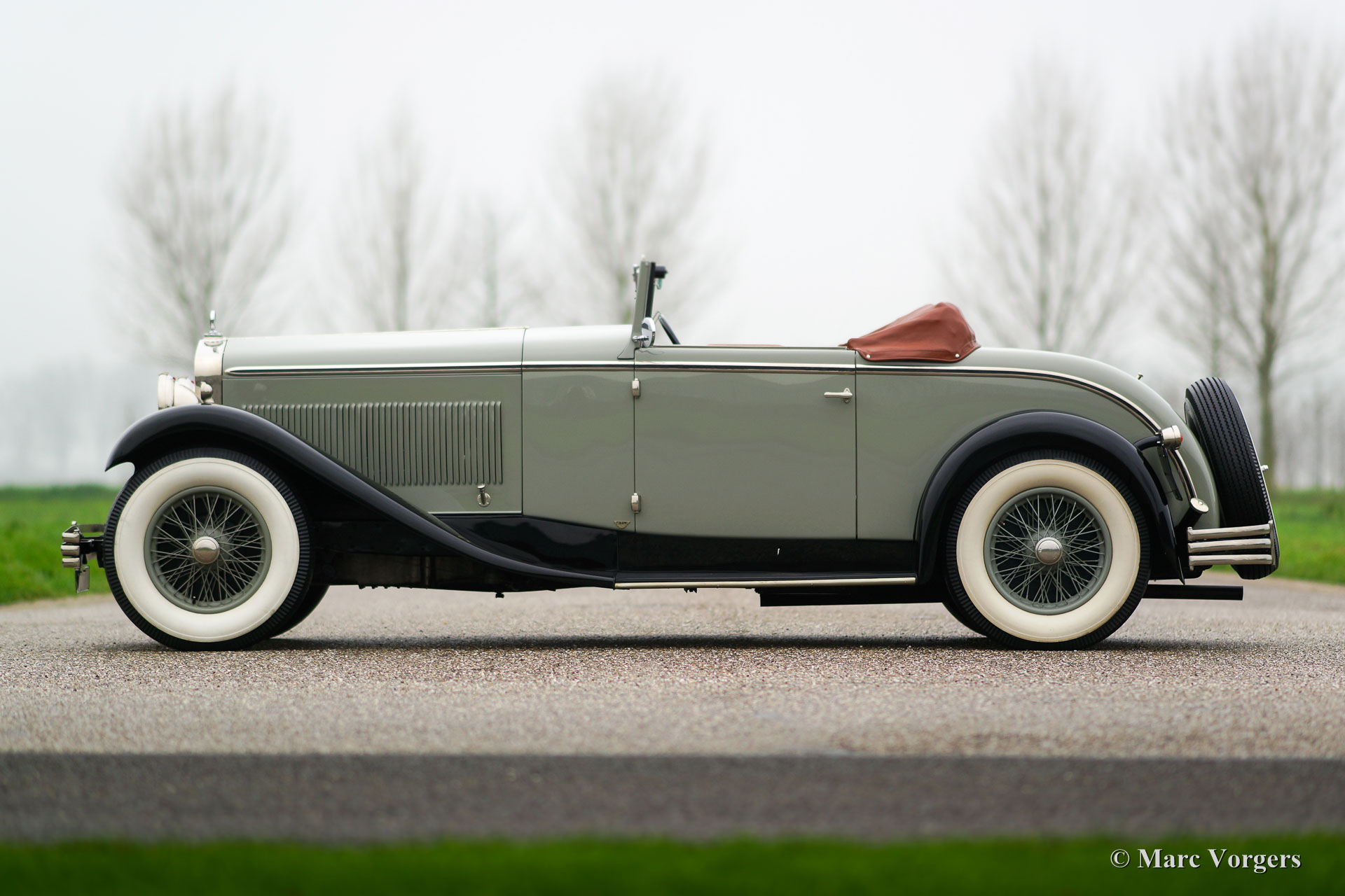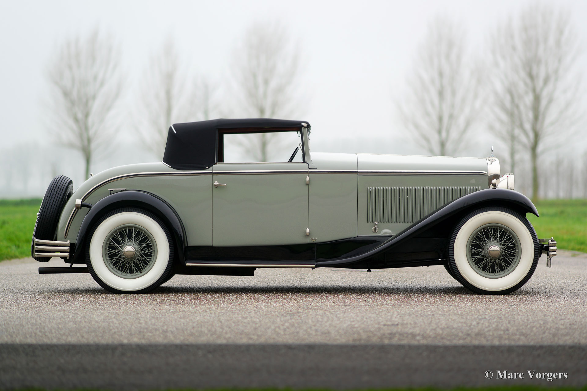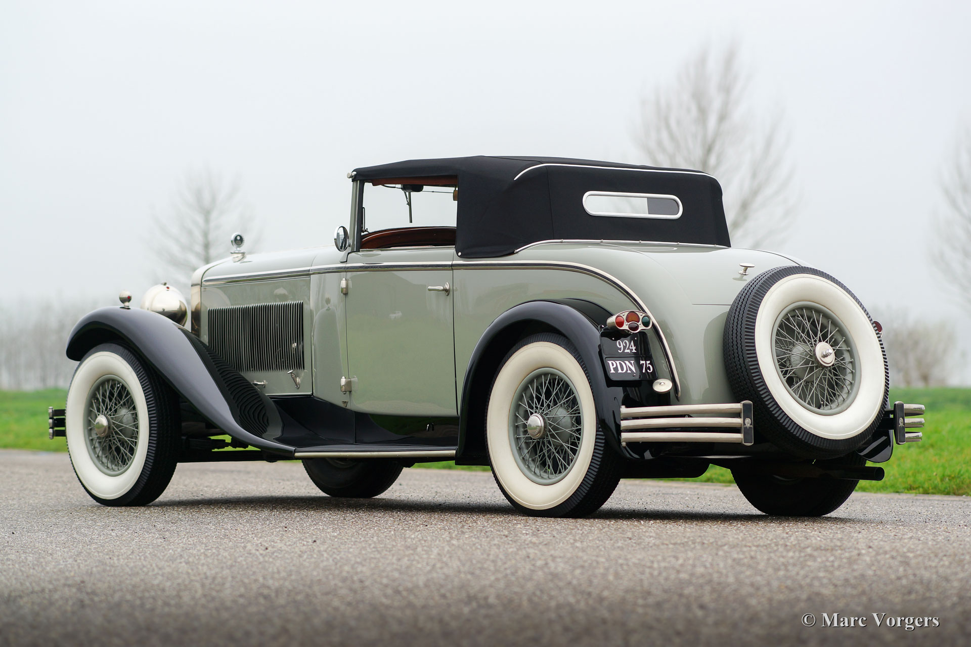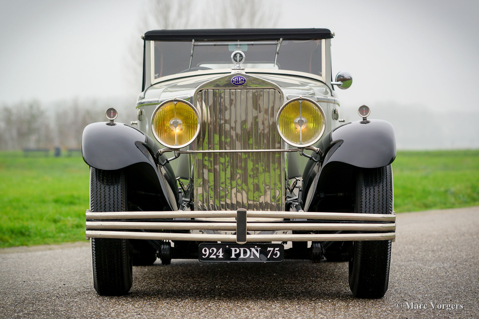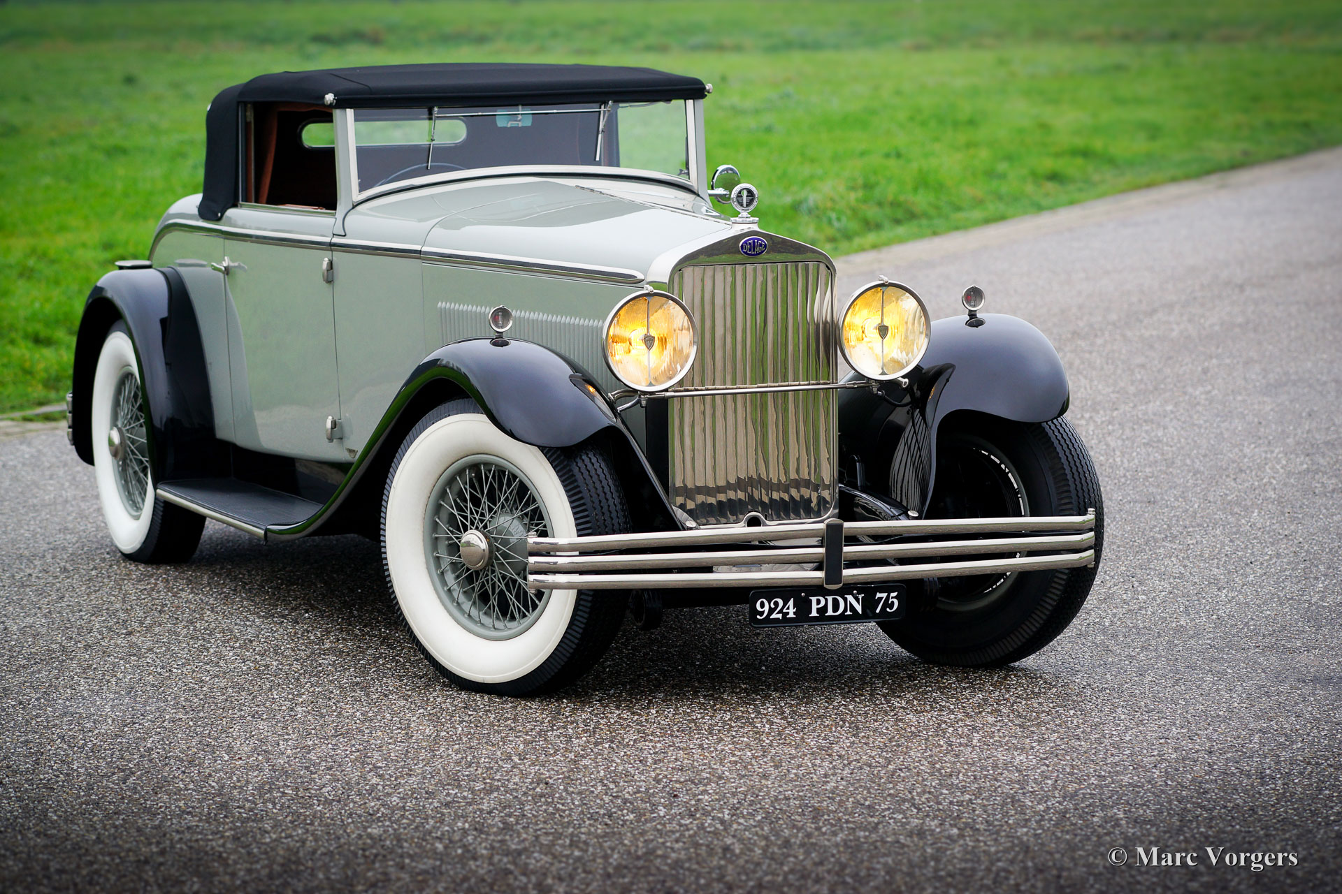 Delage D8 series C, year 1930. Colour grey with a hint of green (grey/green) combined with black wings and light green wire wheels. Cognac-brown leather interior and carpet to match. Black convertible-top and a cognac-brown hood-cover. This incredibly stylish, elegant and rare Delage D8 has chassis number 3378X and the automobile is fitted with breath-taking Figoni bodywork. The Delage D8 features a smooth running and beautifully constructed eight-cylinder in-line engine. This top-class automobile is in concours condition! The make of Delage was one of the most highly regarded brands in the first half of the 20th century. The ‘marque’ takes price of place amongst other great constructors like Mercedes-Benz, Hispano-suiza, Alfa Romeo, Bugatti, Voisin and Delahaye. According to the Figoni archives this Delage D8 was delivered on 20 October 1930 to J. Smith & Co Ltd, the British Delage representative. According to the same archives the Delage D8 chassis was fitted with a ‘faux-cabriolet’ bodywork with the number 994. It is said that the metal ‘faux-cabriolet’ roof-top was replaced by a convertible-top at some time in the 1930’ies; a fairly regular operation in the period.
