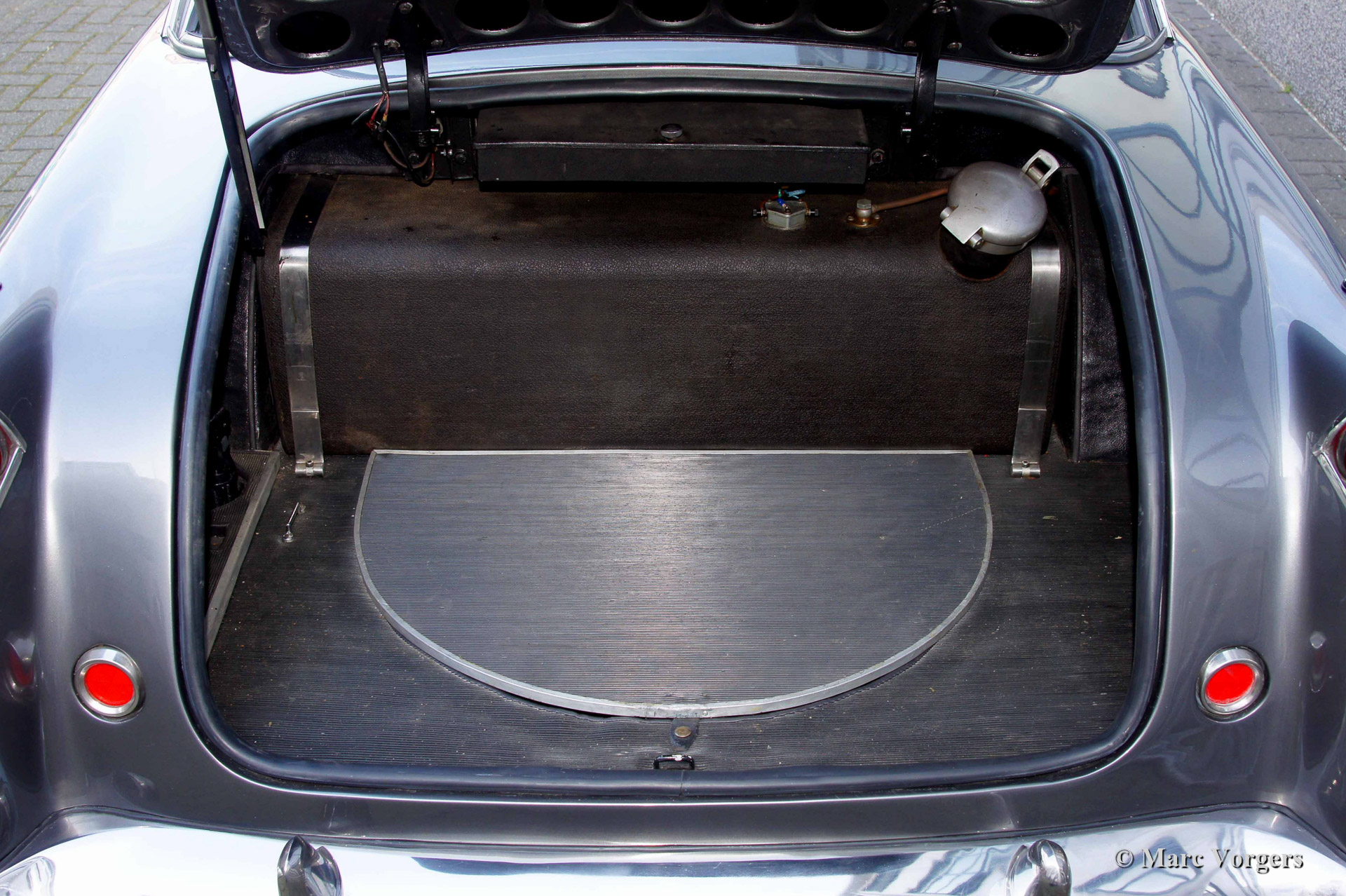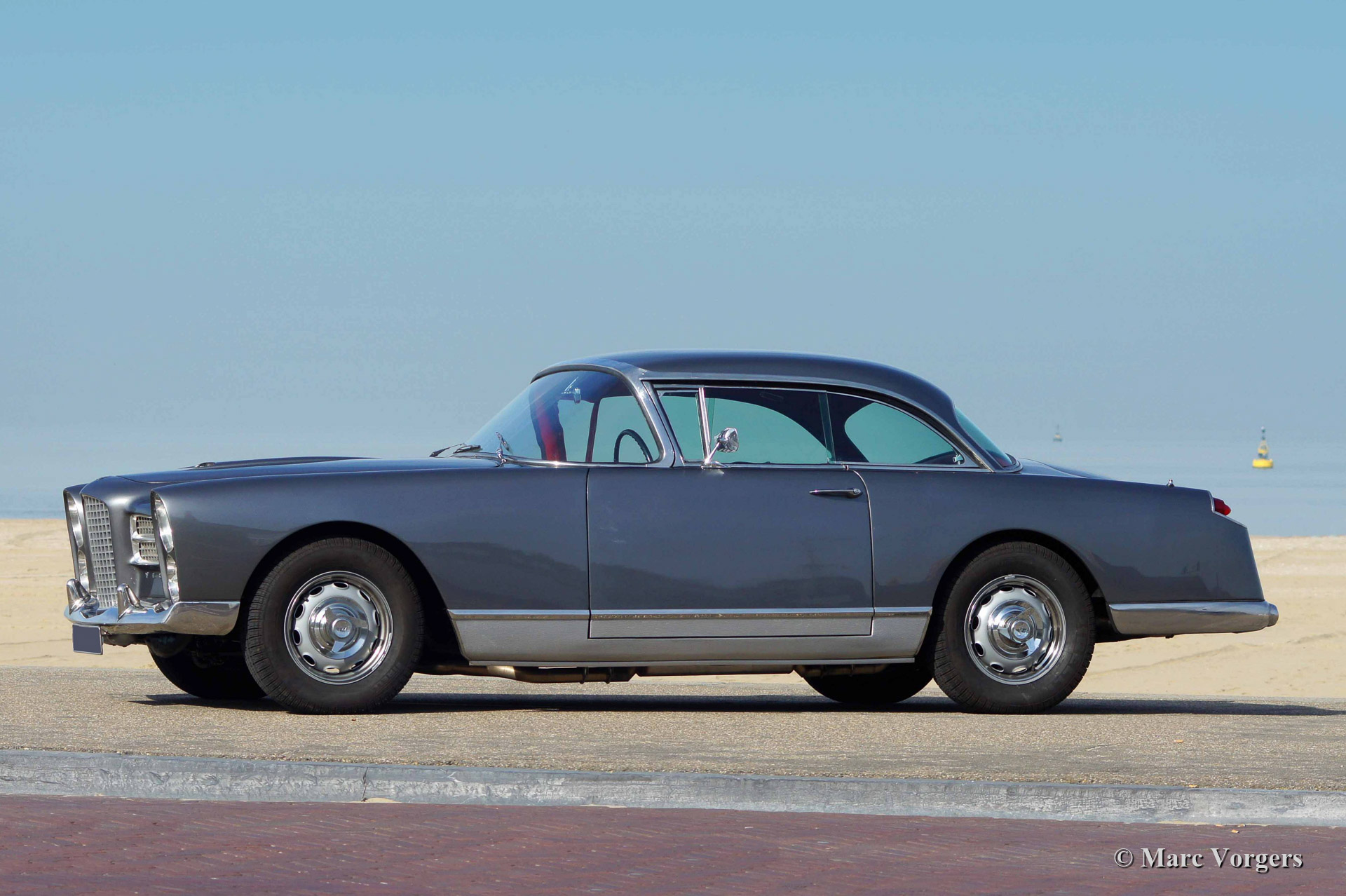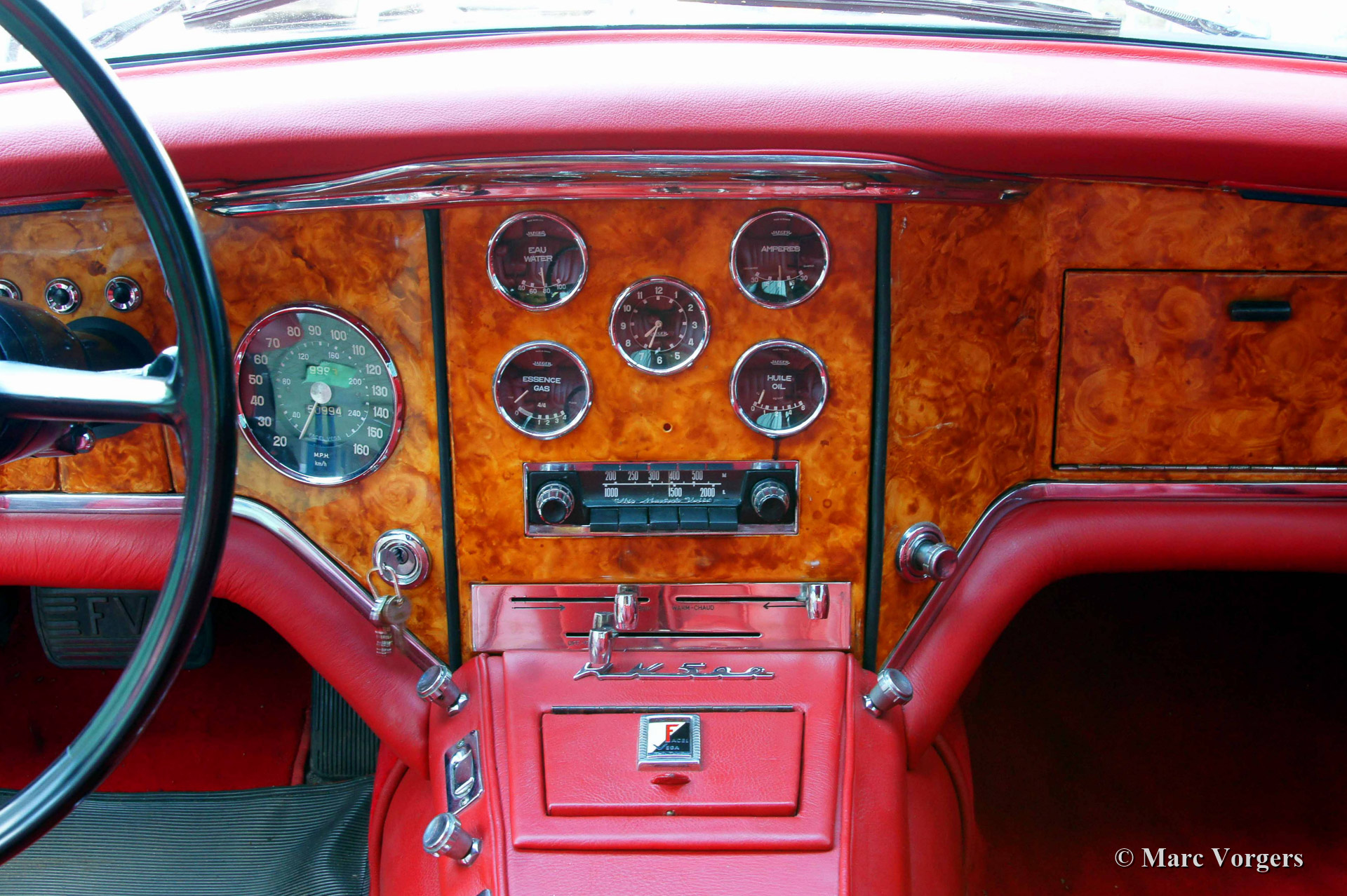The Facel Vega HK 500 is an extremely luxurious car with a gorgeous finish and beautiful details. The interior is majestic with it’s mock walnut (in the French tradition) dashboard and beautifully chromed handles and switches. The leather upholstery is of an exceptionally high quality the comfort it offers reflects this. The car comes with all of the novelties which were common on the American market at the time. The robustly built automatic windows and the gear shift with it’s stylish buttons are extremely reliable and never fail. Chrome was used sparingly on the HK 500; the bumpers, mirrors and side strips are all constructed of stainless steel. The vehicle is built upon a welded steel chassis within which the strong 6.2 Litre Chrysler V8 is mounted. The undercarriage has independent wheel suspension with coil springs at the front and a live axle leaf spring suspension system at the rear. From 1960 onwards, the HK 500 was equipped with disc brakes around. The Facel Vega HK-500 is rare, only 490 units were built of which 329 still exist.