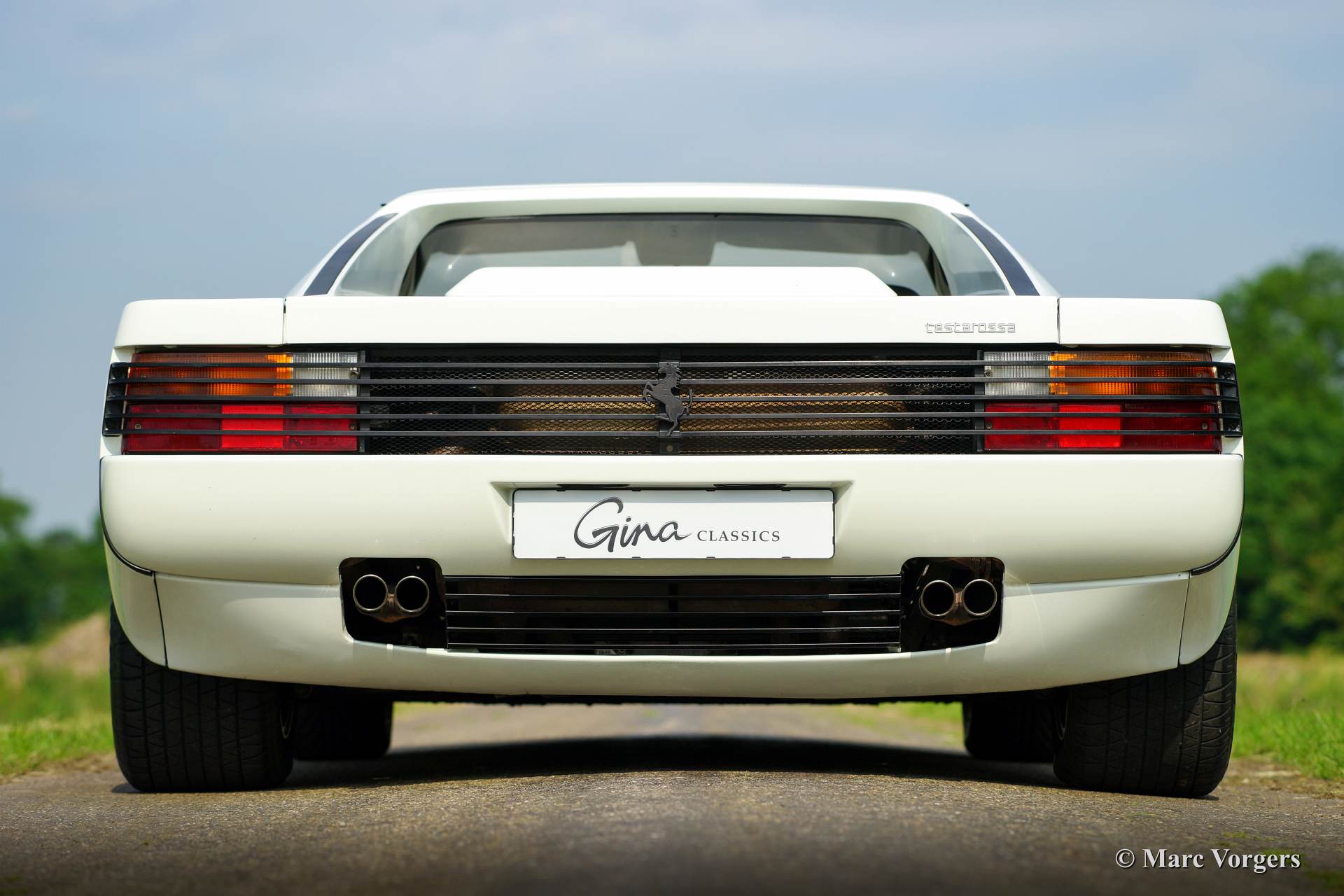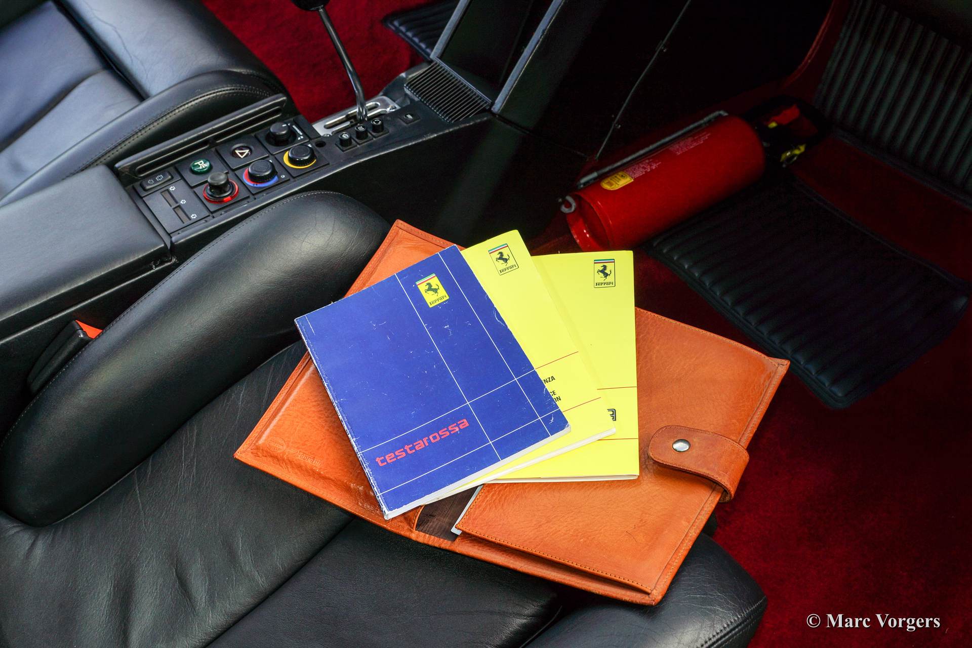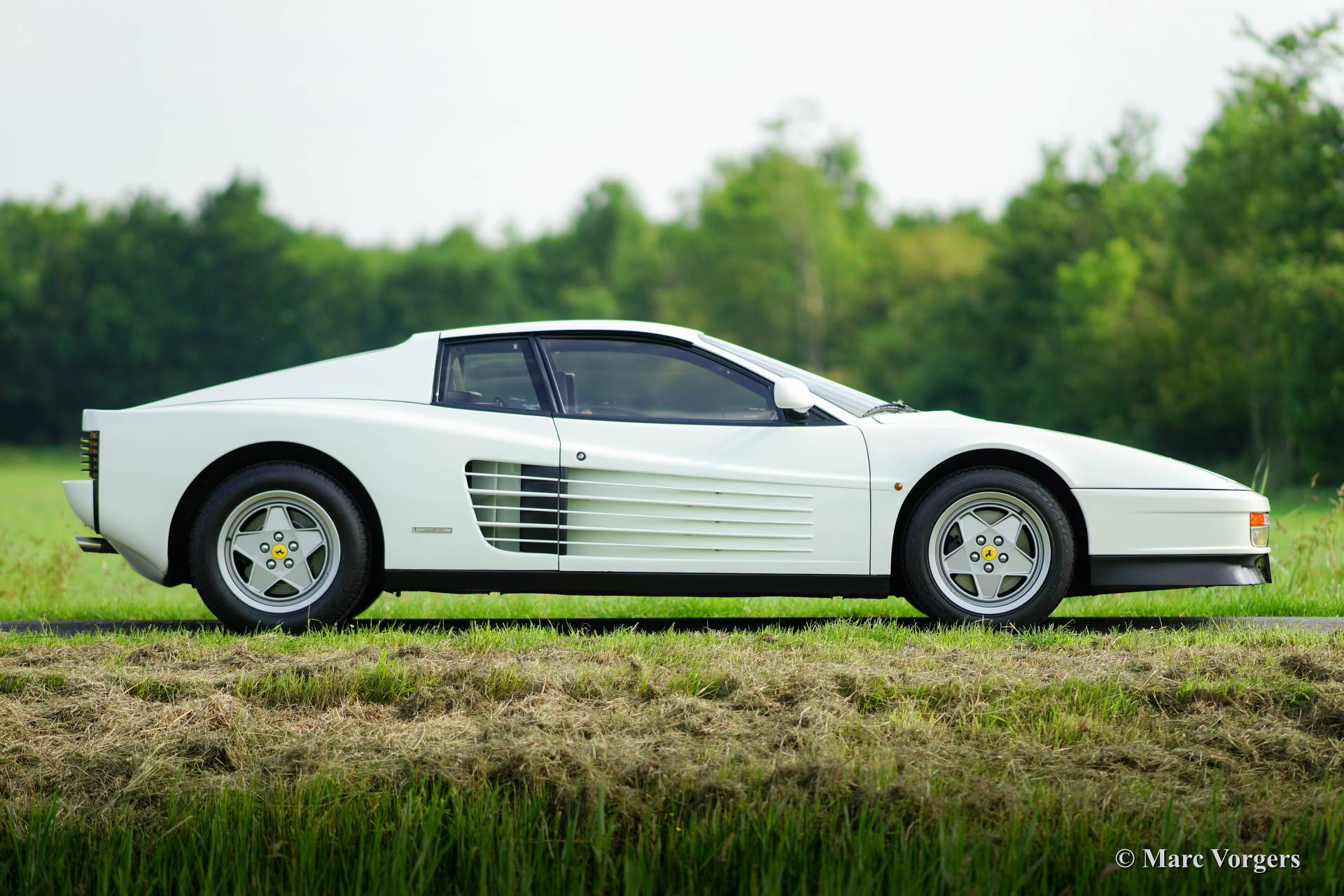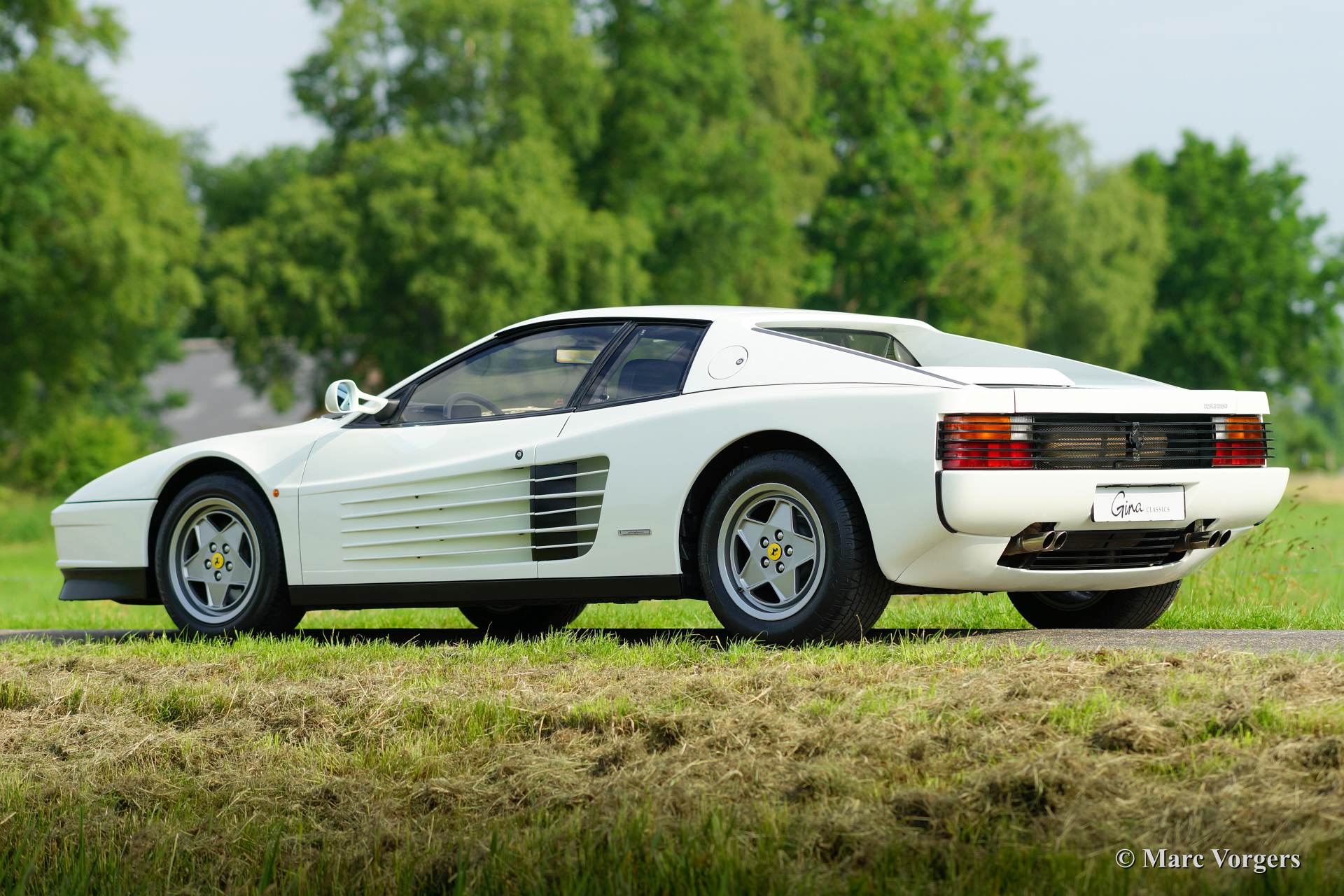 Ferrari Testarossa, year (June) 1988. Colour white (Bianco Avus, colour code FER 100) with a black leather interior and red carpet.