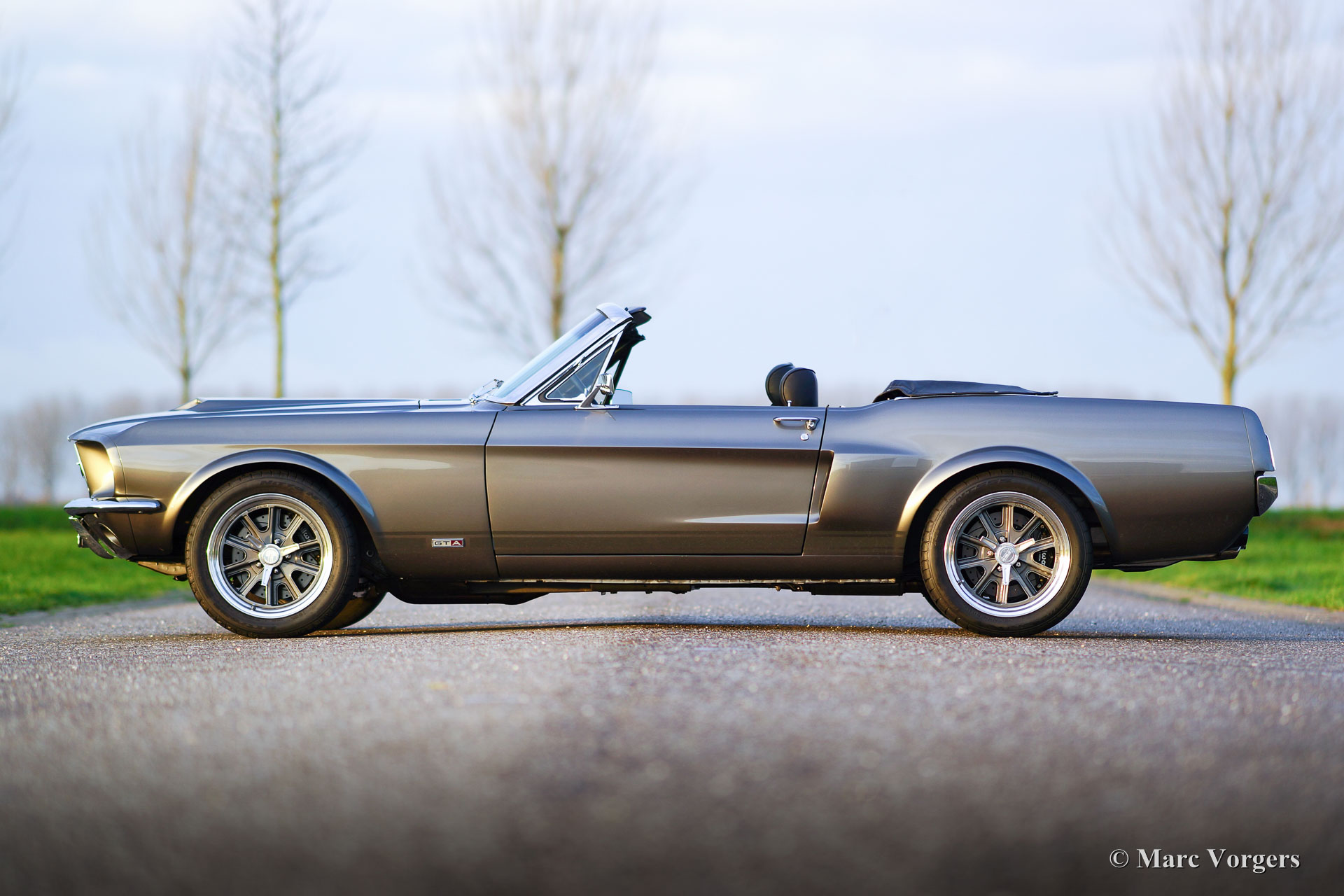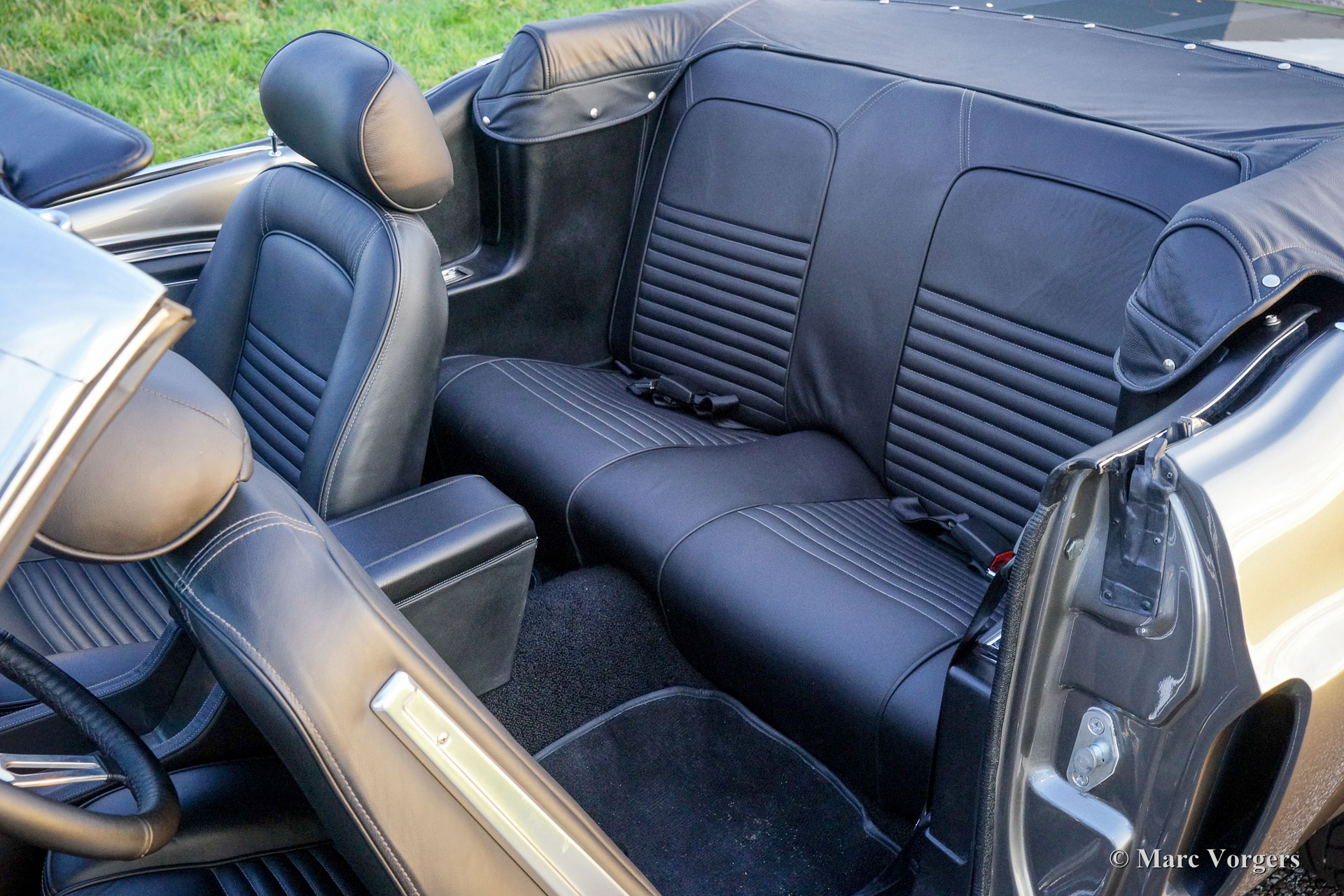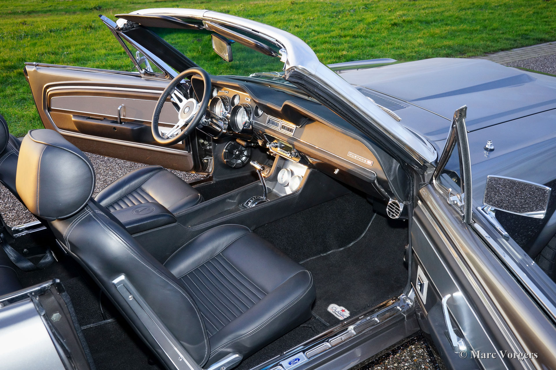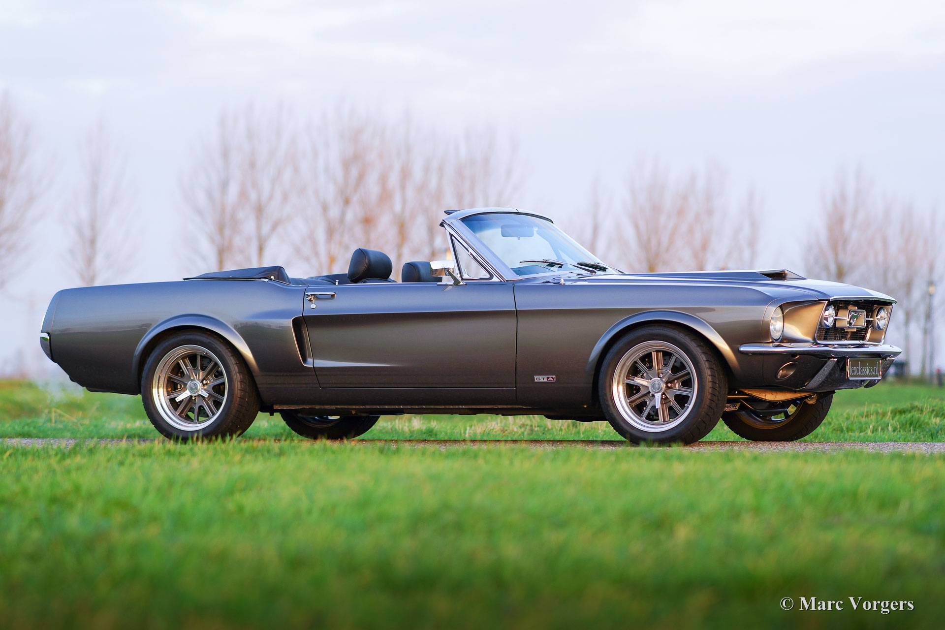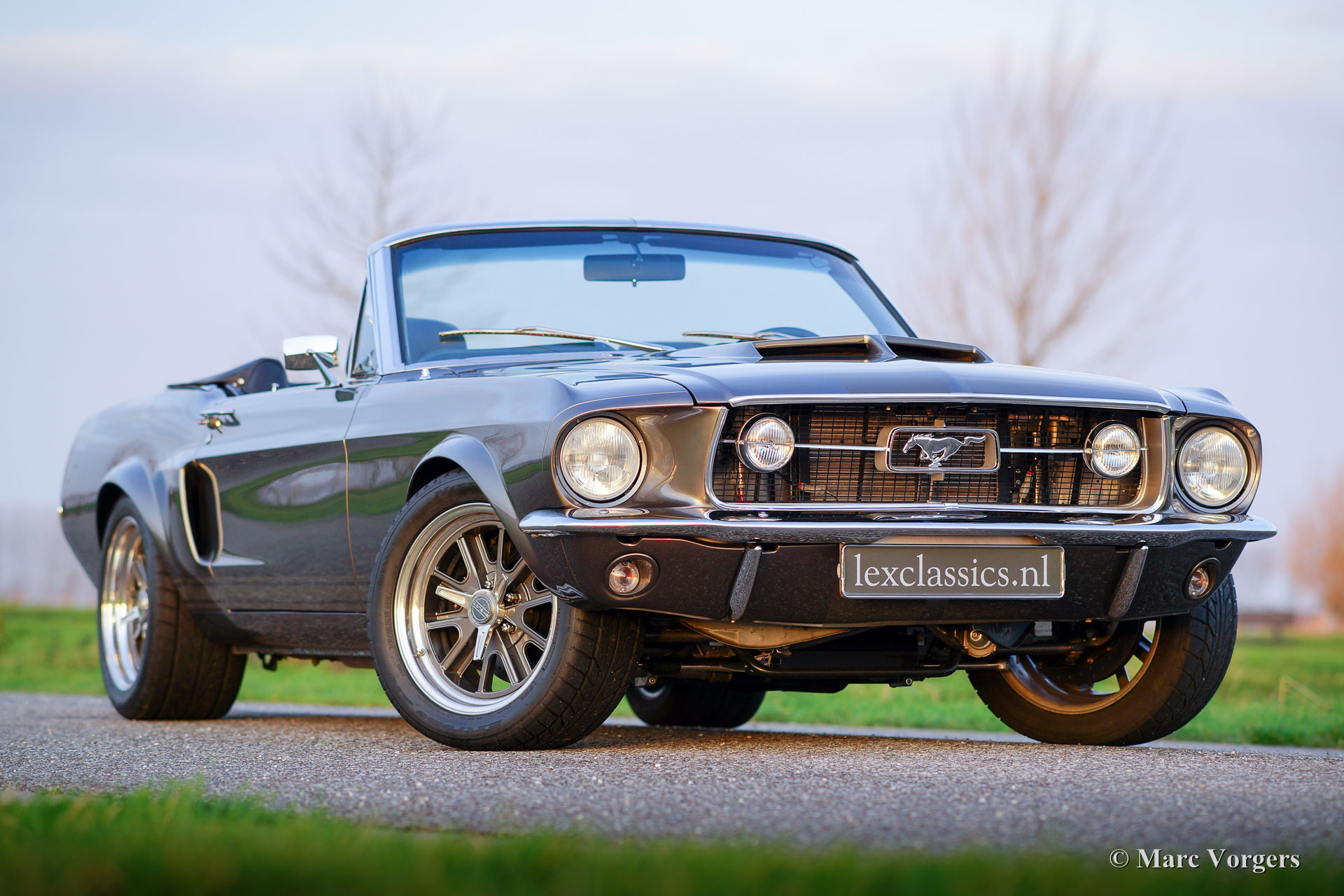 Ford Mustang Convertible, year 1967. Colour anthracite metallic with black striping. Black leather interior and dark grey carpet. Black convertible top. This spectacular Ford Mustang convertible was perfectly restored and build up by Ford Mustang specialists ‘Classic Speed’ in the USA. The car was perfectly restored and overhauled, over 4100 hours of work, and to very high standards. The work was completed in the year 2014. An extensive photo reportage of the restoration-job is present. This automobile is in brand new condition and the car drives perfectly! The new and ‘blueprinted’ V8 engine delivers 430 bhp (proven) and the power is directed to the rear wheels thru an automatic gearbox. The car features the following options: full leather interior, sports seats with heating, Moto-Lita steering wheel, Air-conditioning, special 17-inch alloy wheels, 13-inch disc brakes all round, custom build Stainless Steel exhaust system, Cobra air-filtre housing, power steering, power windows, special springs and shock absorbers, Retrosound radio and an electrically operated hood. This tremendous Ford Mustang is registered in Belgium. This is a unique ford Mustang in perfect TOP condition!