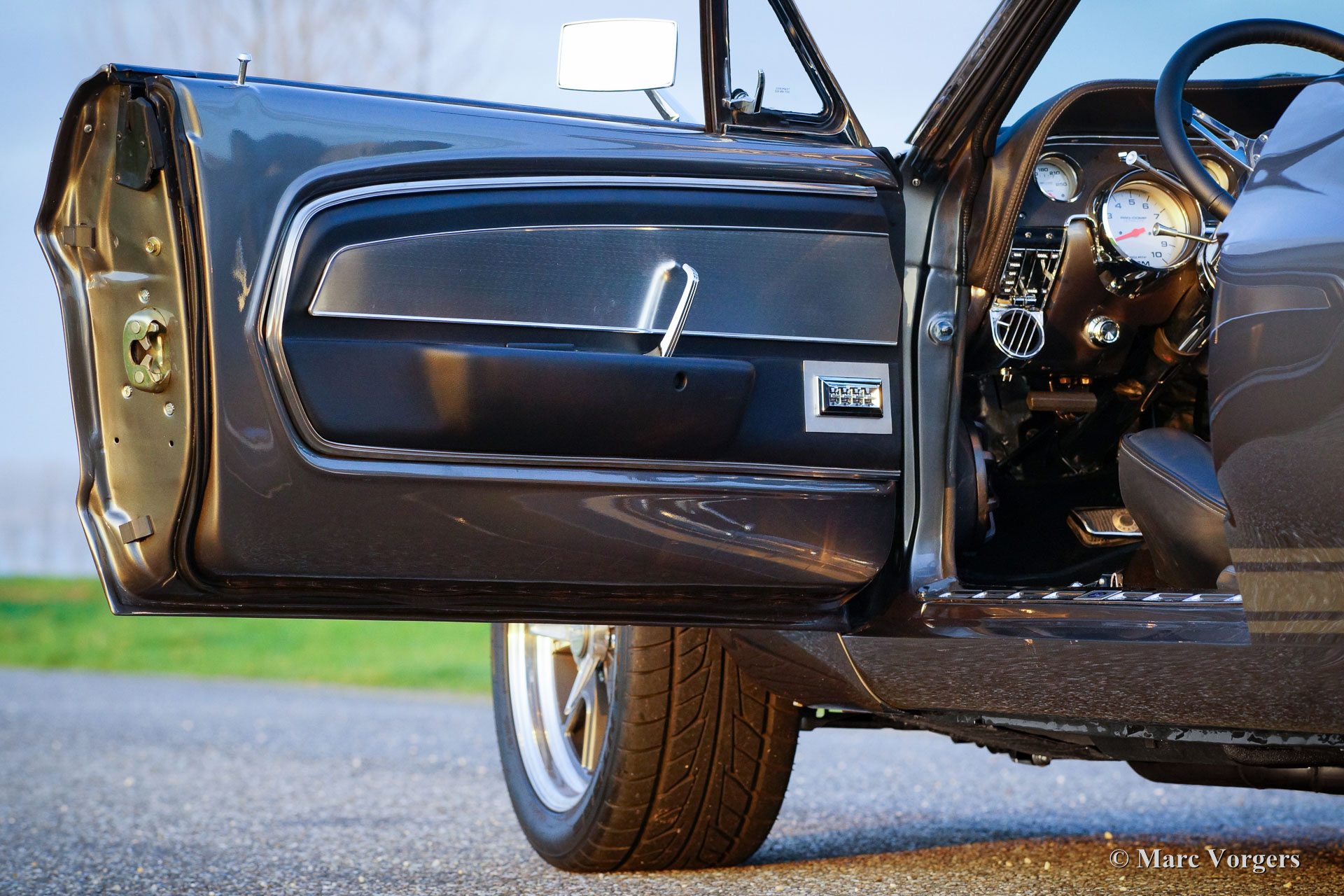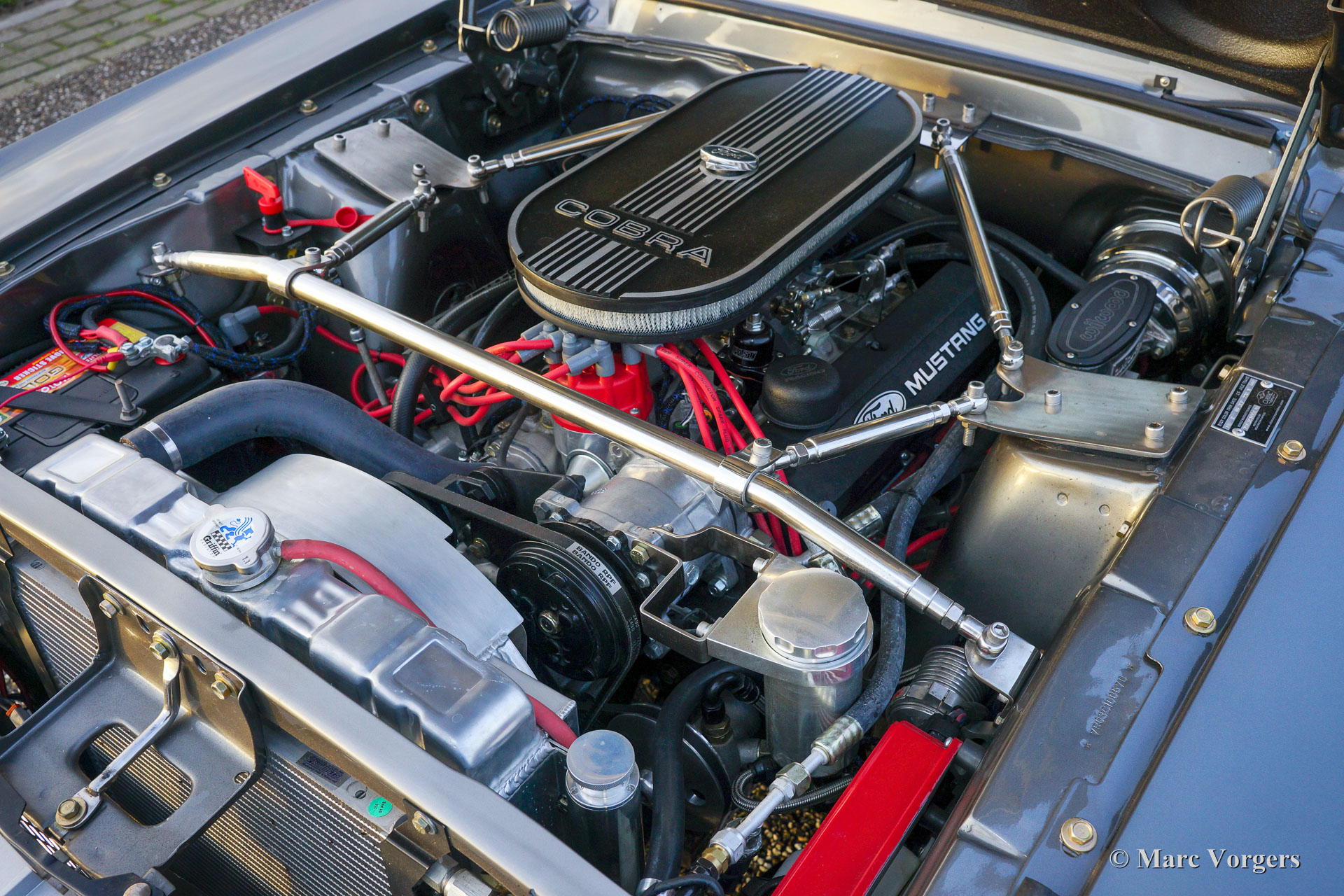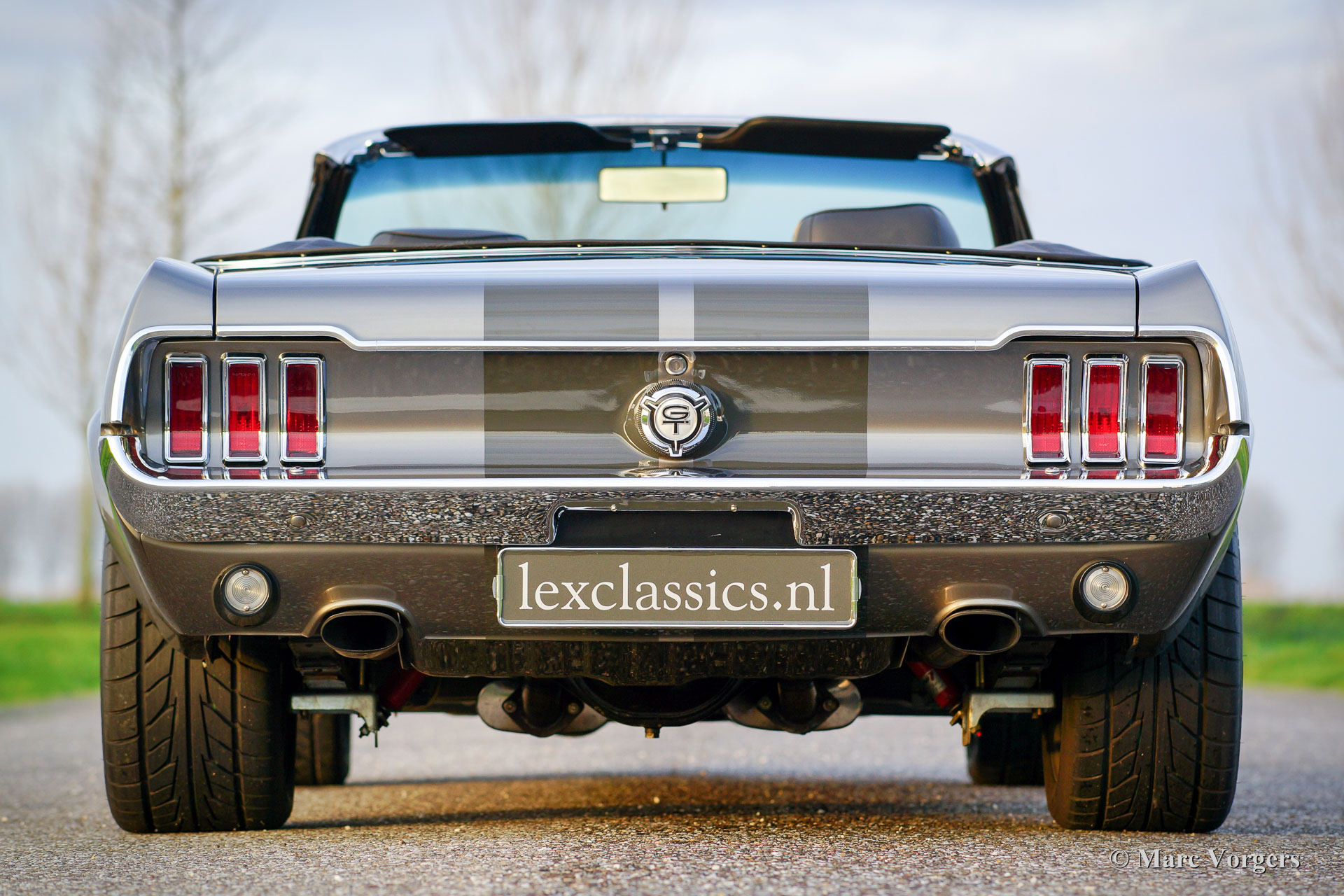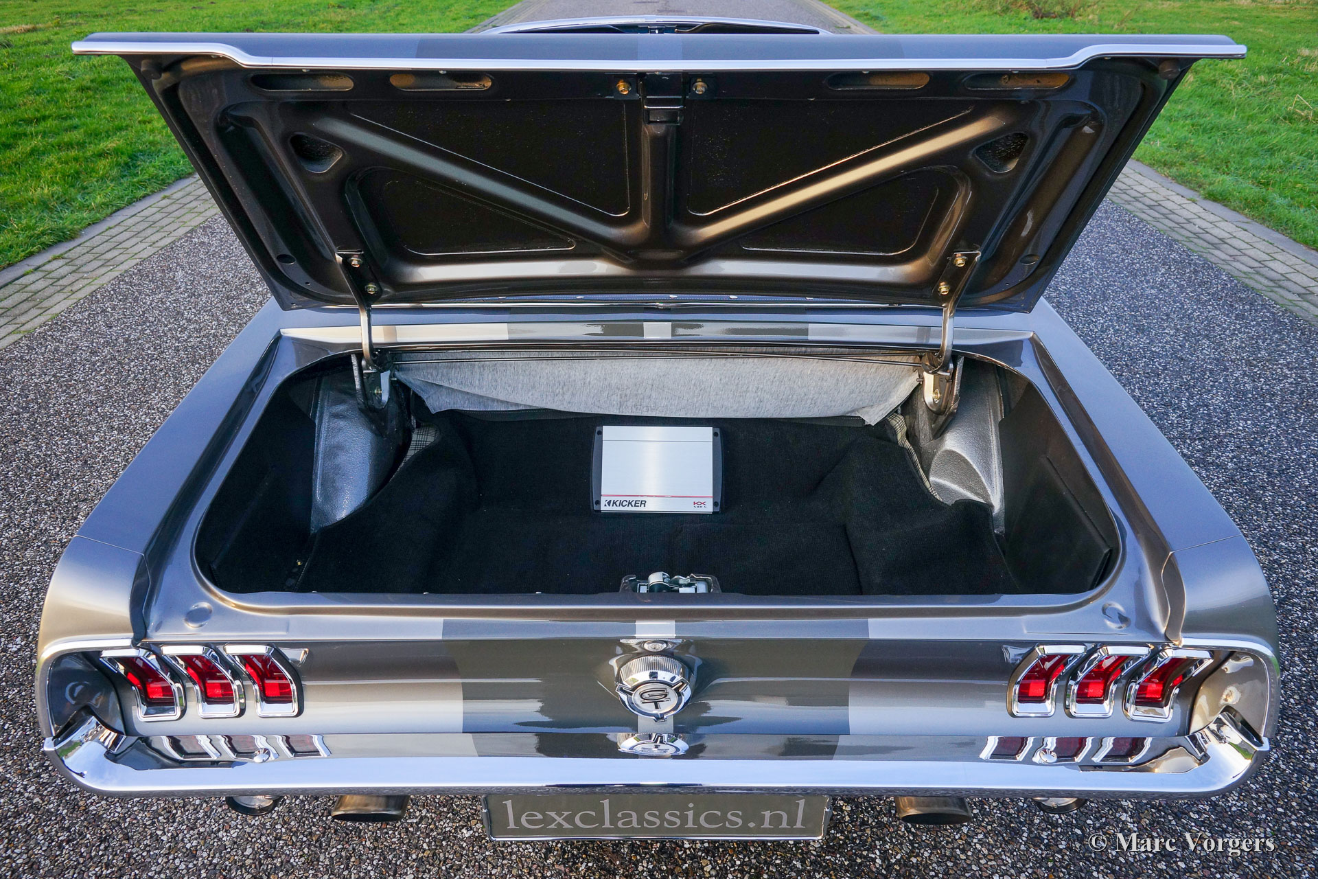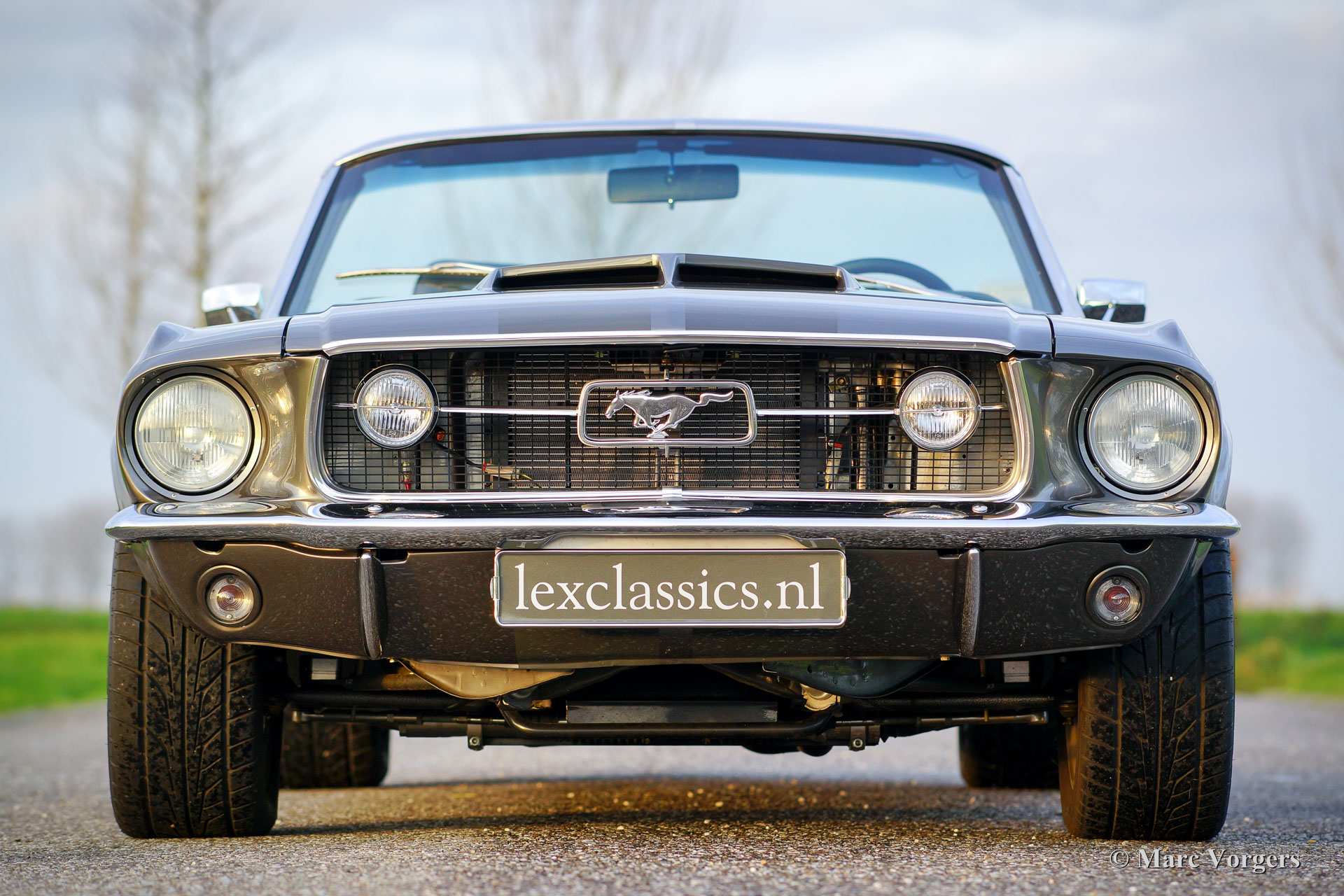 Ford Mustang Convertible, year 1967. Colour anthracite metallic with black striping. Black leather interior and dark grey carpet. Black convertible top. This spectacular Ford Mustang convertible was perfectly restored and build up by Ford Mustang specialists ‘Classic Speed’ in the USA. The car was perfectly restored and overhauled, over 4100 hours of work, and to very high standards. The work was completed in the year 2014. An extensive photo reportage of the restoration-job is present. This automobile is in brand new condition and the car drives perfectly! The new and ‘blueprinted’ V8 engine delivers 430 bhp (proven) and the power is directed to the rear wheels thru an automatic gearbox. The car features the following options: full leather interior, sports seats with heating, Moto-Lita steering wheel, Air-conditioning, special 17-inch alloy wheels, 13-inch disc brakes all round, custom build Stainless Steel exhaust system, Cobra air-filtre housing, power steering, power windows, special springs and shock absorbers, Retrosound radio and an electrically operated hood. This tremendous Ford Mustang is registered in Belgium. This is a unique ford Mustang in perfect TOP condition!