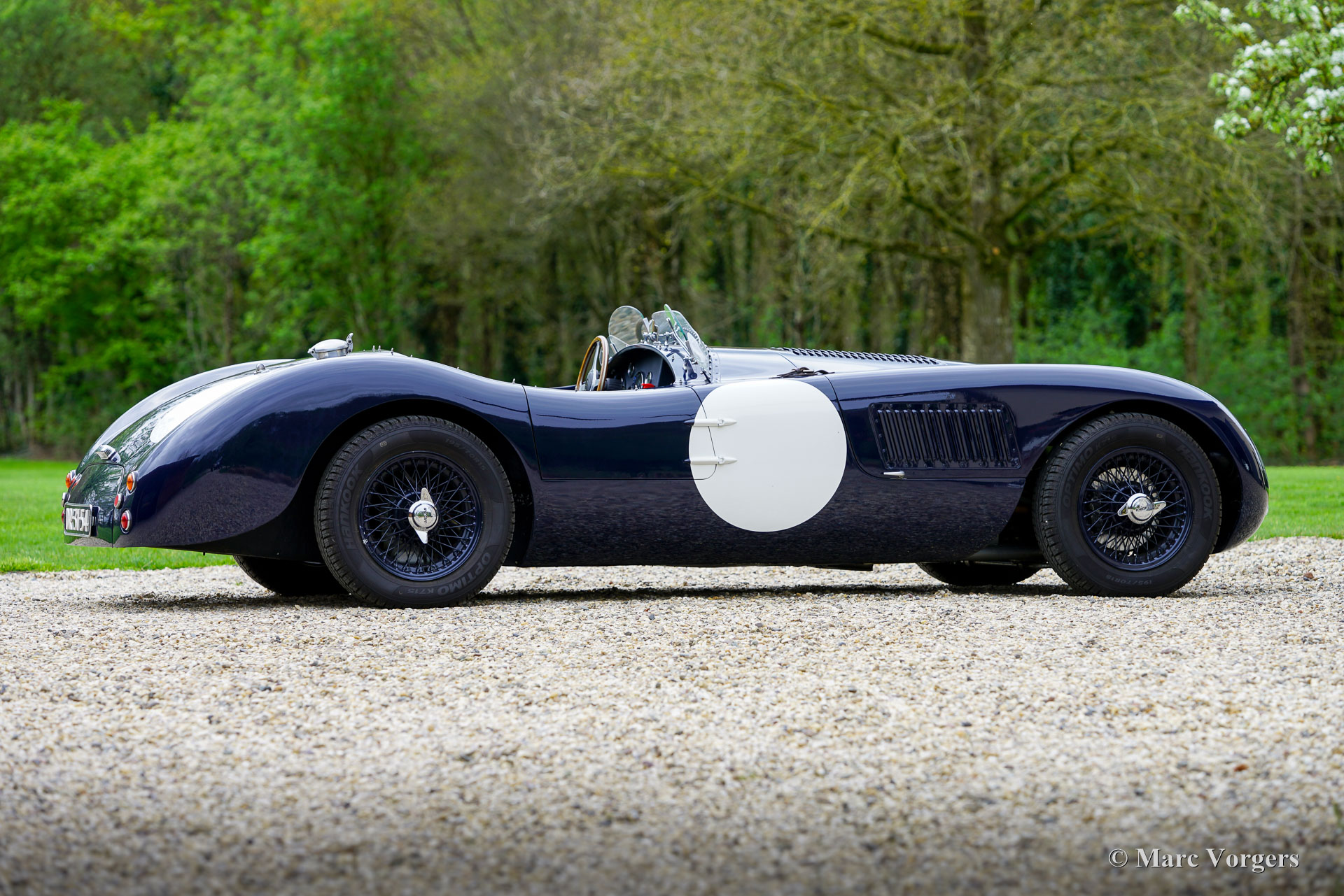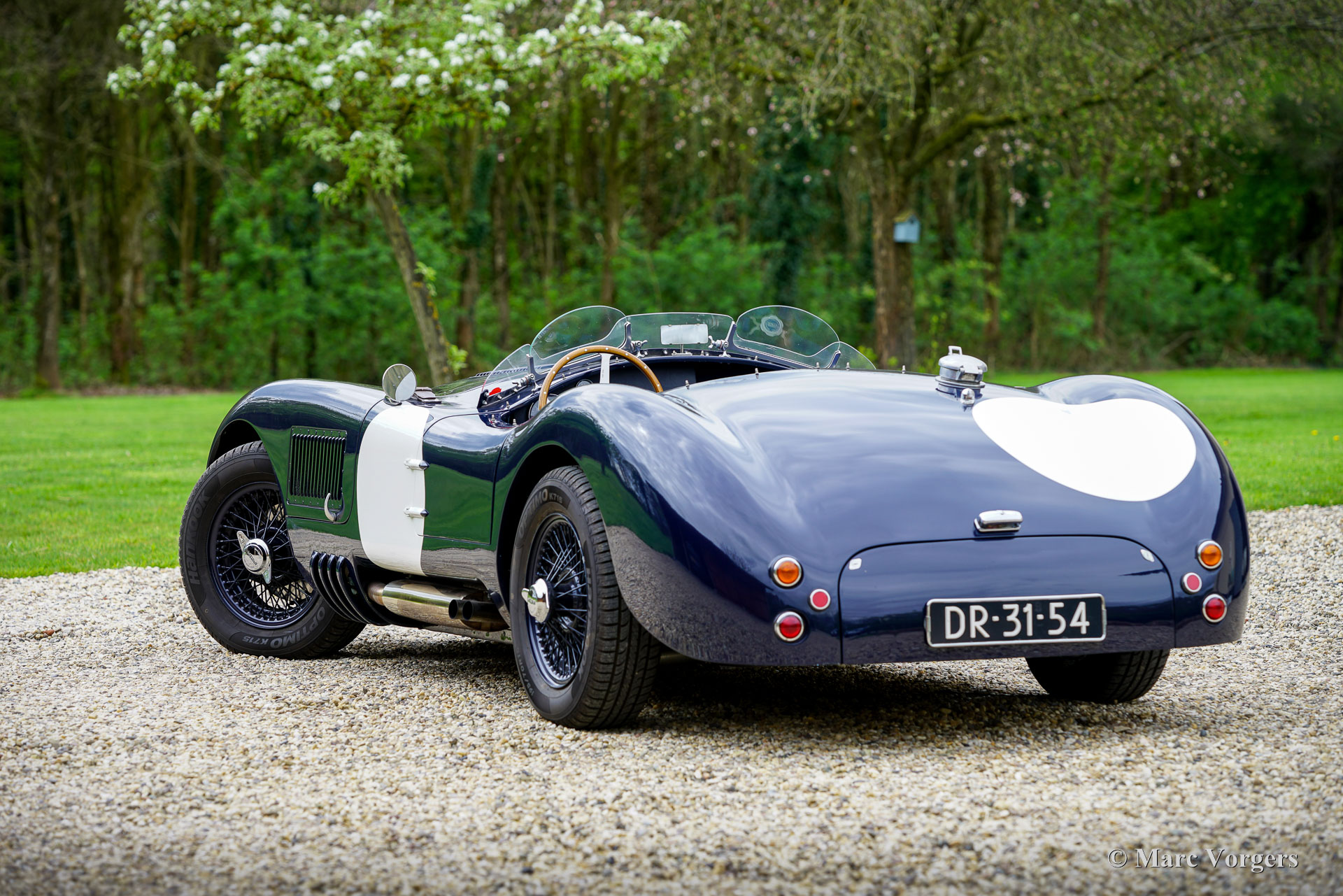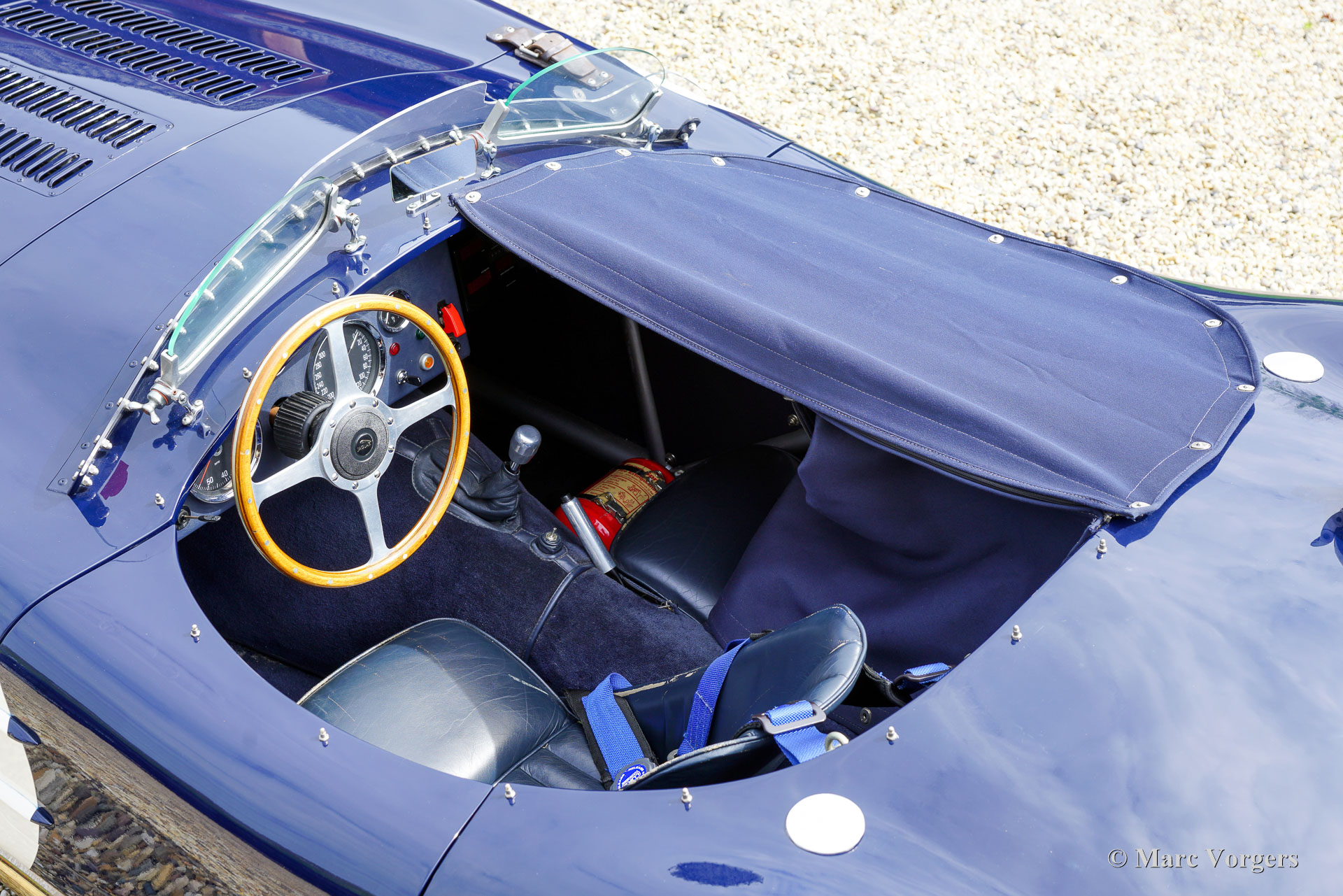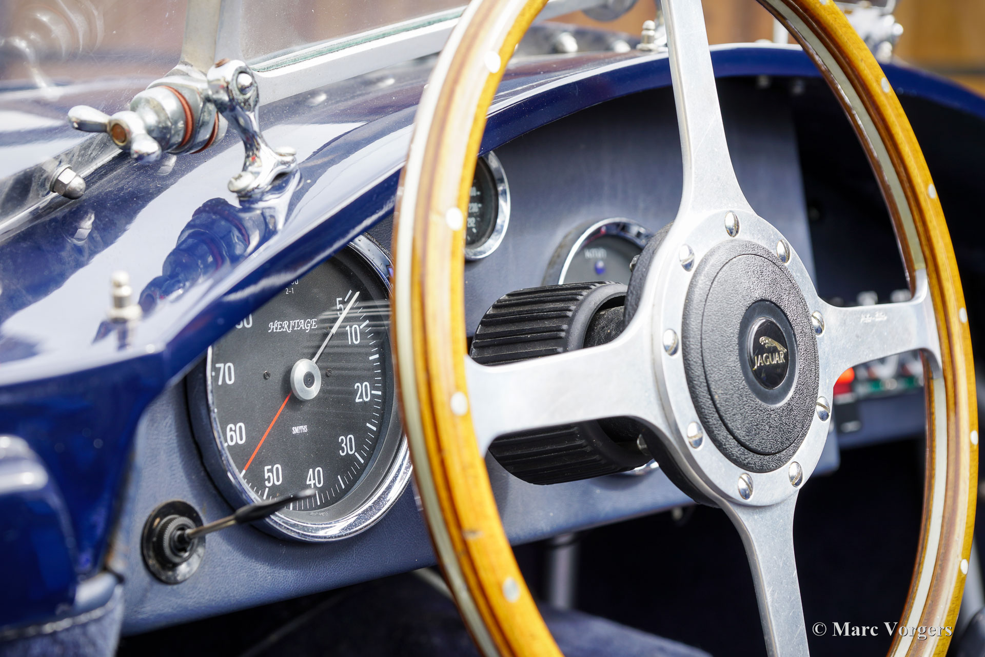 Jaguar C-Type Heritage Replica, year 1969. Body colour dark blue combined with a dark blue interior featuring leather bucket seats and blue carpet. Blue mohair tonneau cover. This magnificent Jaguar C-type replica was built by the firm of Heritage in the UK. The car was based on the mechanical components of a Jaguar XJ6. The Jaguar C-type is one of the most legendary racing sports cars ever built, having won the gruelling 24 hours of Le Mans race twice in 1951 and 1953! Only 53 examples of the C-type were built by Jaguar making the model a fantastic subject for the replica market. Amongst the Jaguar C-type replica builders the firm of Heritage is renowned for their high-quality cars, and they are allowed to use the Jaguar name and logo on their cars. The handmade space frame is covered with glass fibre reinforced plastic (GRP) panels. This fantastic example has driven only 16.498 kilometres, is in an excellent original condition, and comes with a proper vintage 1969 Jaguar XJ Sports registration. This is very special because nowadays it is not possible to obtain a classic registration for modern built replica cars. With only 1100 kilogrammes and a 4.2 litre straight six engine delivering over 300 hp the Heritage C-type is a frighteningly fast sportscar! This machine asks for a highly skilled and experienced driver to control the power and movements of the car without the aid of any modern save guards. This car is SPECTACULAR and ultra desirable! The car features dark blue painted wire wheels, a Stainless-Steel side exhaust, triple twin choke Weber carburettors, a MotoLita sports steering wheel with wood rim, a Belmog digital rally trip meter and a pair of Sportex analogue rally stopwatches. This Heritage Jaguar C-type is a fantastic find for the enthusiast. The car is turn-key ready to be enjoyed to the fullest!
