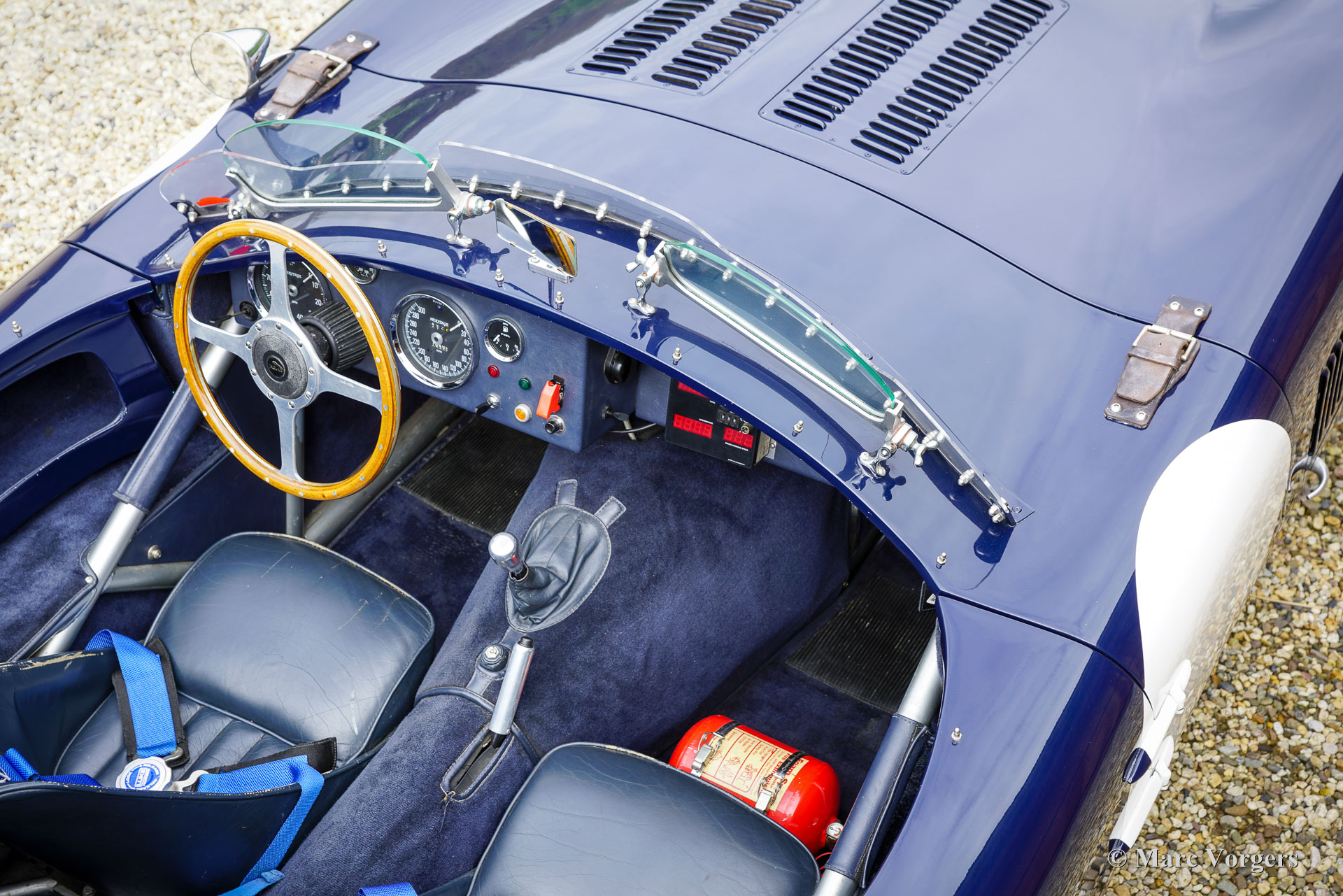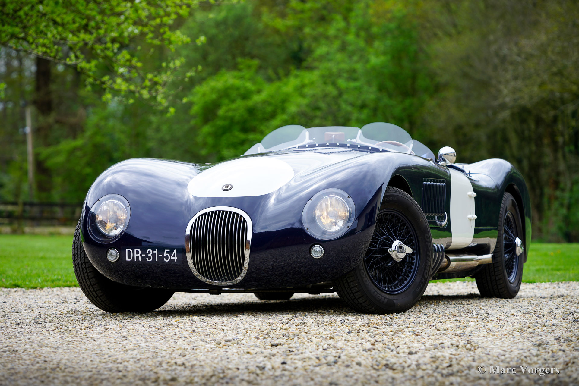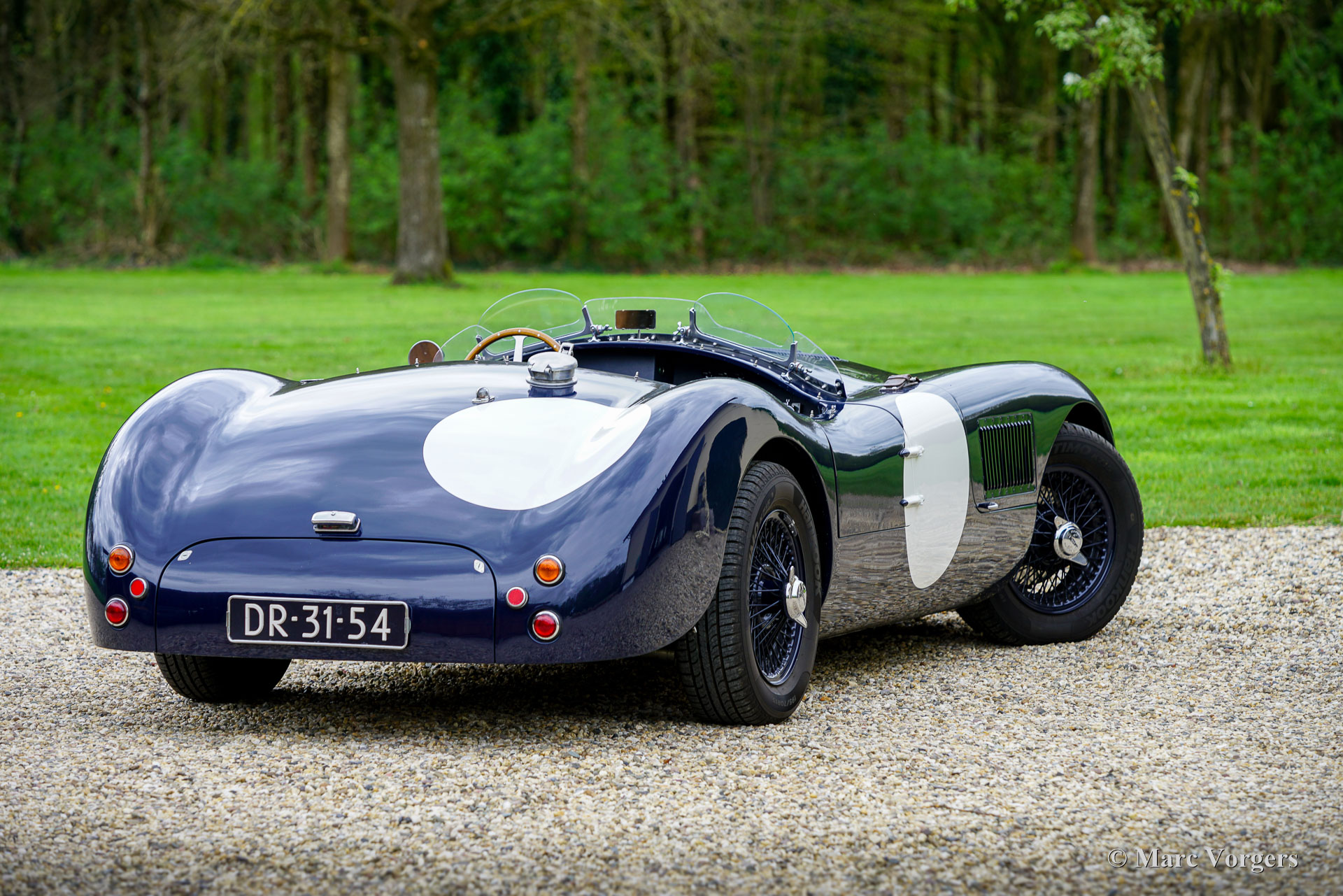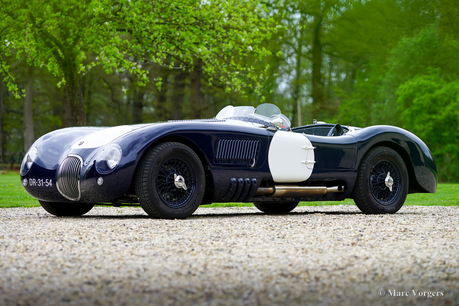 Jaguar C-Type Heritage Replica, year 1969. Body colour dark blue combined with a dark blue interior featuring leather bucket seats and blue carpet. Blue mohair tonneau cover. This magnificent Jaguar C-type replica was built by the firm of Heritage in the UK. The car was based on the mechanical components of a Jaguar XJ6. The Jaguar C-type is one of the most legendary racing sports cars ever built, having won the gruelling 24 hours of Le Mans race twice in 1951 and 1953! Only 53 examples of the C-type were built by Jaguar making the model a fantastic subject for the replica market. Amongst the Jaguar C-type replica builders the firm of Heritage is renowned for their high-quality cars, and they are allowed to use the Jaguar name and logo on their cars. The handmade space frame is covered with glass fibre reinforced plastic (GRP) panels. This fantastic example has driven only 16.498 kilometres, is in an excellent original condition, and comes with a proper vintage 1969 Jaguar XJ Sports registration. This is very special because nowadays it is not possible to obtain a classic registration for modern built replica cars. With only 1100 kilogrammes and a 4.2 litre straight six engine delivering over 300 hp the Heritage C-type is a frighteningly fast sportscar! This machine asks for a highly skilled and experienced driver to control the power and movements of the car without the aid of any modern save guards. This car is SPECTACULAR and ultra desirable! The car features dark blue painted wire wheels, a Stainless-Steel side exhaust, triple twin choke Weber carburettors, a MotoLita sports steering wheel with wood rim, a Belmog digital rally trip meter and a pair of Sportex analogue rally stopwatches. This Heritage Jaguar C-type is a fantastic find for the enthusiast. The car is turn-key ready to be enjoyed to the fullest!