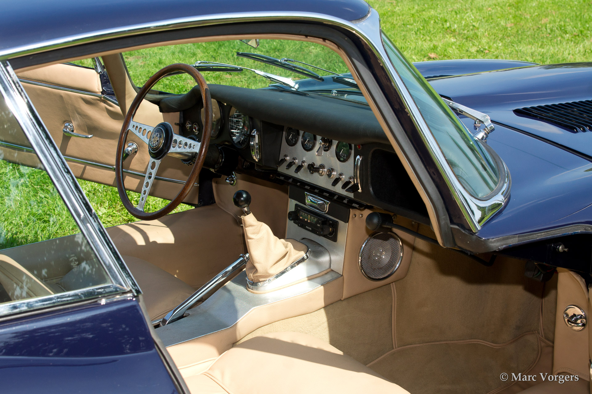 Jaguar E-type 3.8 Litre FHC series 1, year 1962. Colour dark blue with a tan (beige) leather interior. This very beautiful series 1 Jaguar E-type Fixed Head Coupe was fully restored in the year 2004. This magnificent E-type features wide chrome wire wheels, radio, high torque starter engine, AC generator, Stainless Steel exhaust and a map reading lamp.