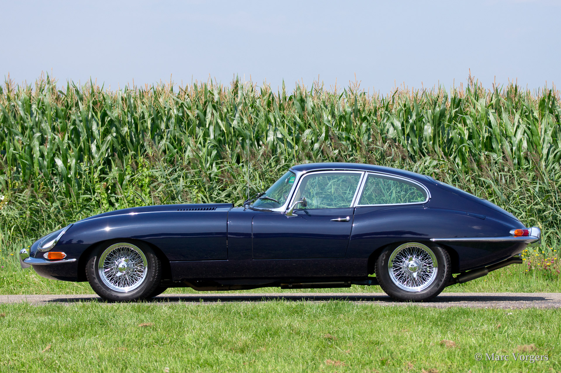 The design of the E-Type series as it was introduced in 1961 is of almost unearthly beauty. Look at all the refined details: the bonnet, the headlights, the back lights, the recess for the wheel housing and the back side, and you will realize that you are looking at absolute, timeless beauty in automobile design.